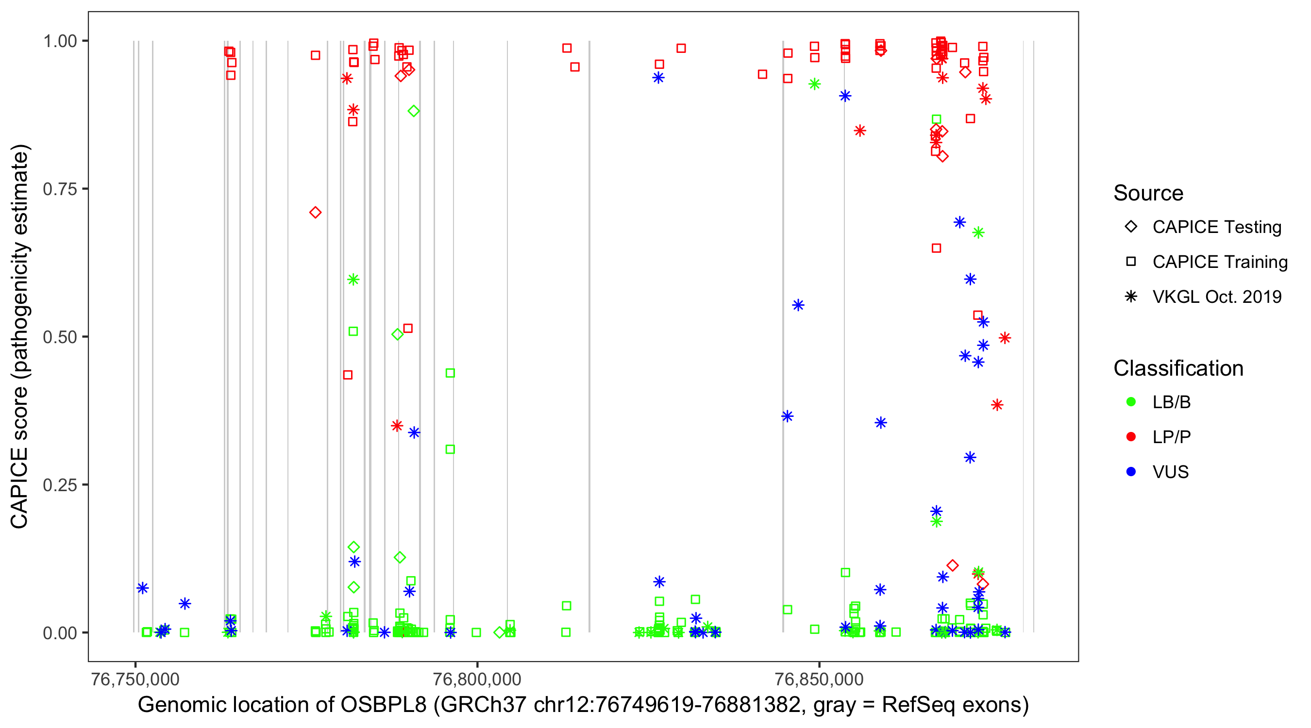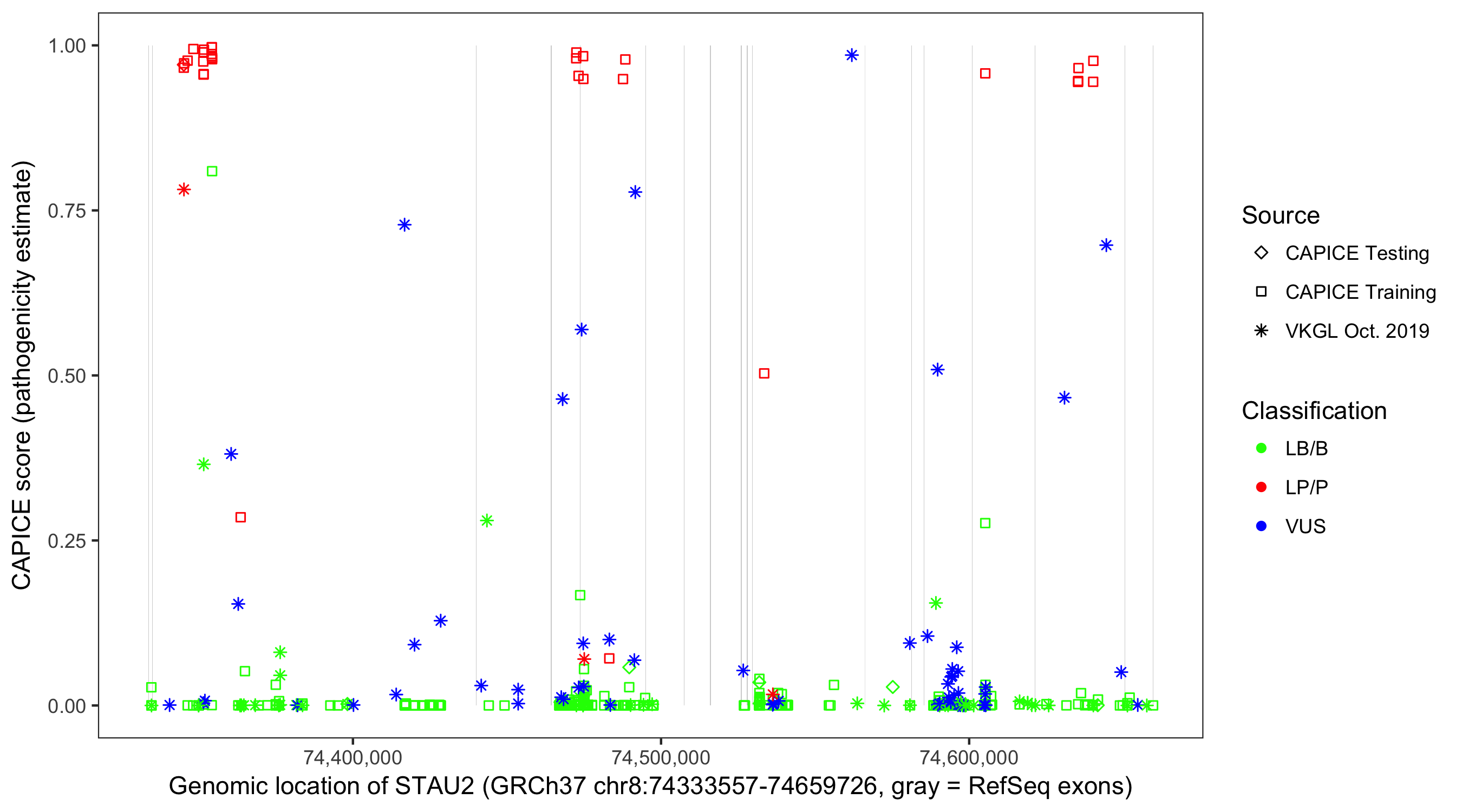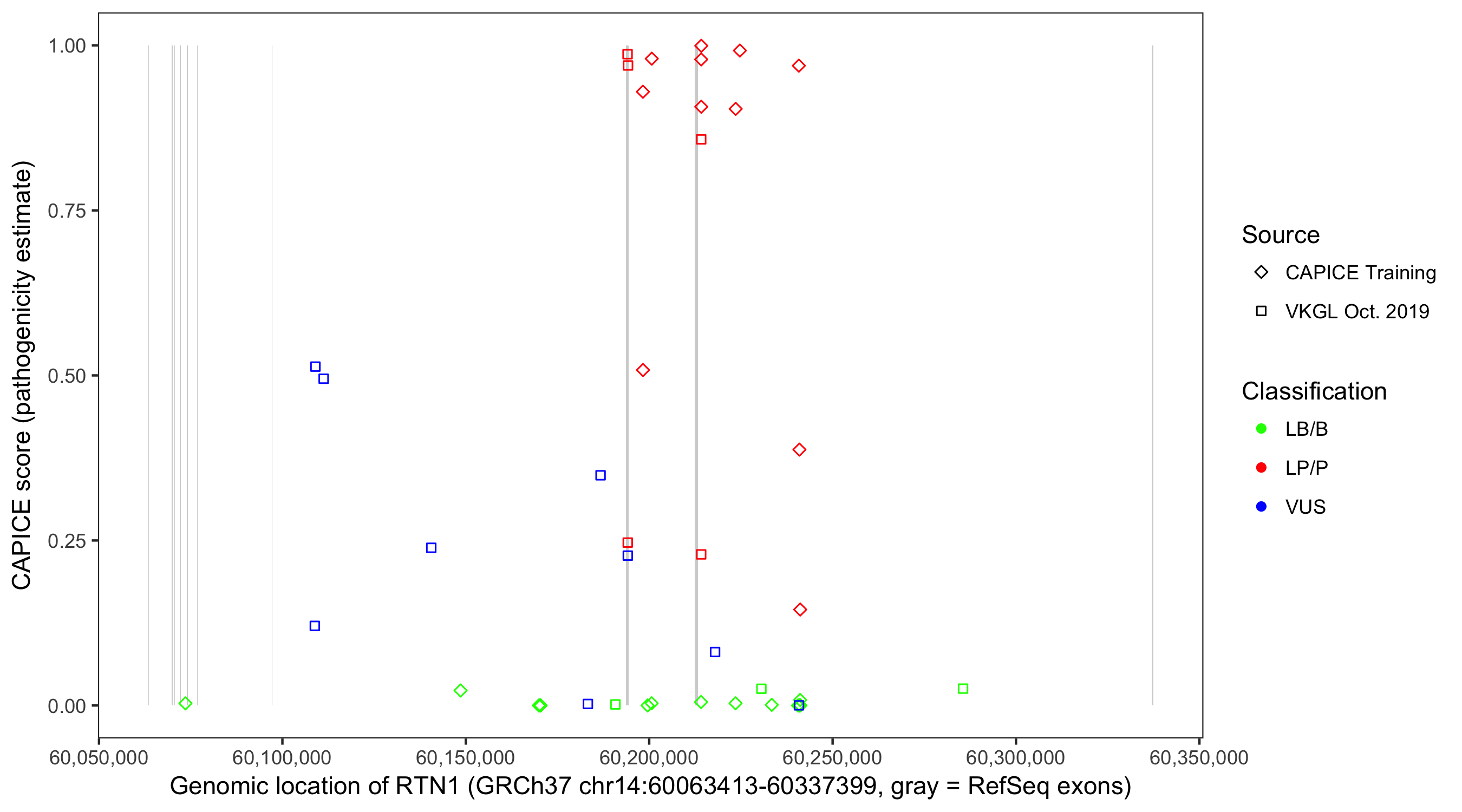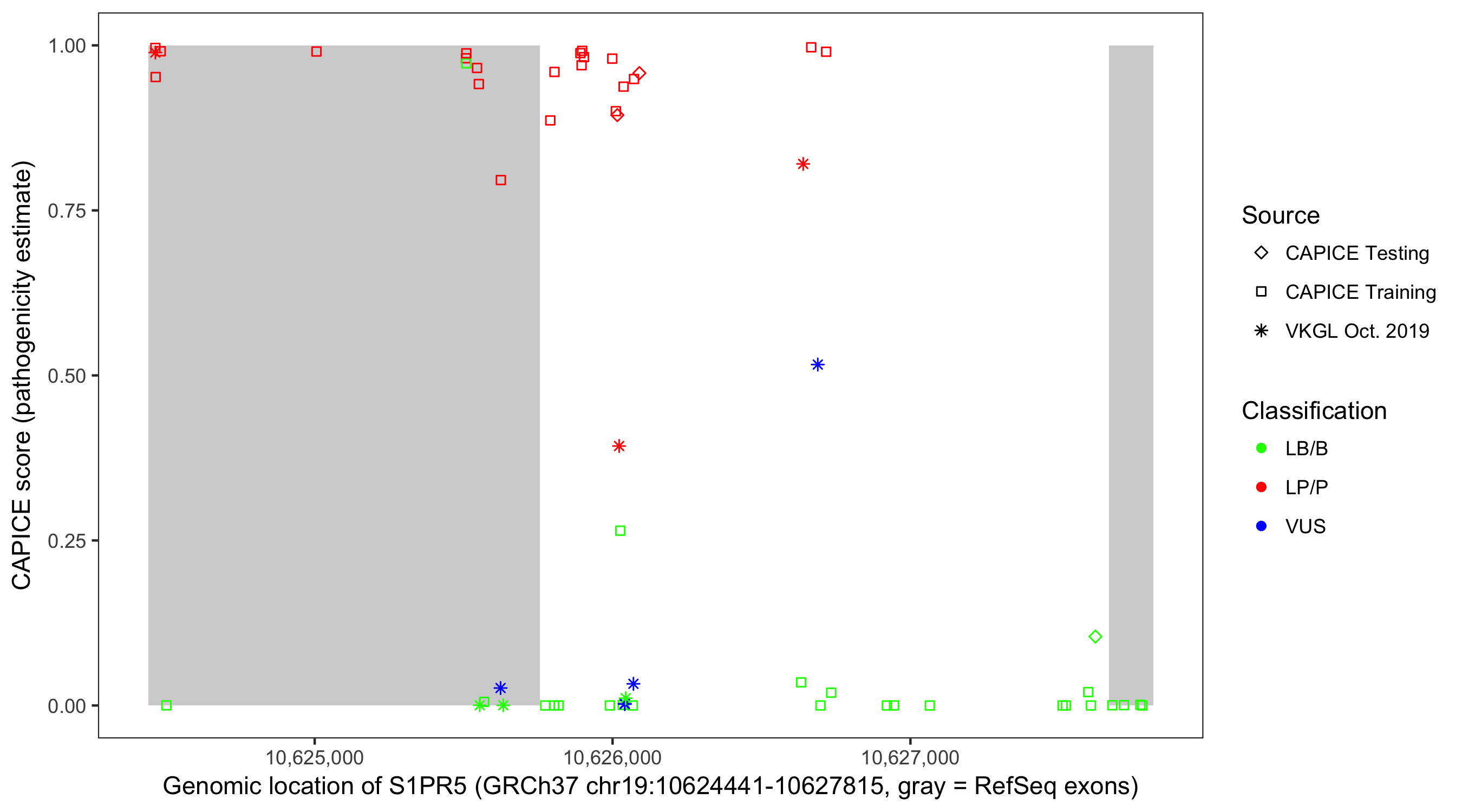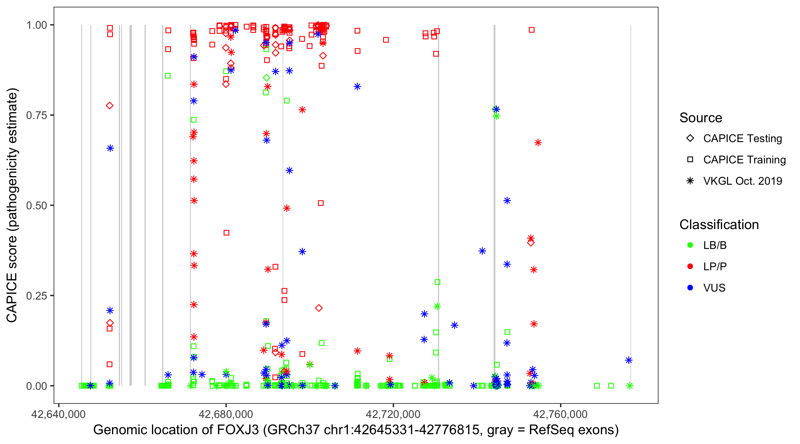Shown are CAPICE train/test variants plus VKGL Oct 2019.