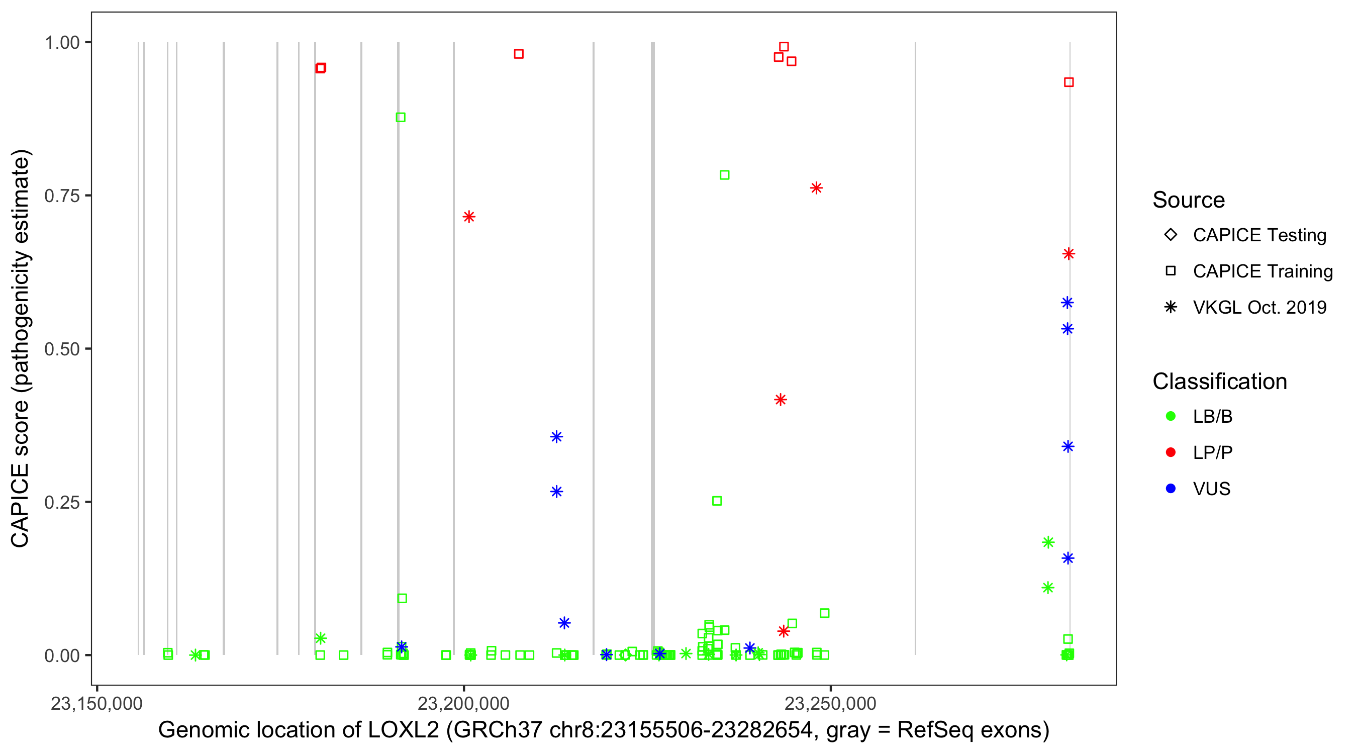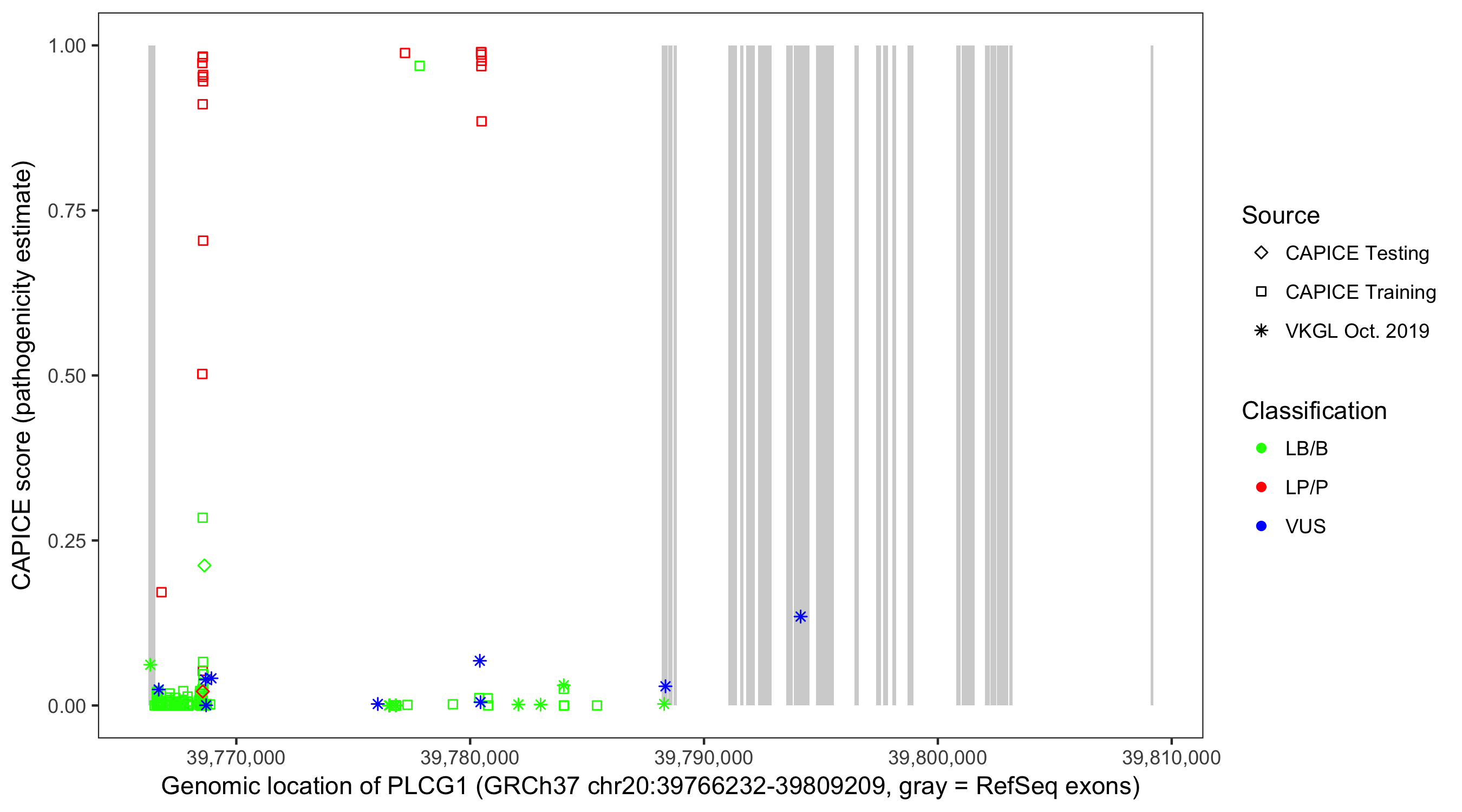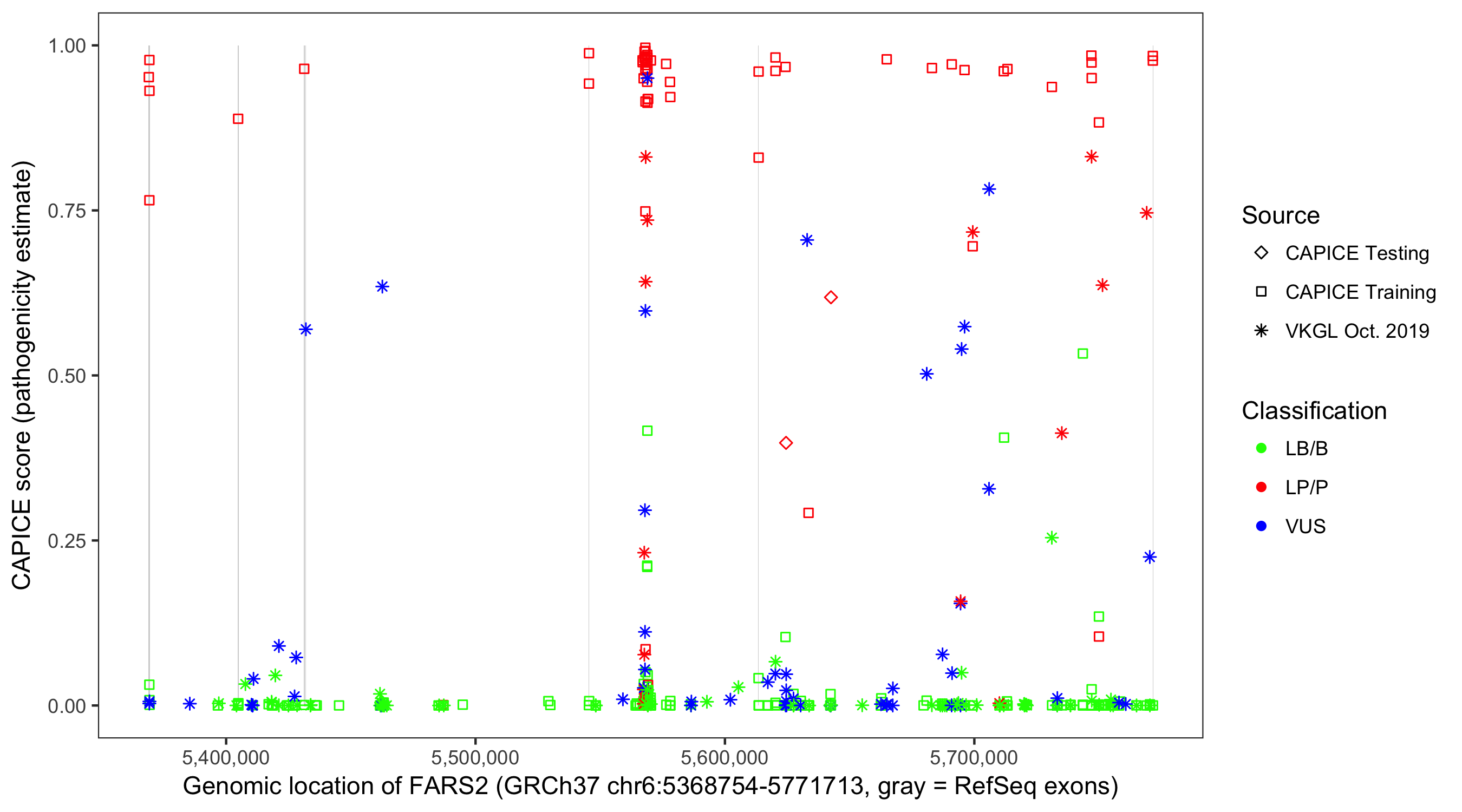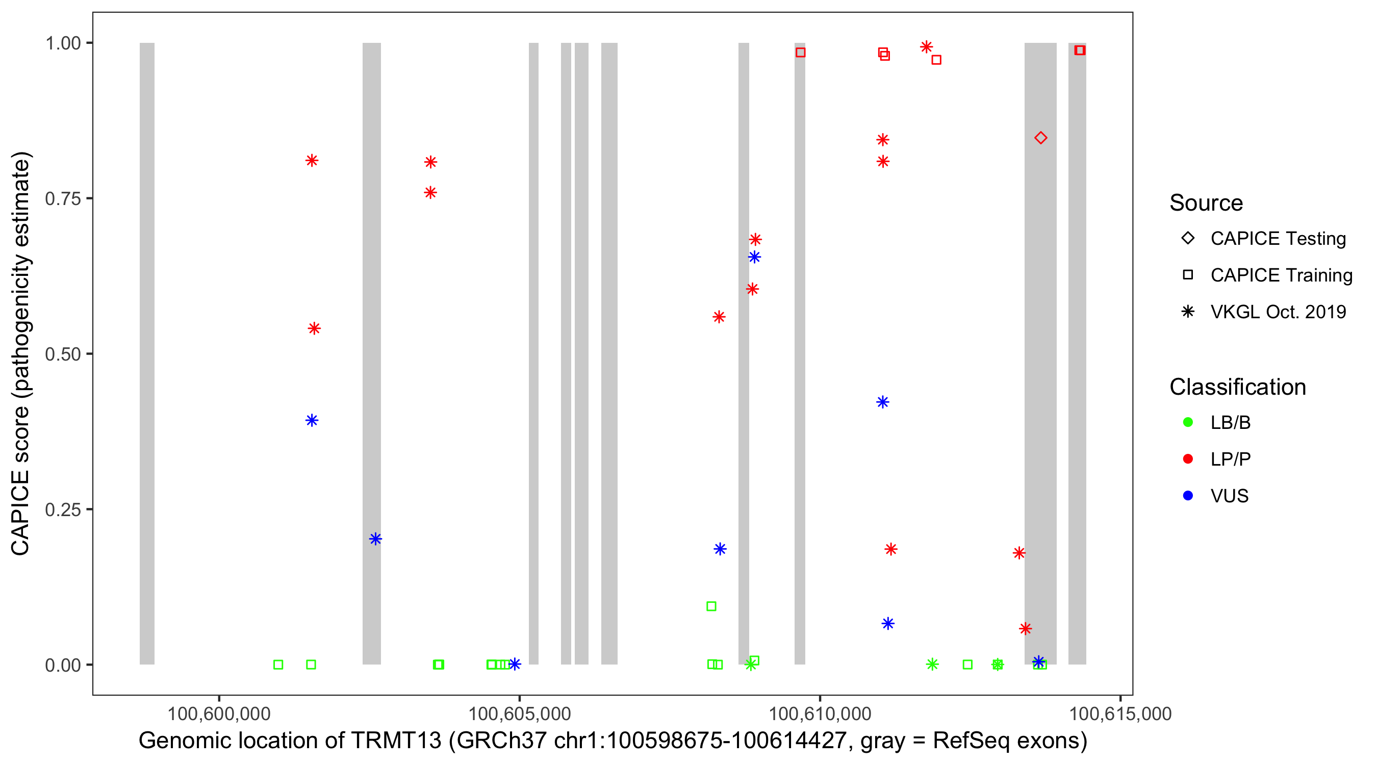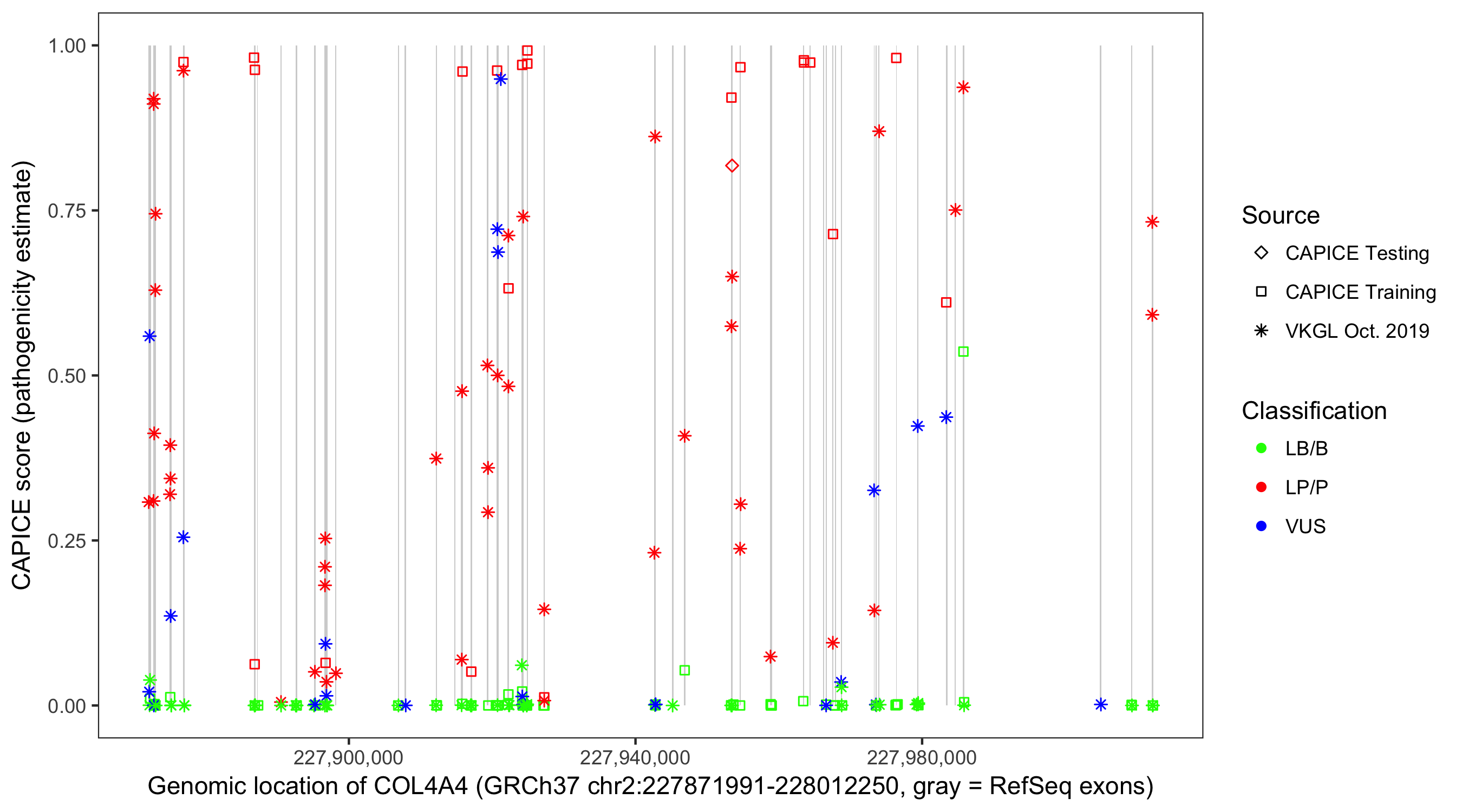 Shown are CAPICE train/test variants plus VKGL Oct 2019.