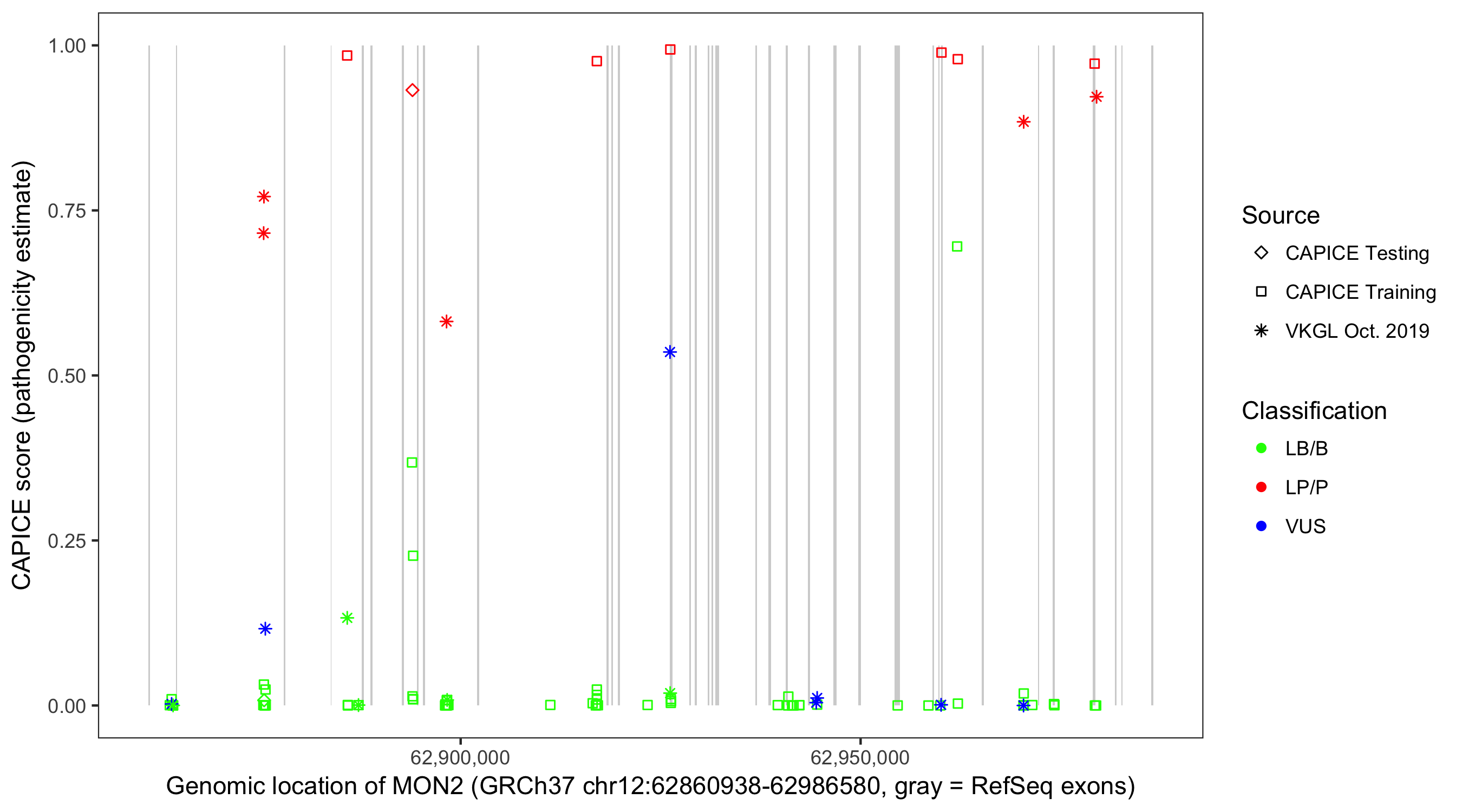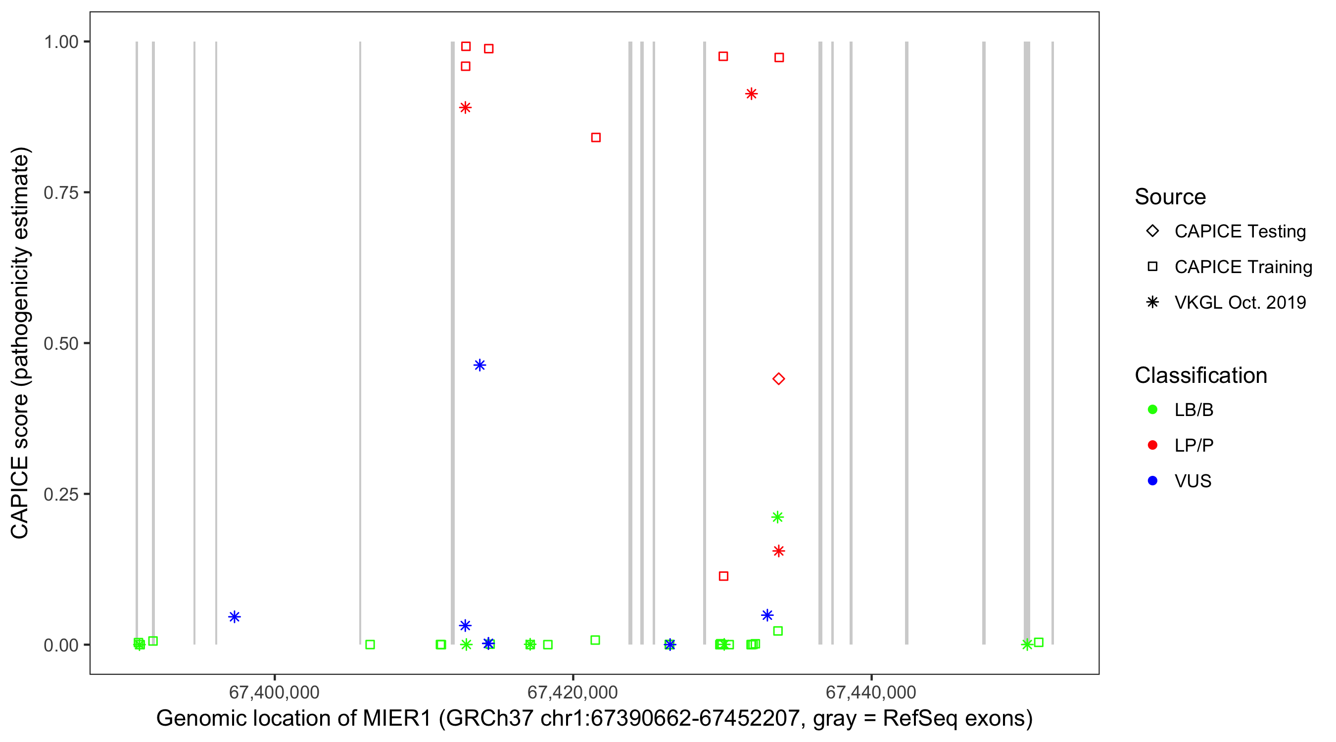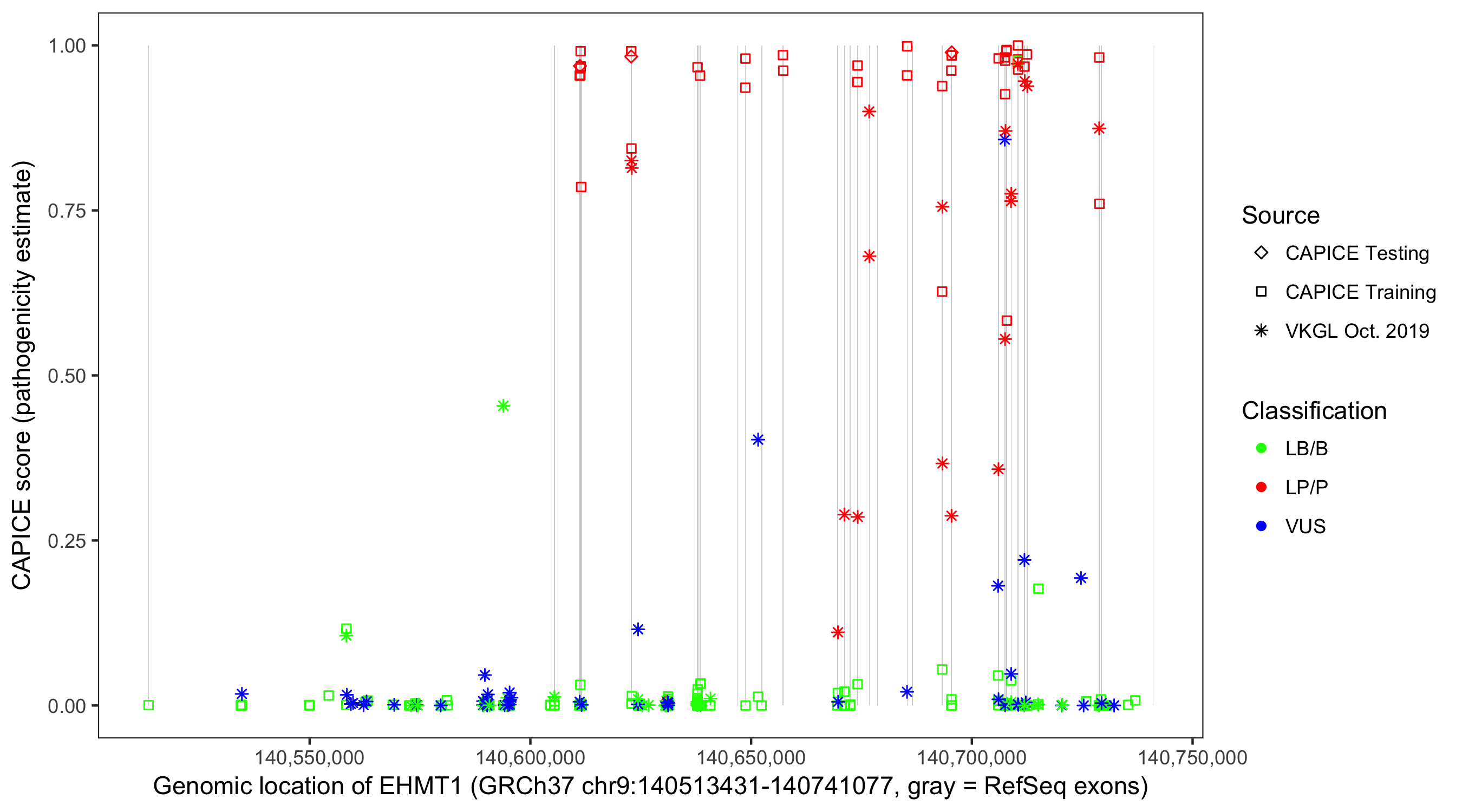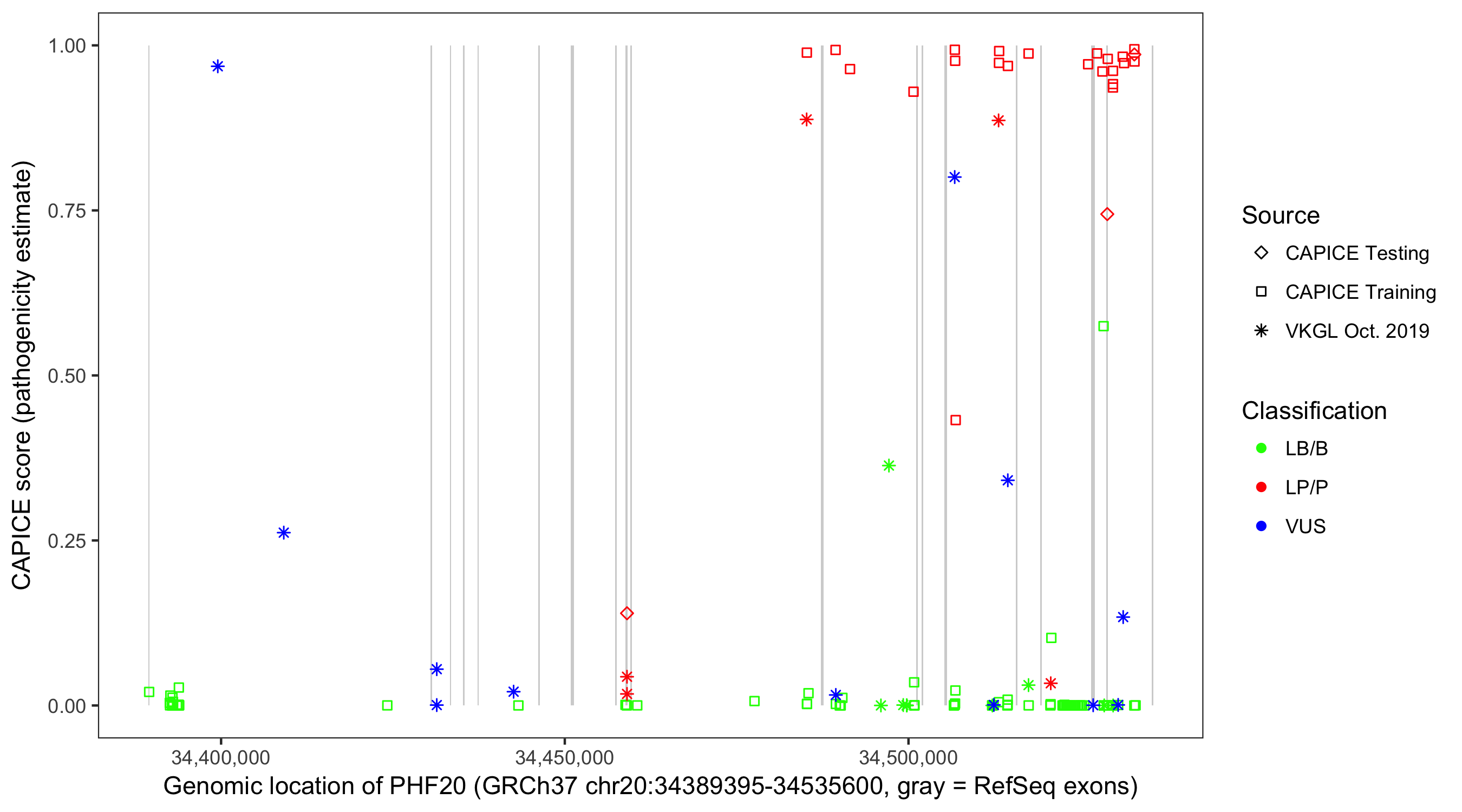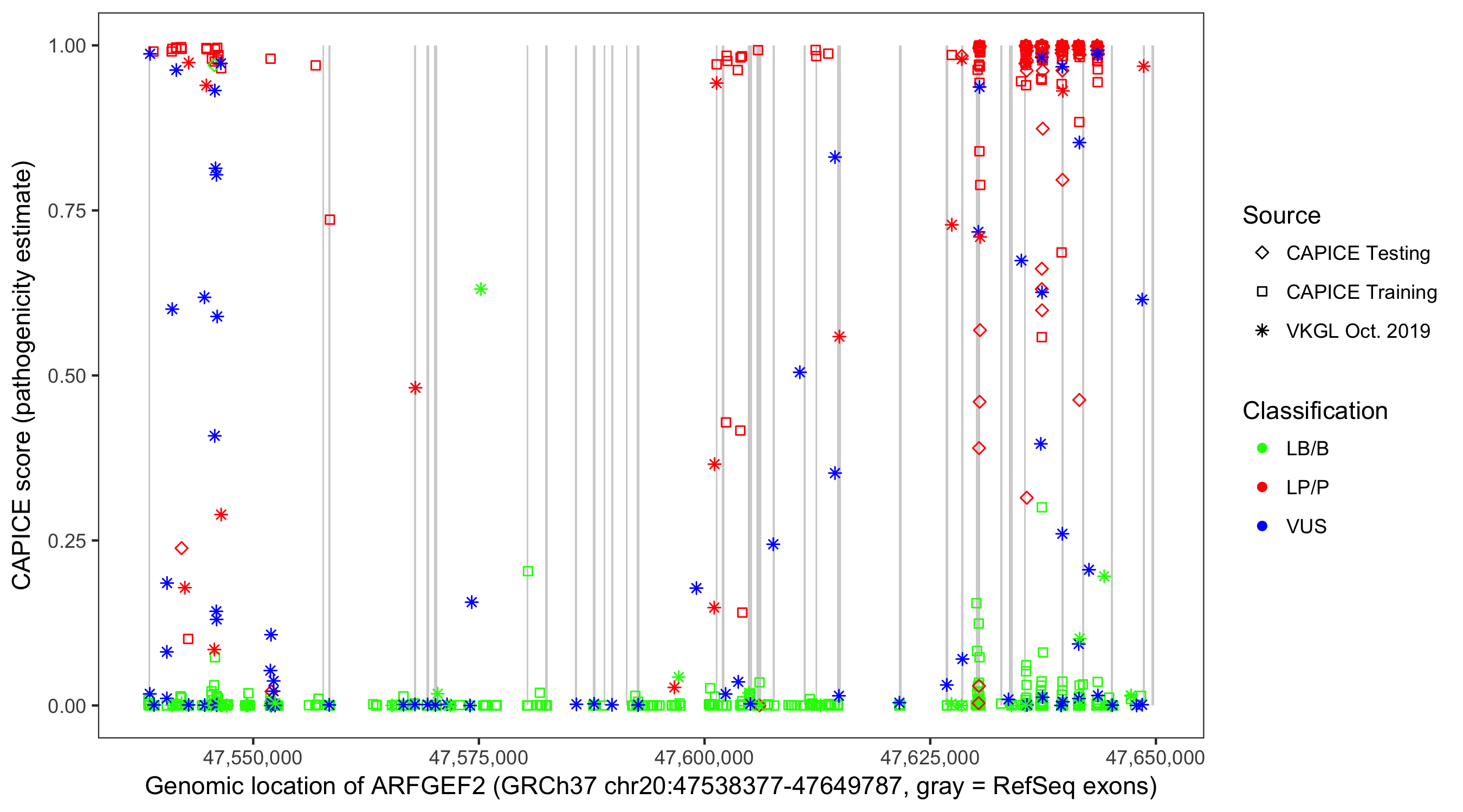 Shown are CAPICE train/test variants plus VKGL Oct 2019.