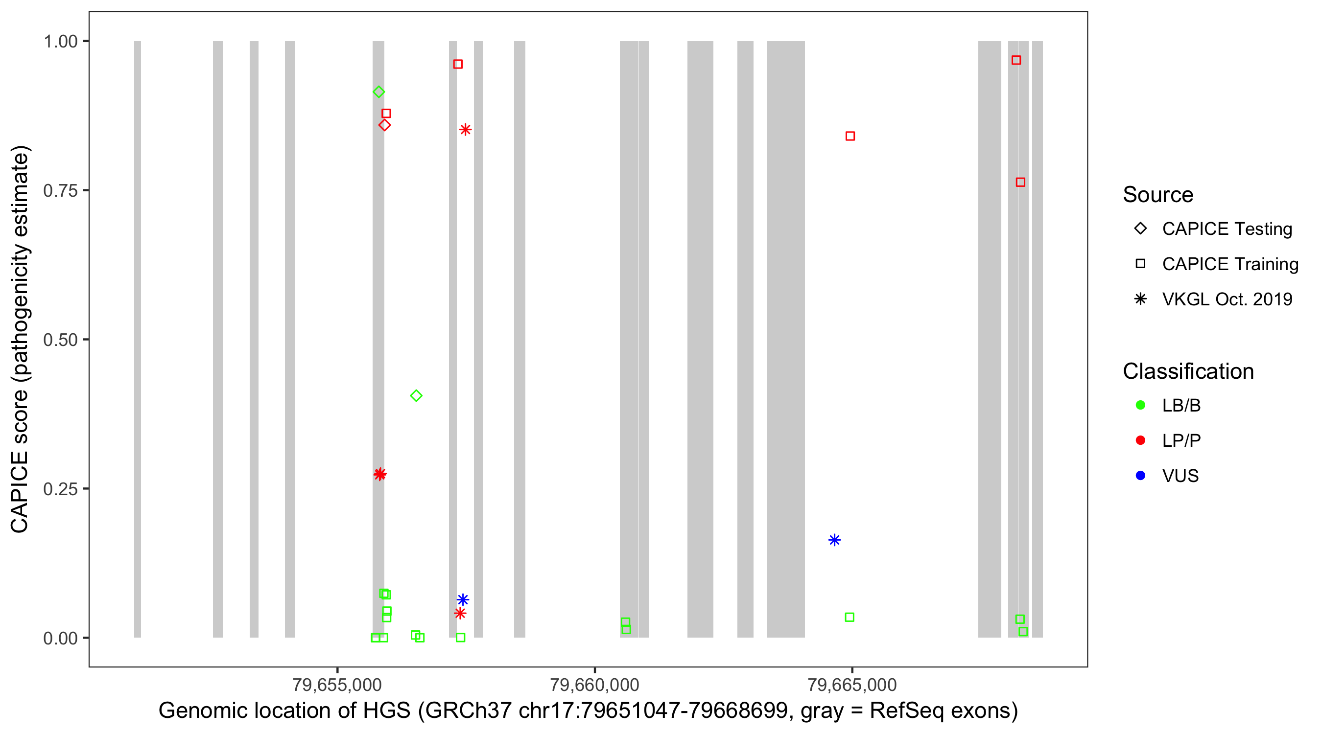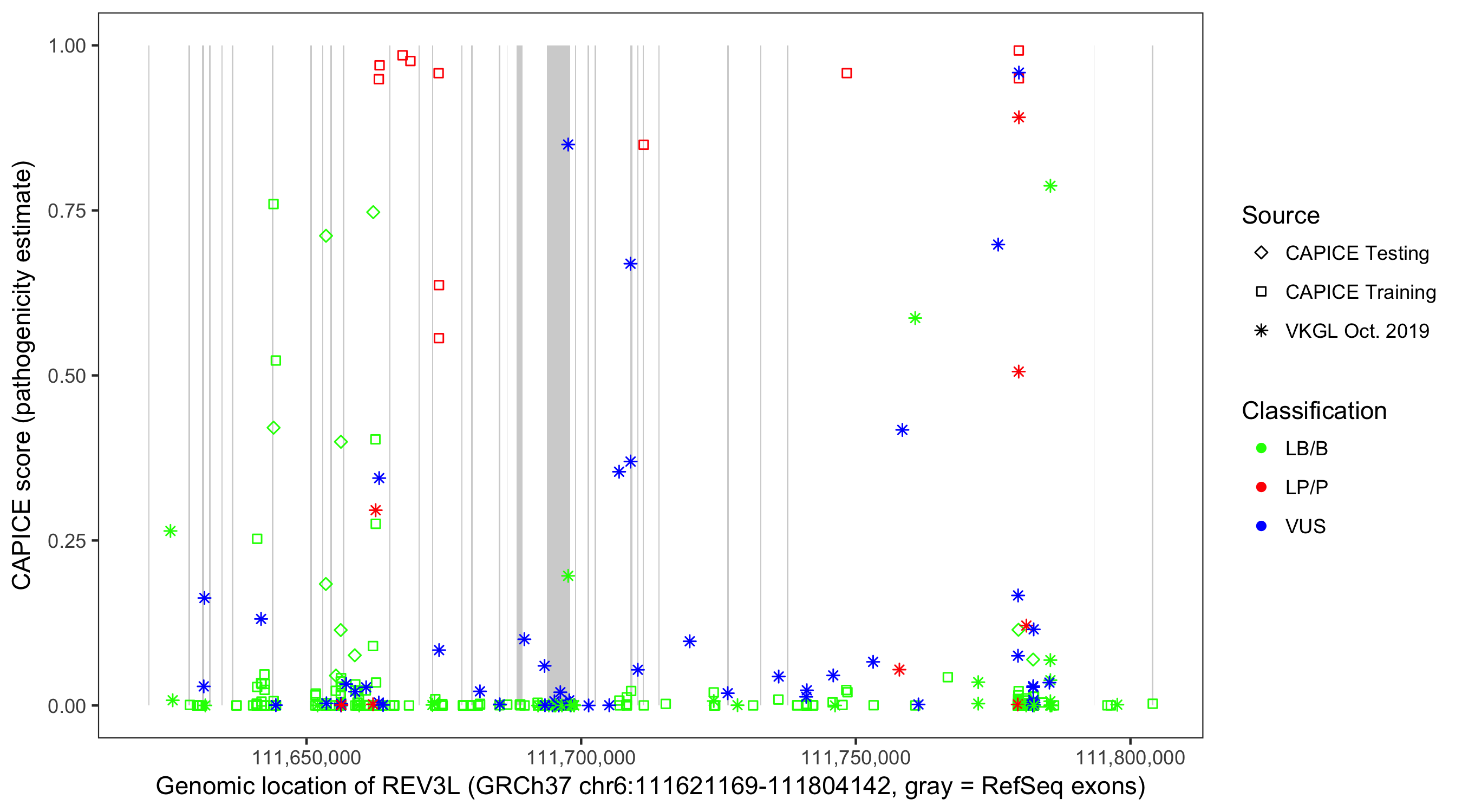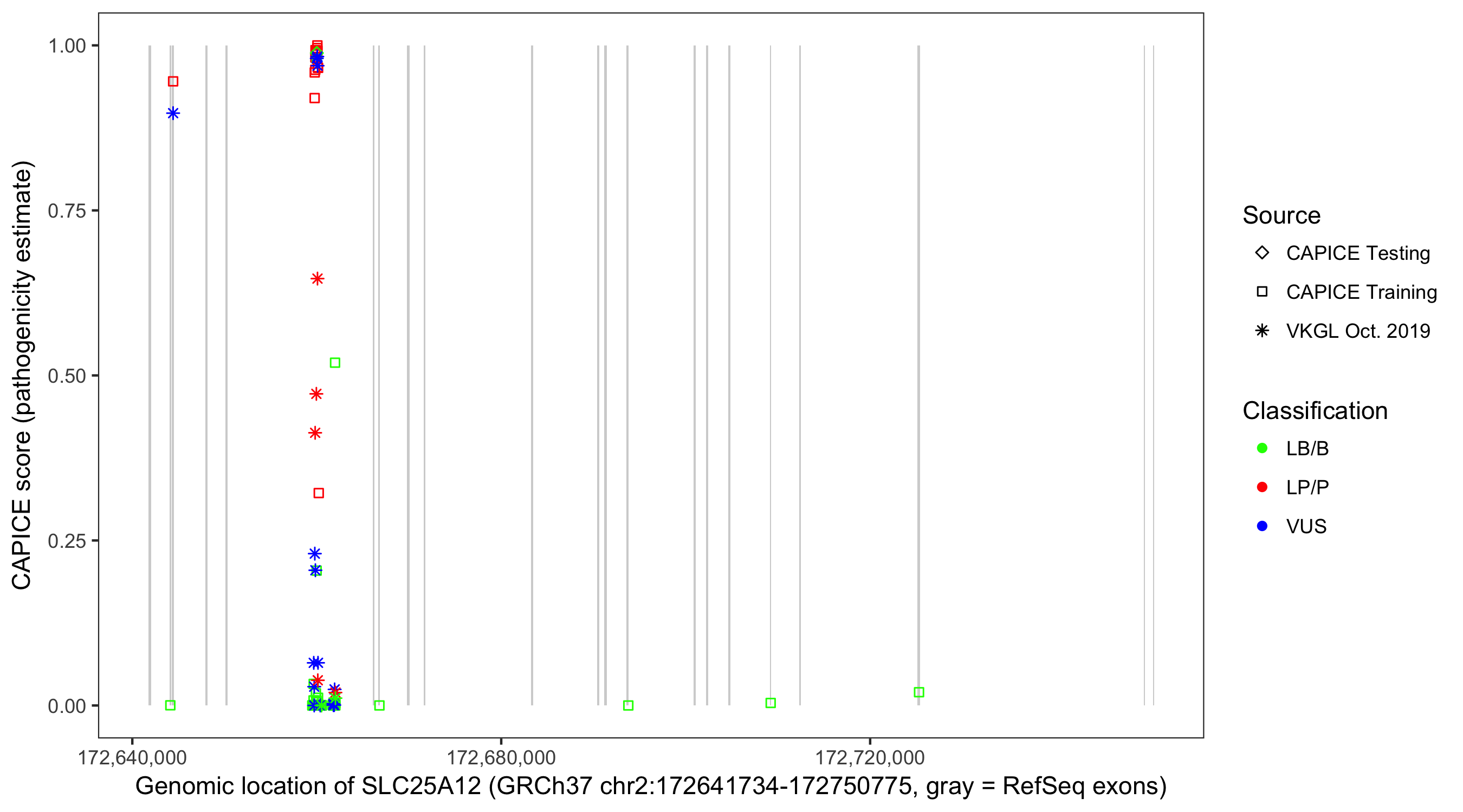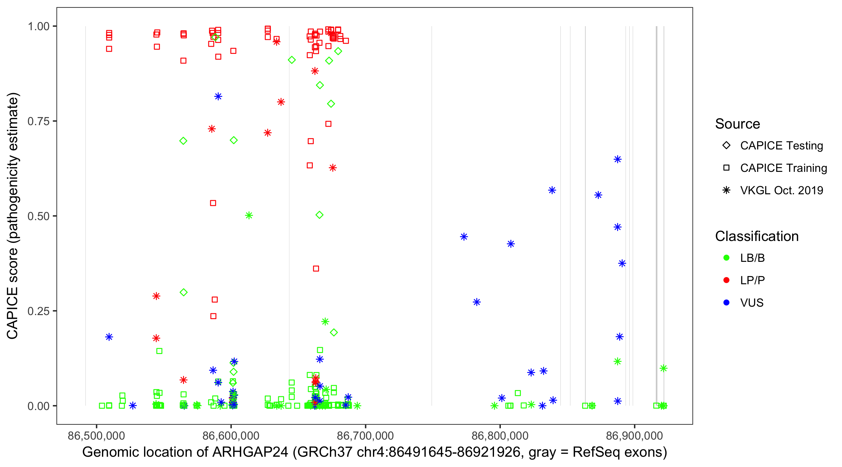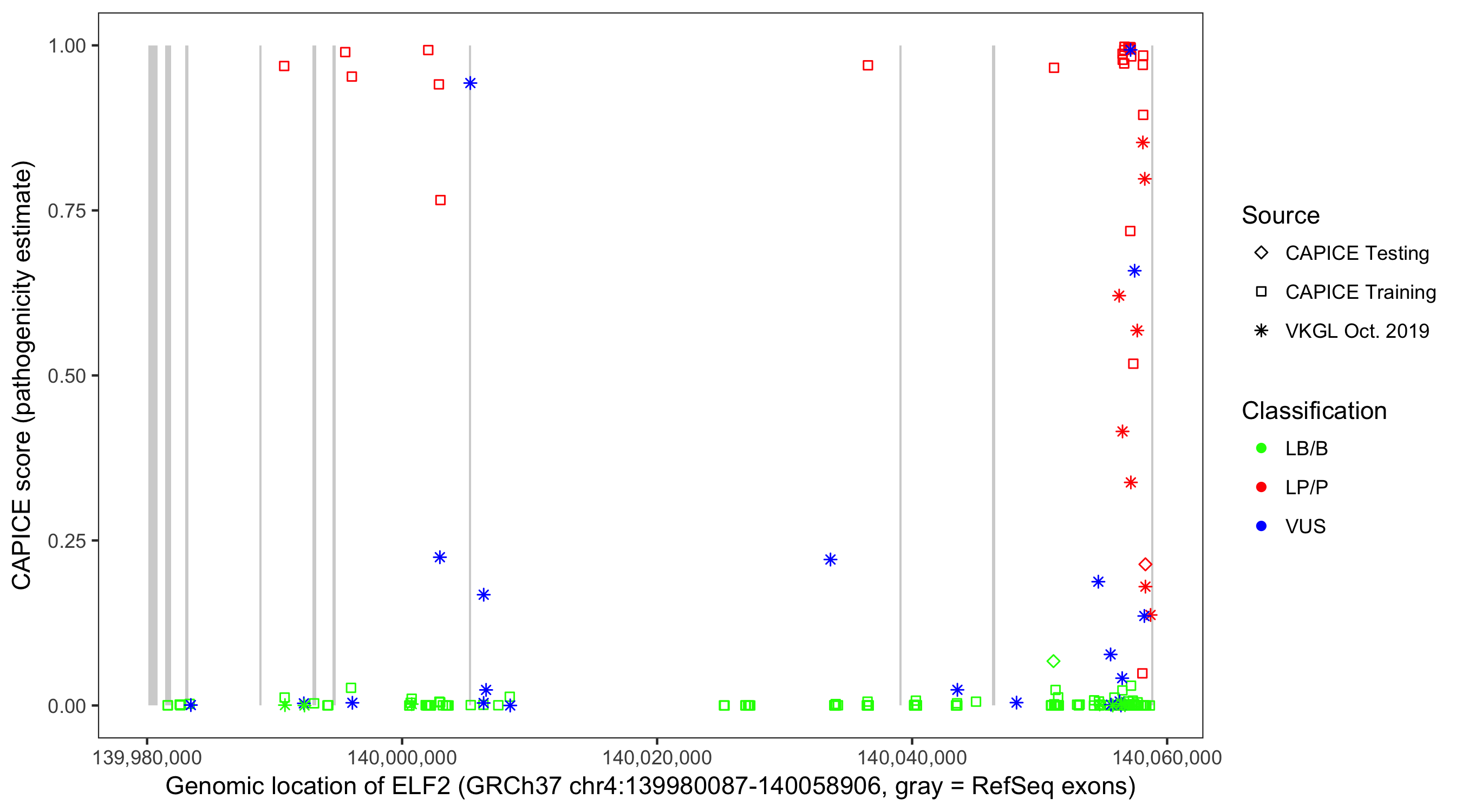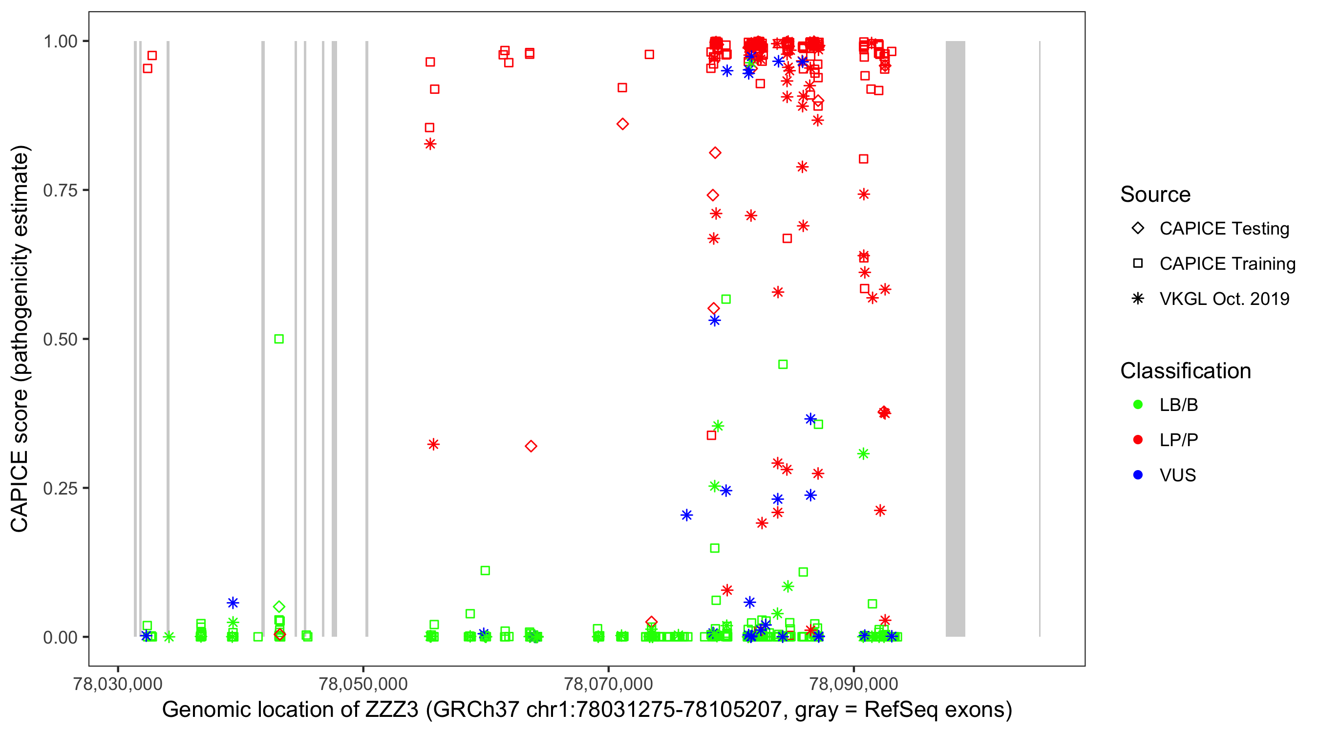 Shown are CAPICE train/test variants plus VKGL Oct 2019.