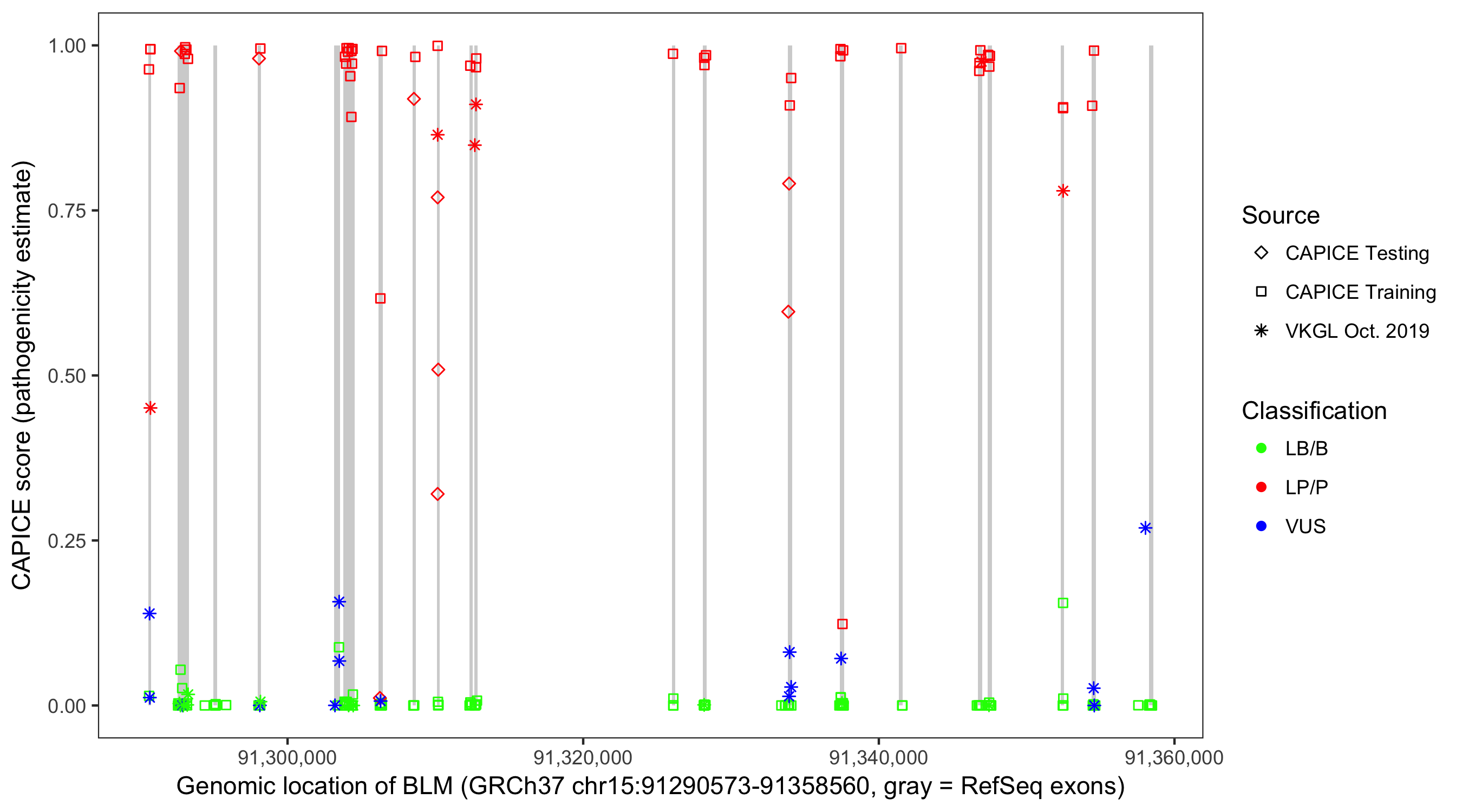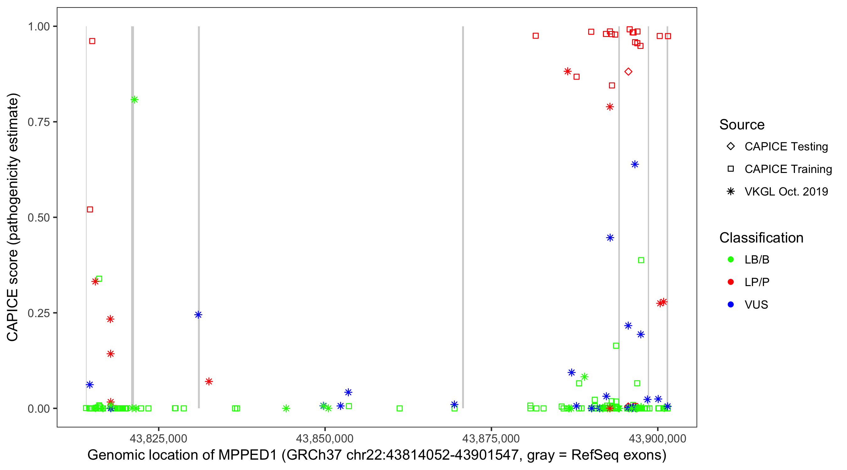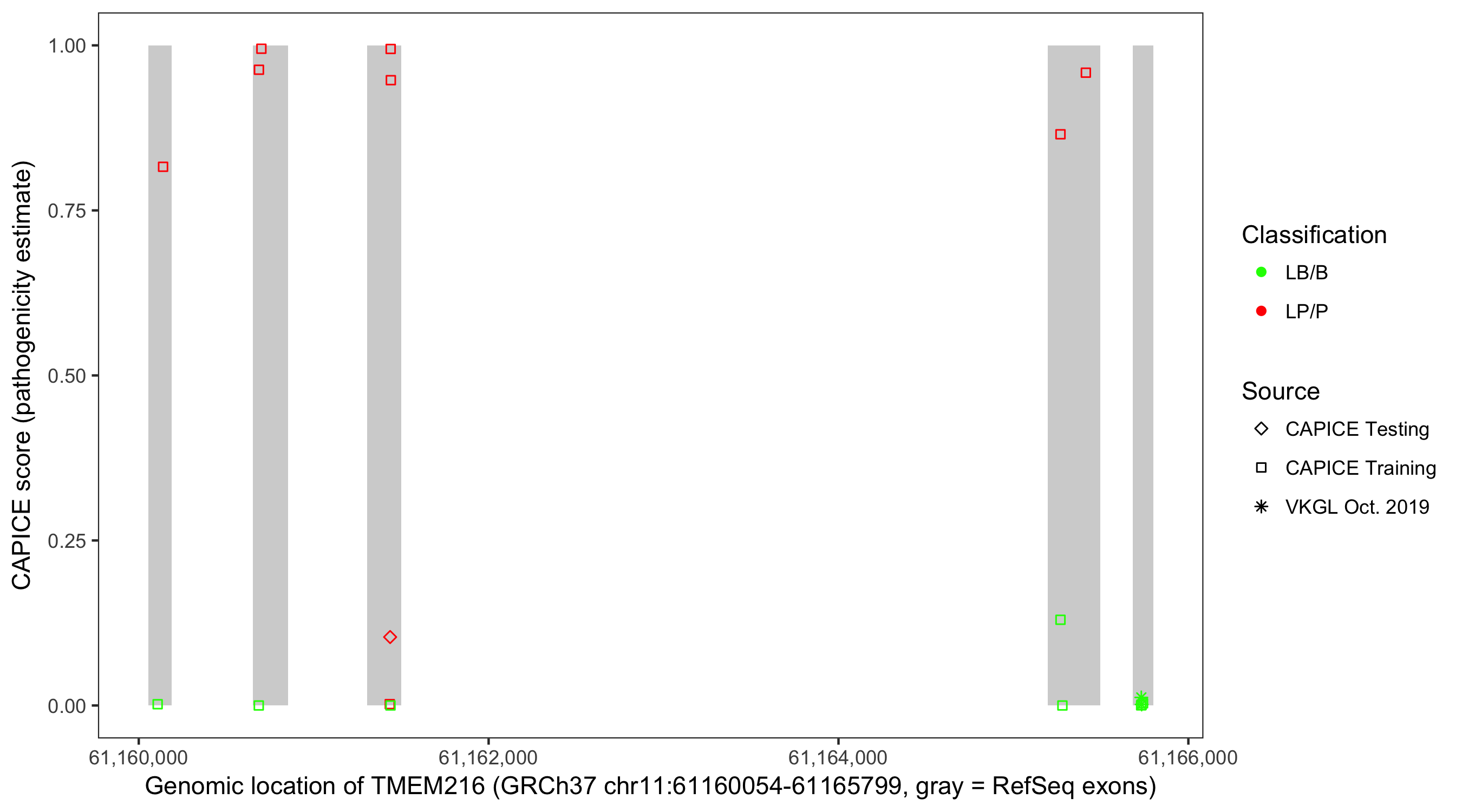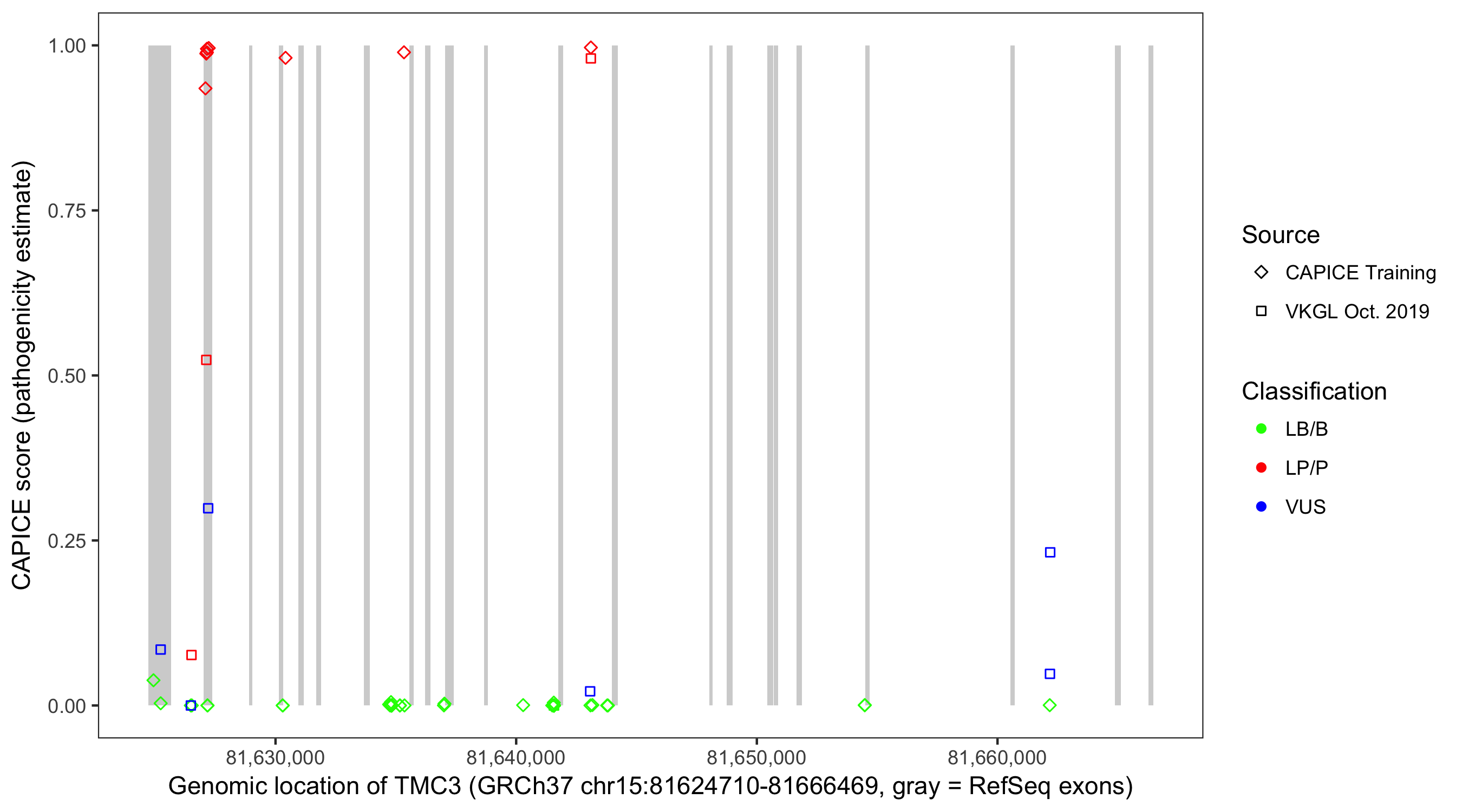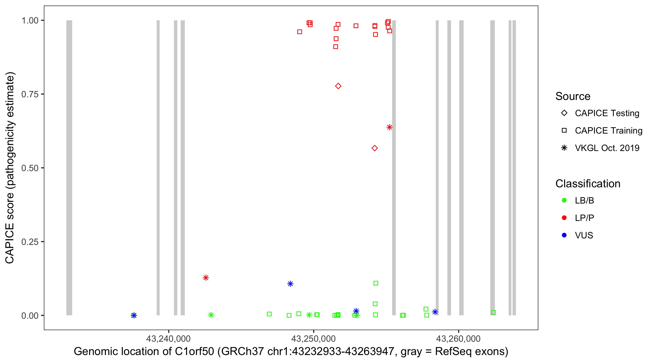 Shown are CAPICE train/test variants plus VKGL Oct 2019.