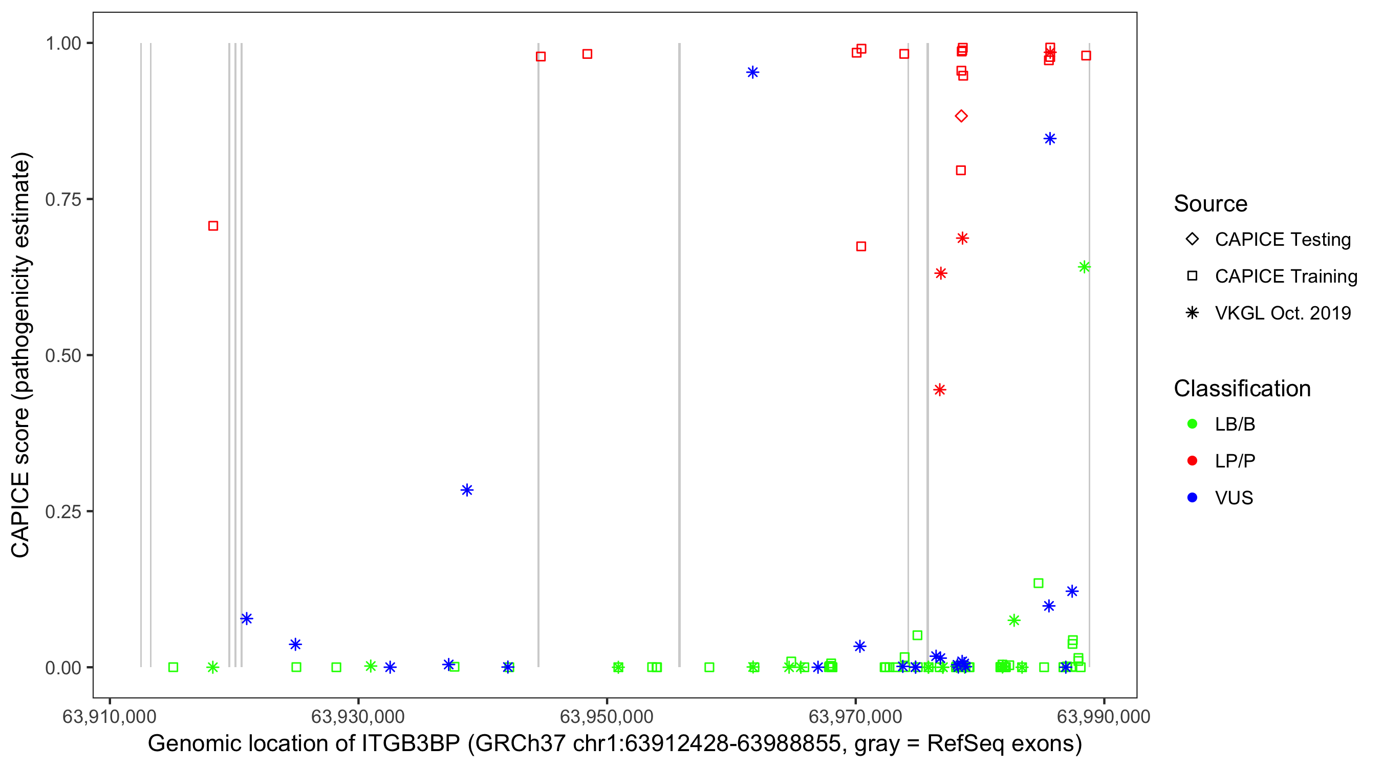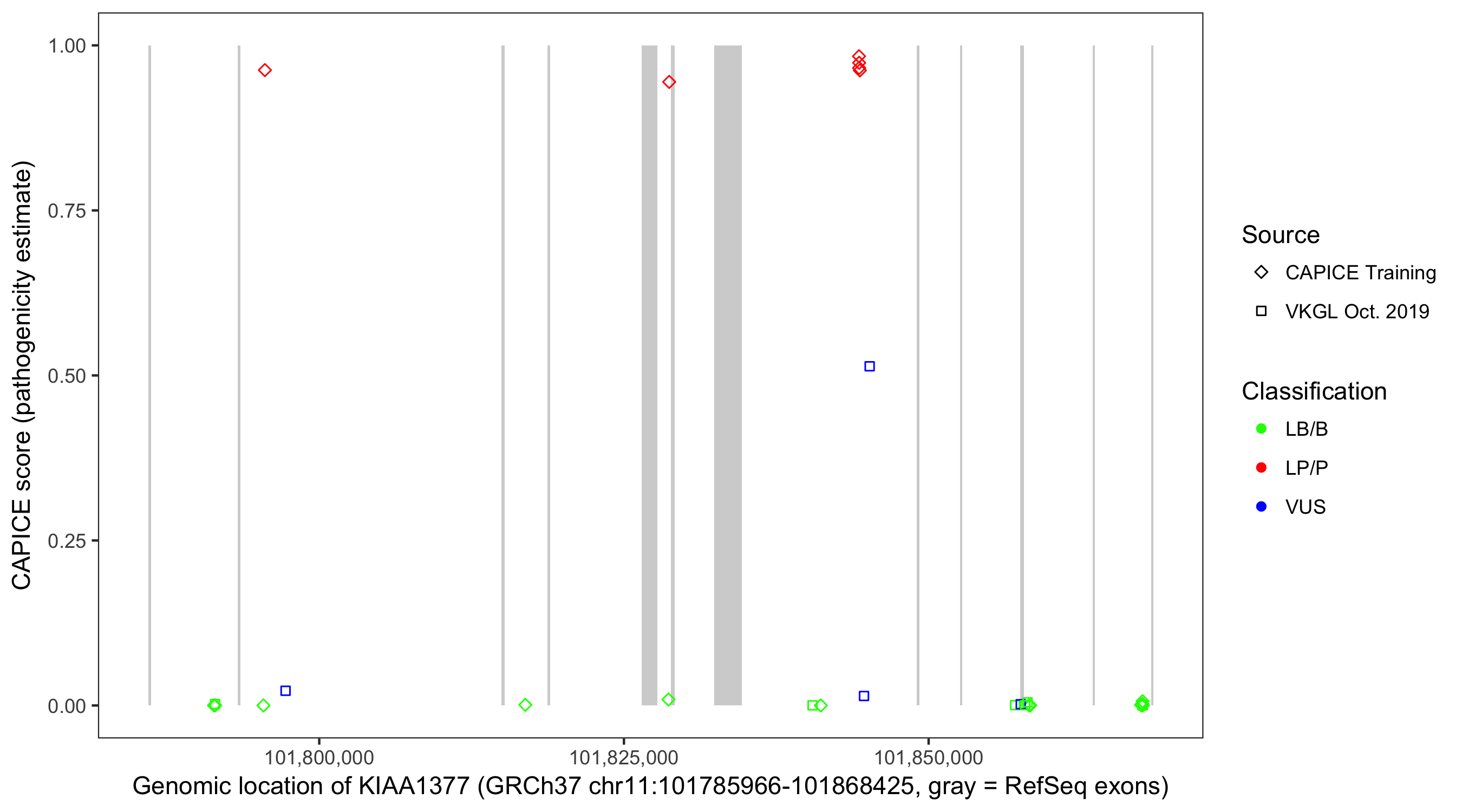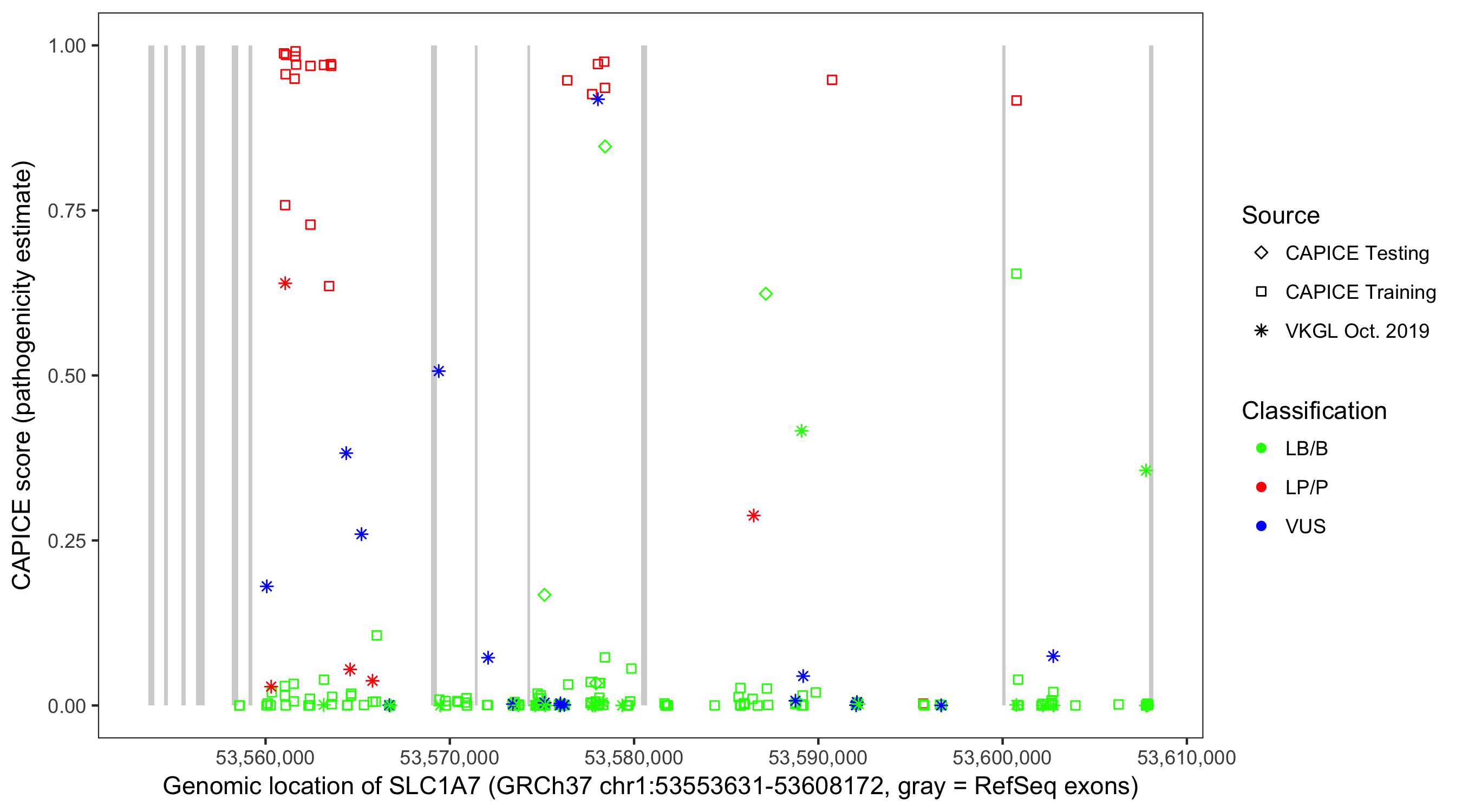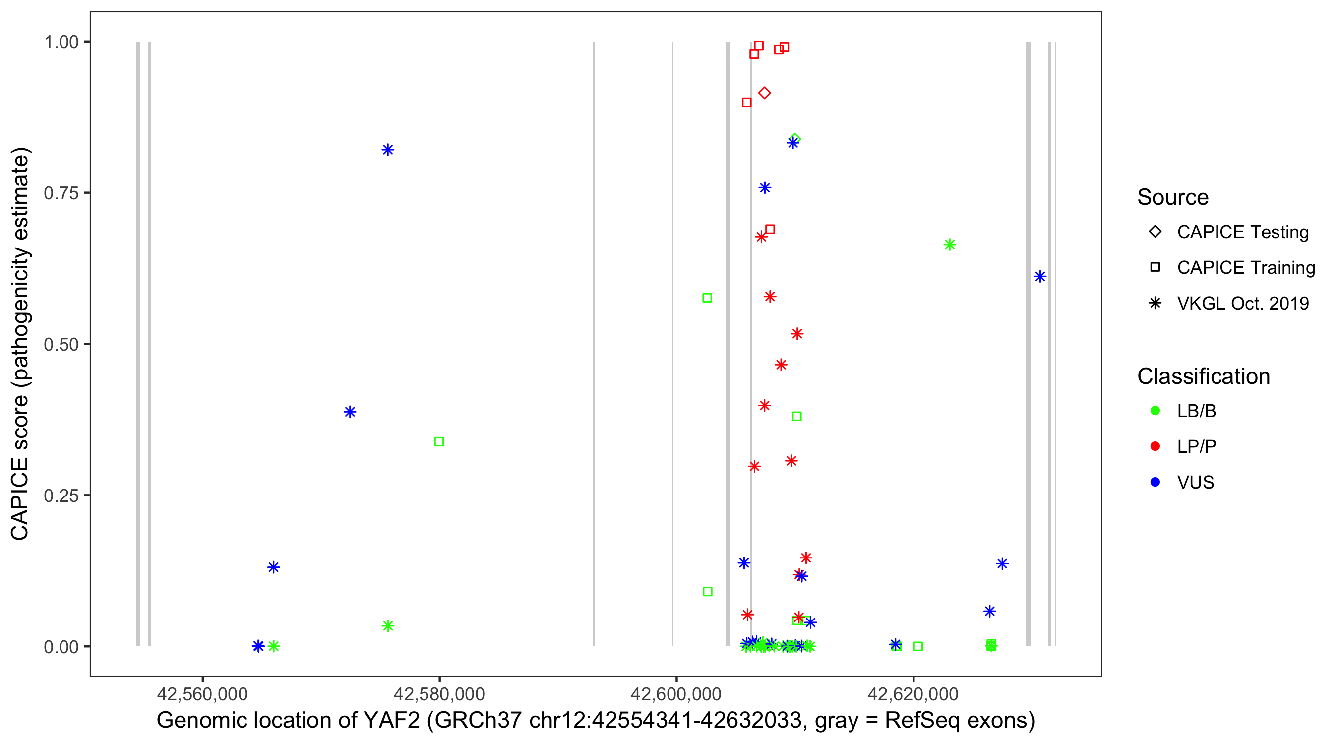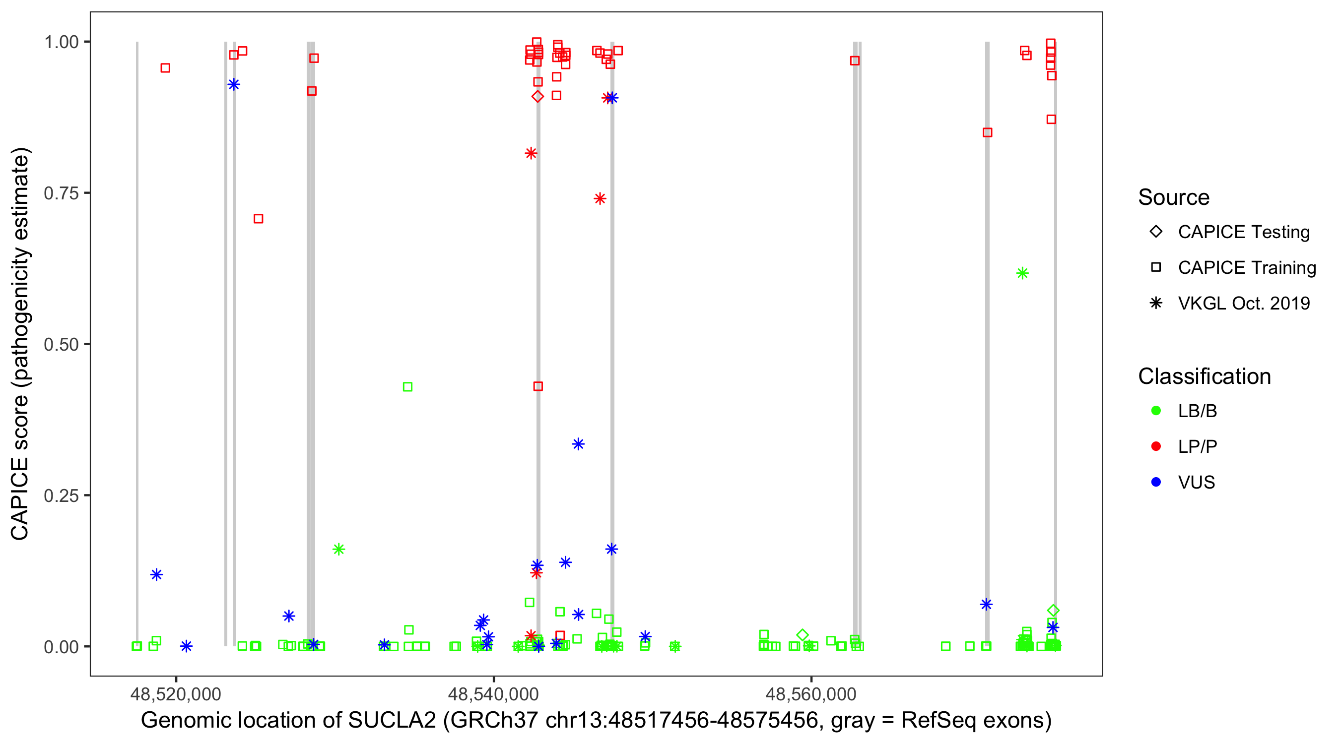 Shown are CAPICE train/test variants plus VKGL Oct 2019.