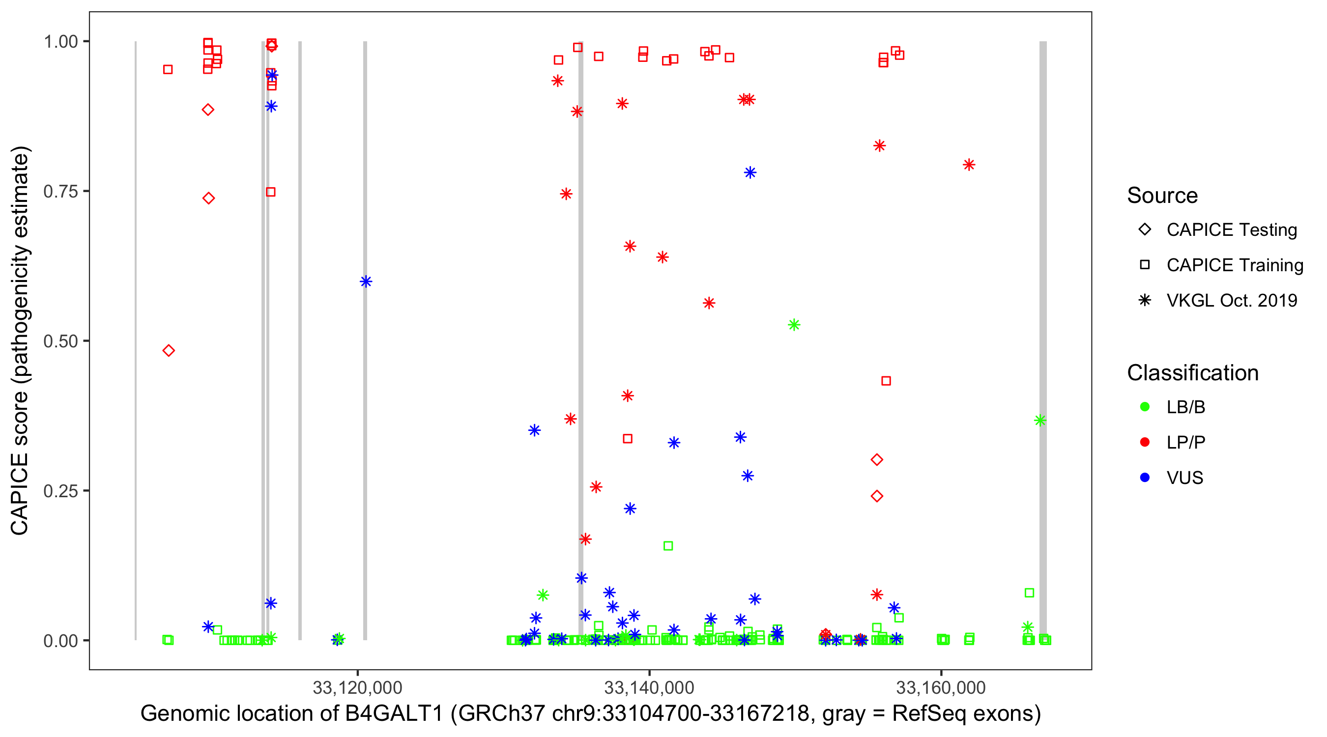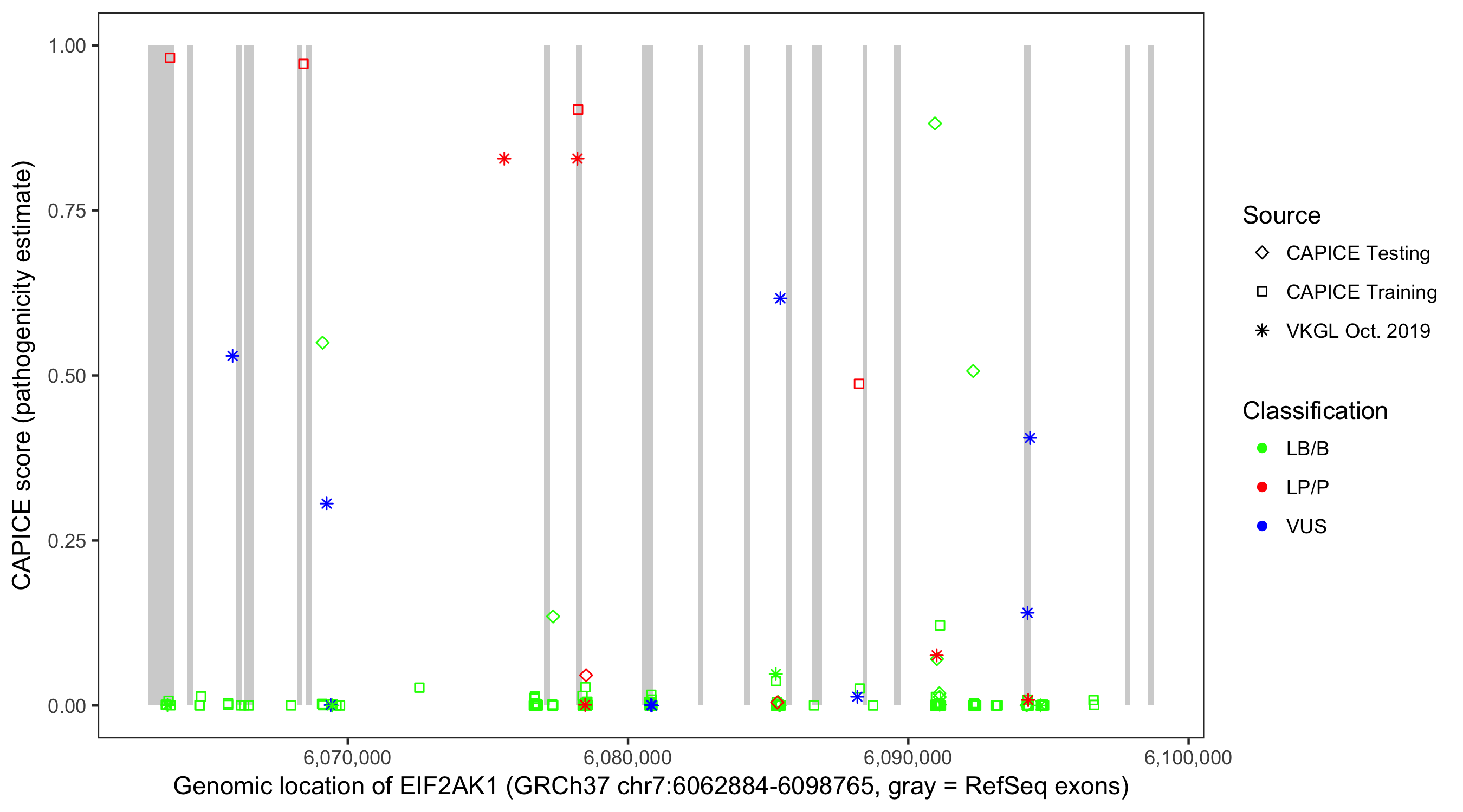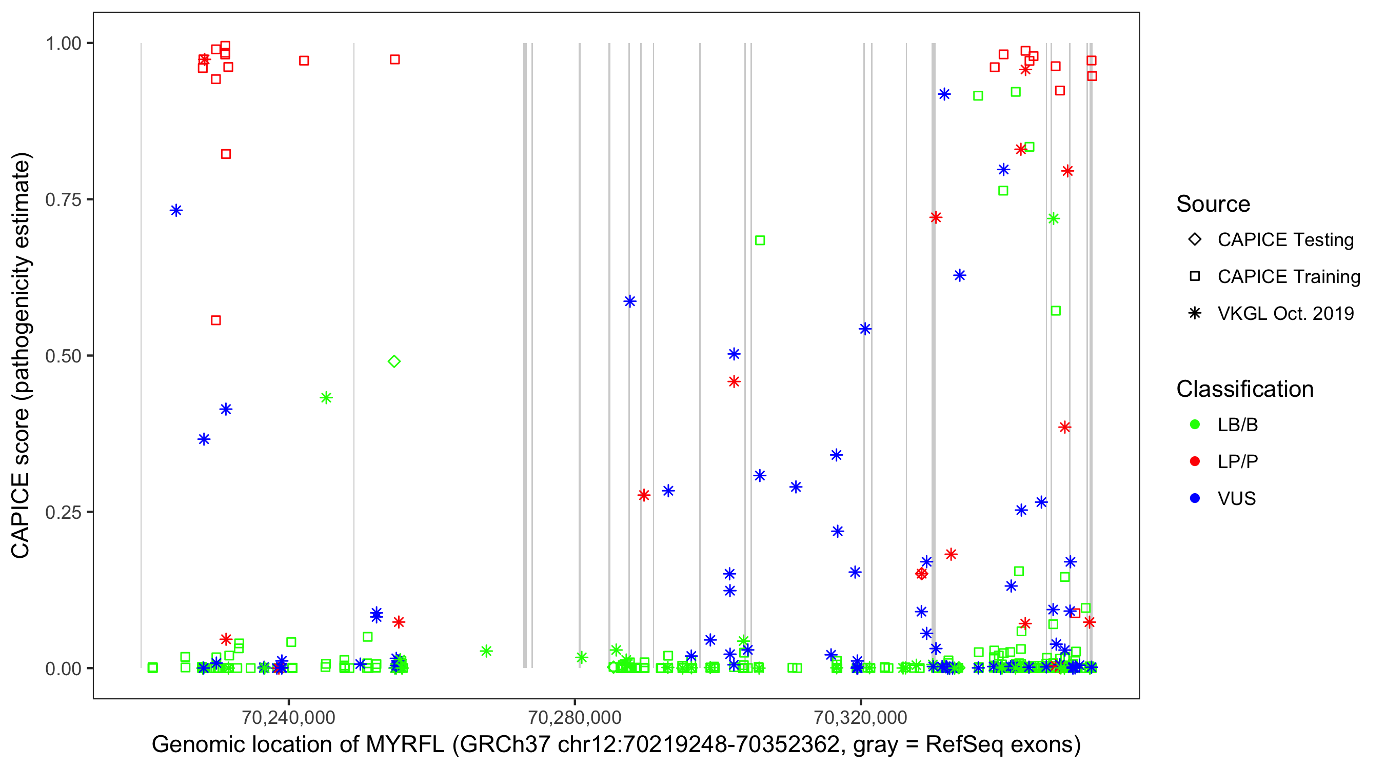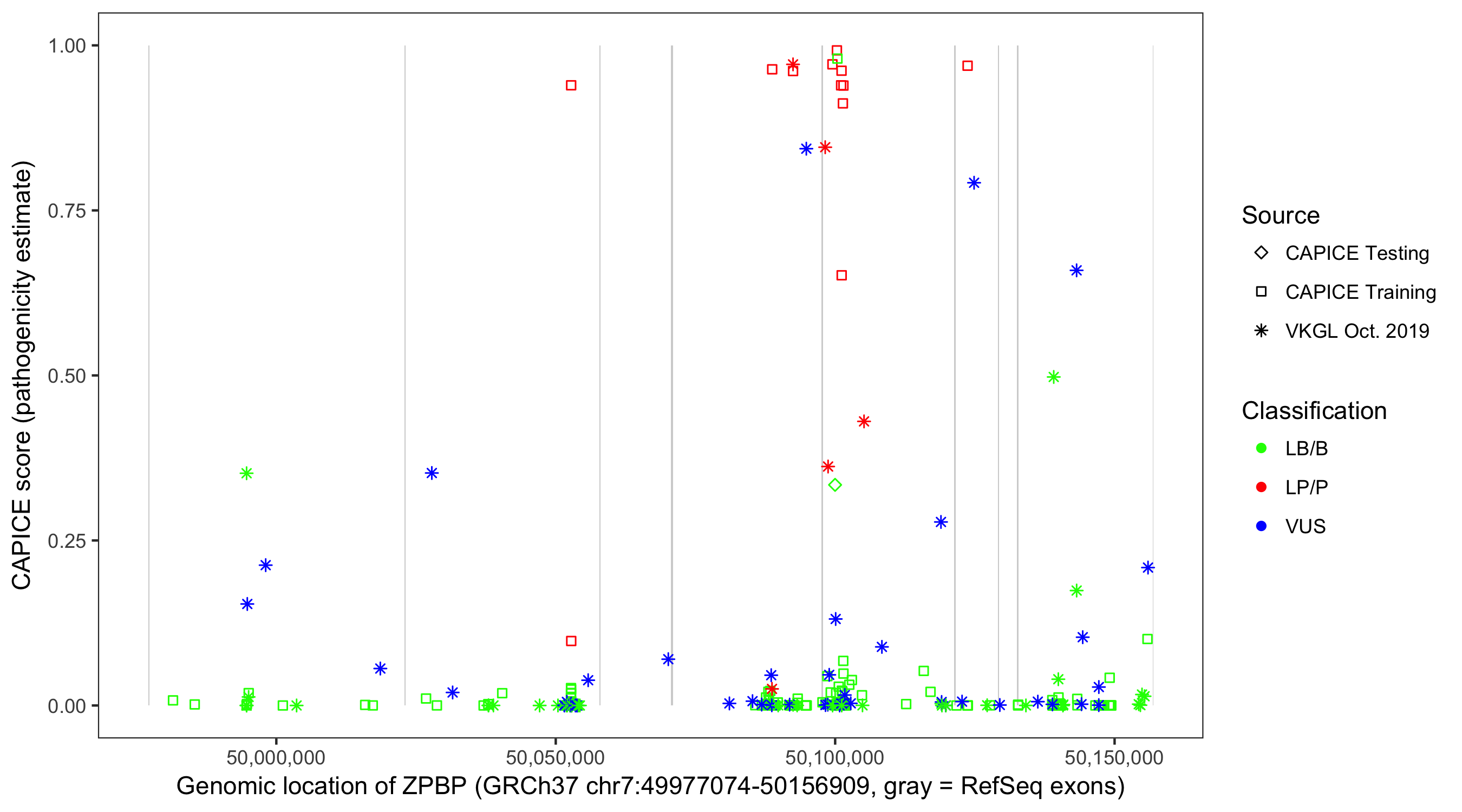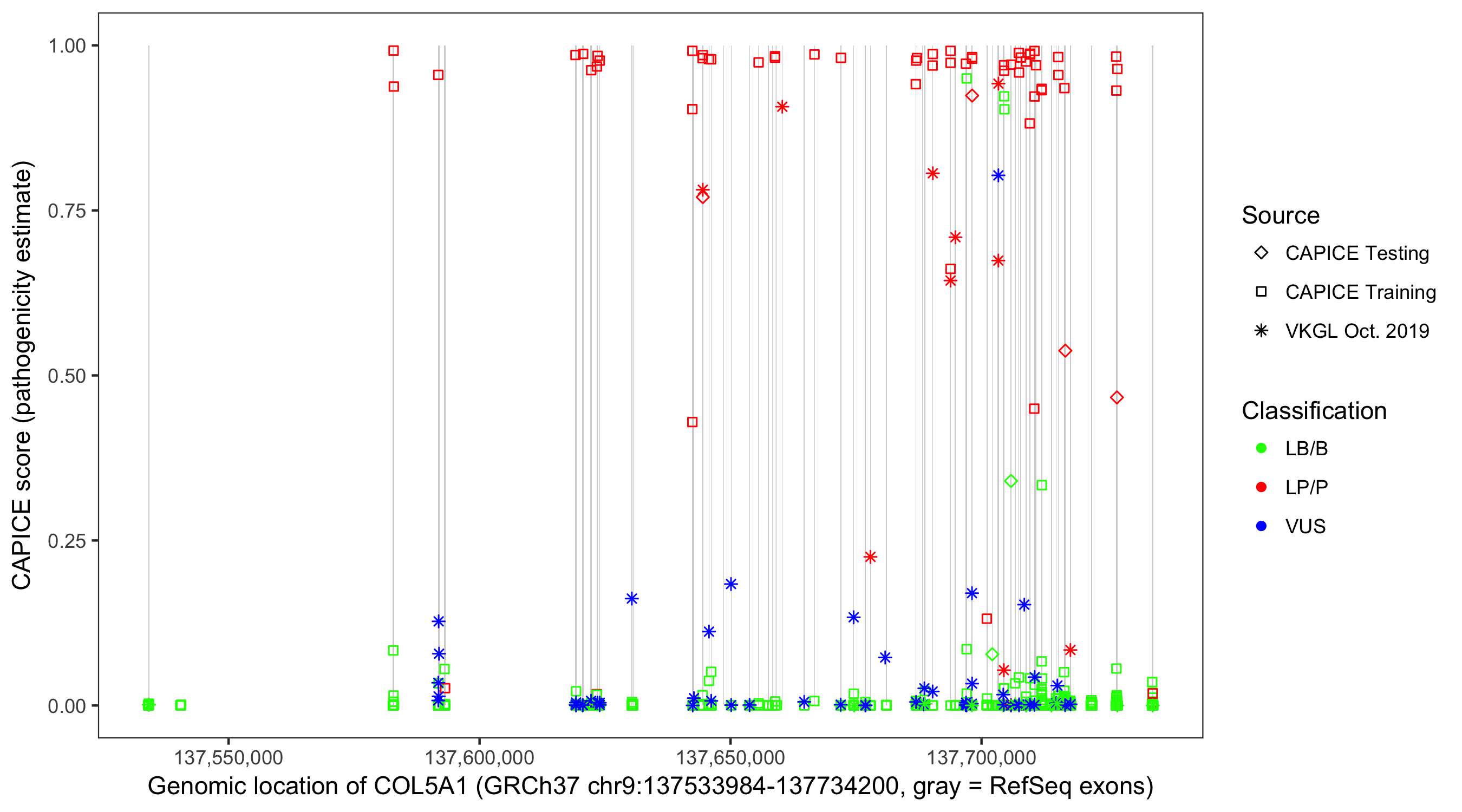 Shown are CAPICE train/test variants plus VKGL Oct 2019.