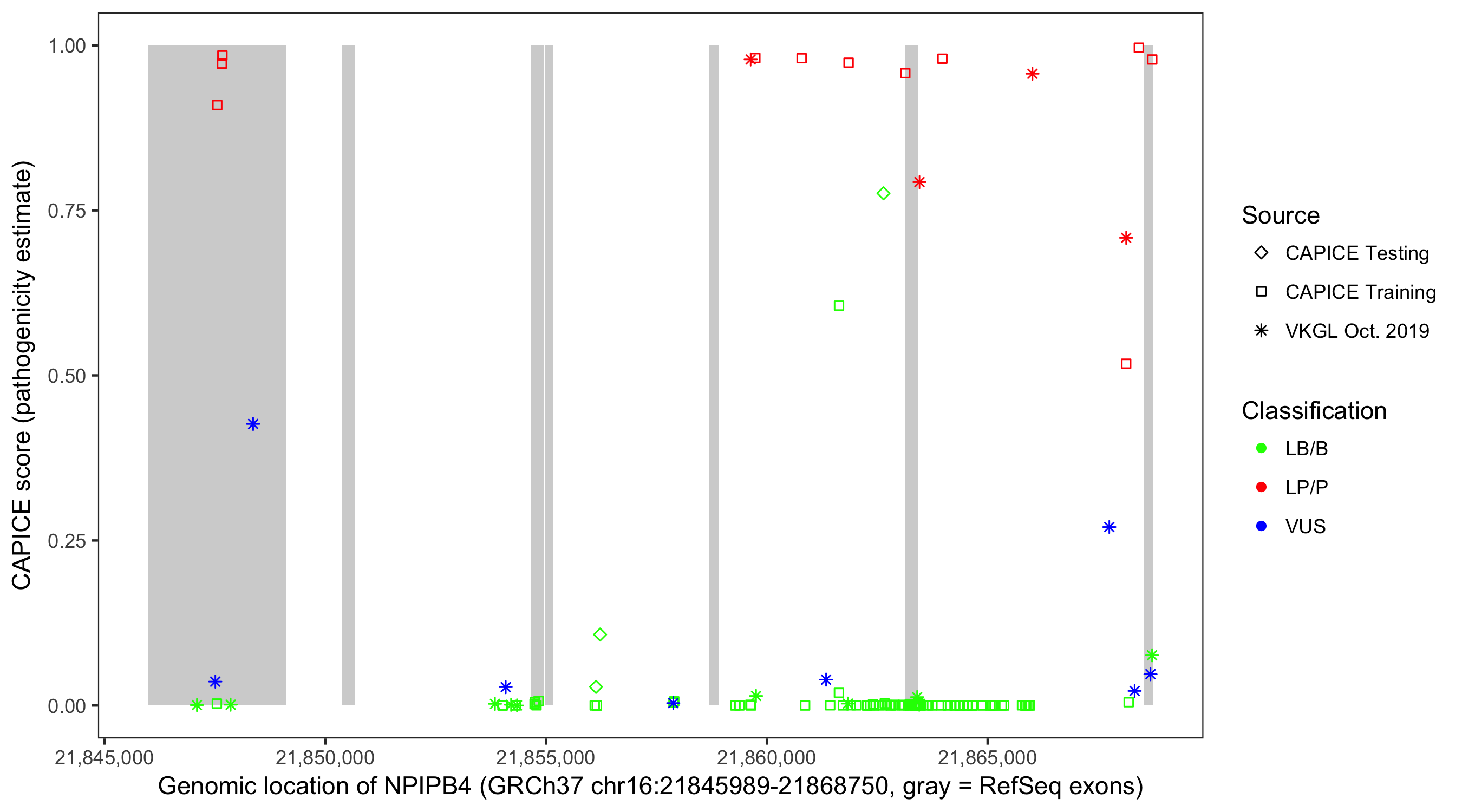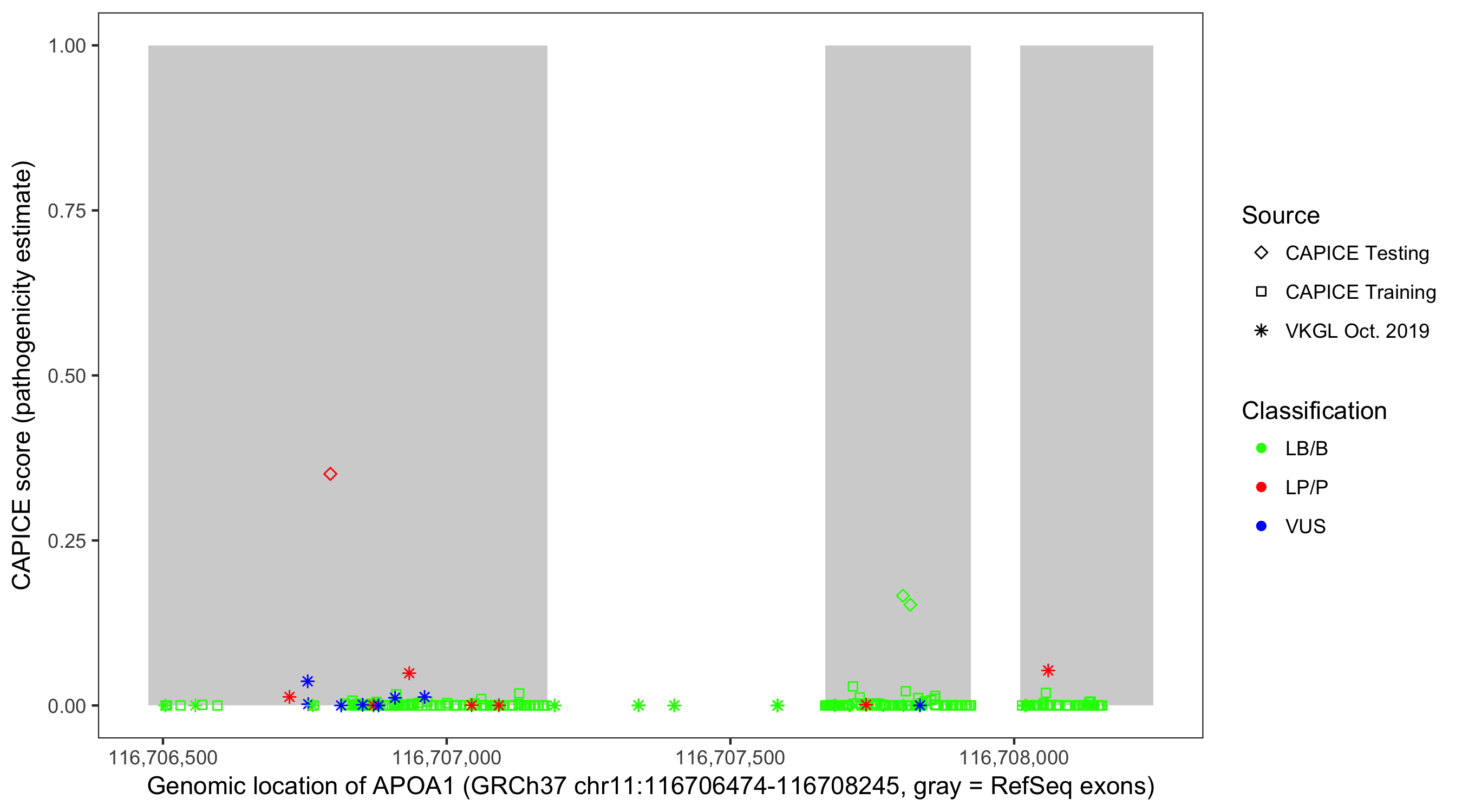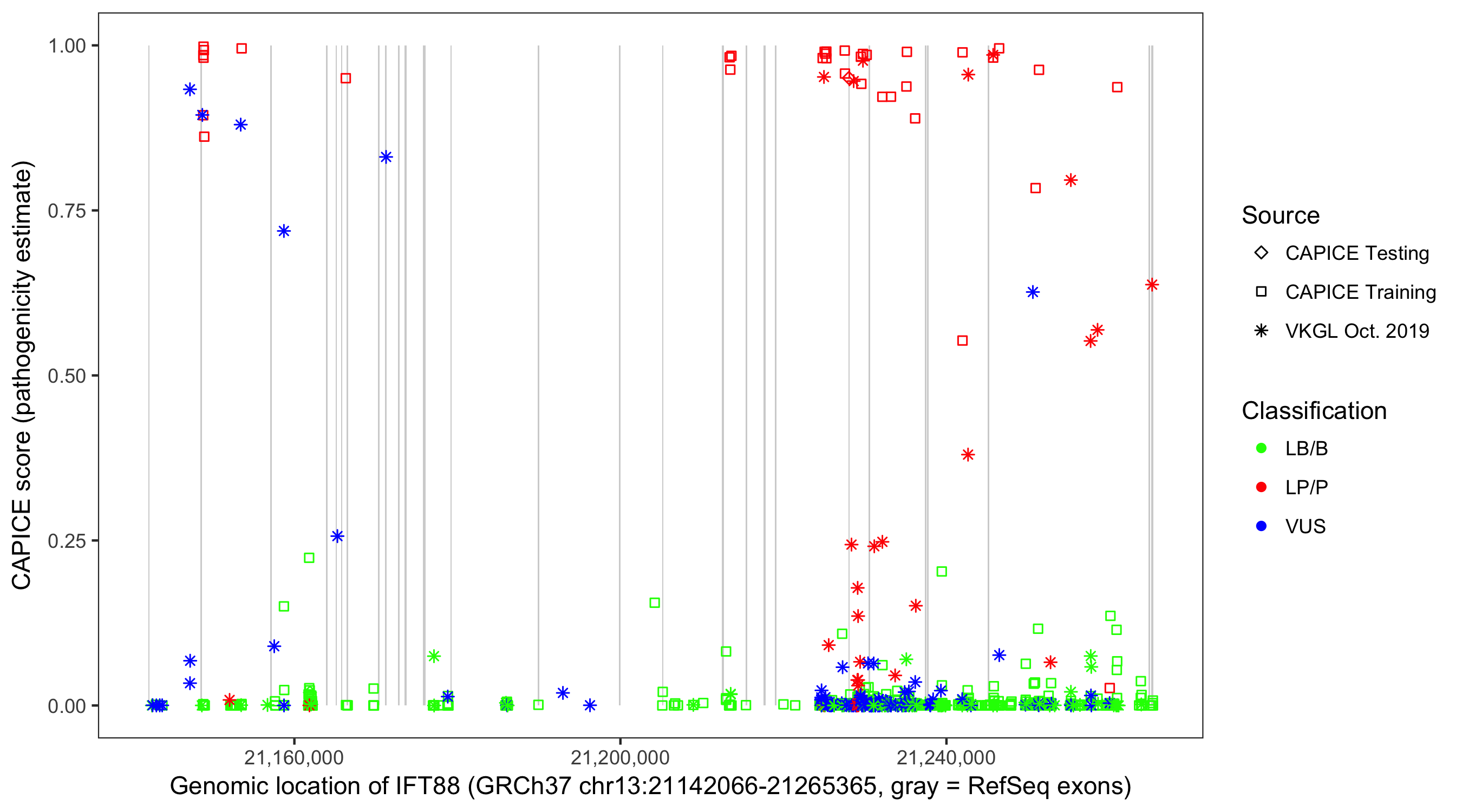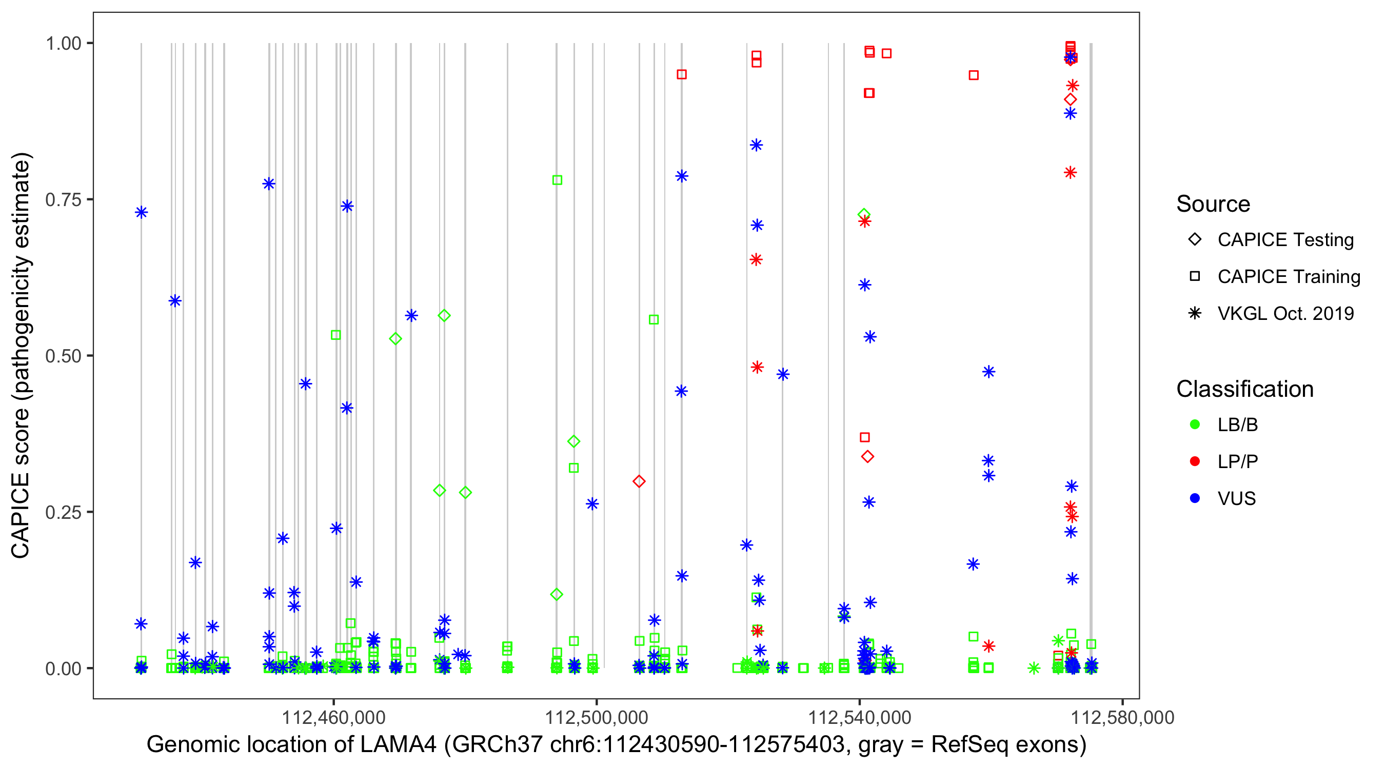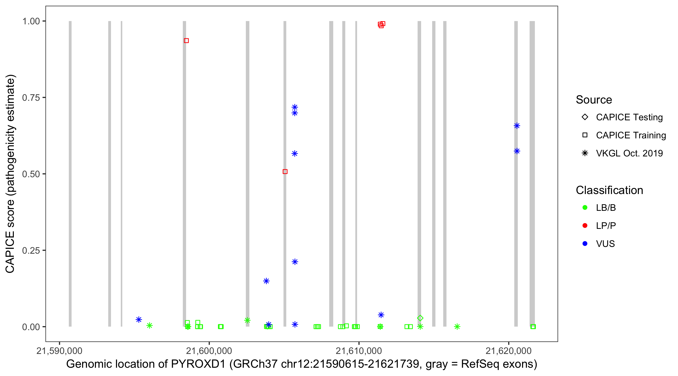 Shown are CAPICE train/test variants plus VKGL Oct 2019.