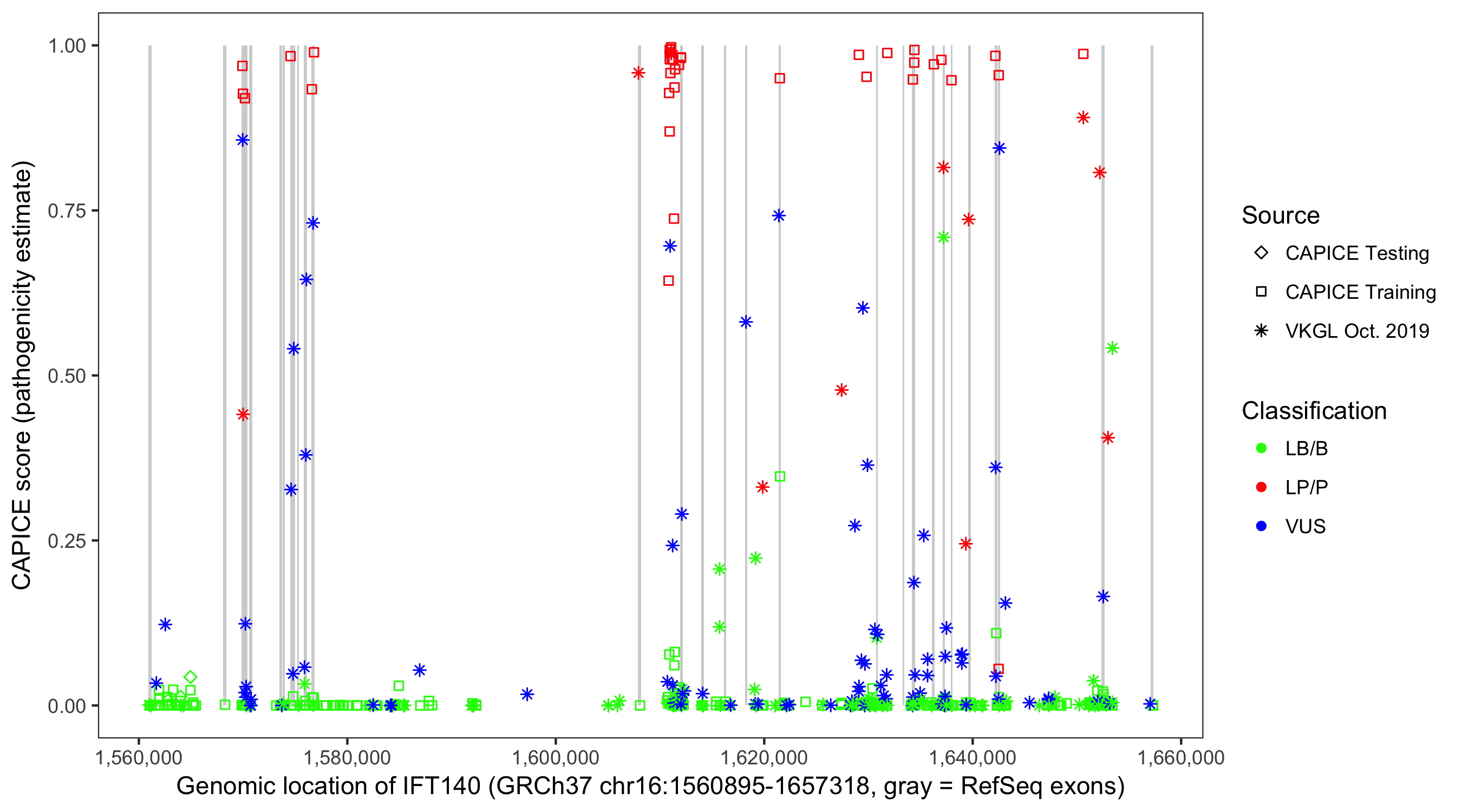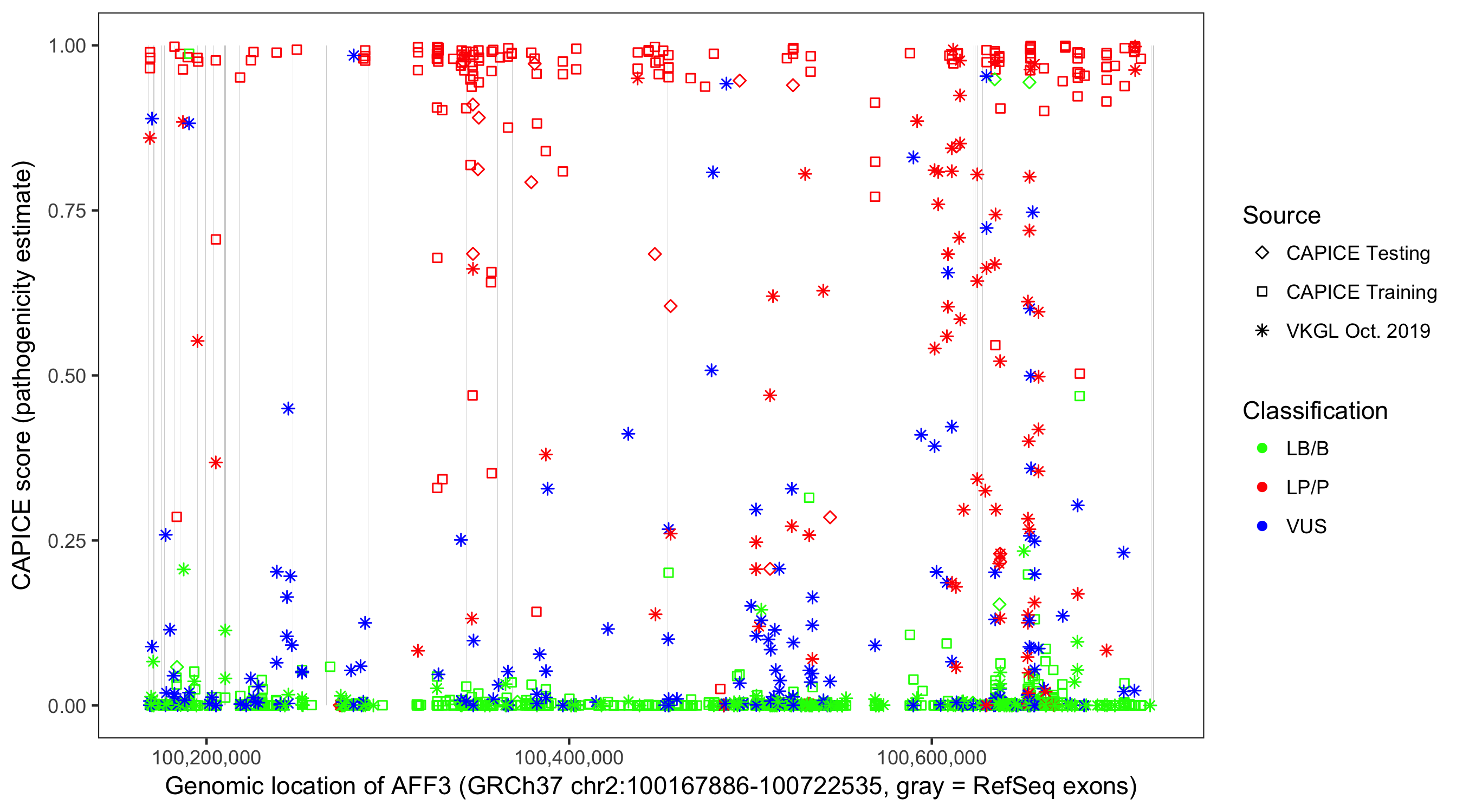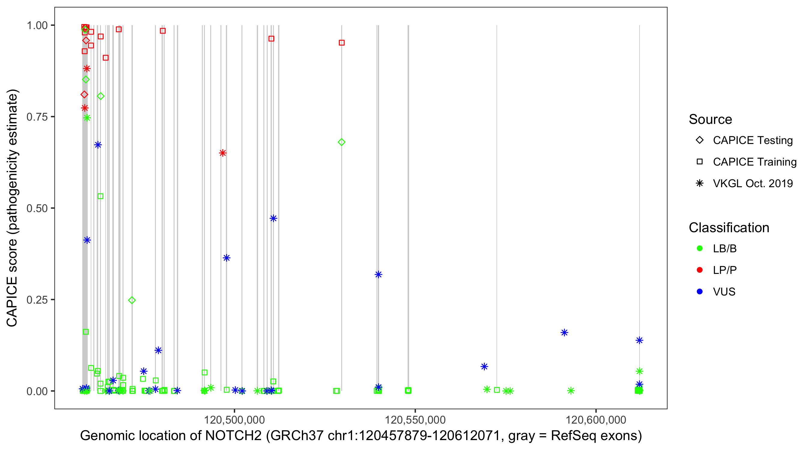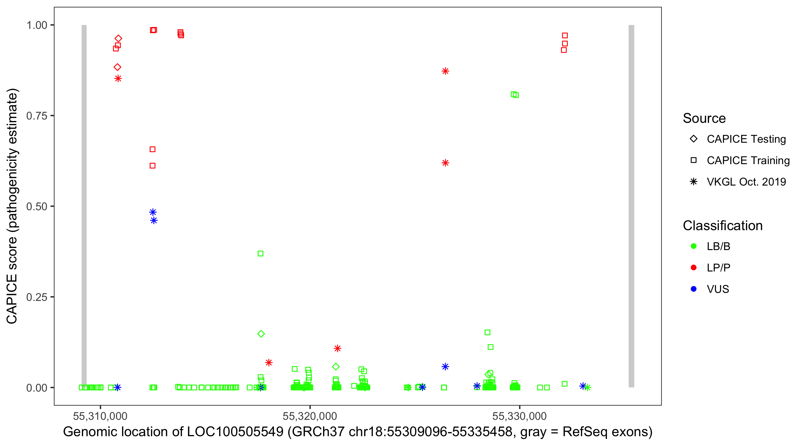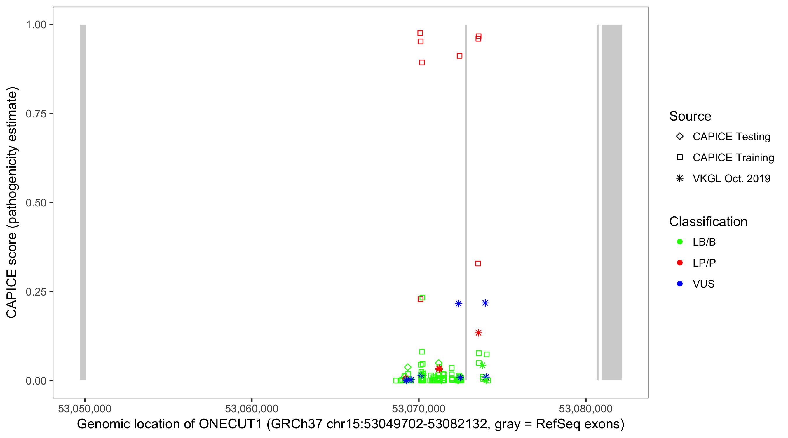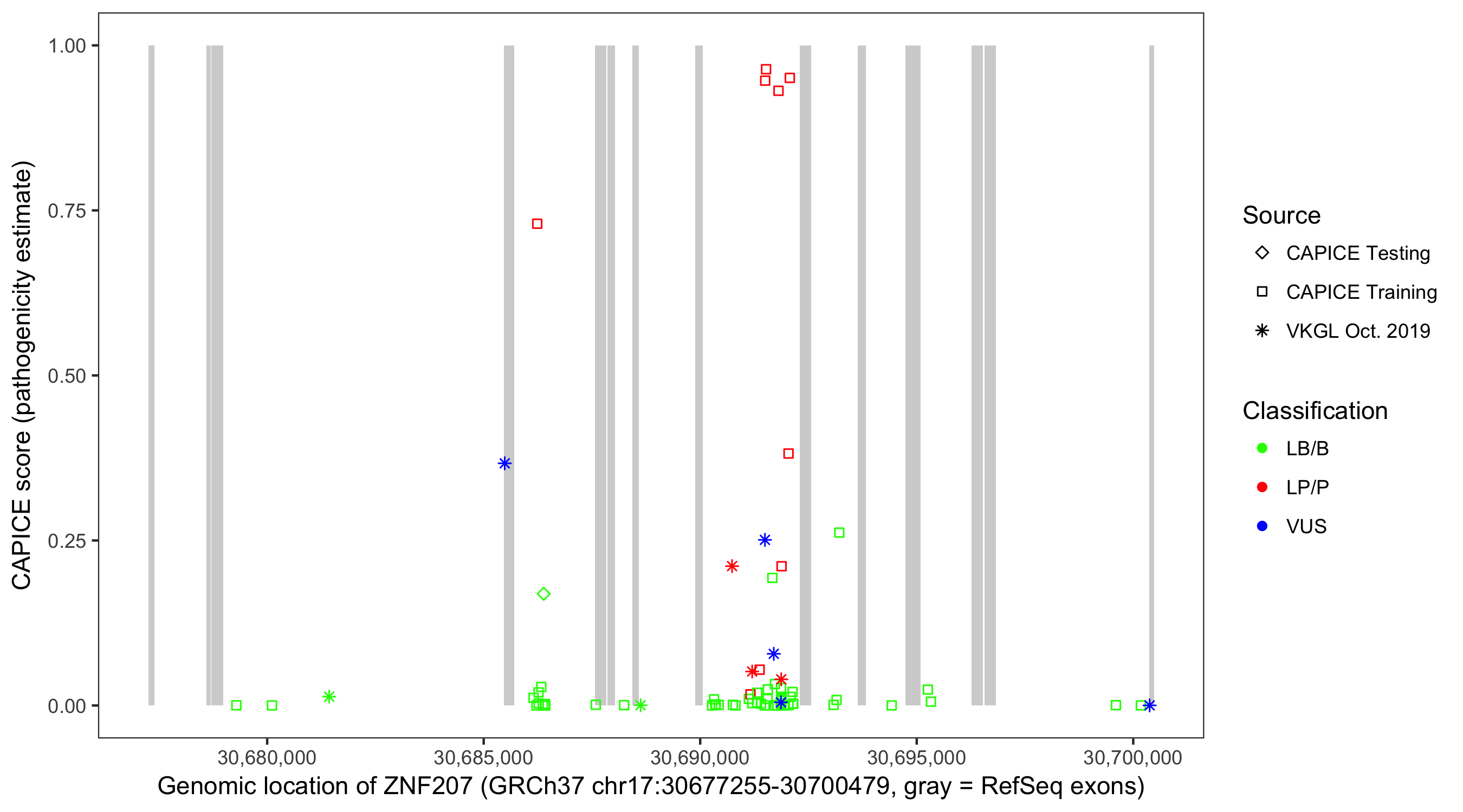 Shown are CAPICE train/test variants plus VKGL Oct 2019.