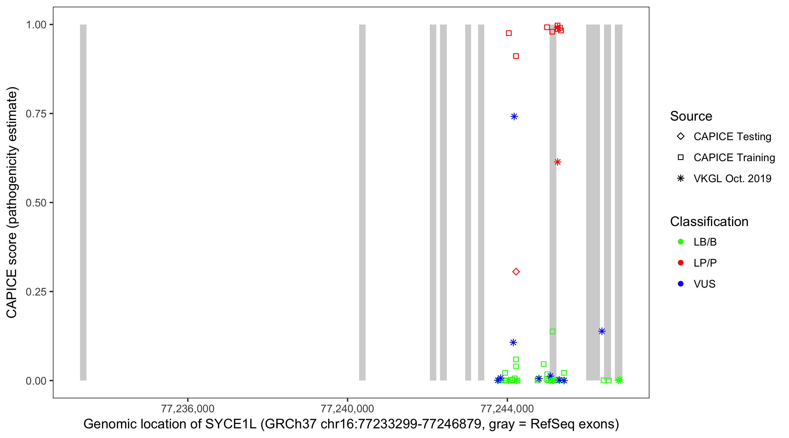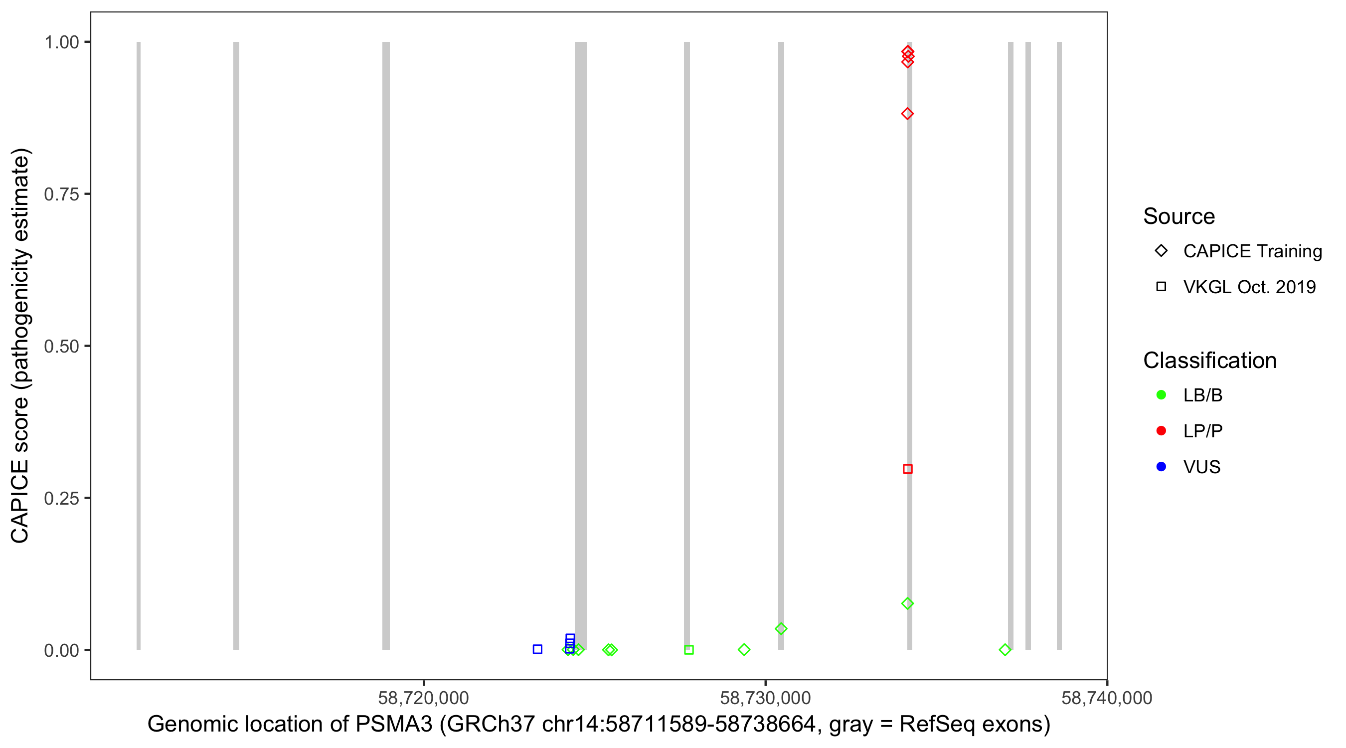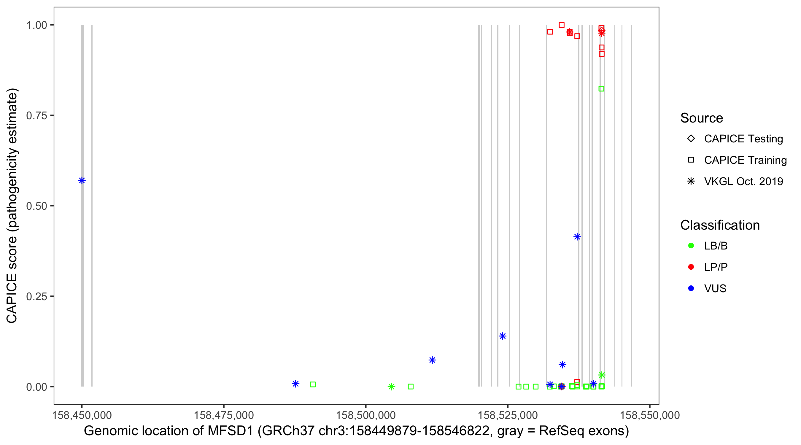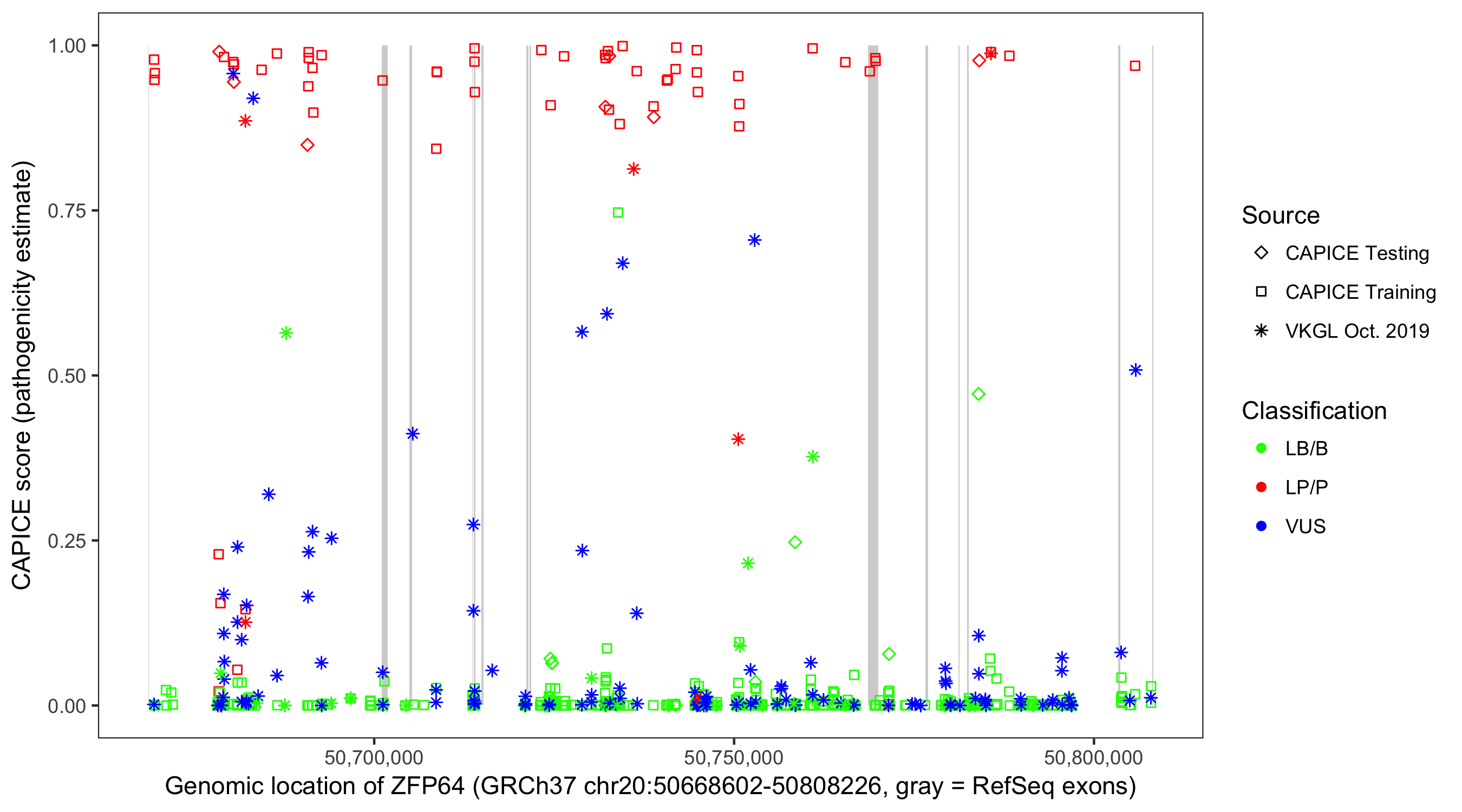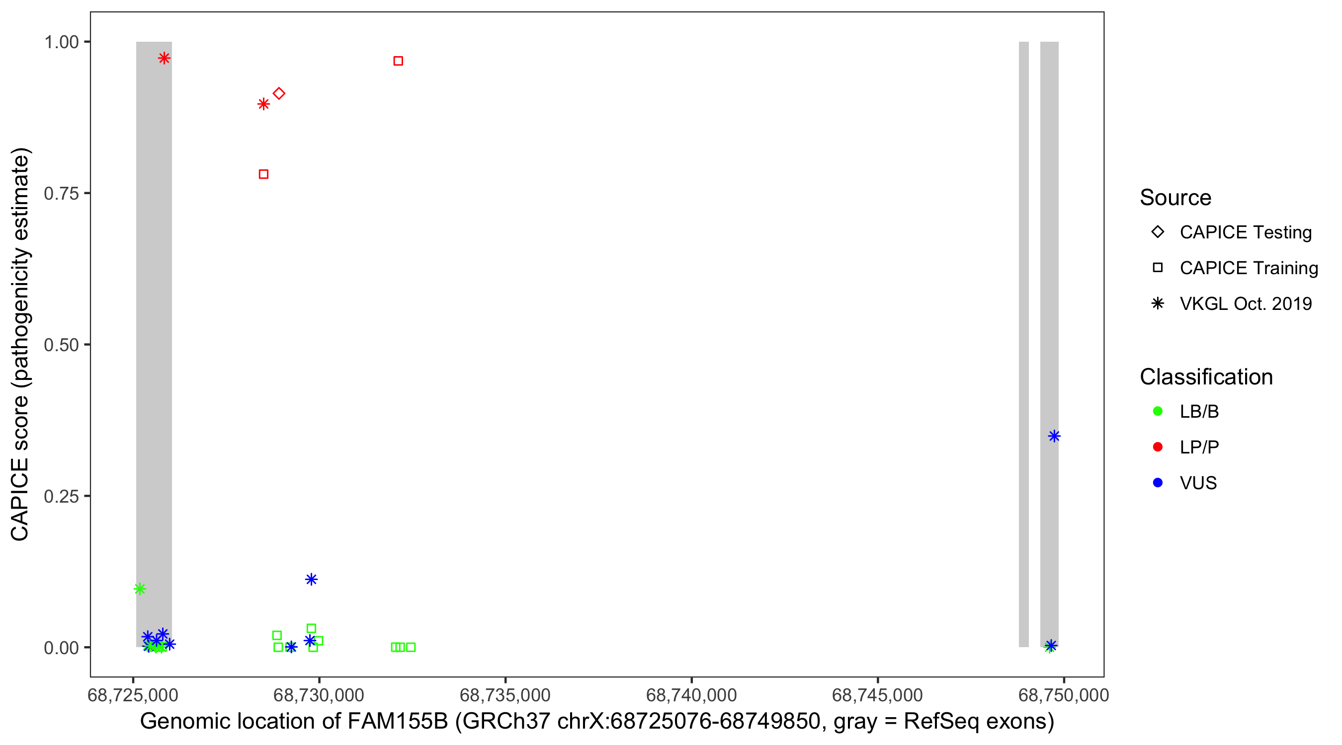Shown are CAPICE train/test variants plus VKGL Oct 2019.