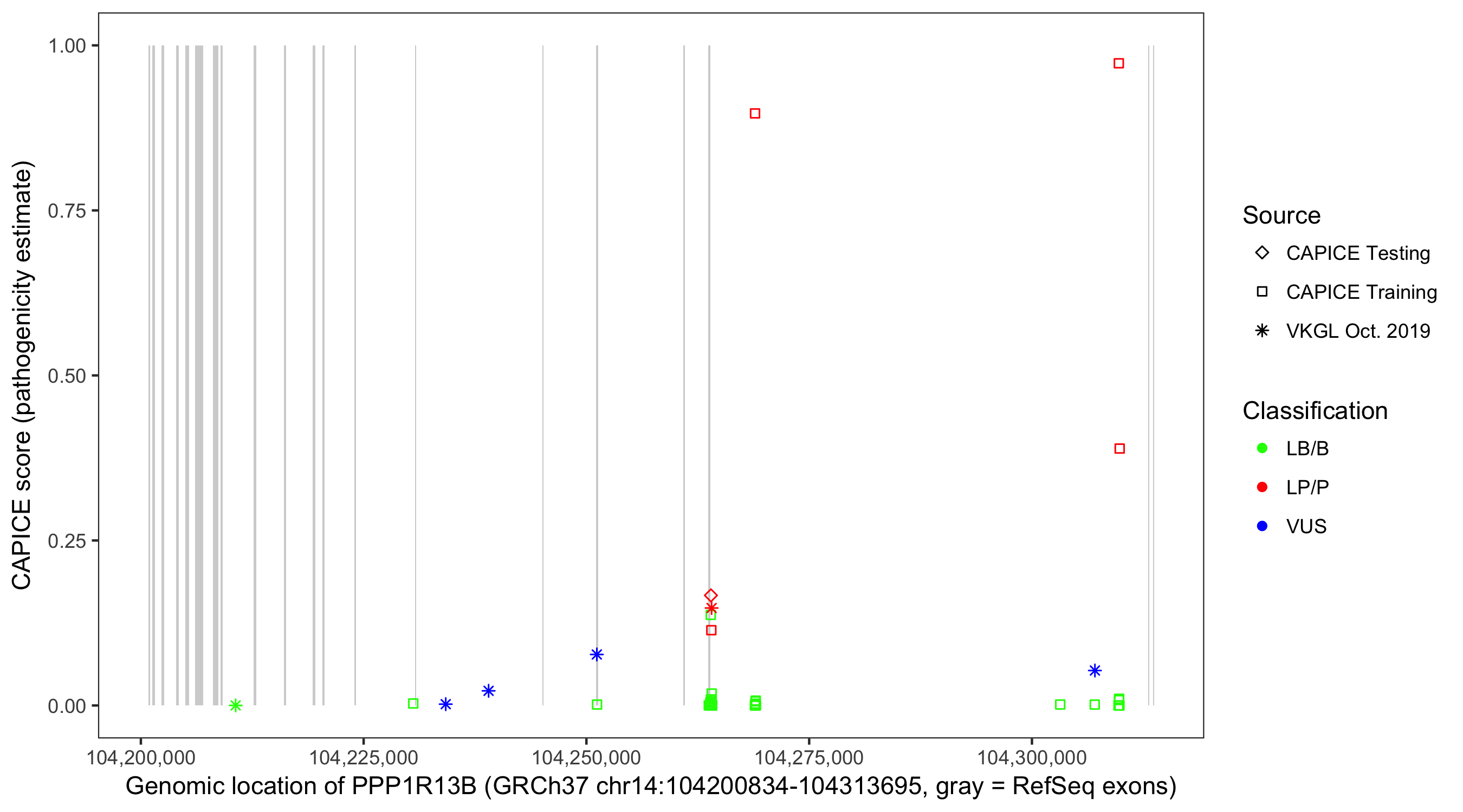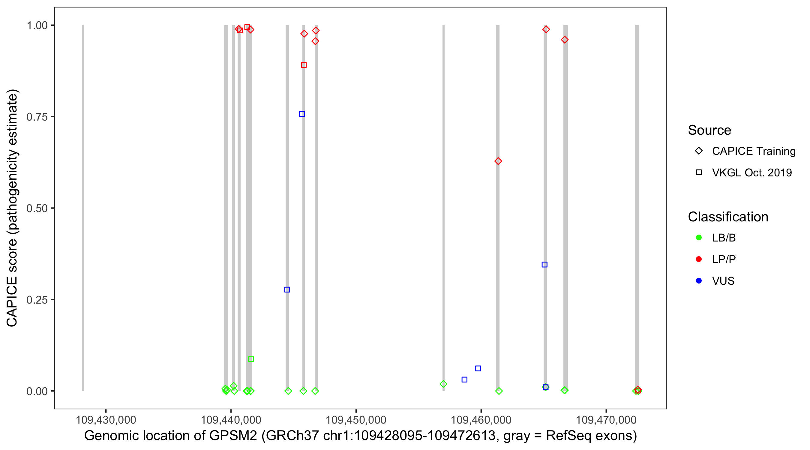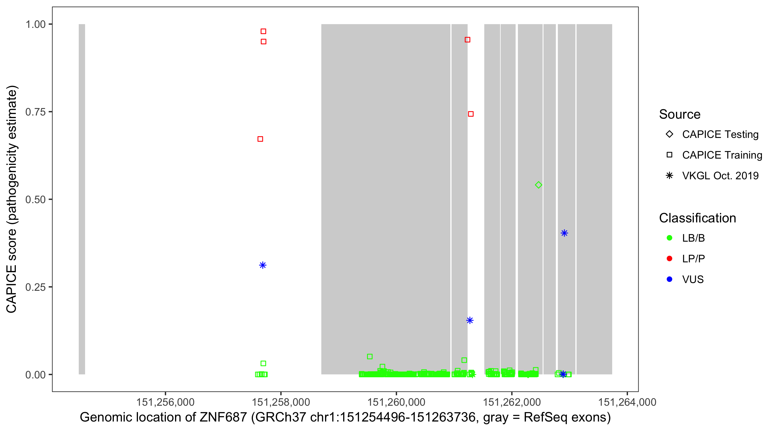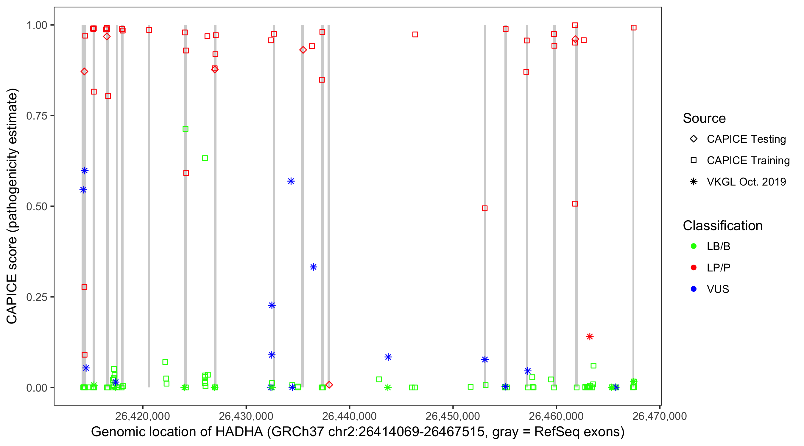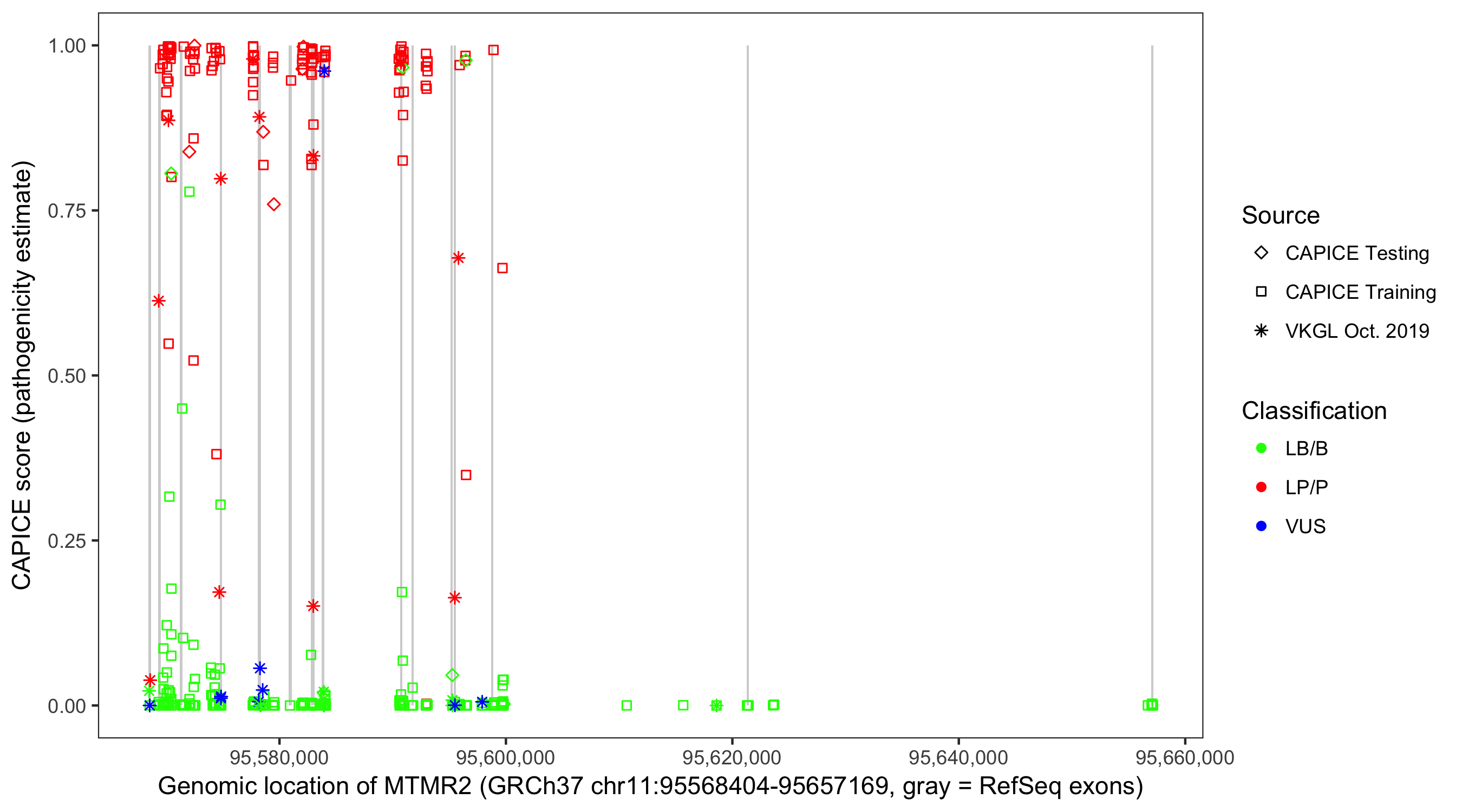 Shown are CAPICE train/test variants plus VKGL Oct 2019.