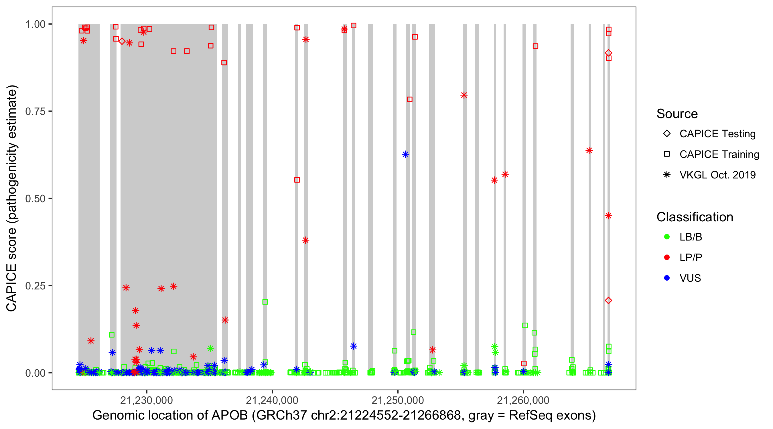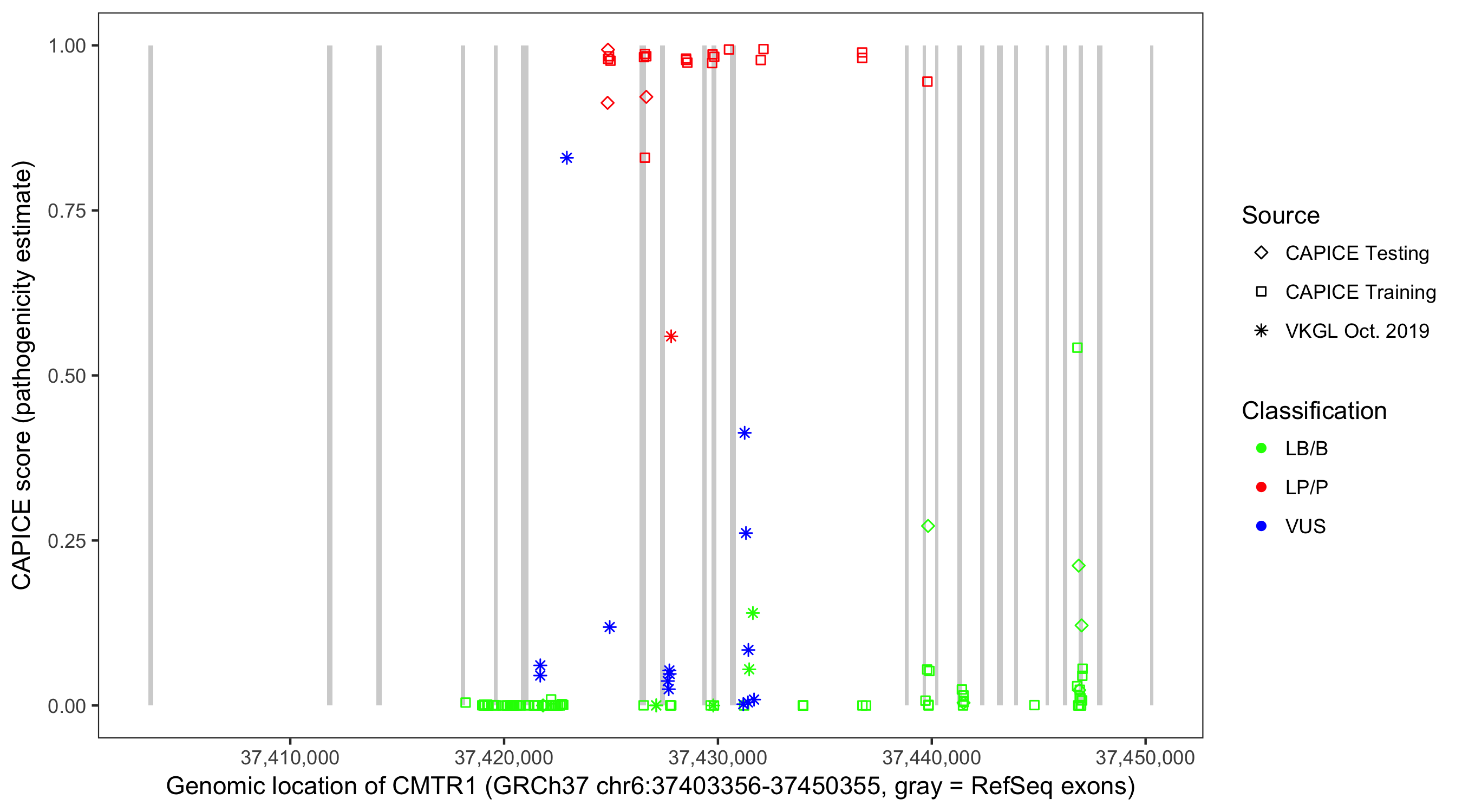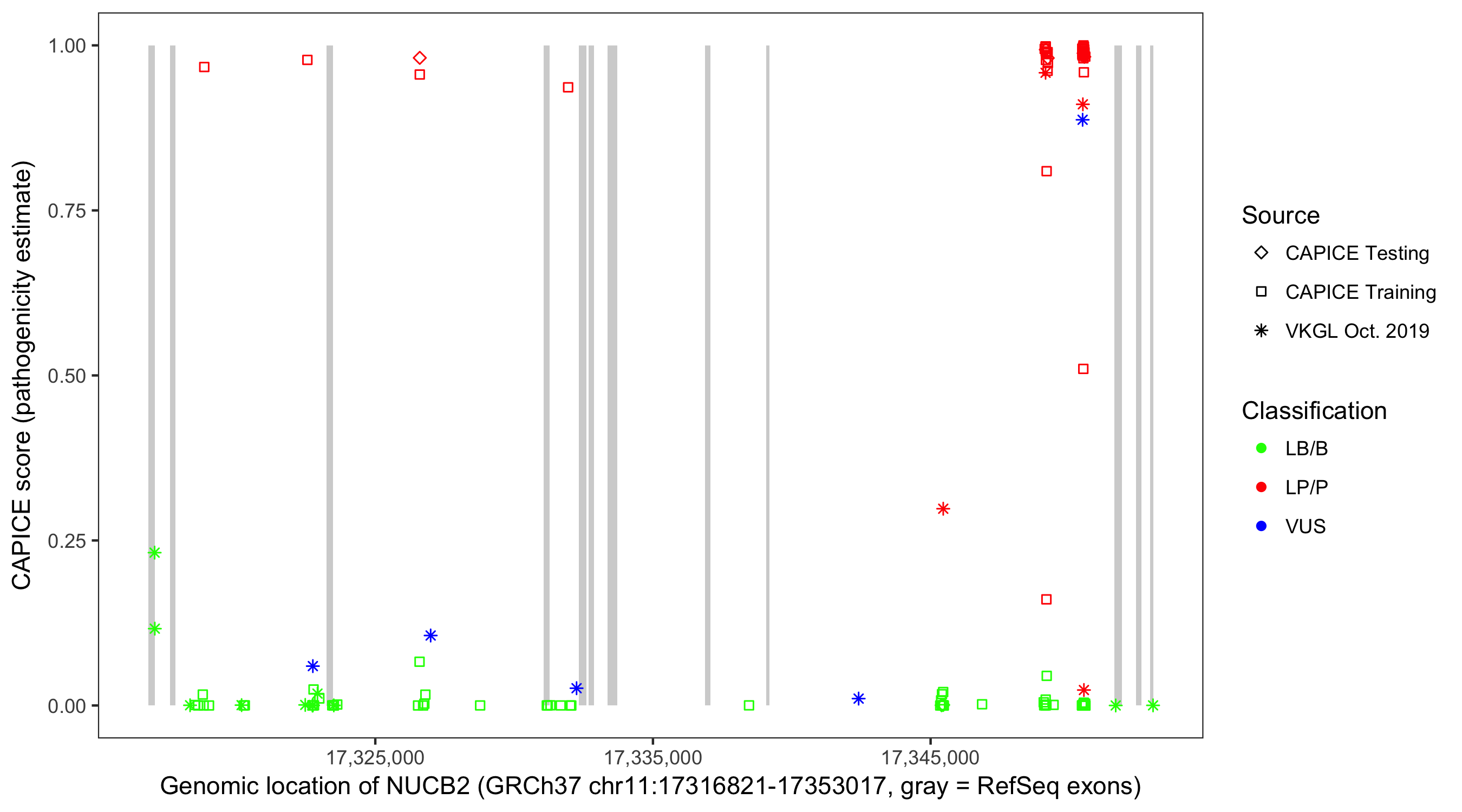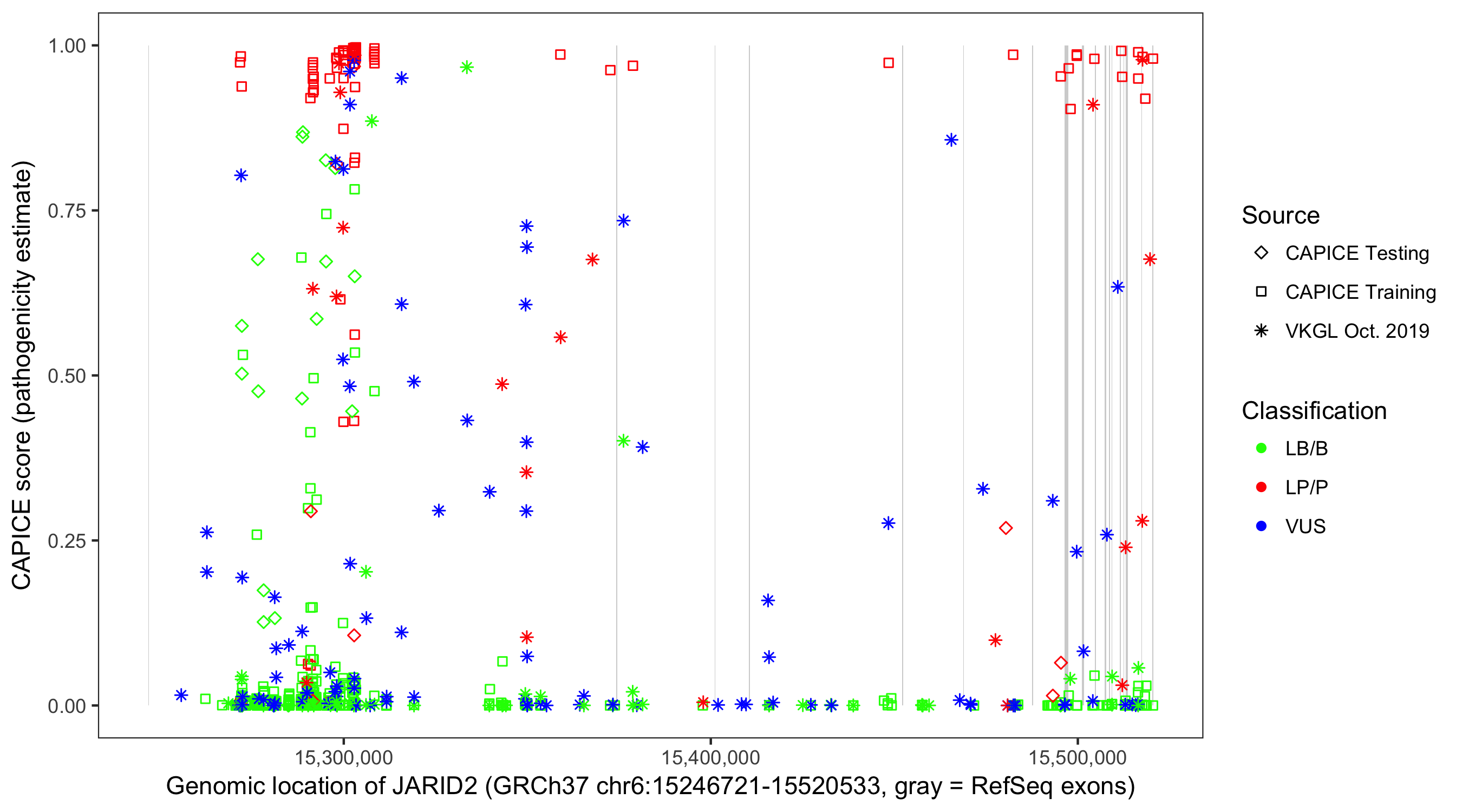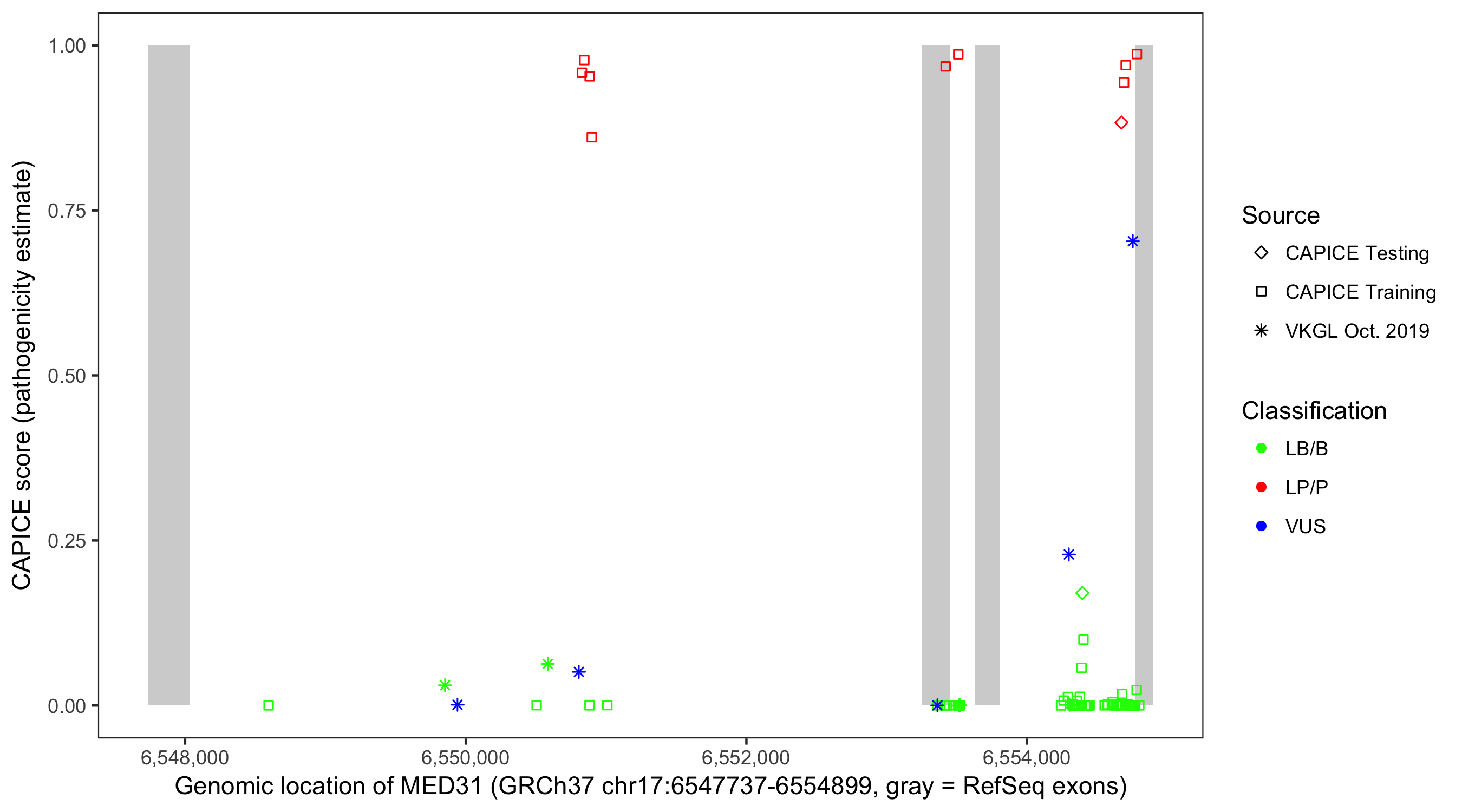 Shown are CAPICE train/test variants plus VKGL Oct 2019.