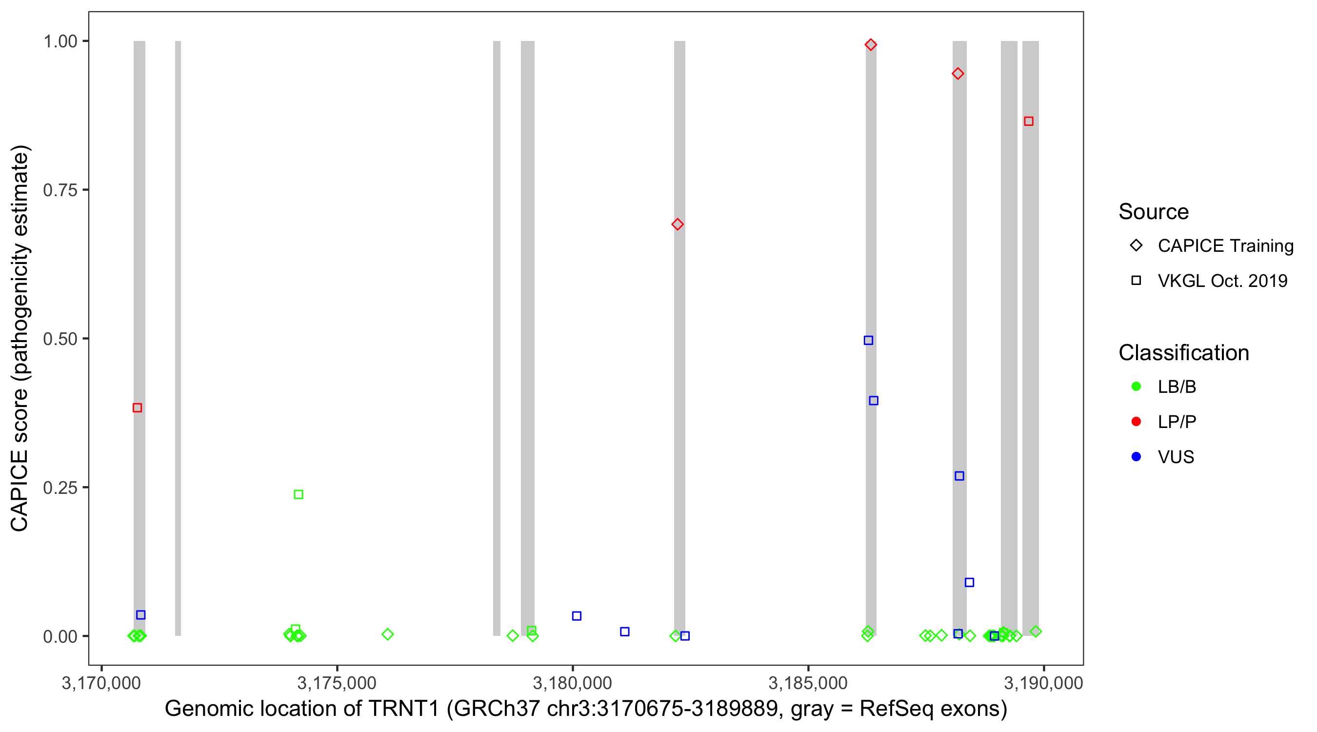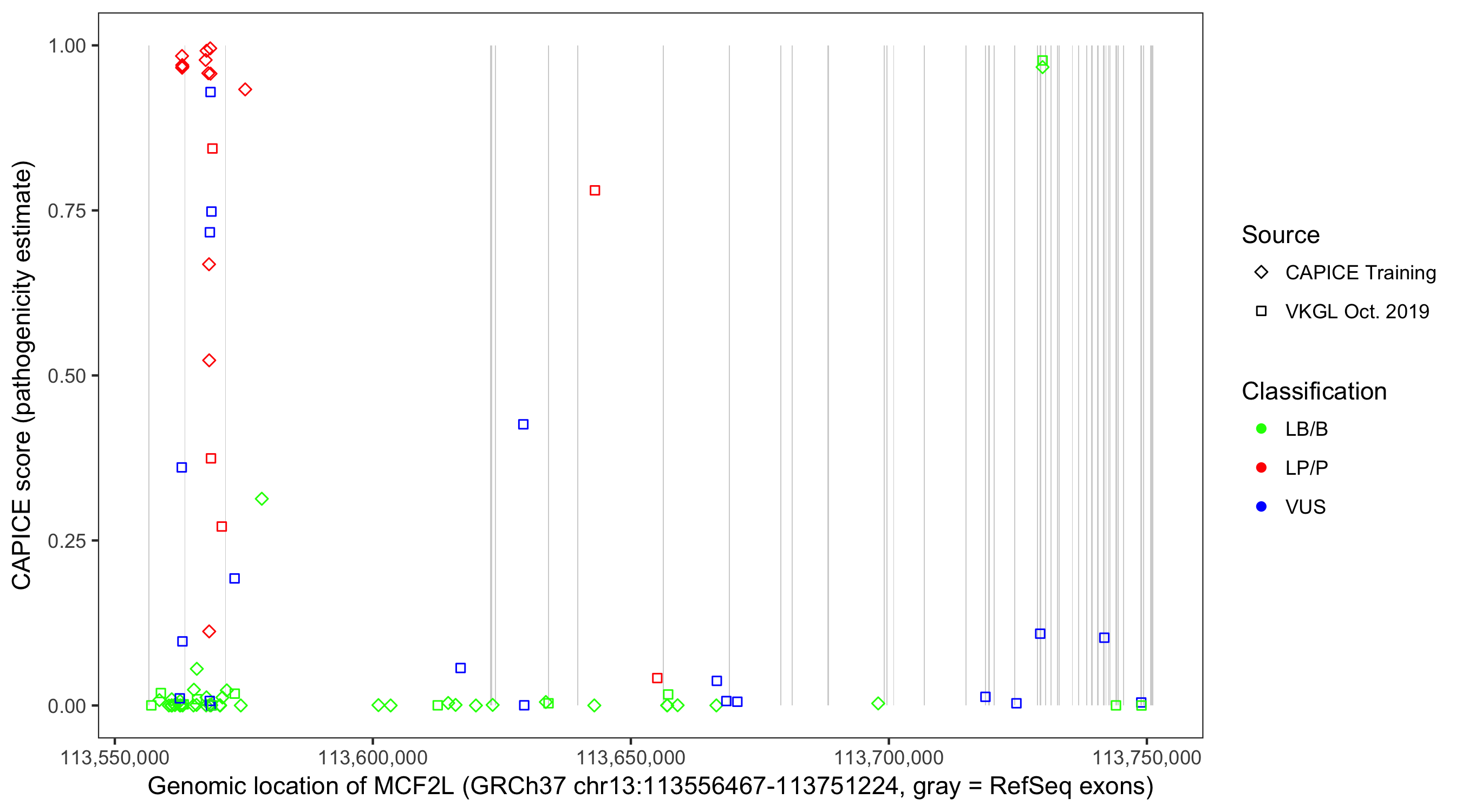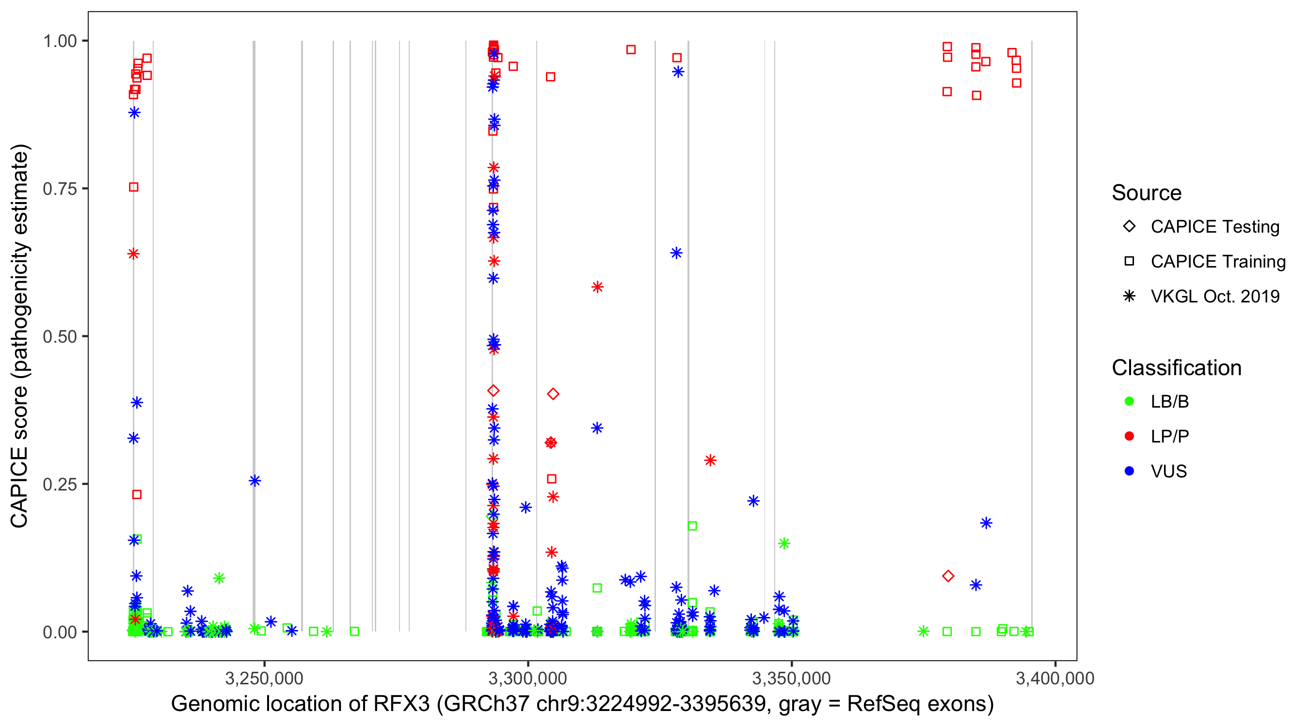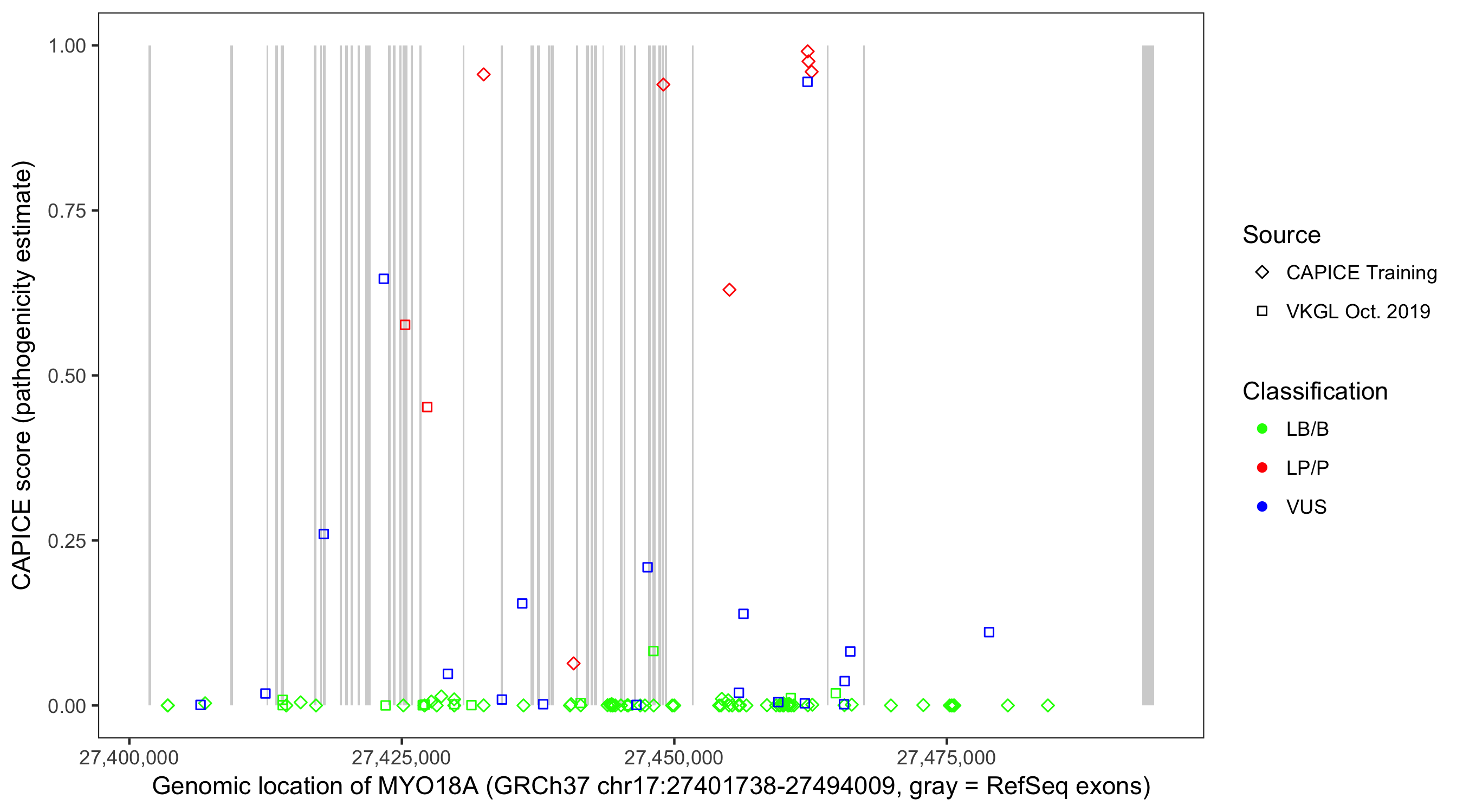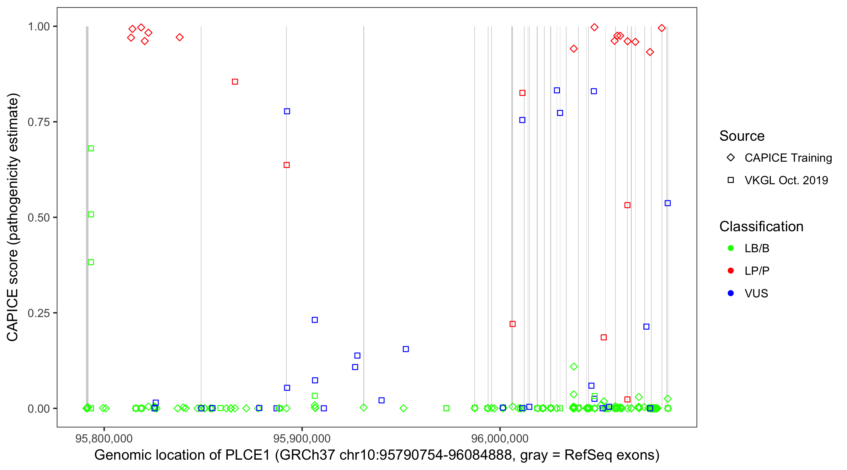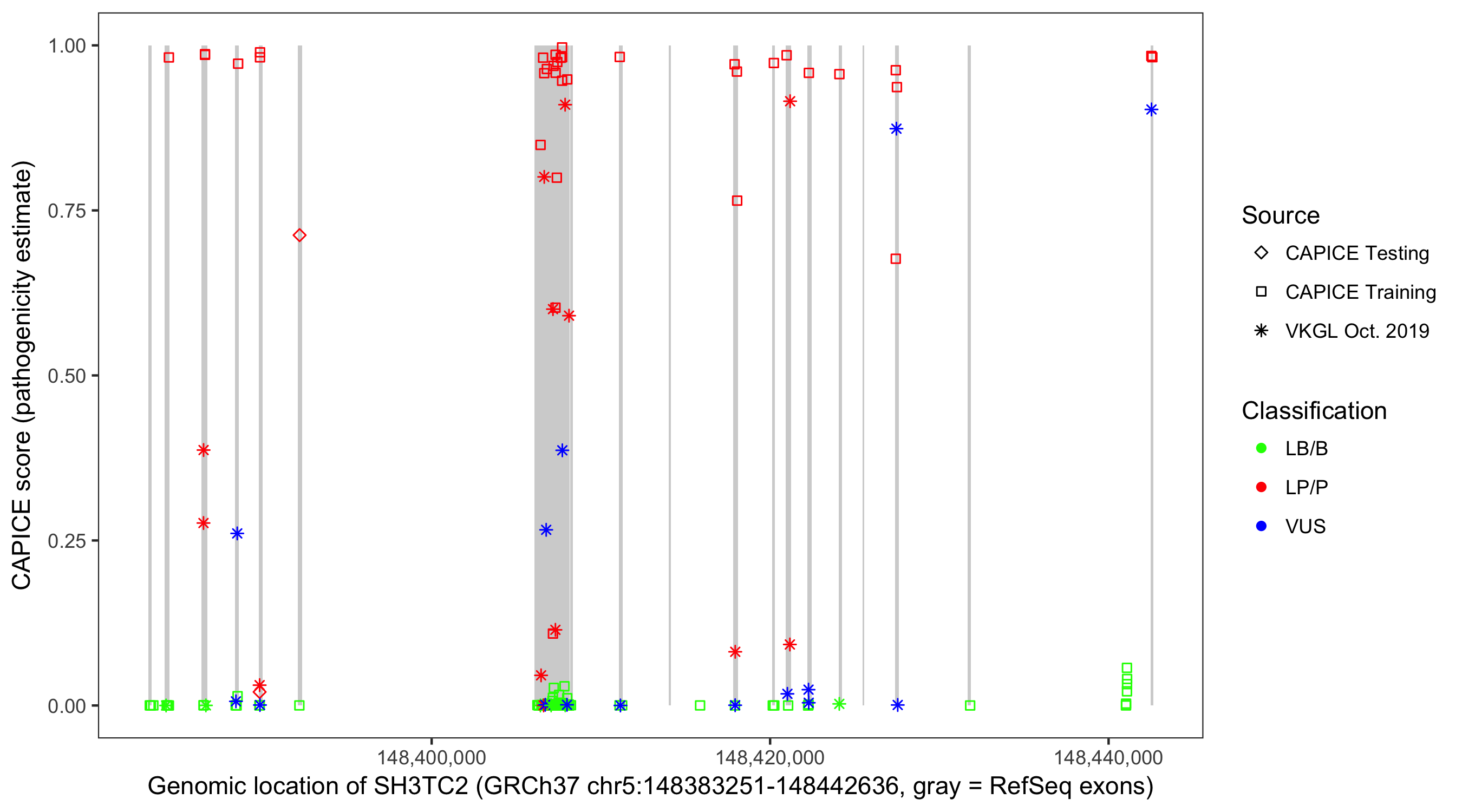 Shown are CAPICE train/test variants plus VKGL Oct 2019.