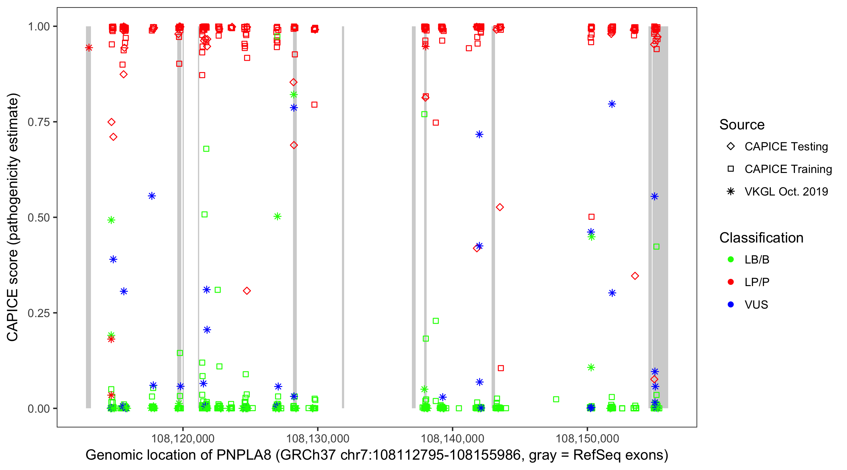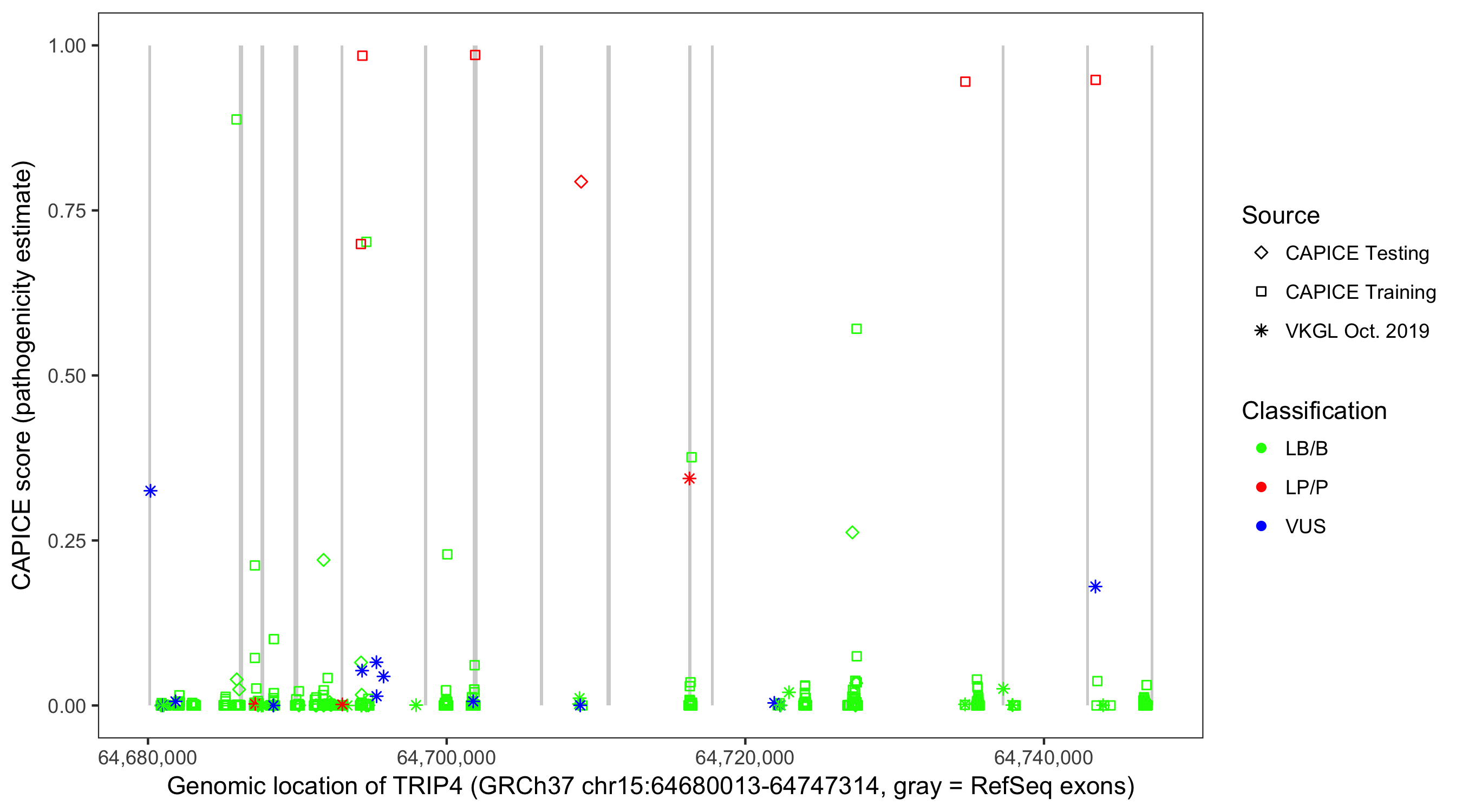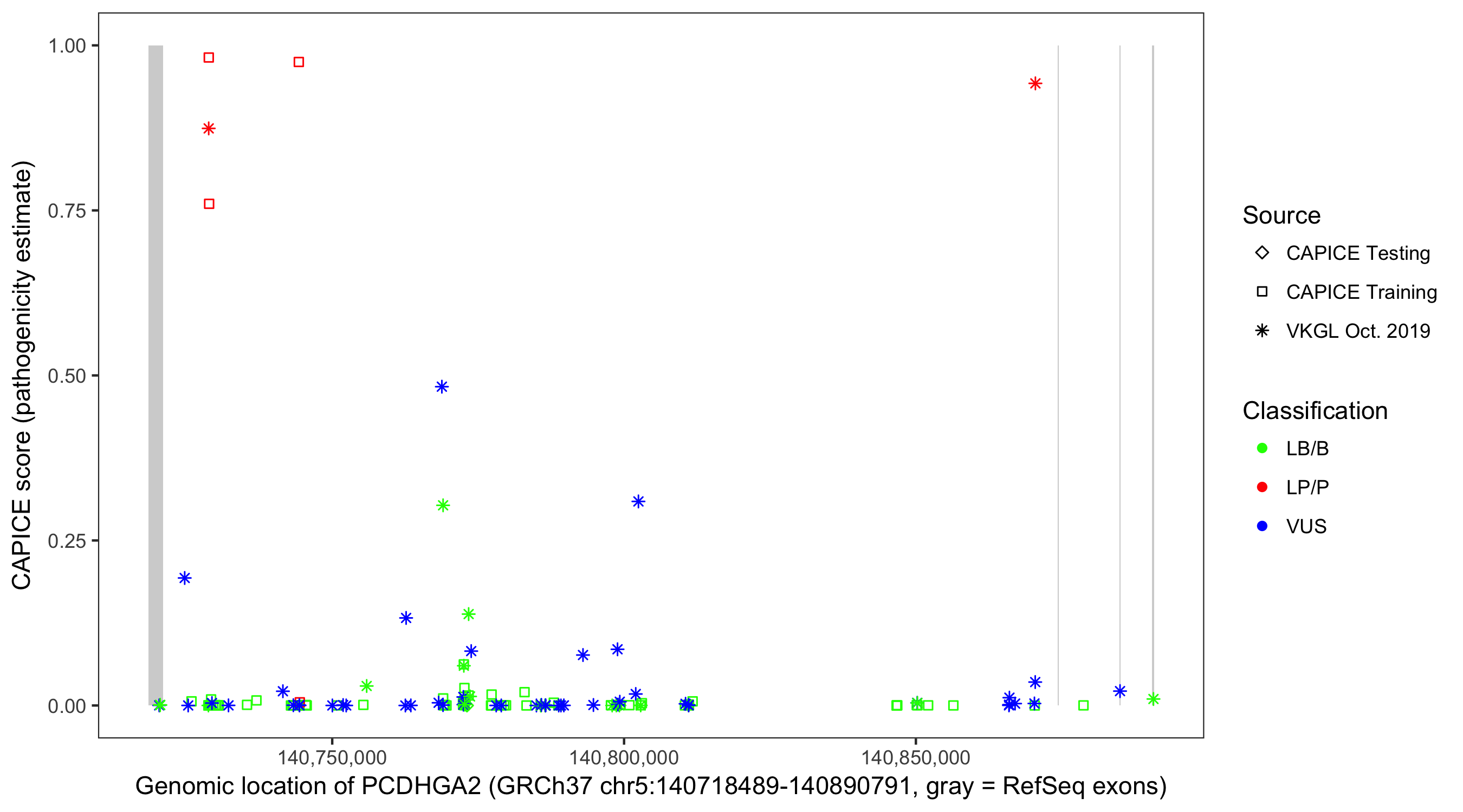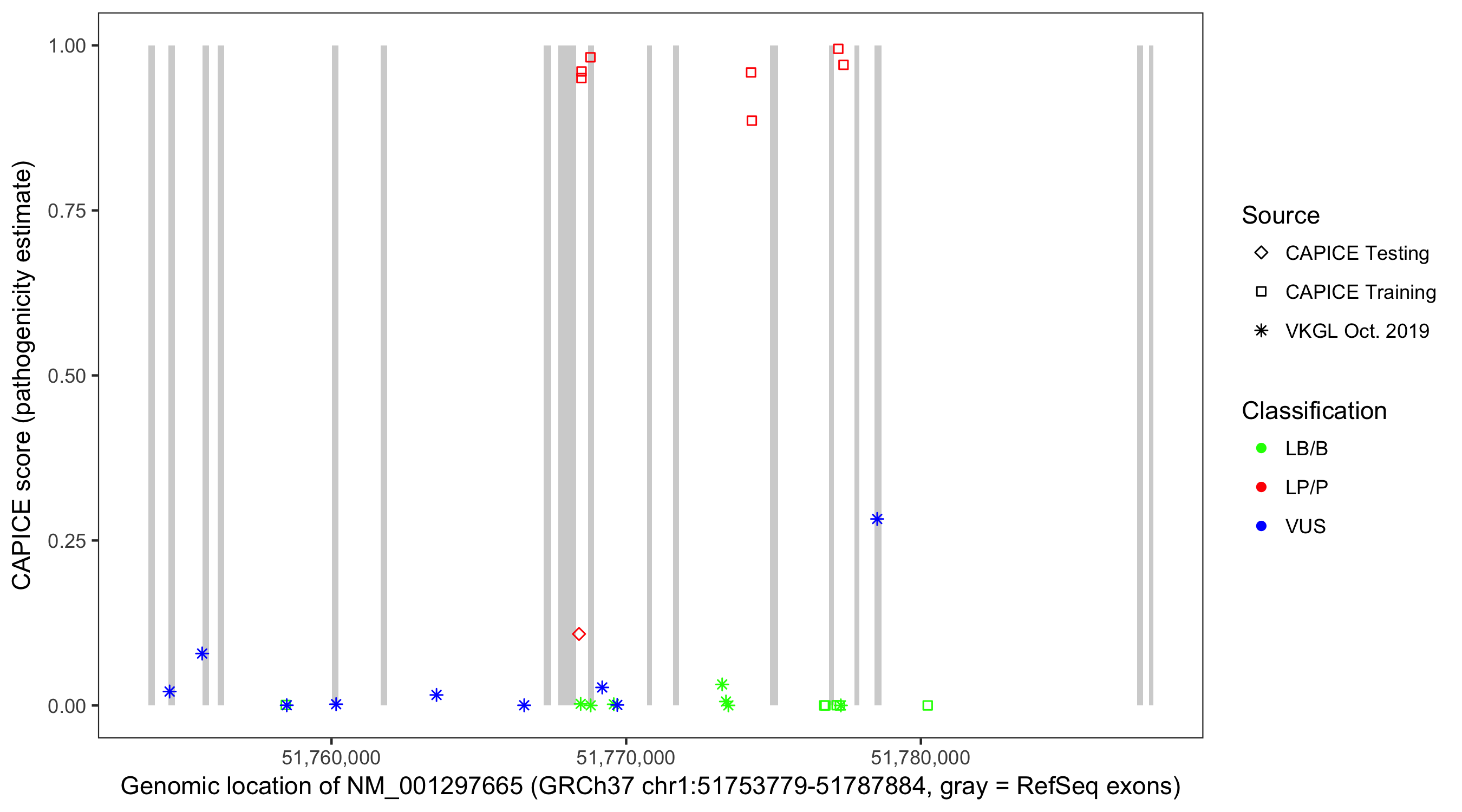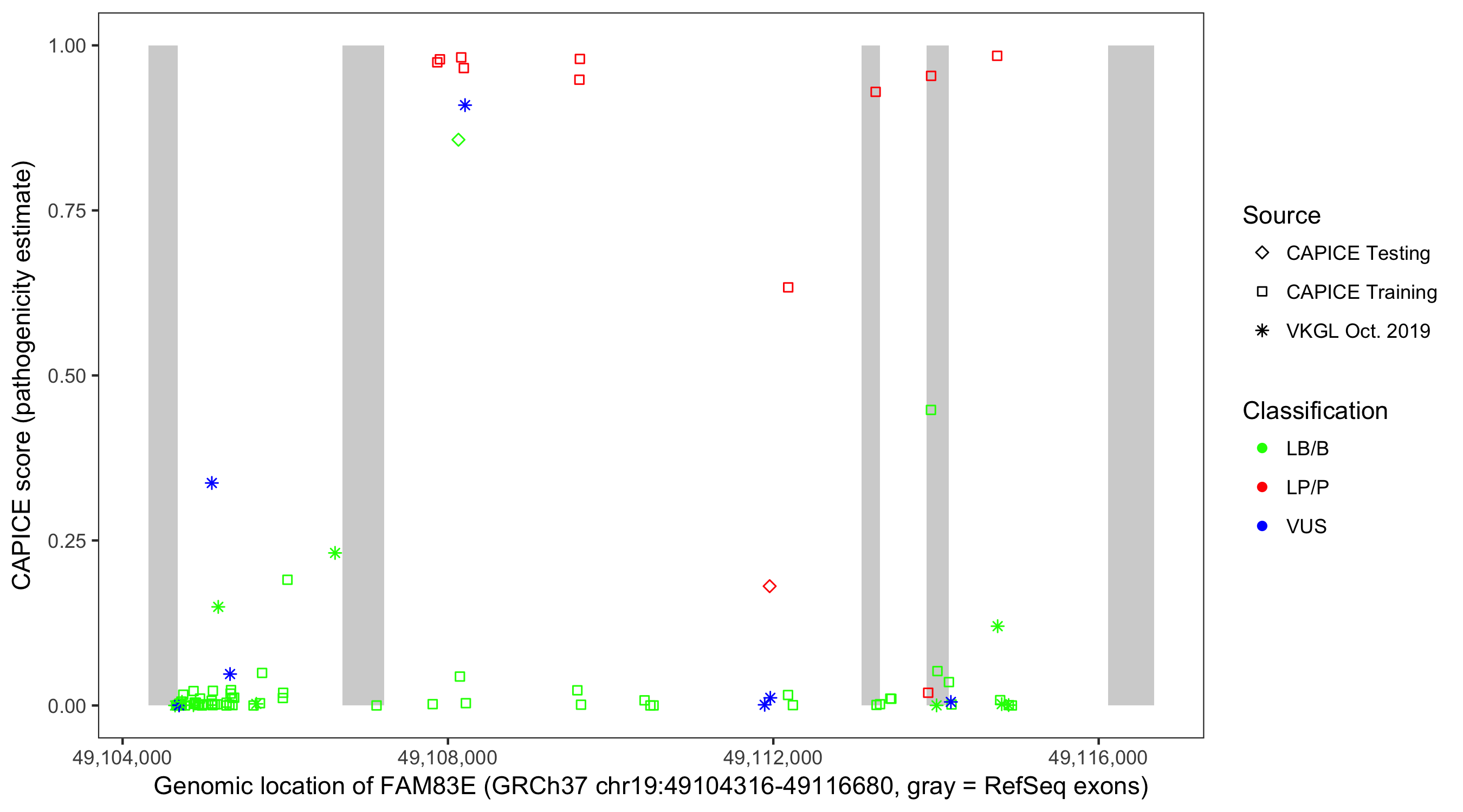 Shown are CAPICE train/test variants plus VKGL Oct 2019.