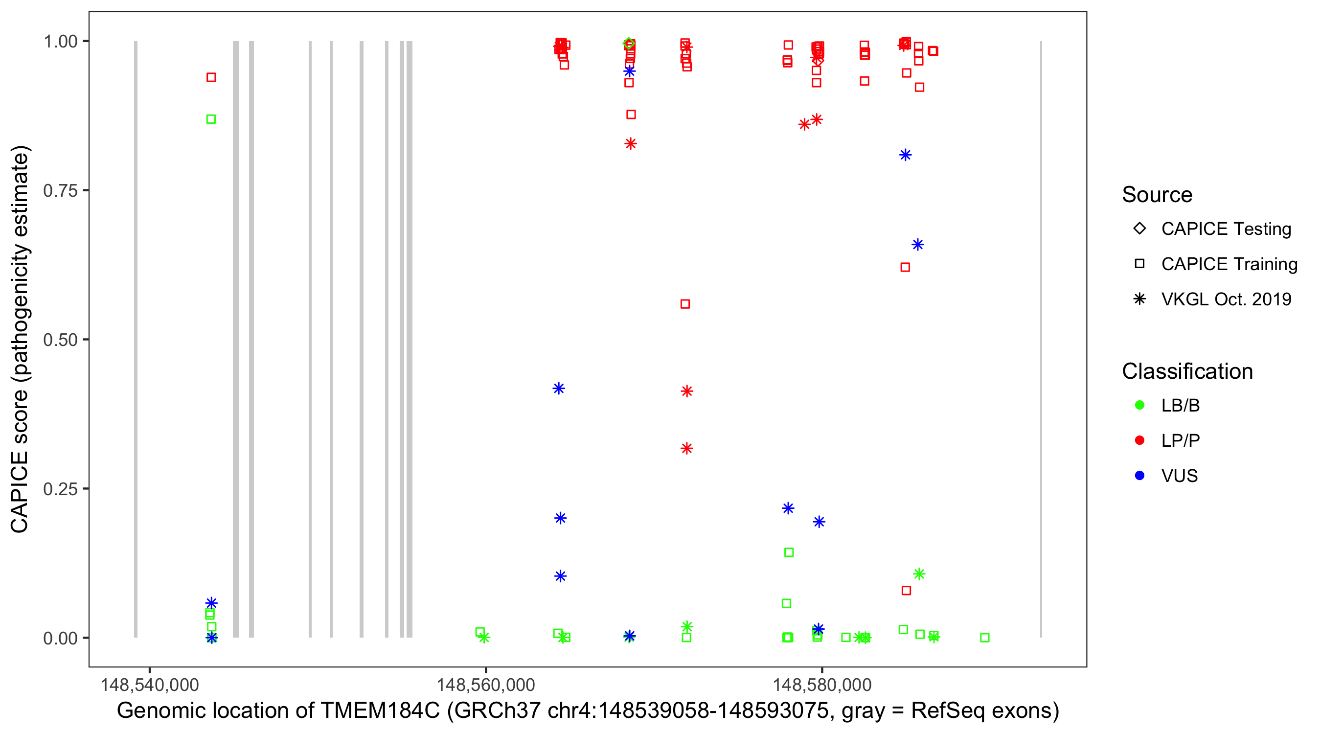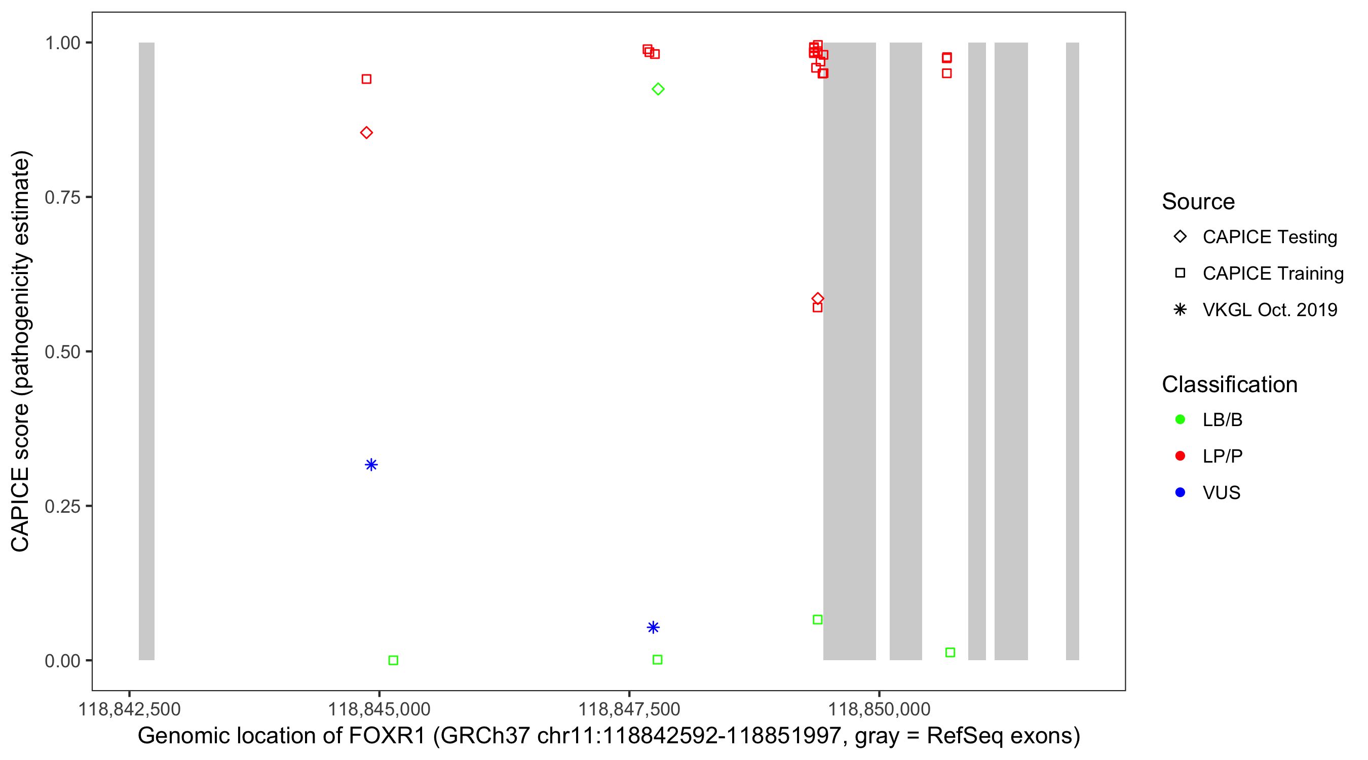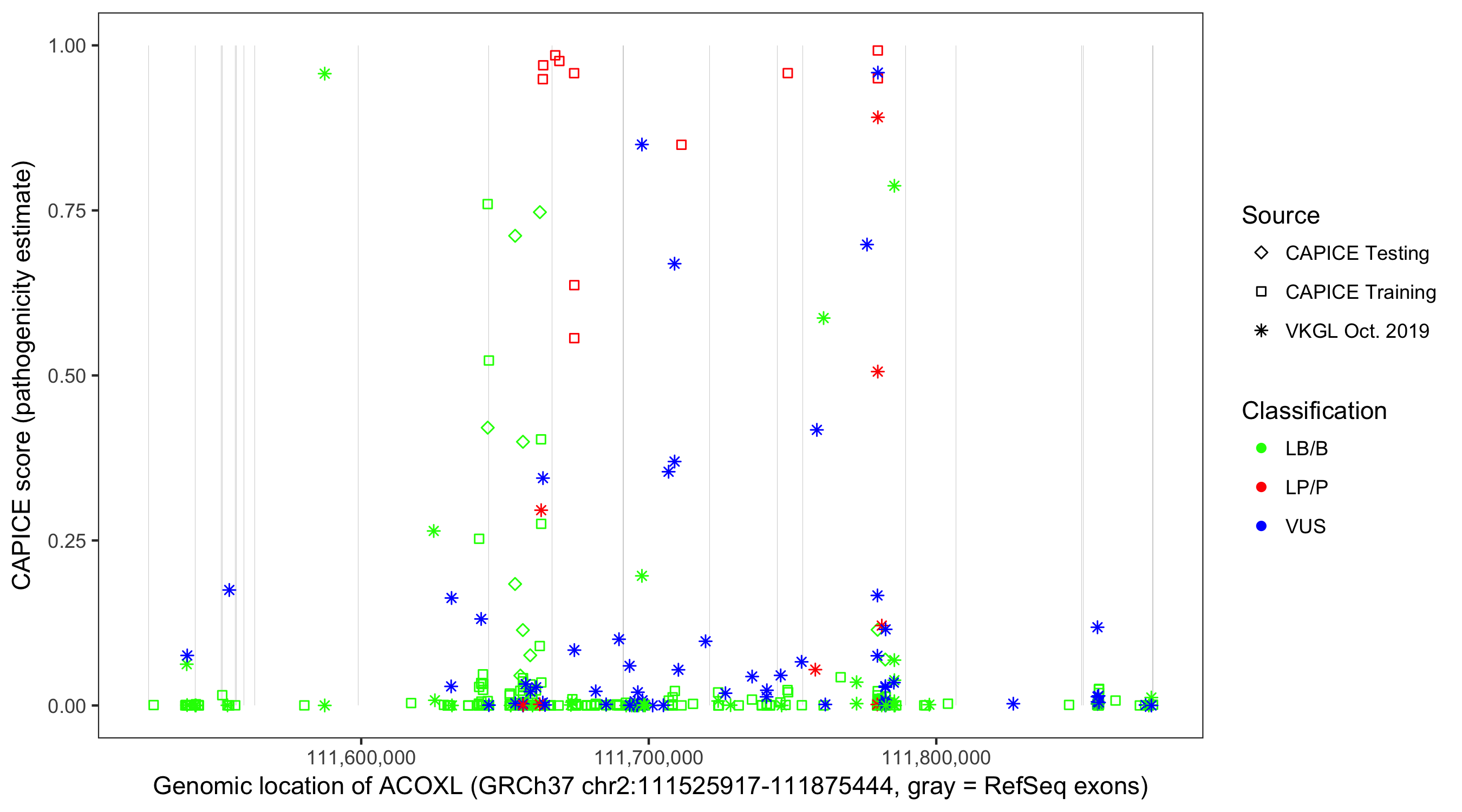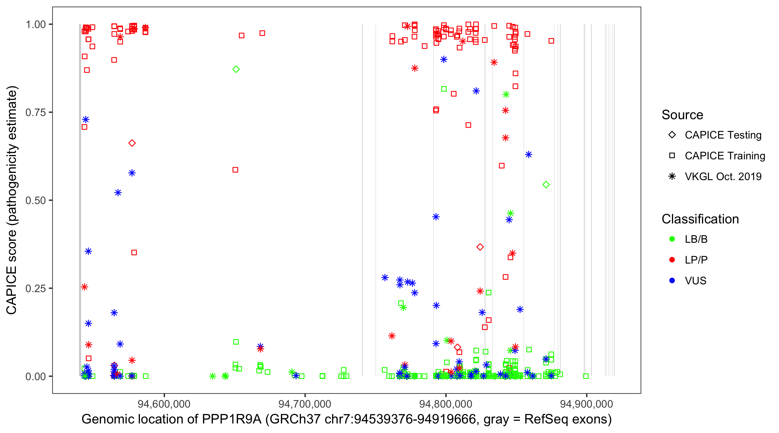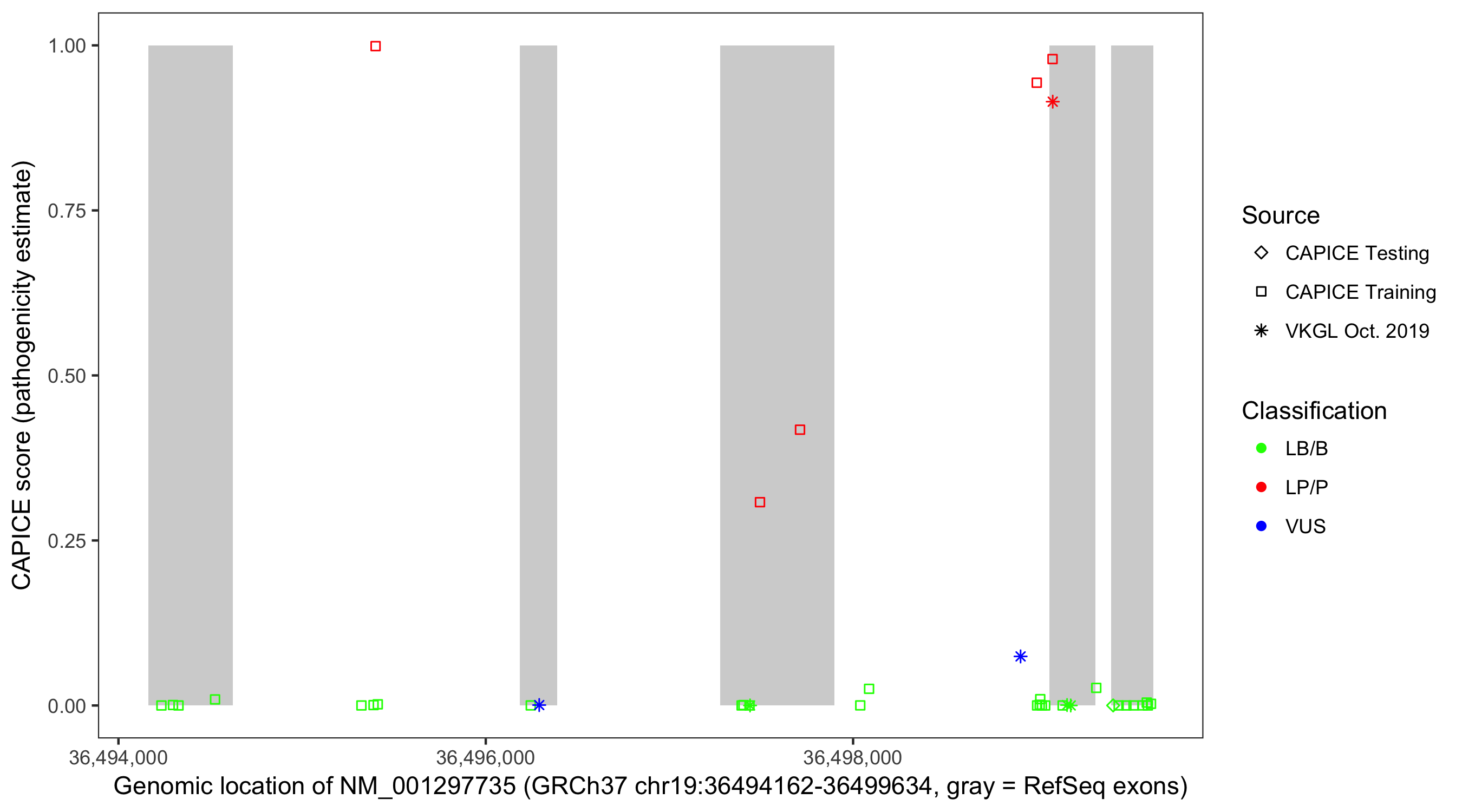 Shown are CAPICE train/test variants plus VKGL Oct 2019.