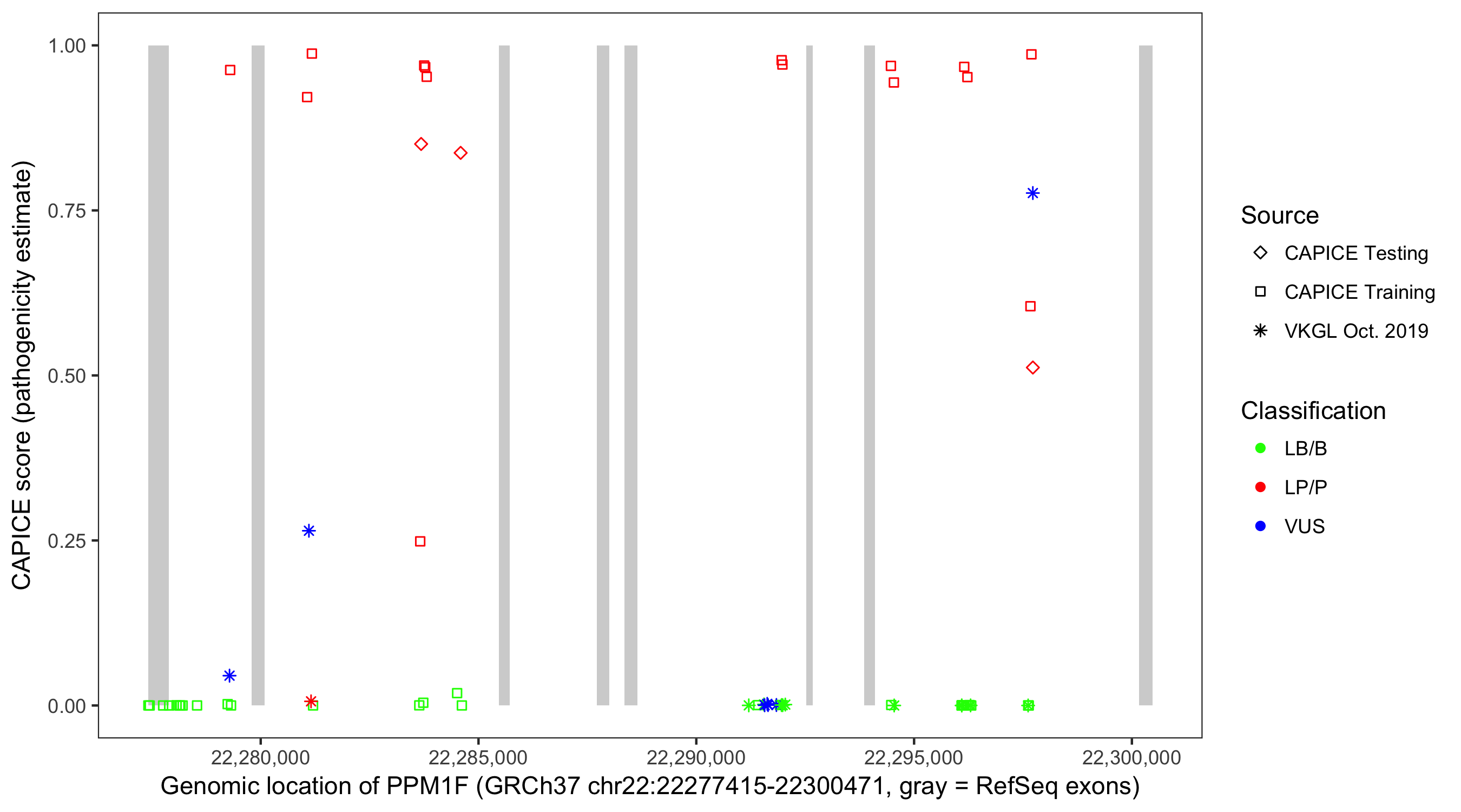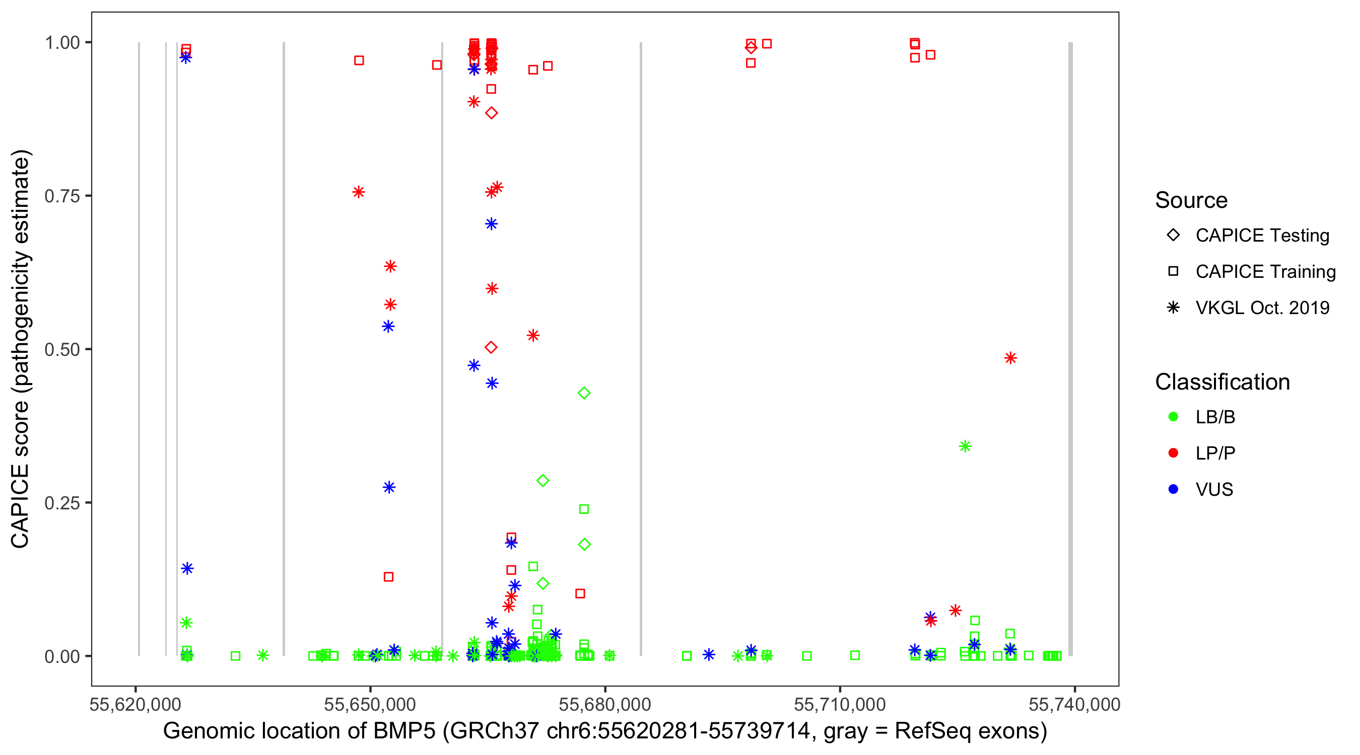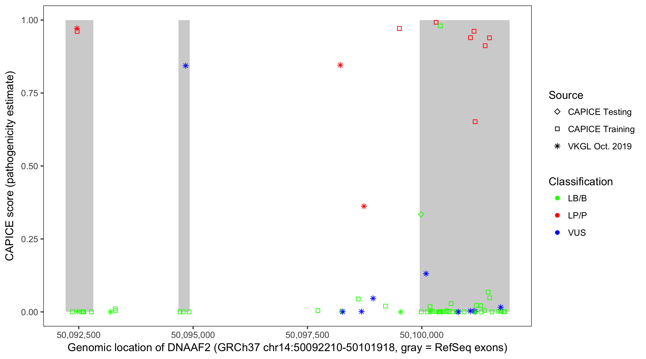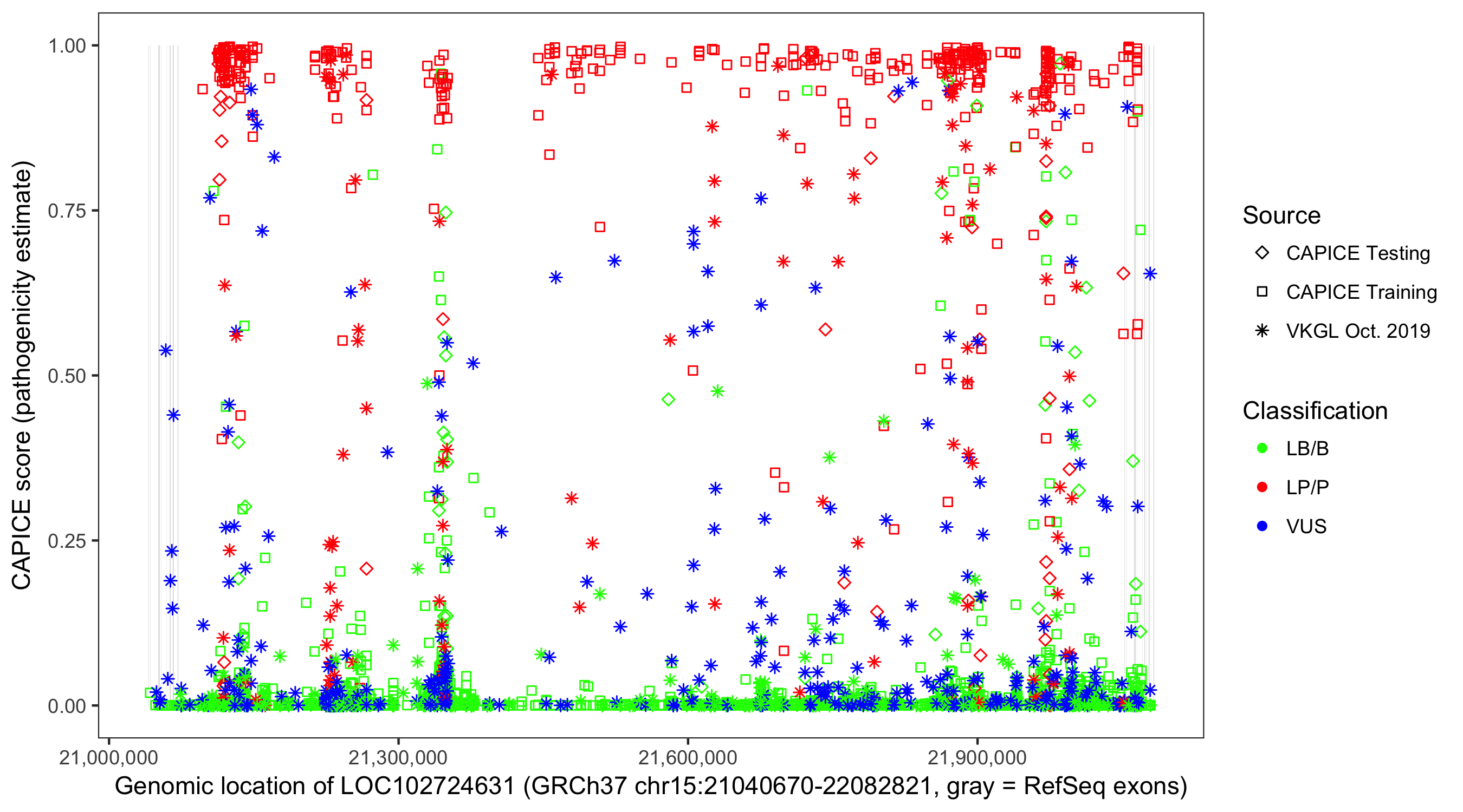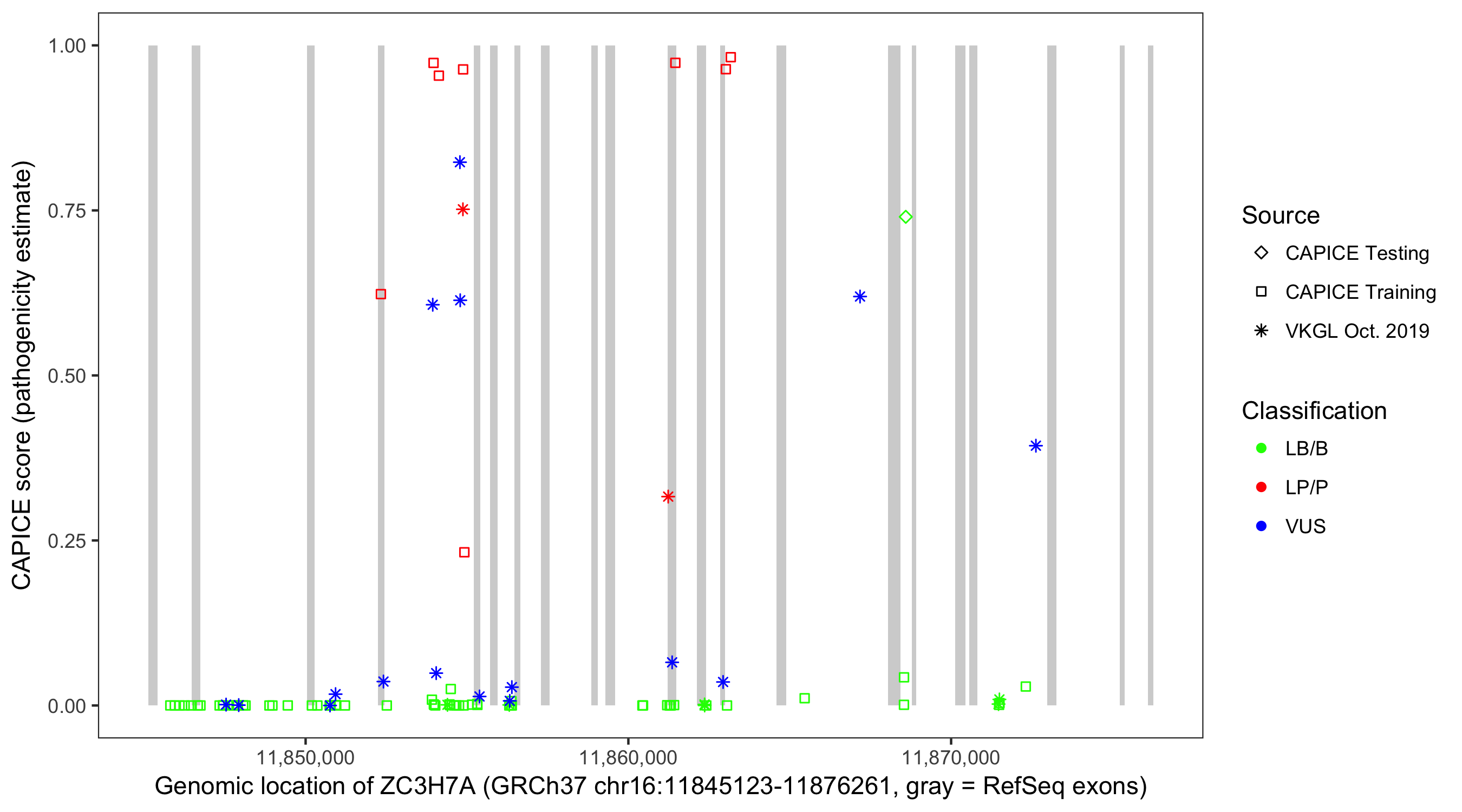 Shown are CAPICE train/test variants plus VKGL Oct 2019.