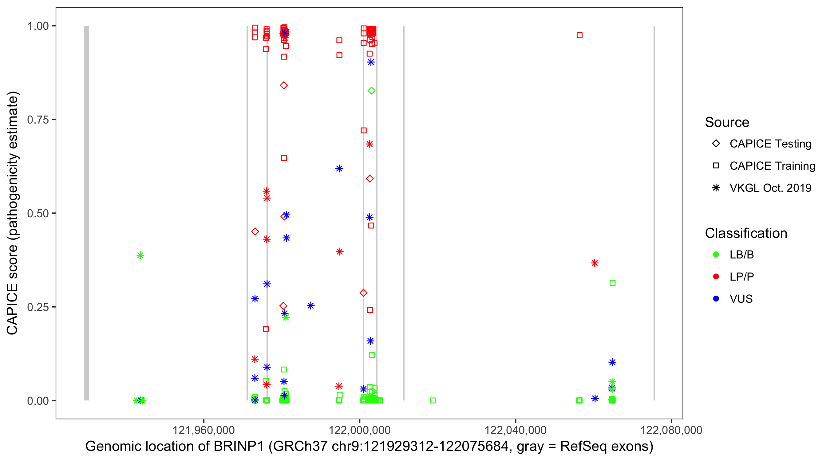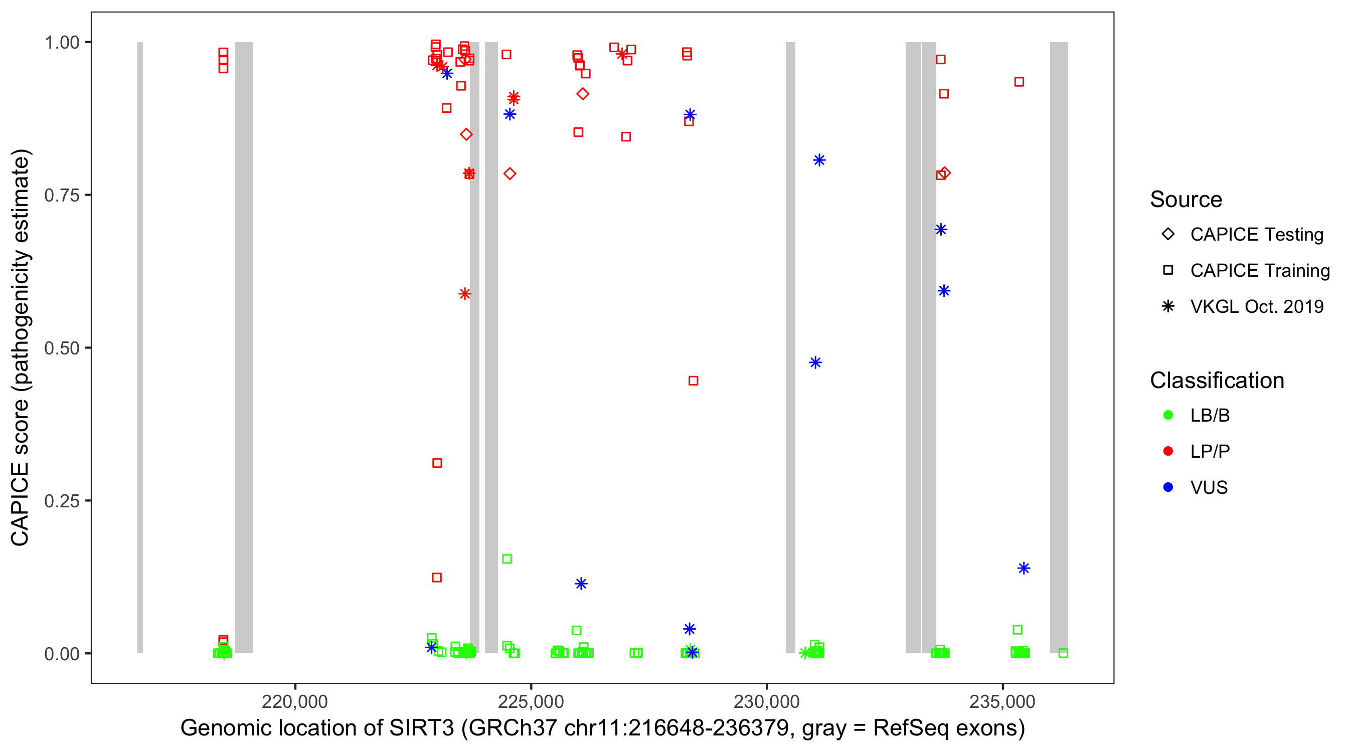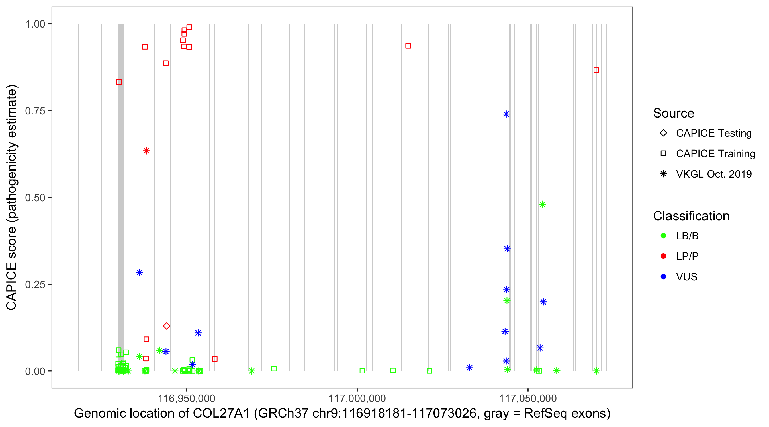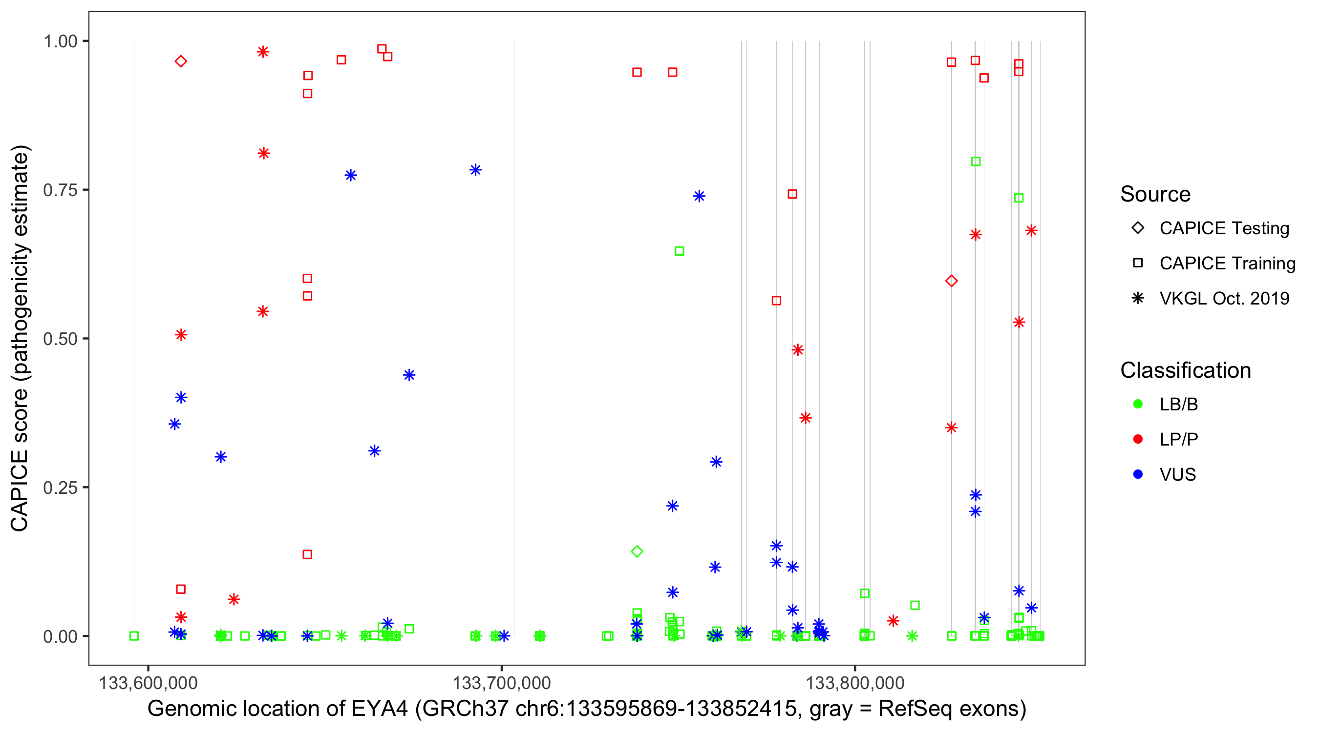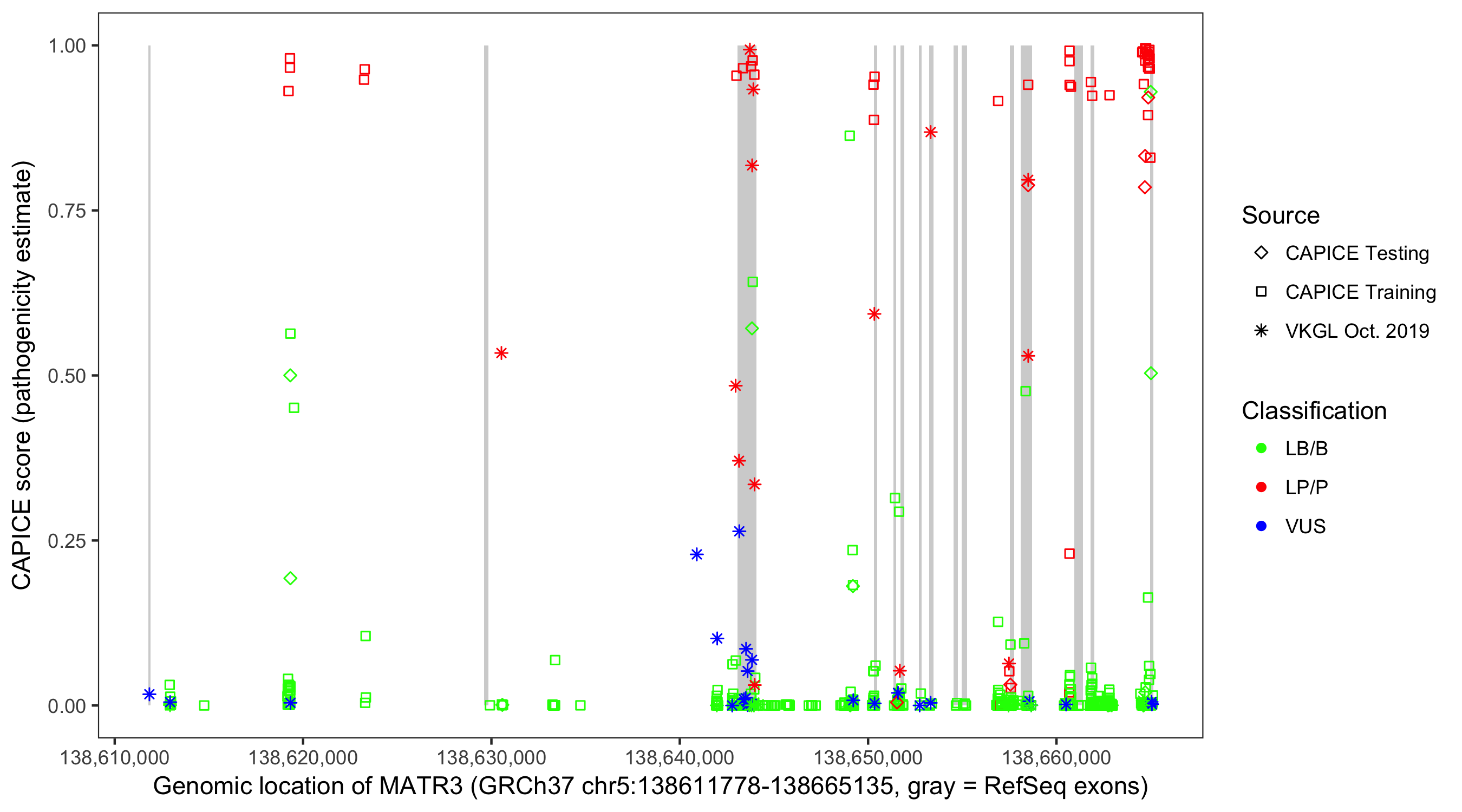 Shown are CAPICE train/test variants plus VKGL Oct 2019.
