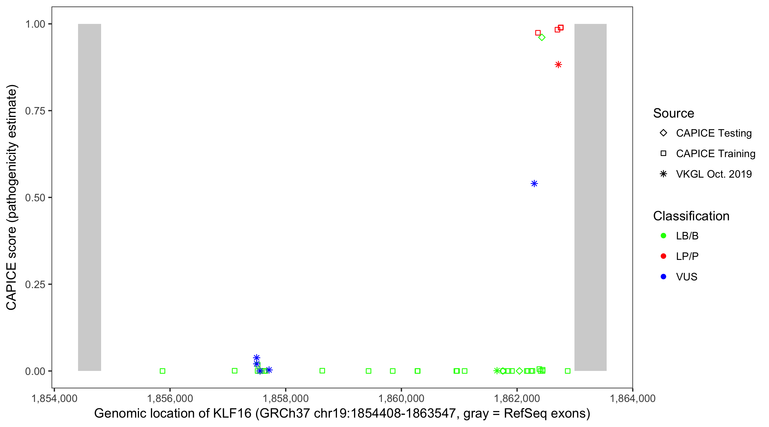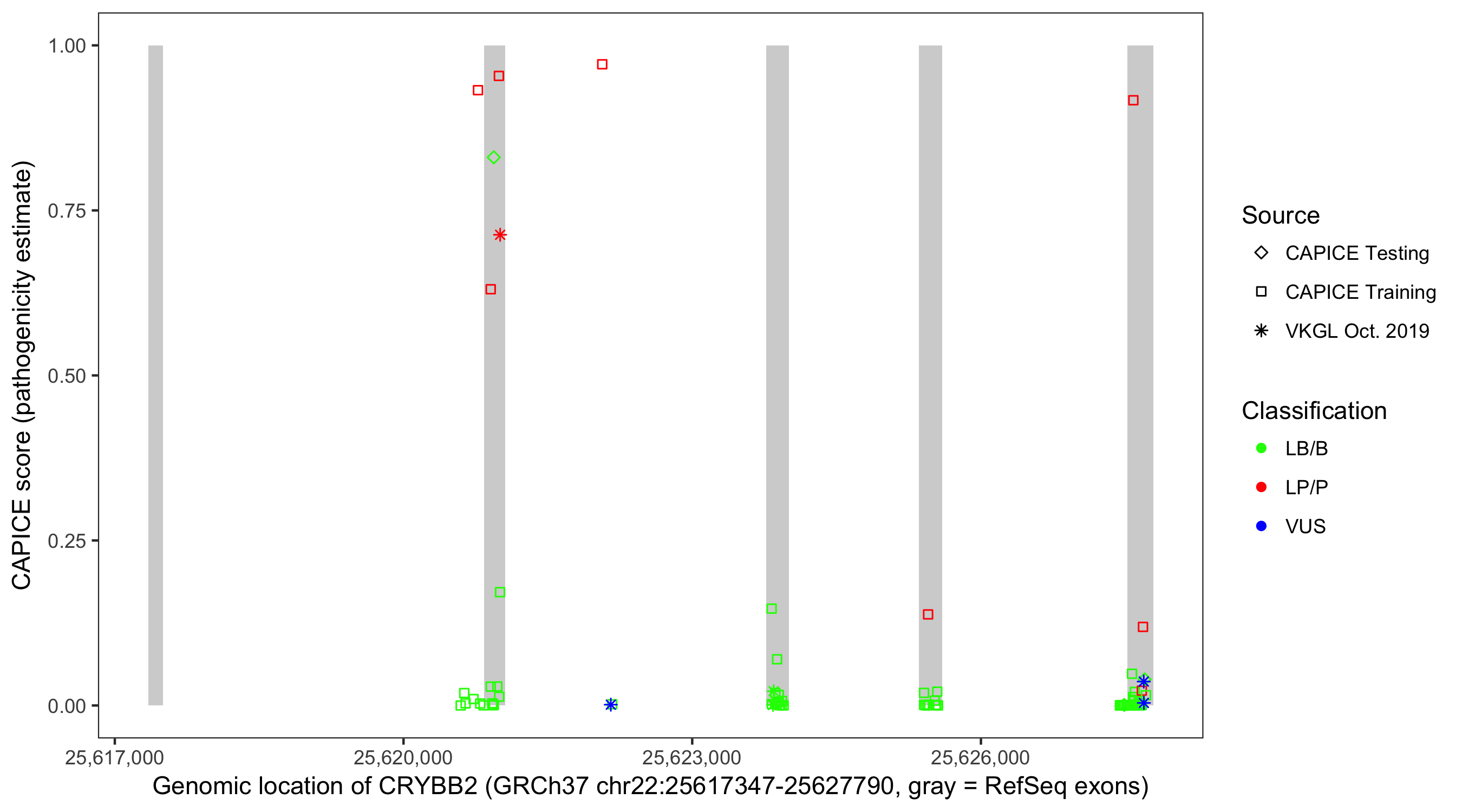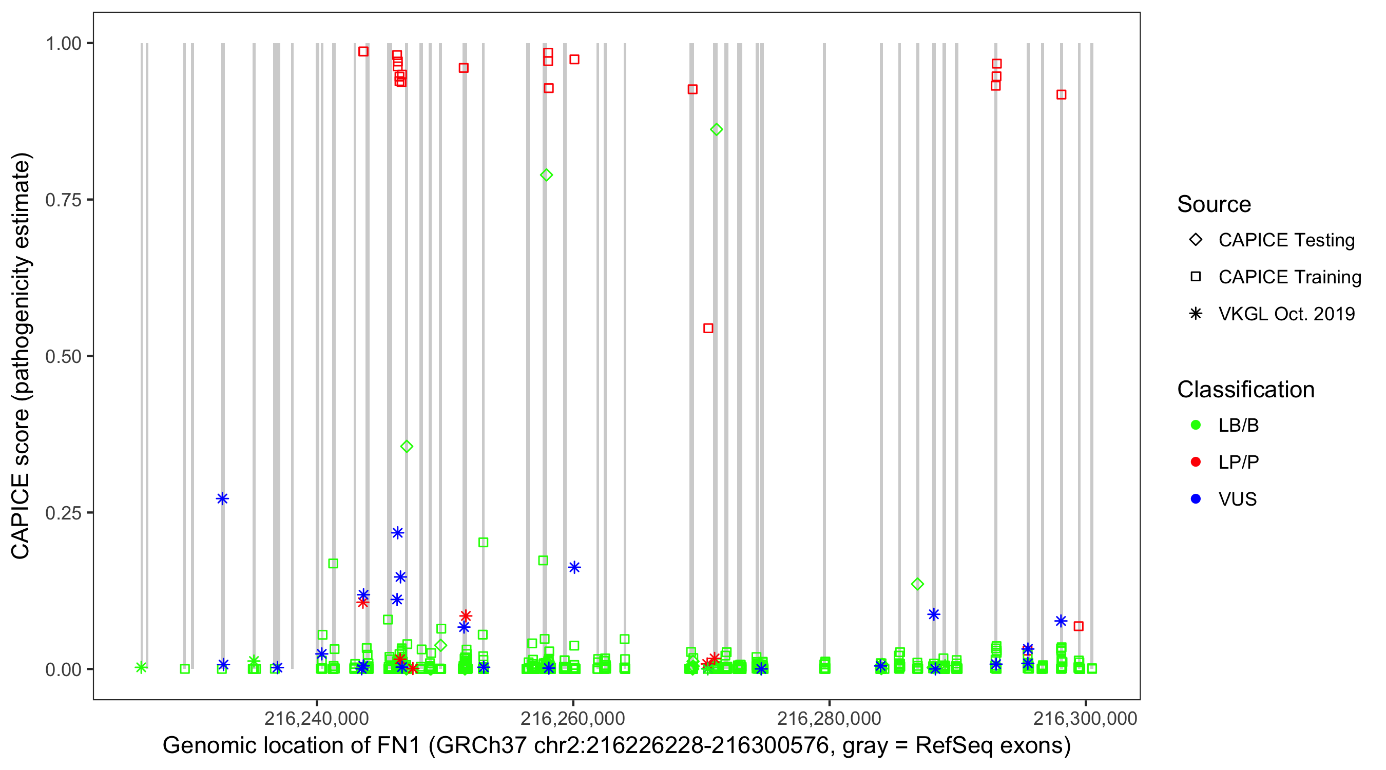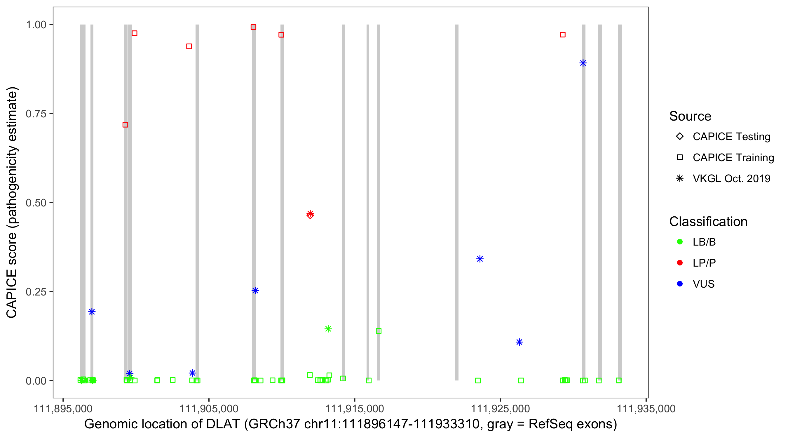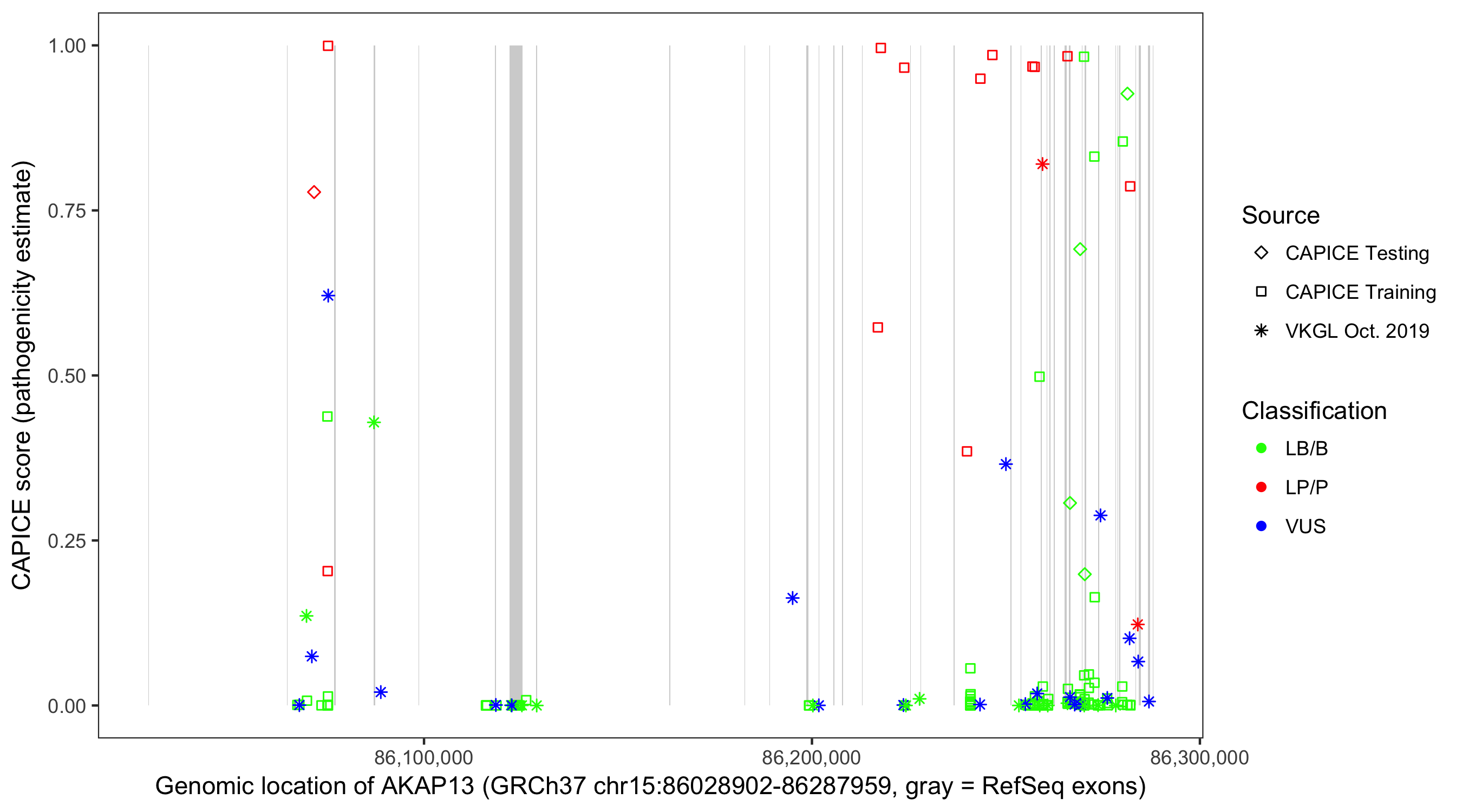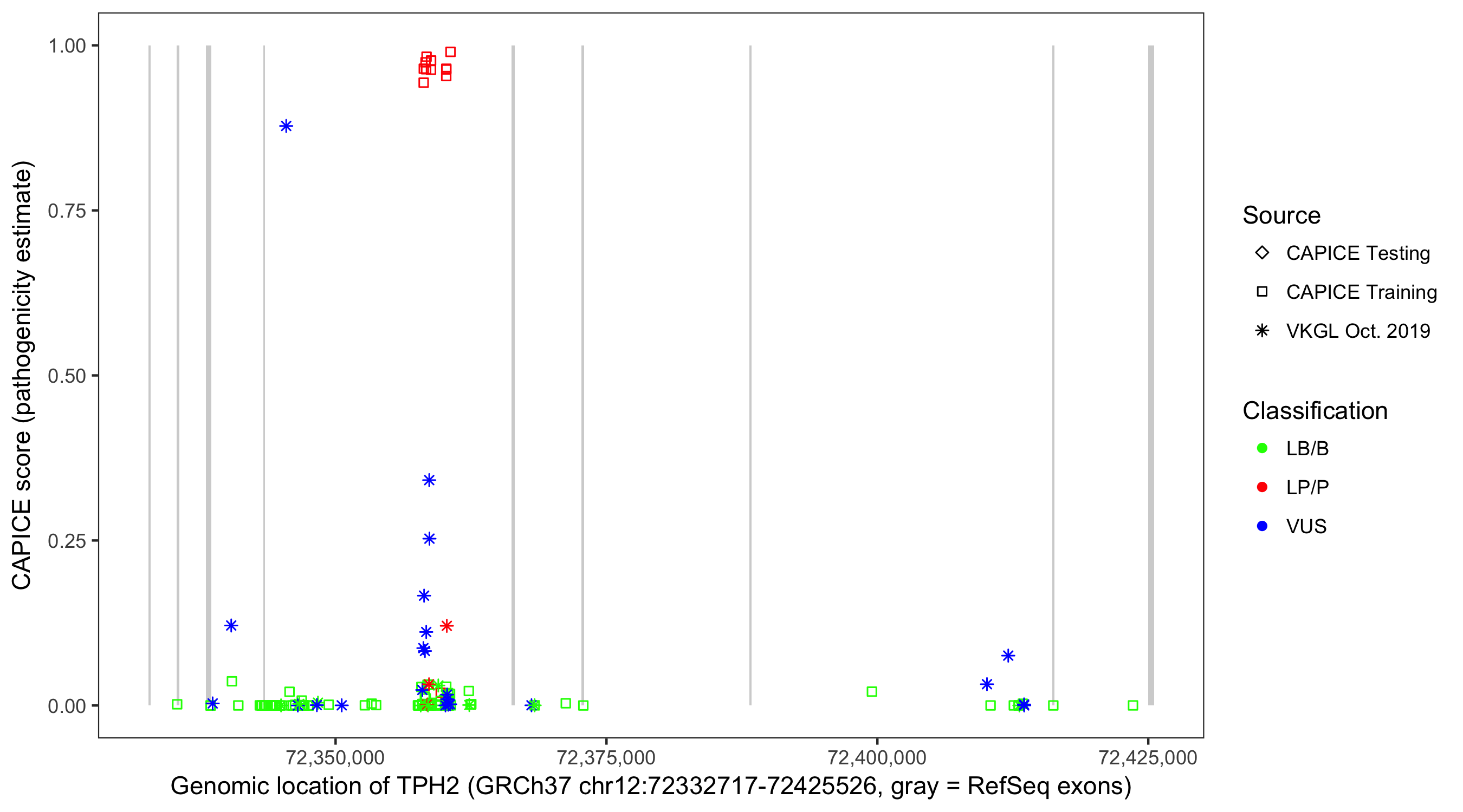 Shown are CAPICE train/test variants plus VKGL Oct 2019.