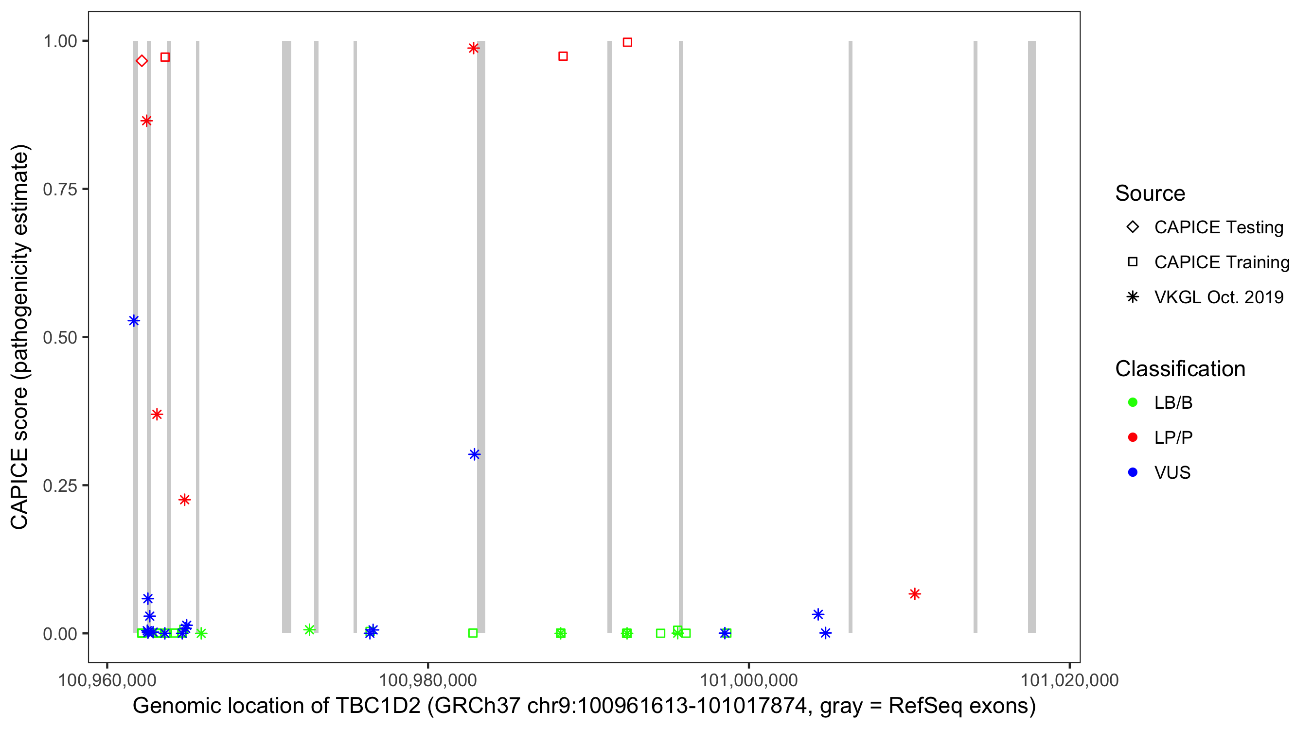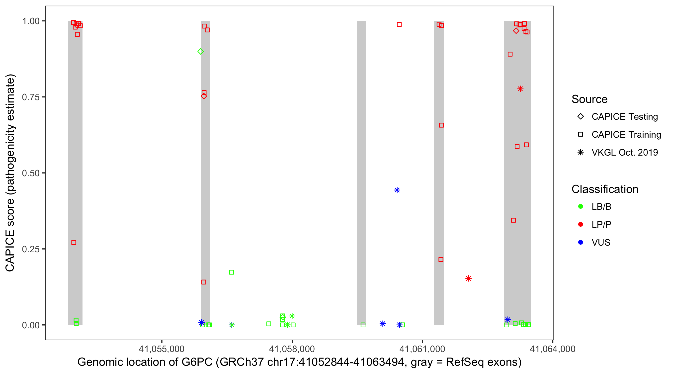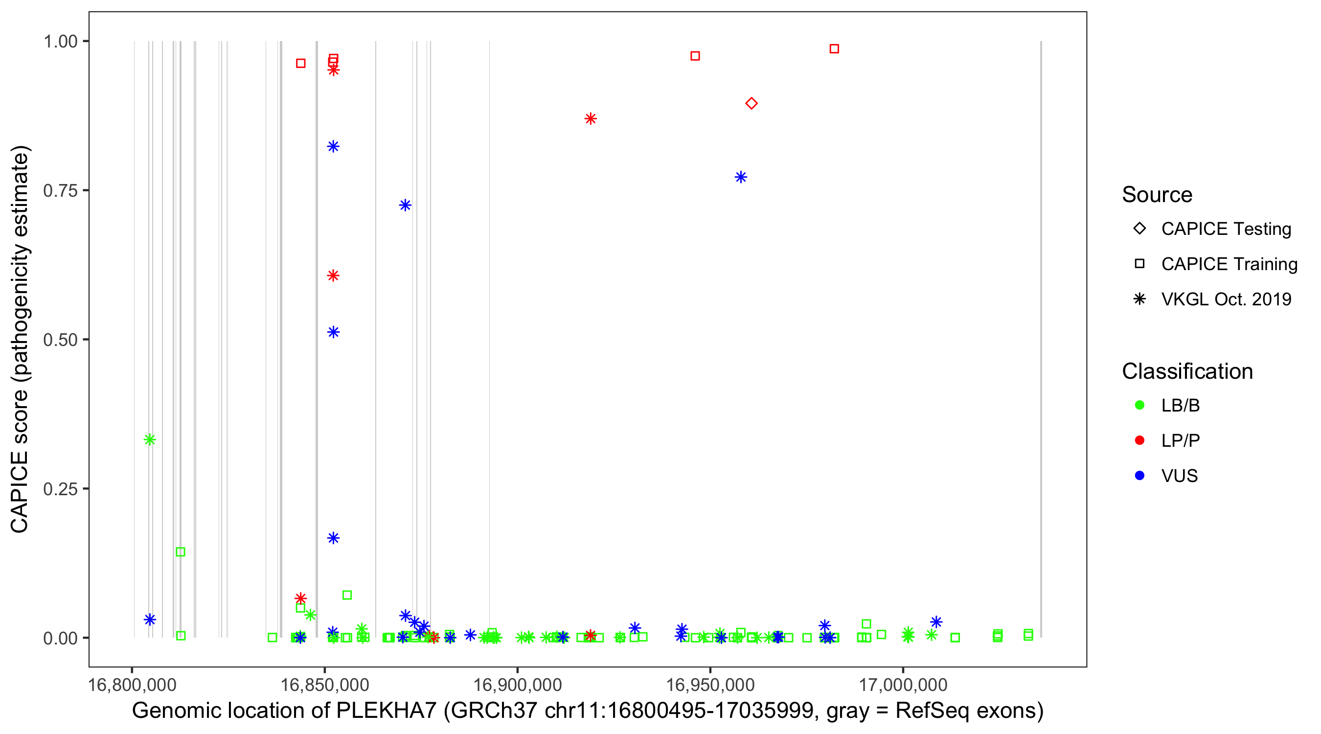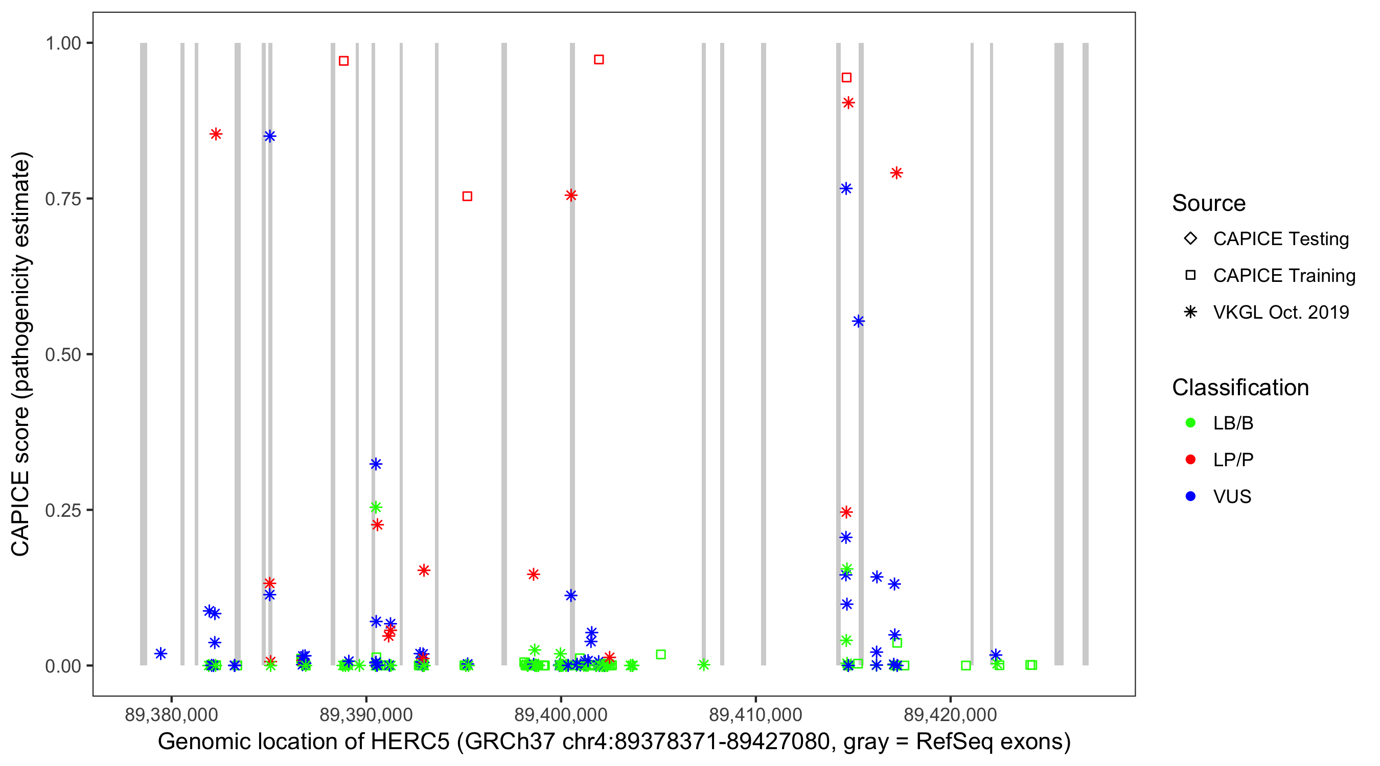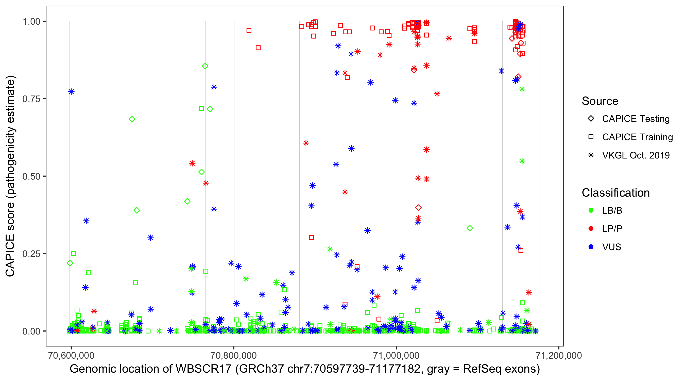 Shown are CAPICE train/test variants plus VKGL Oct 2019.