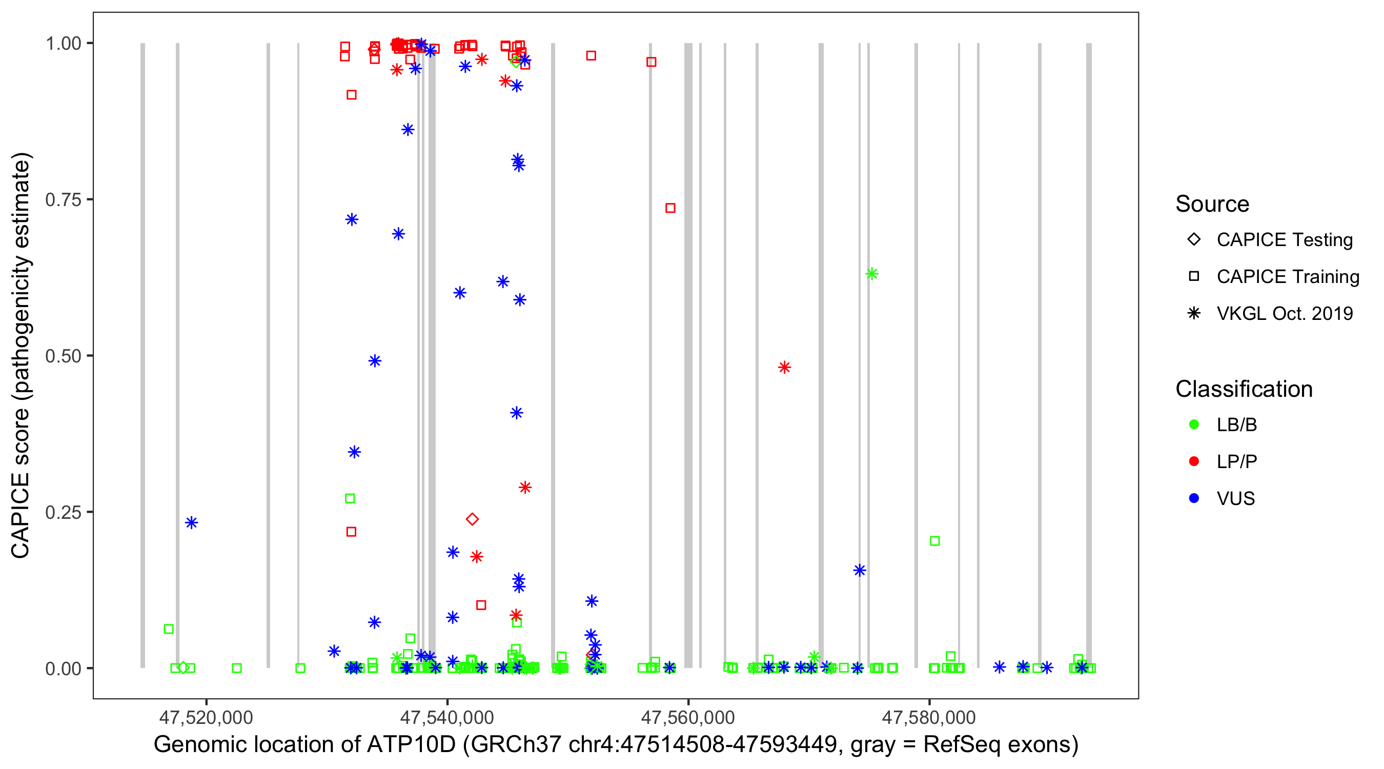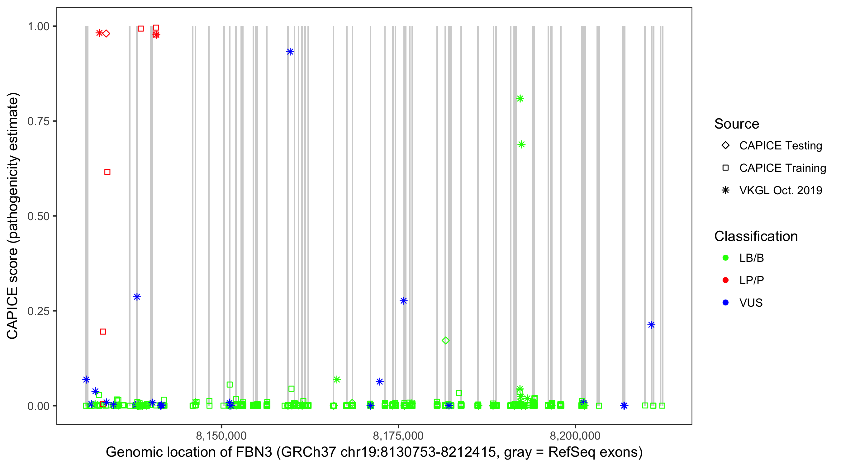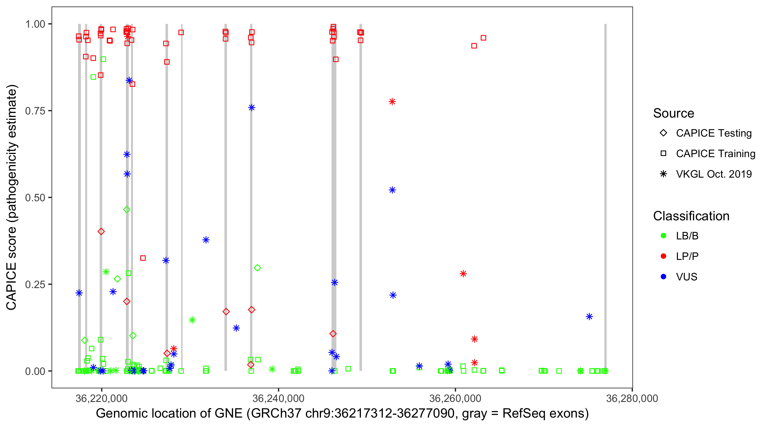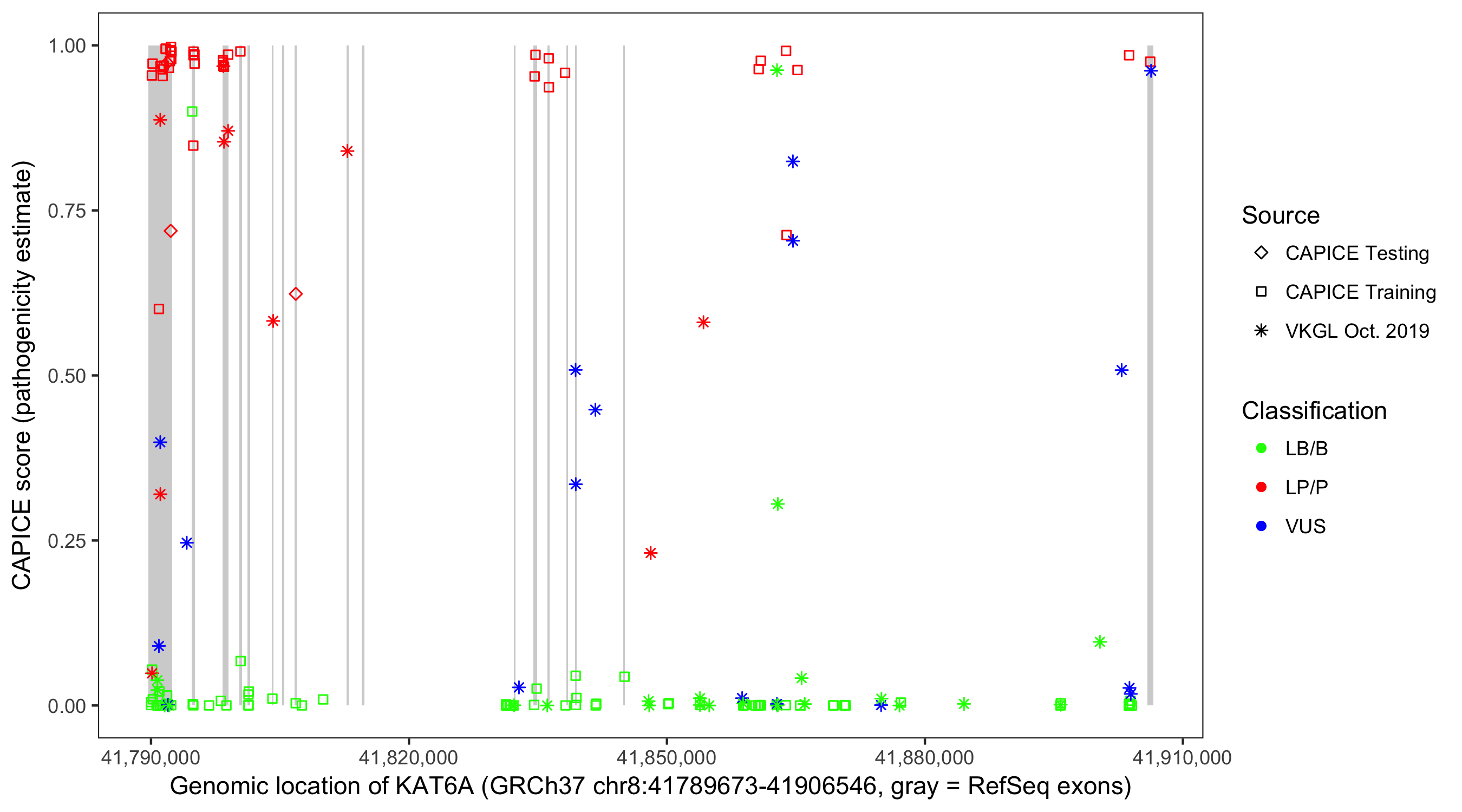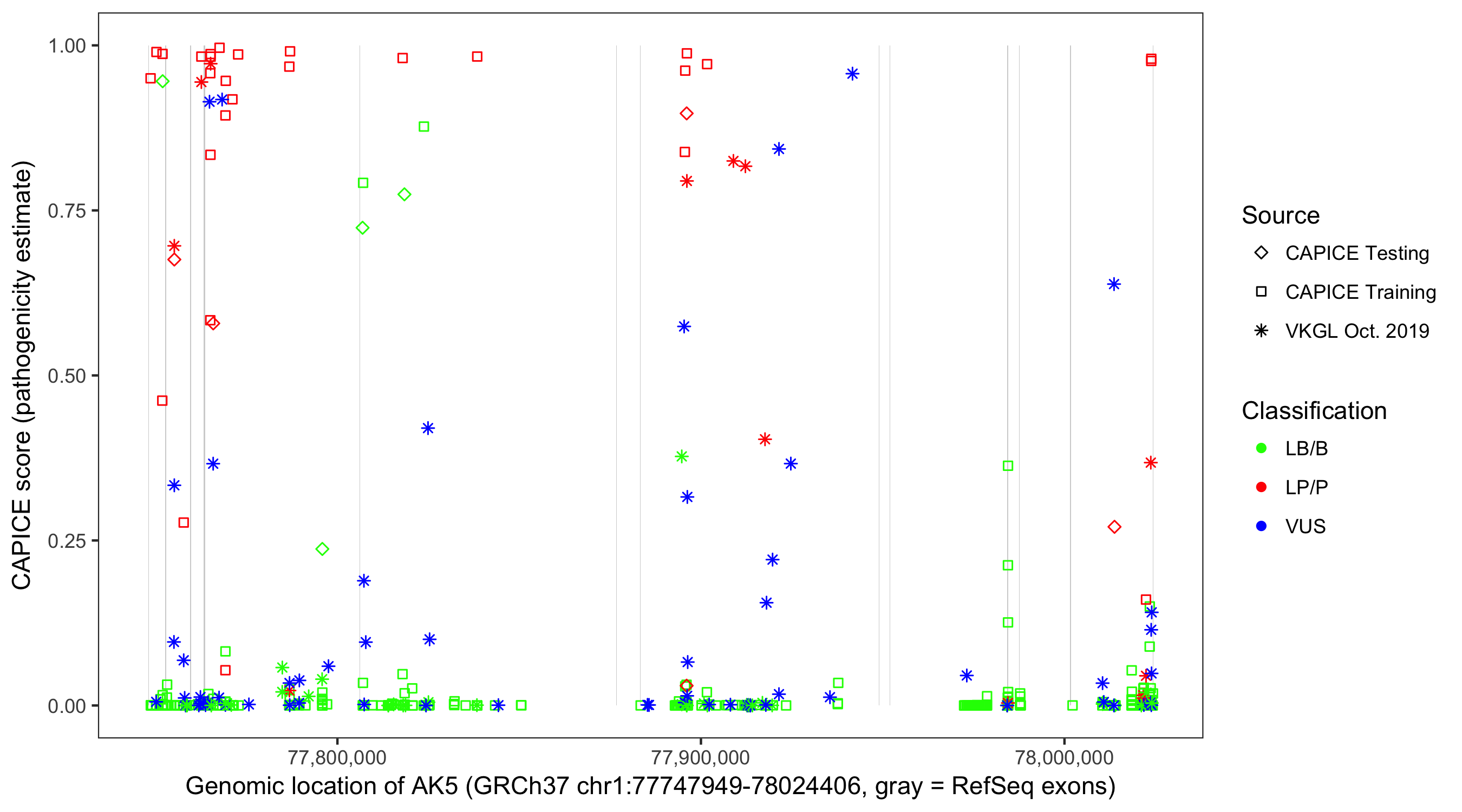 Shown are CAPICE train/test variants plus VKGL Oct 2019.