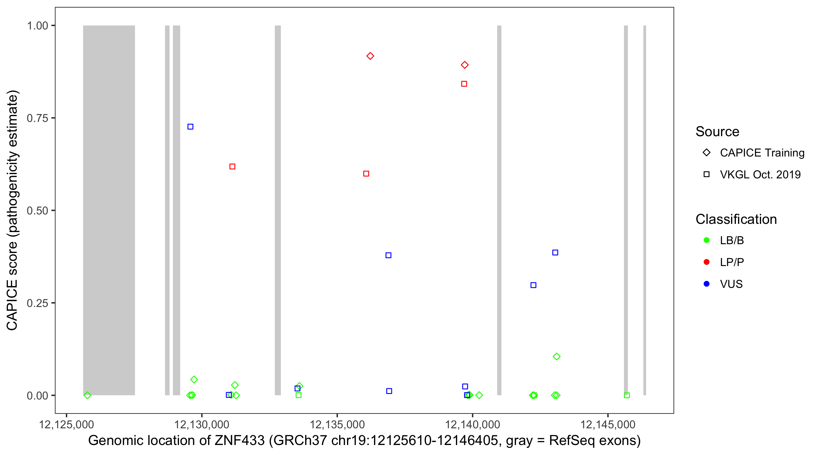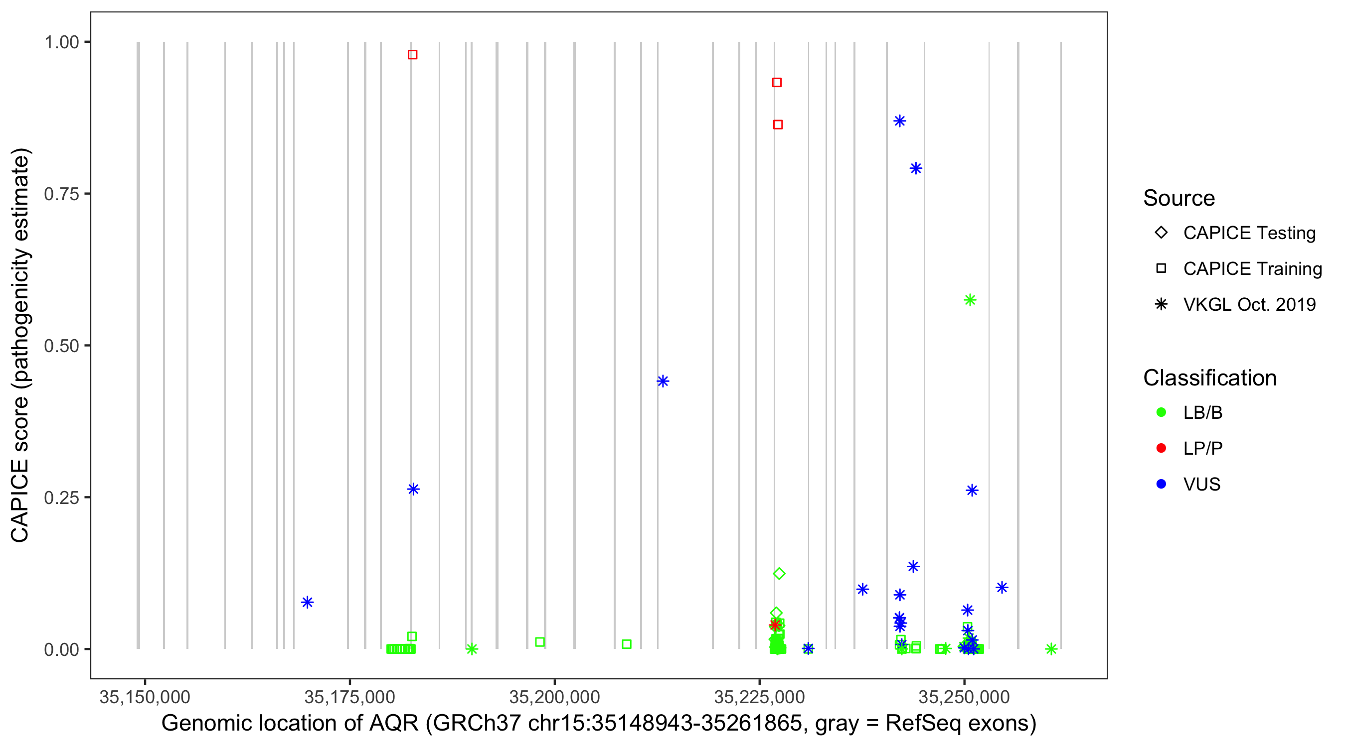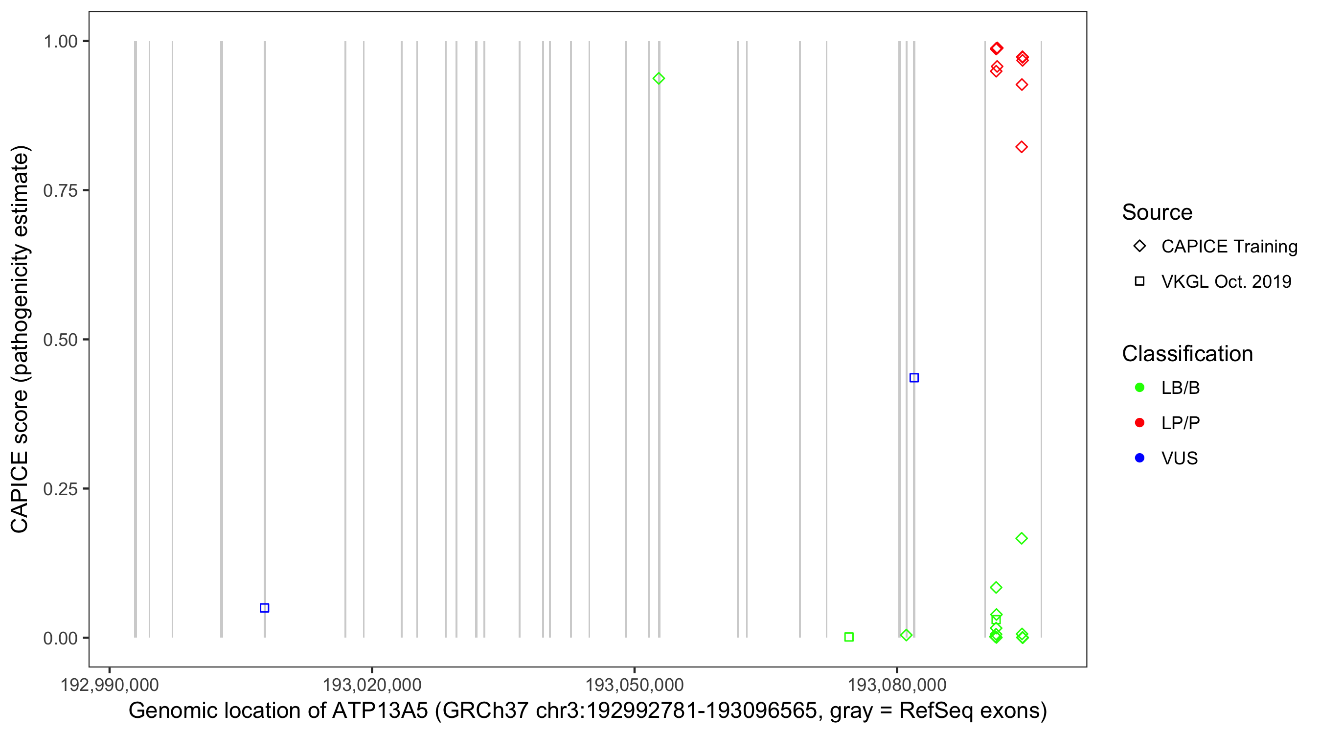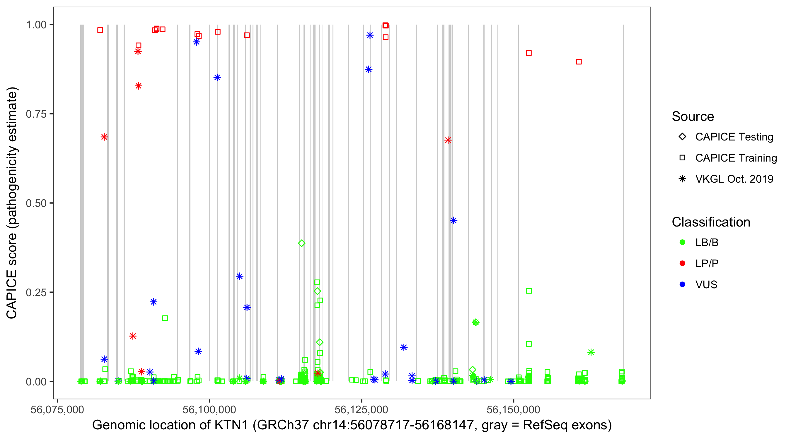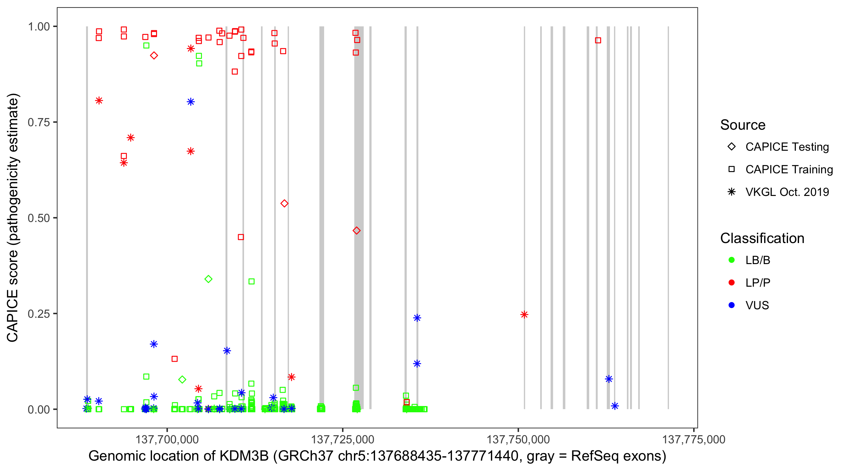 Shown are CAPICE train/test variants plus VKGL Oct 2019.