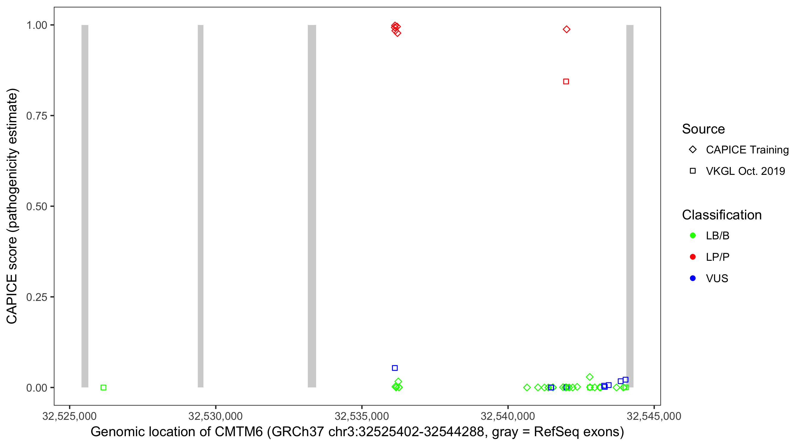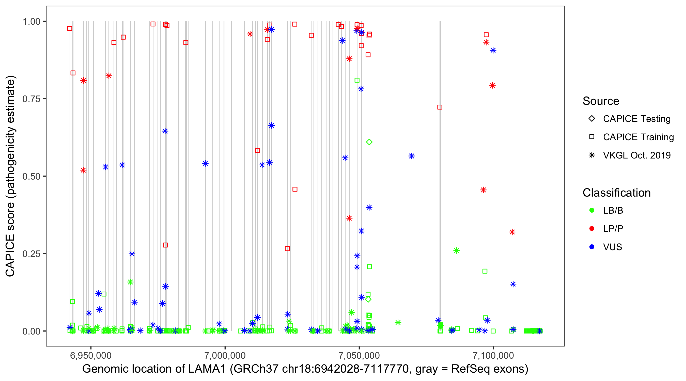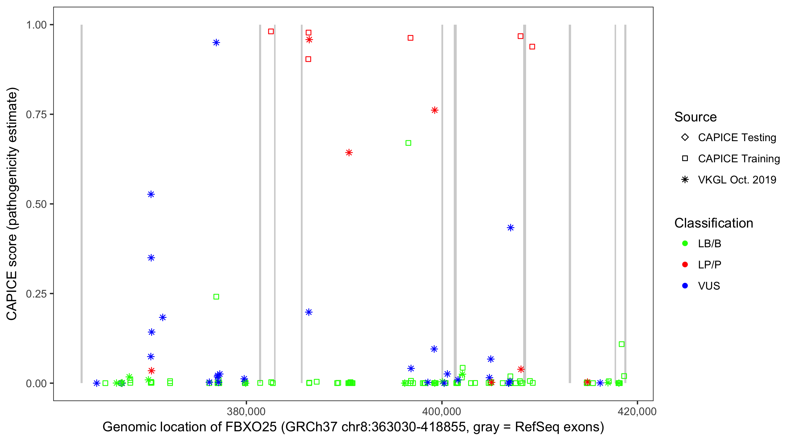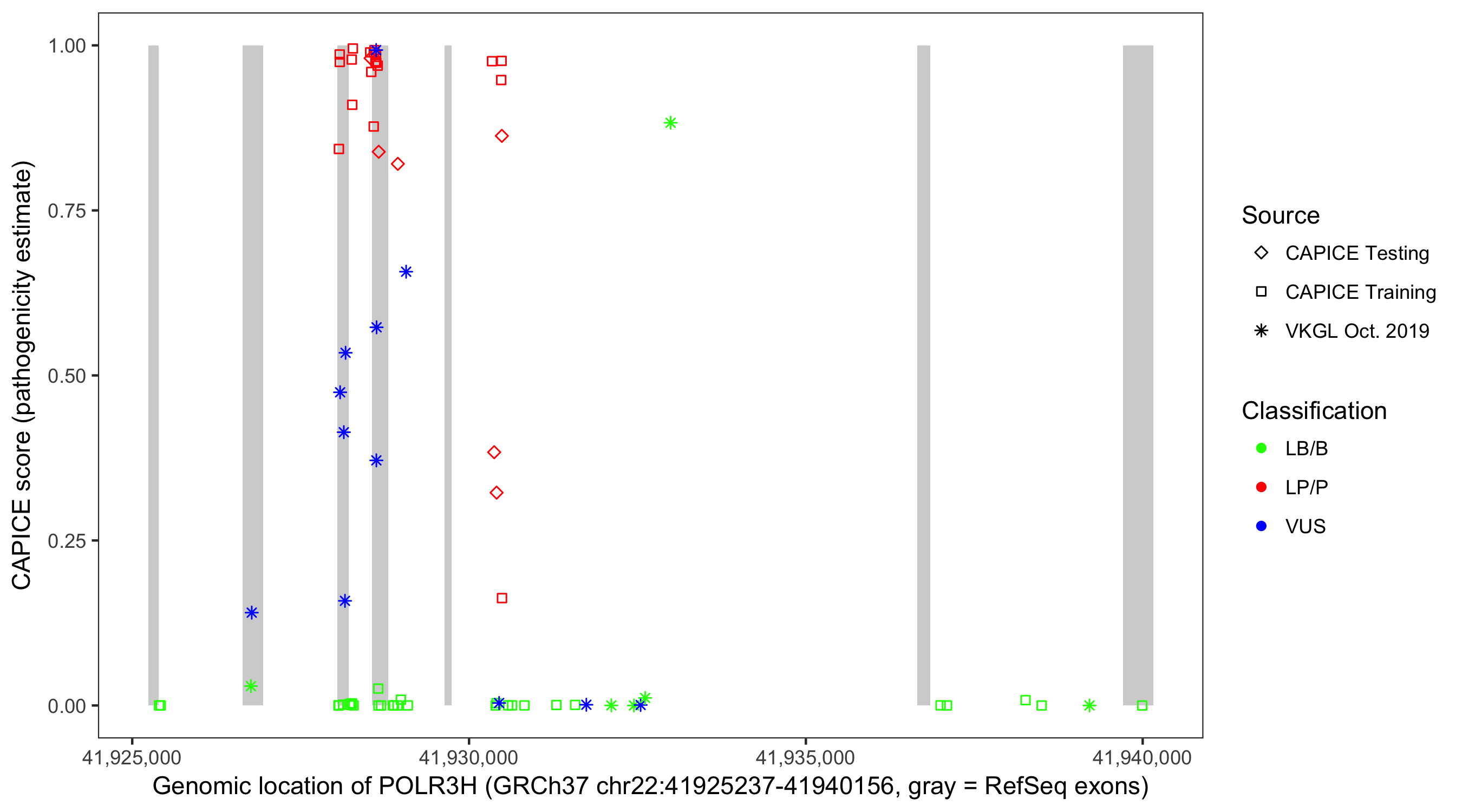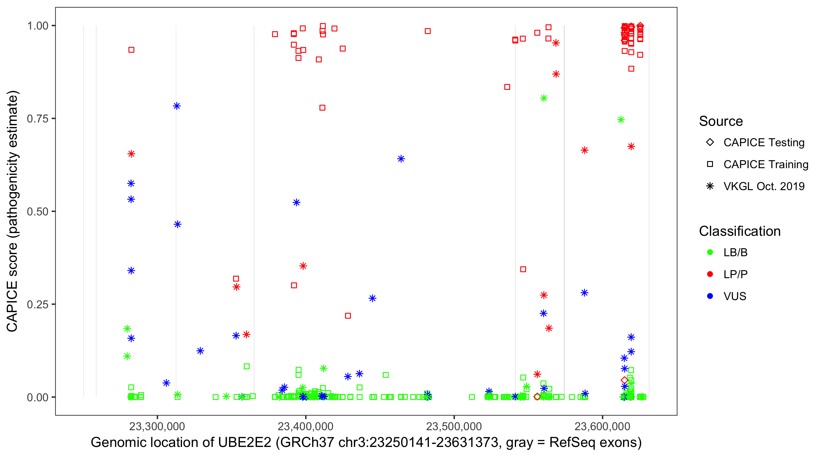 Shown are CAPICE train/test variants plus VKGL Oct 2019.