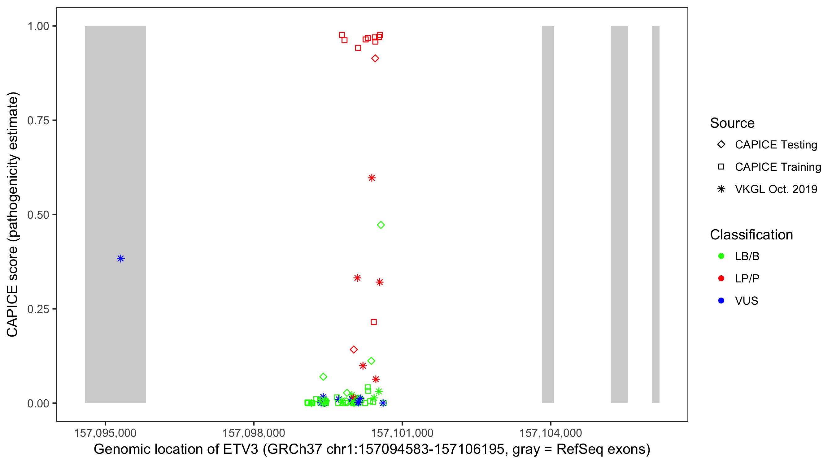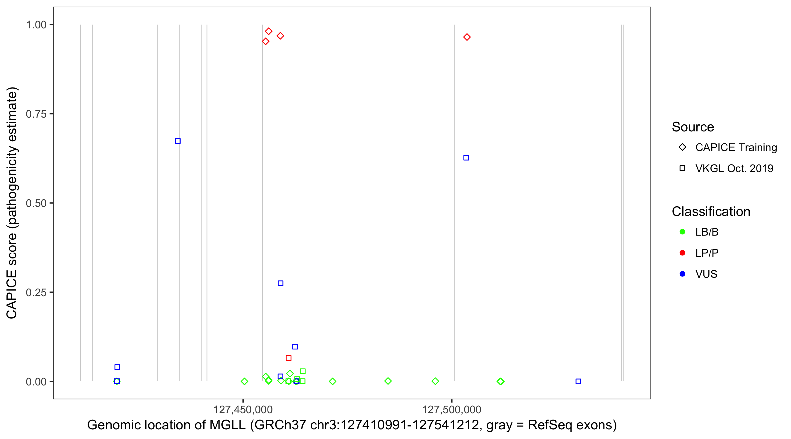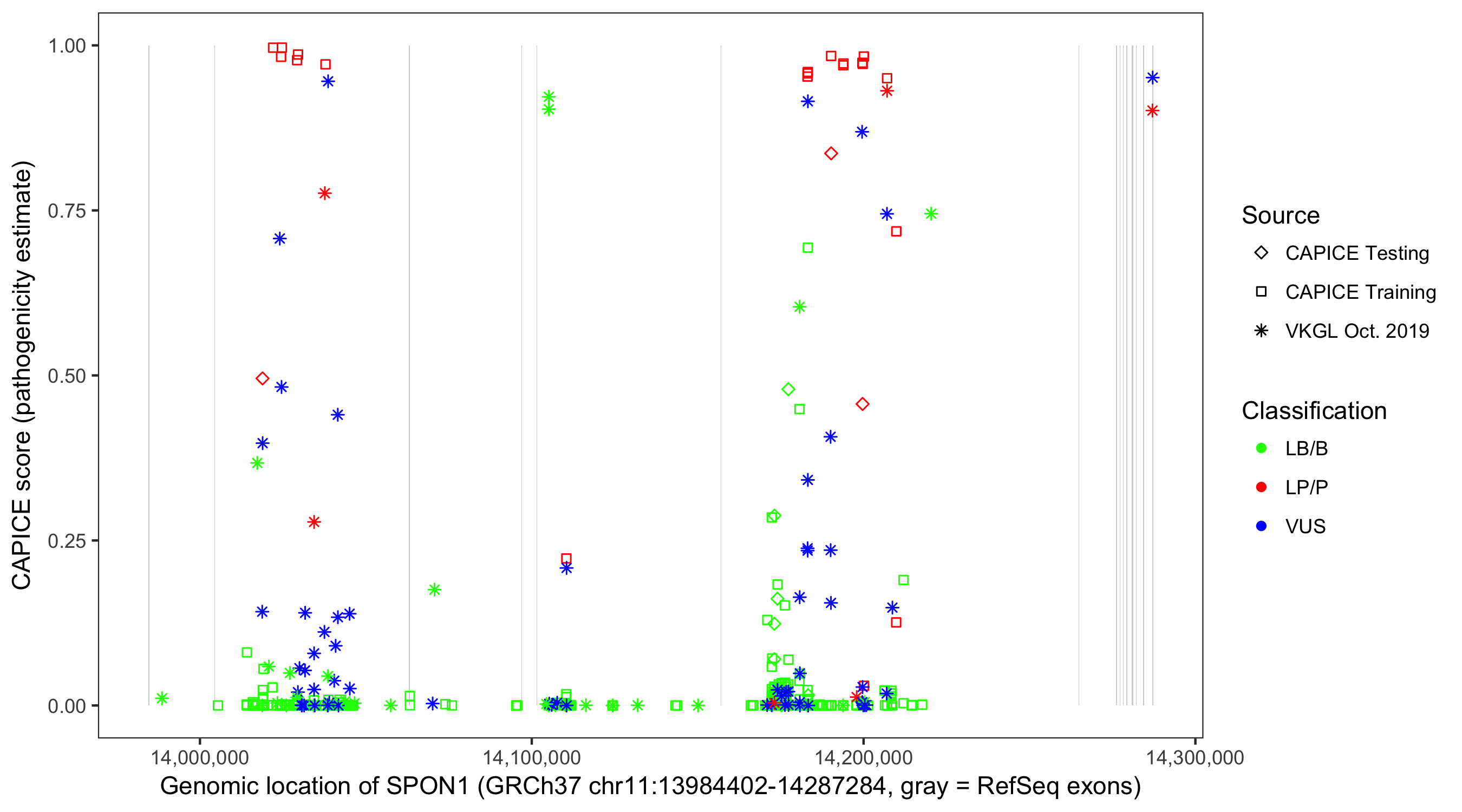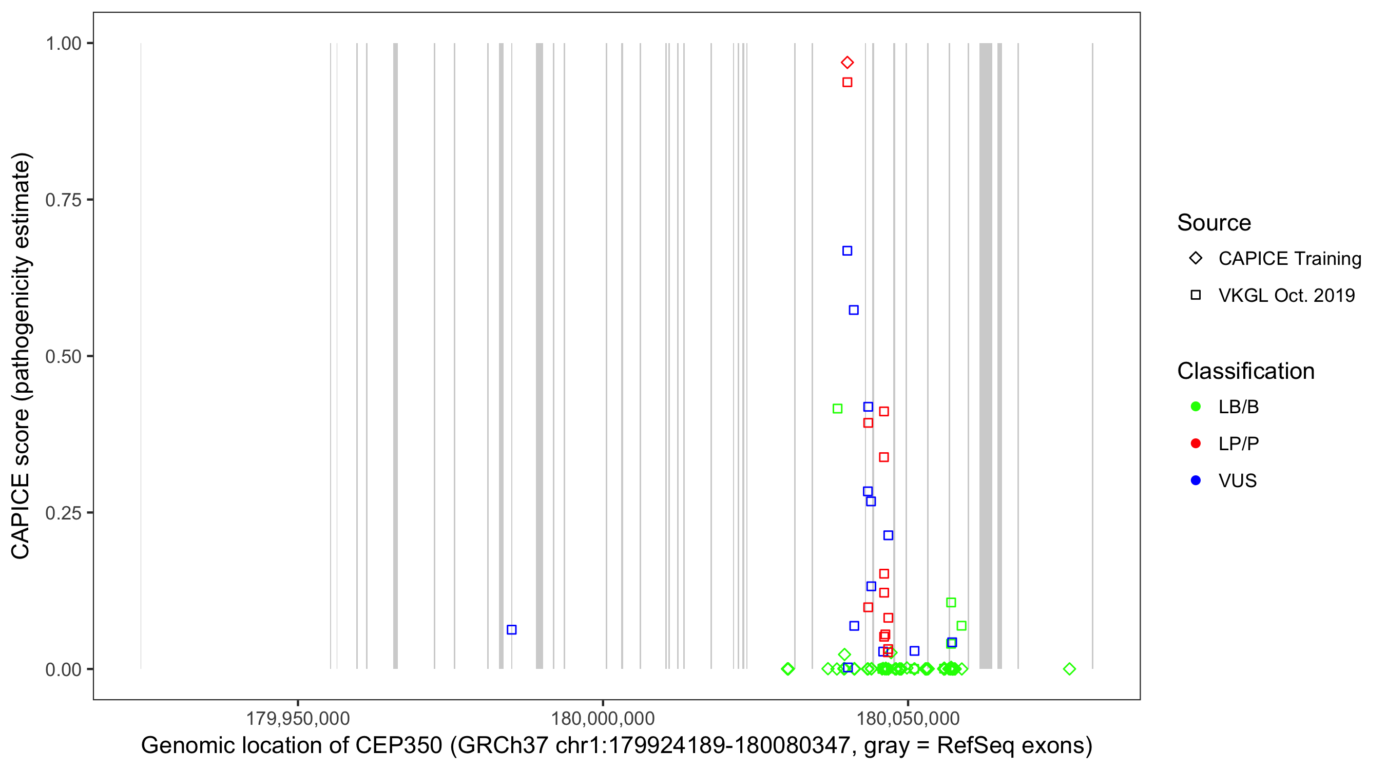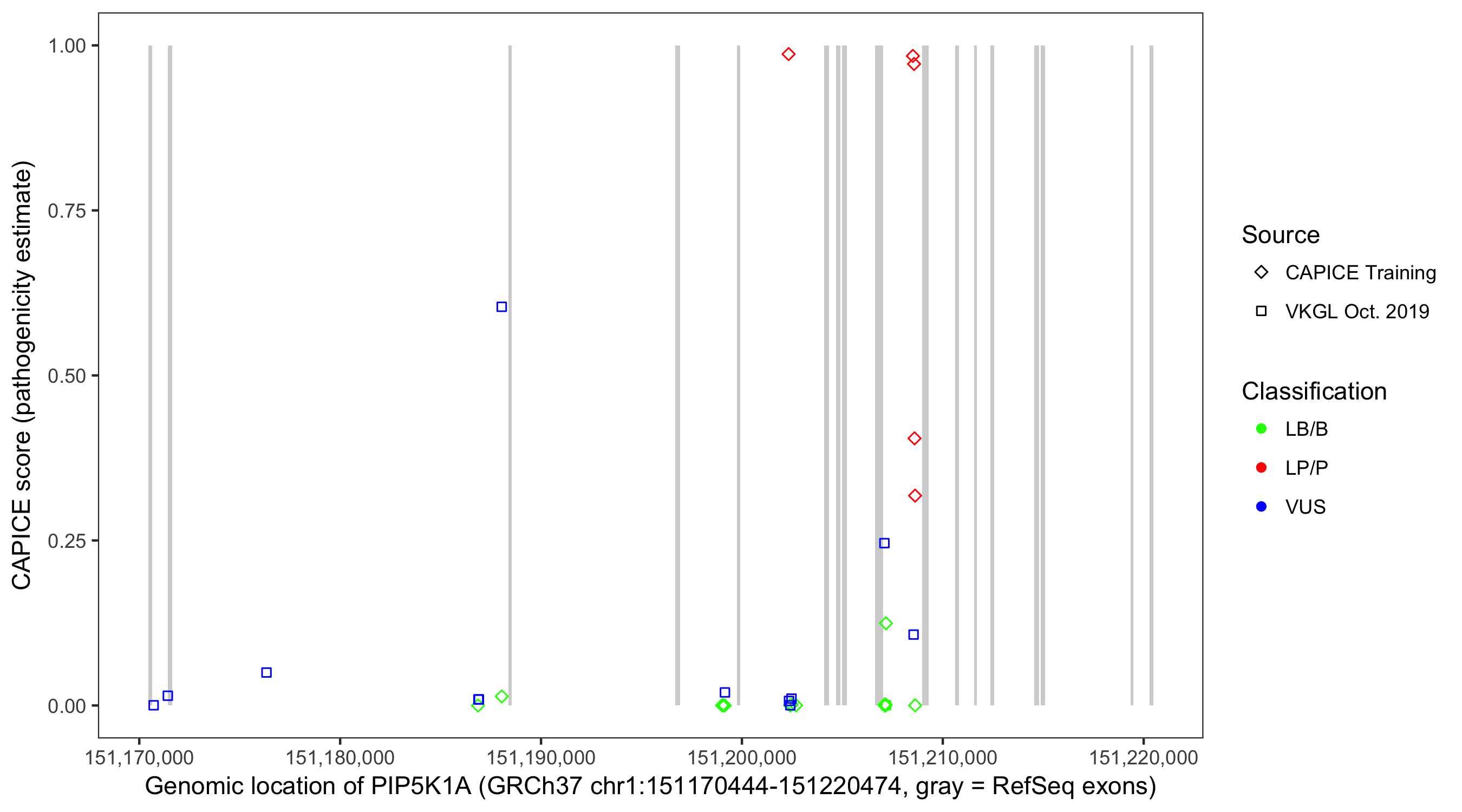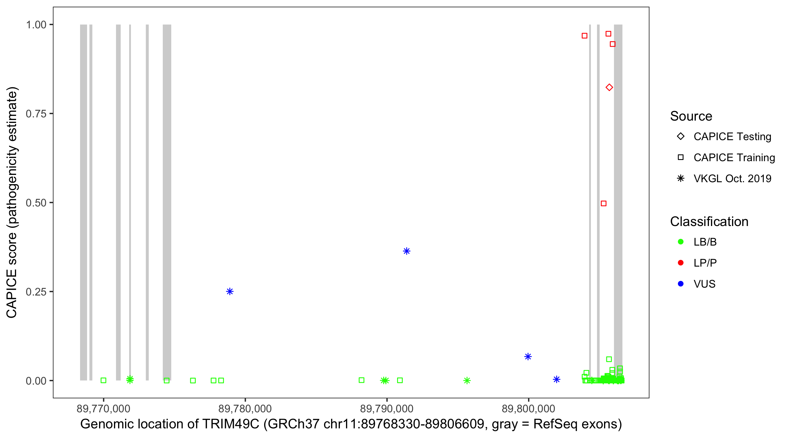 Shown are CAPICE train/test variants plus VKGL Oct 2019.