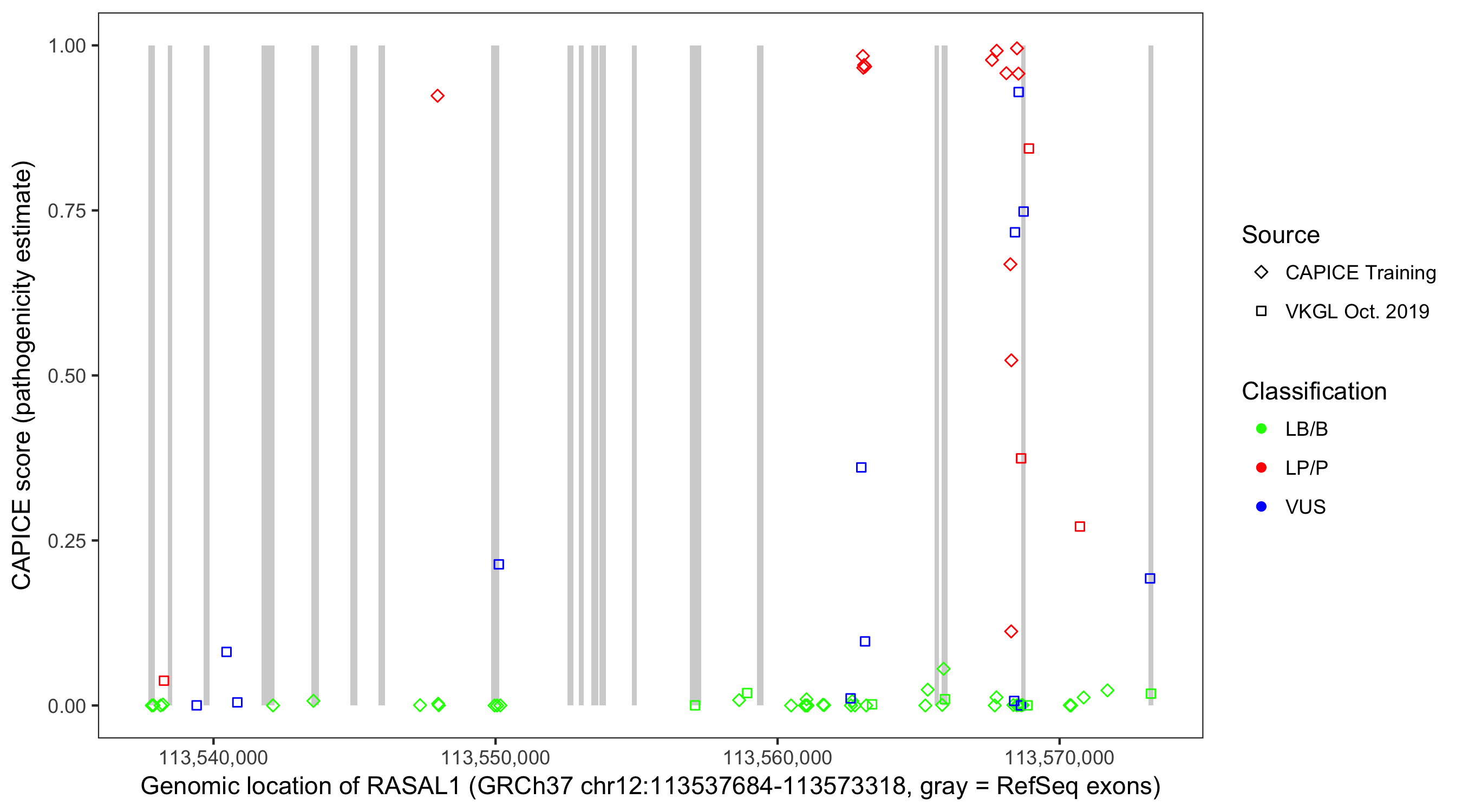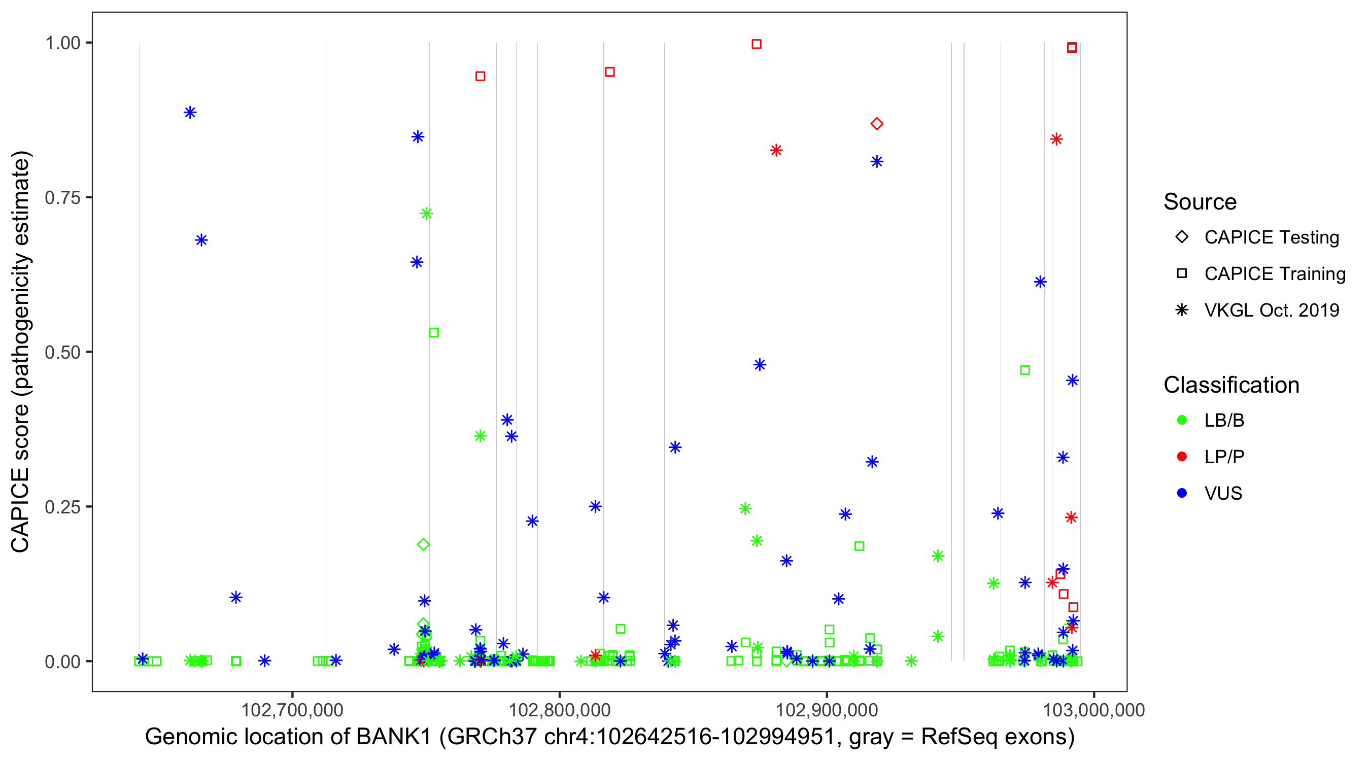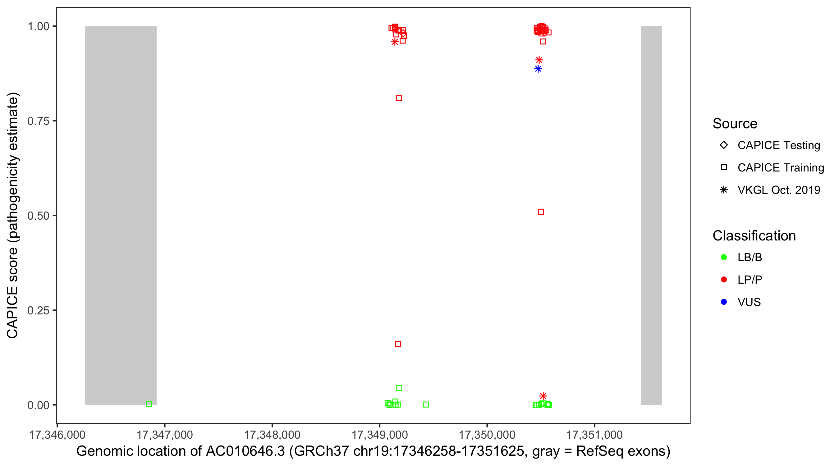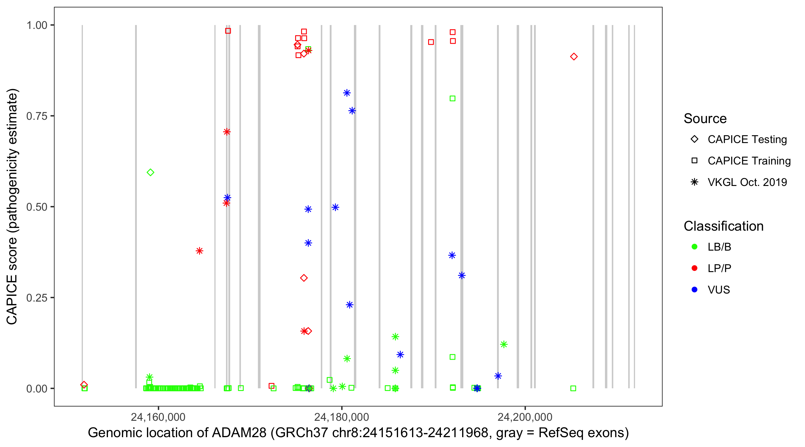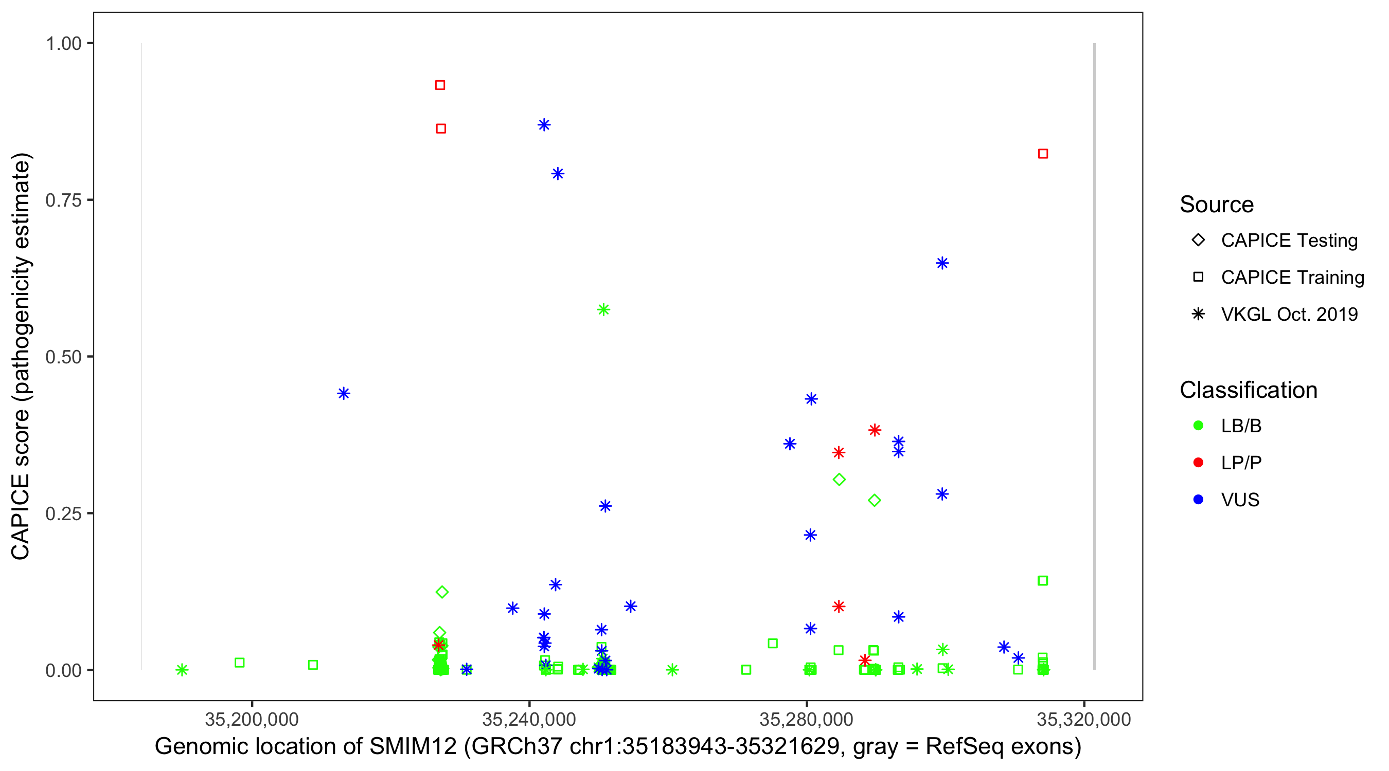 Shown are CAPICE train/test variants plus VKGL Oct 2019.