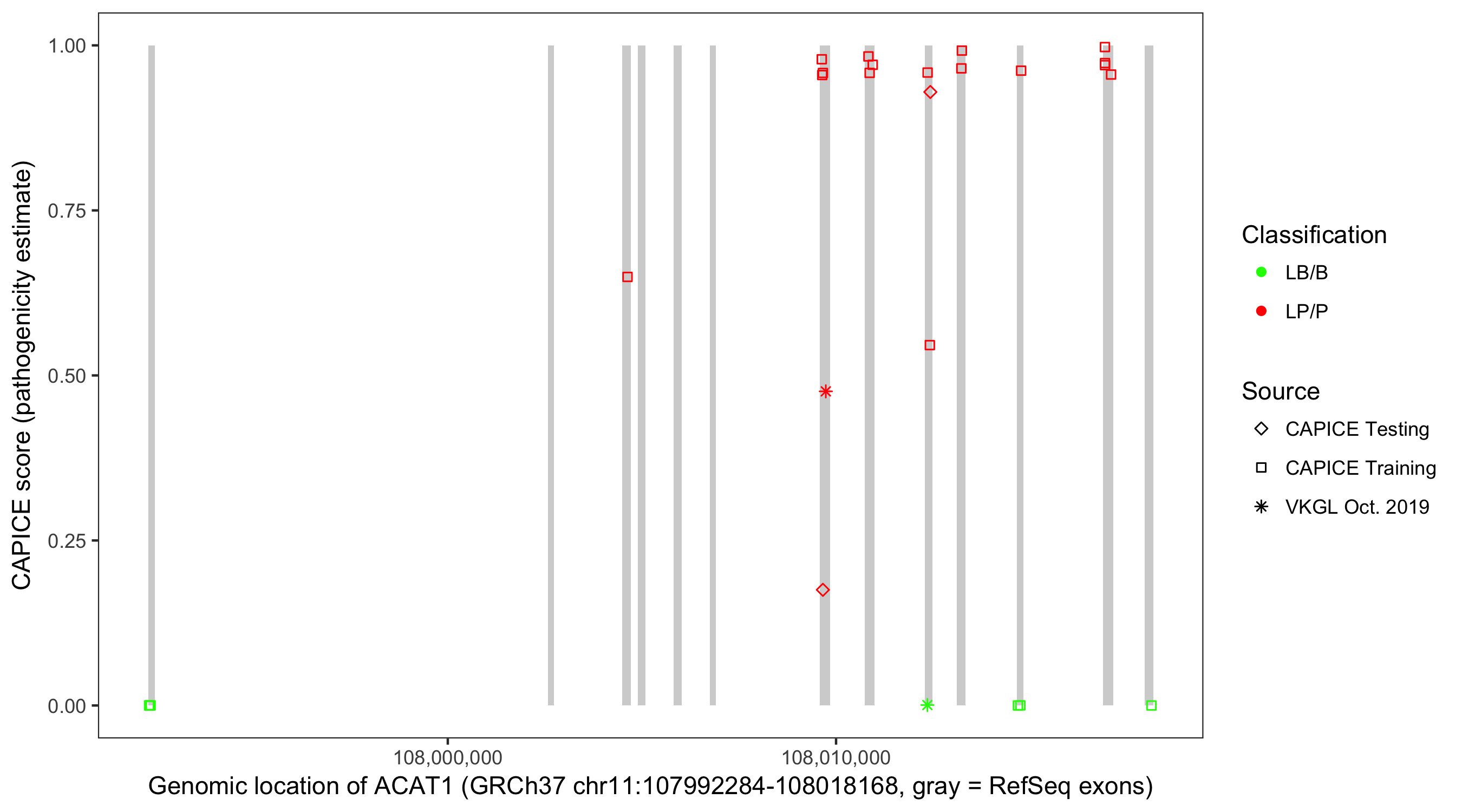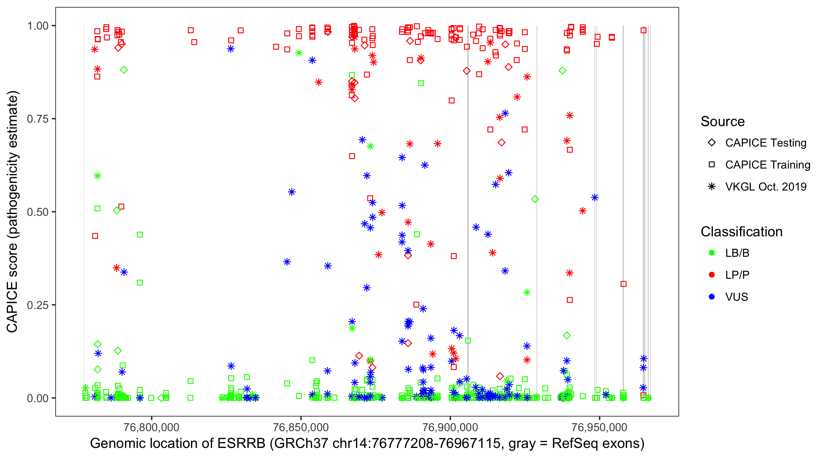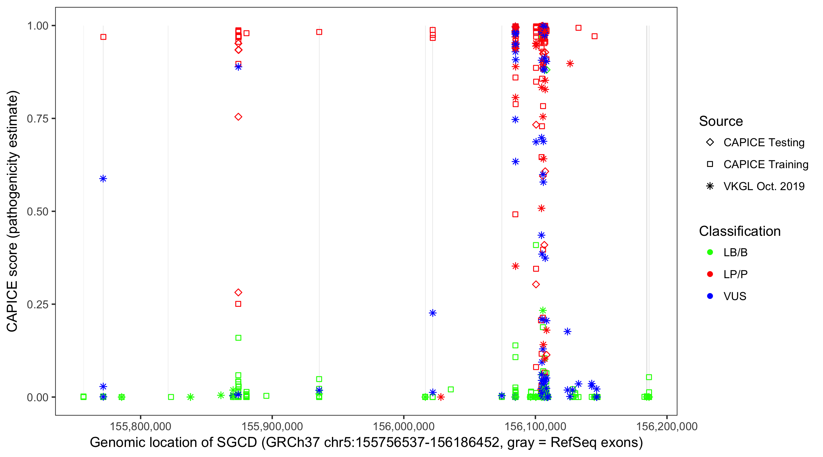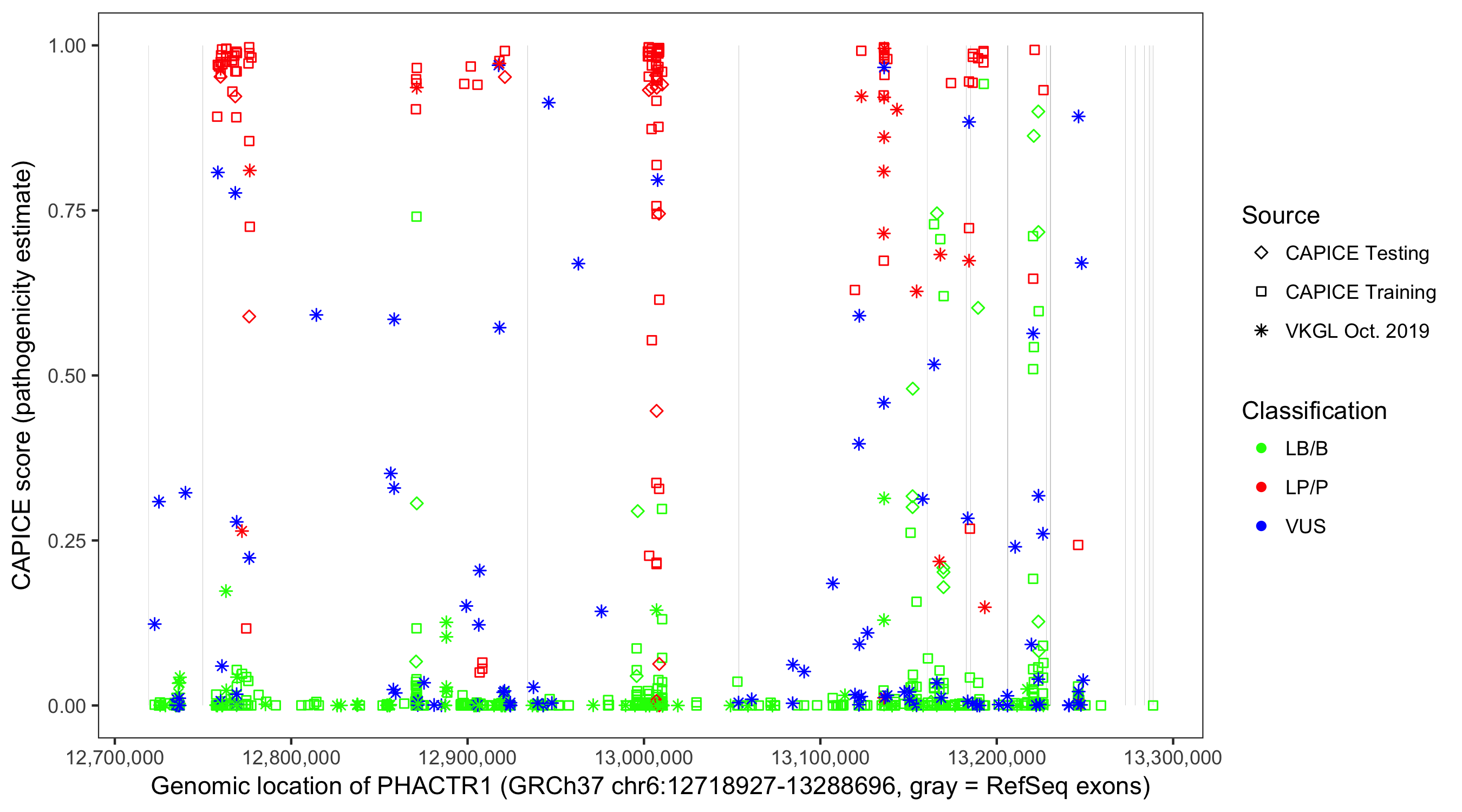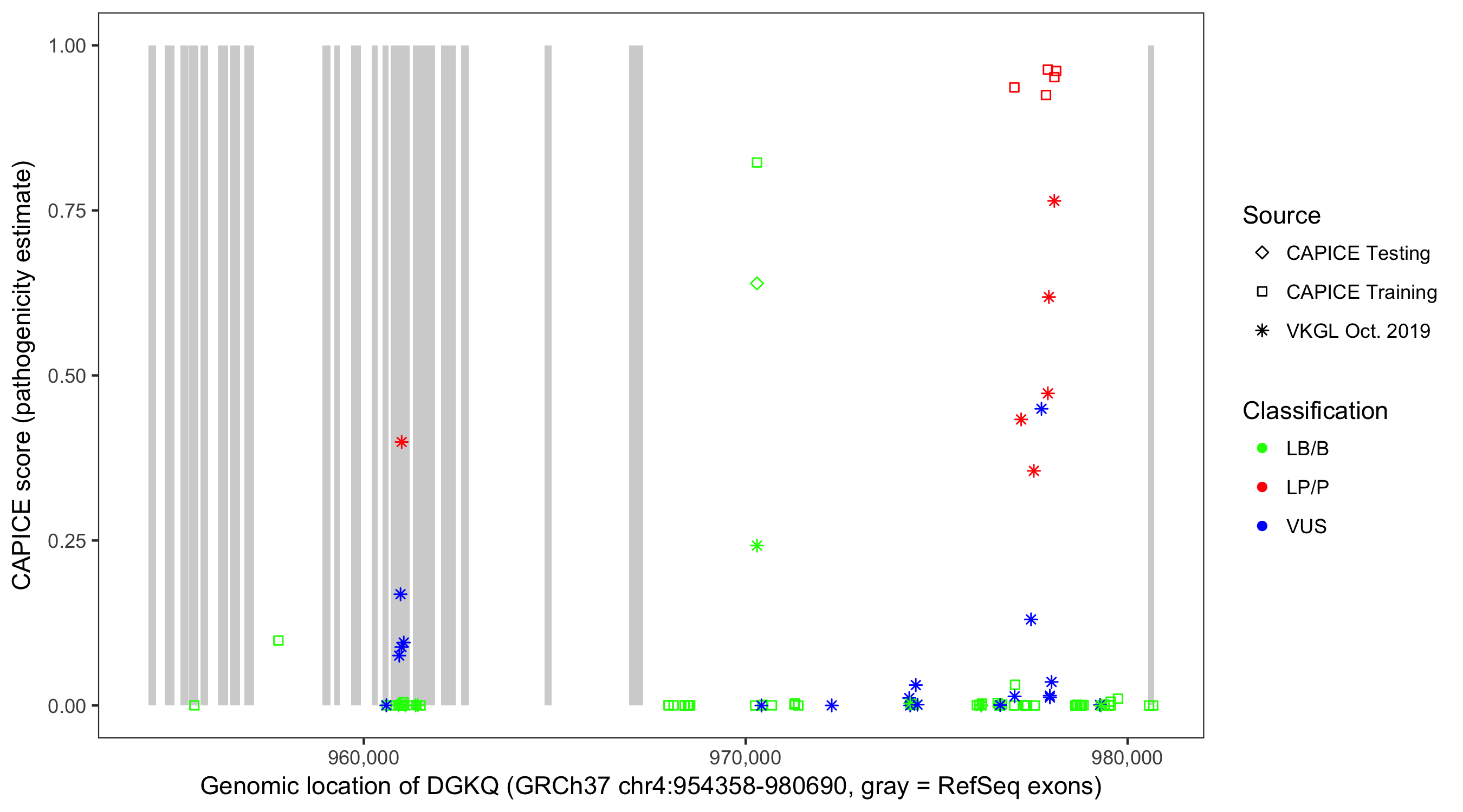 Shown are CAPICE train/test variants plus VKGL Oct 2019.