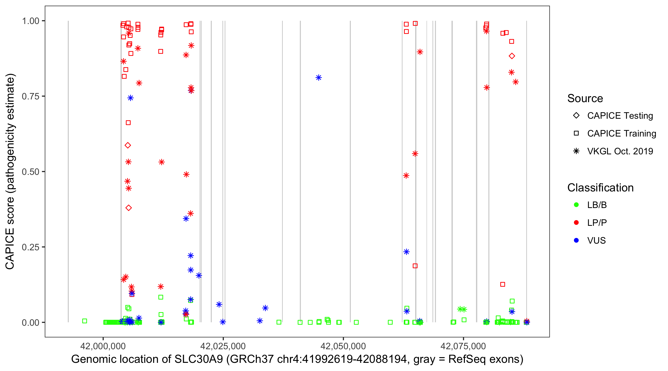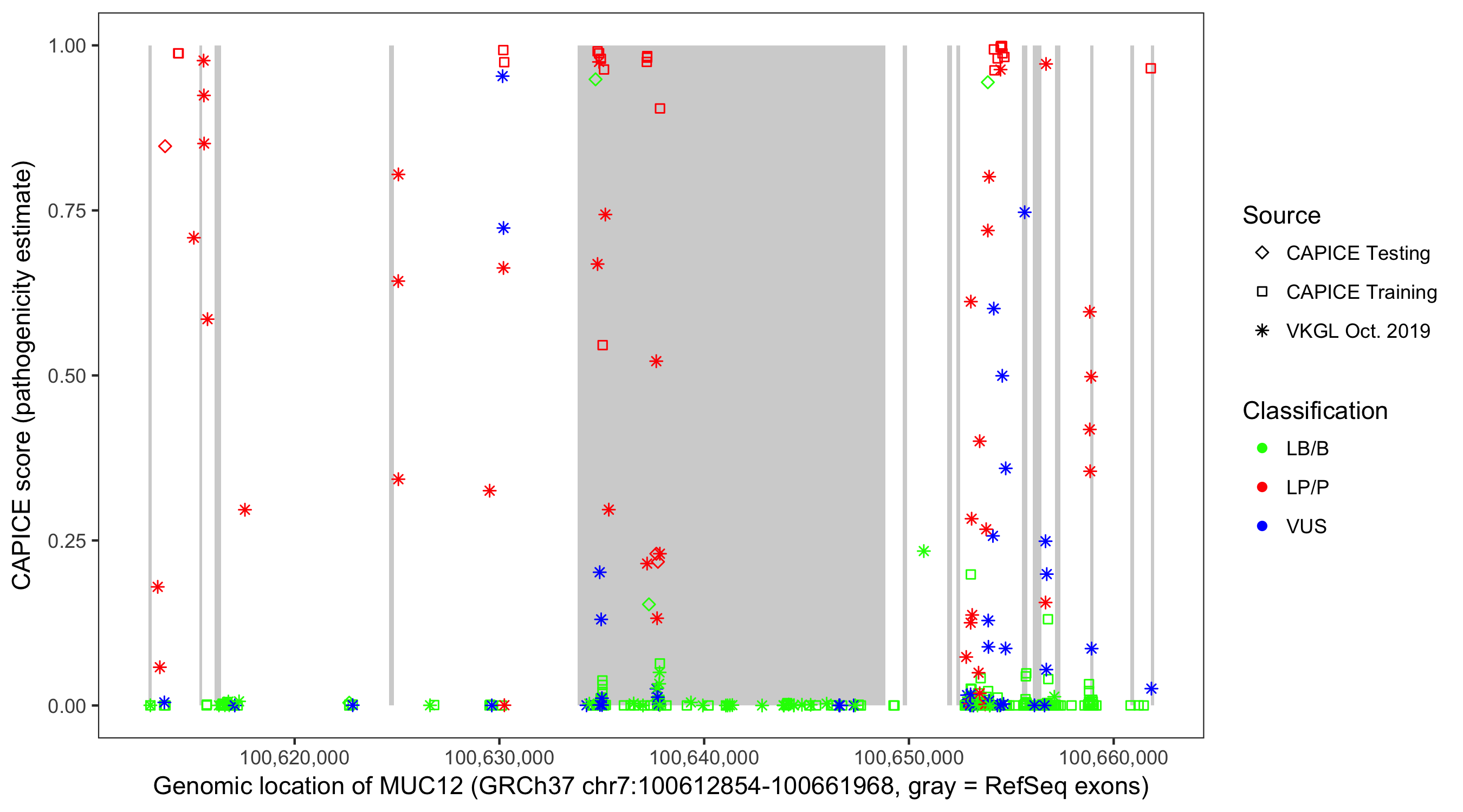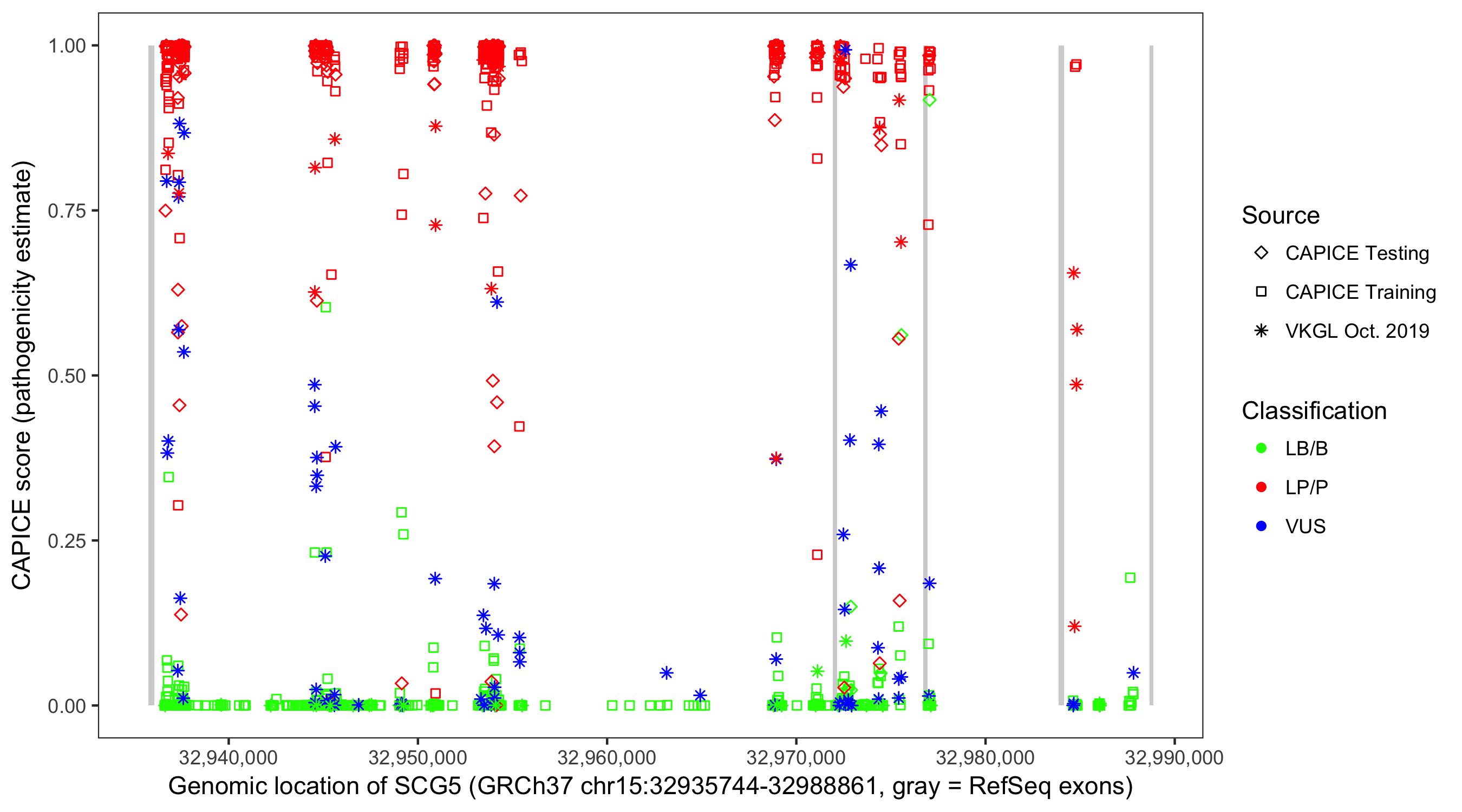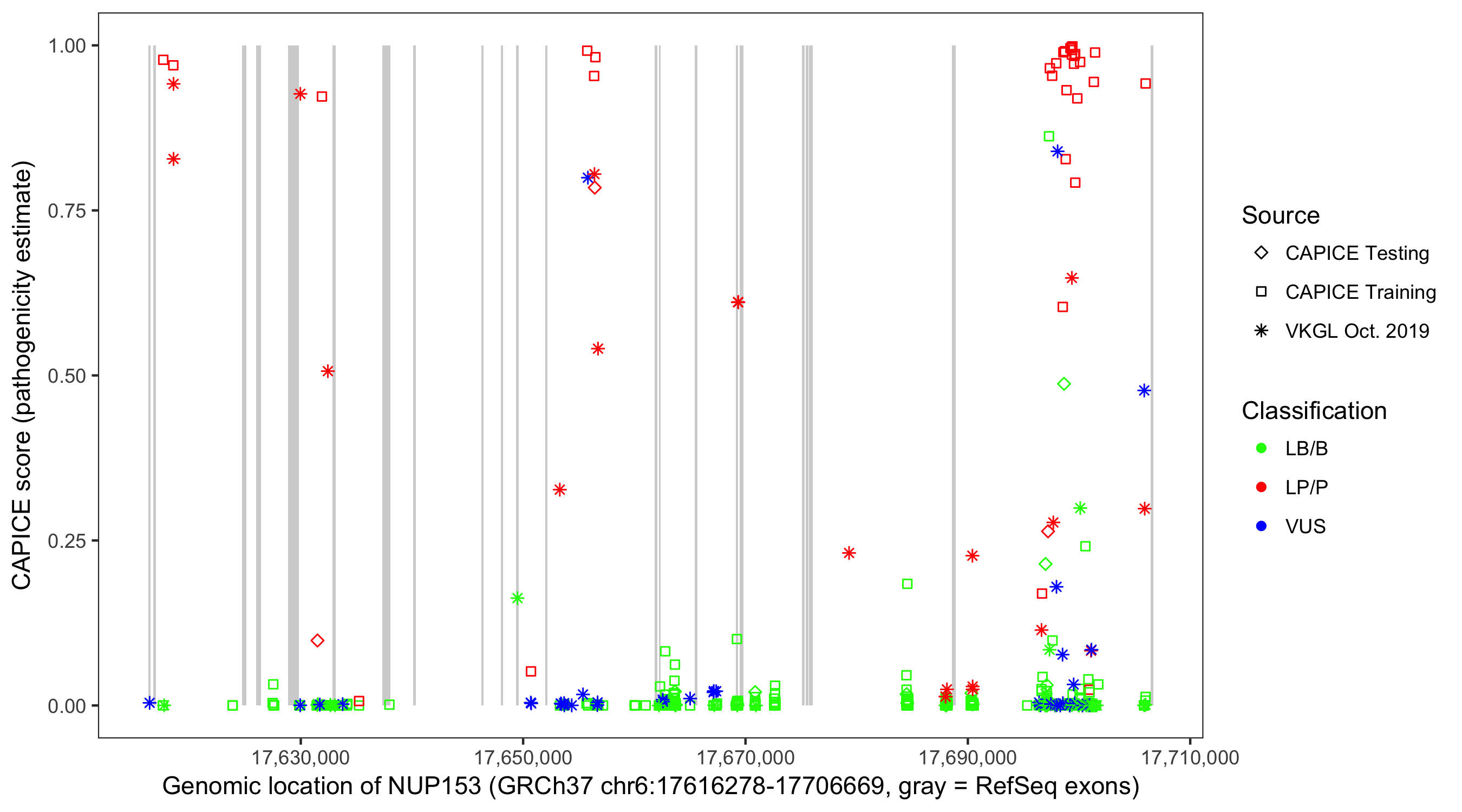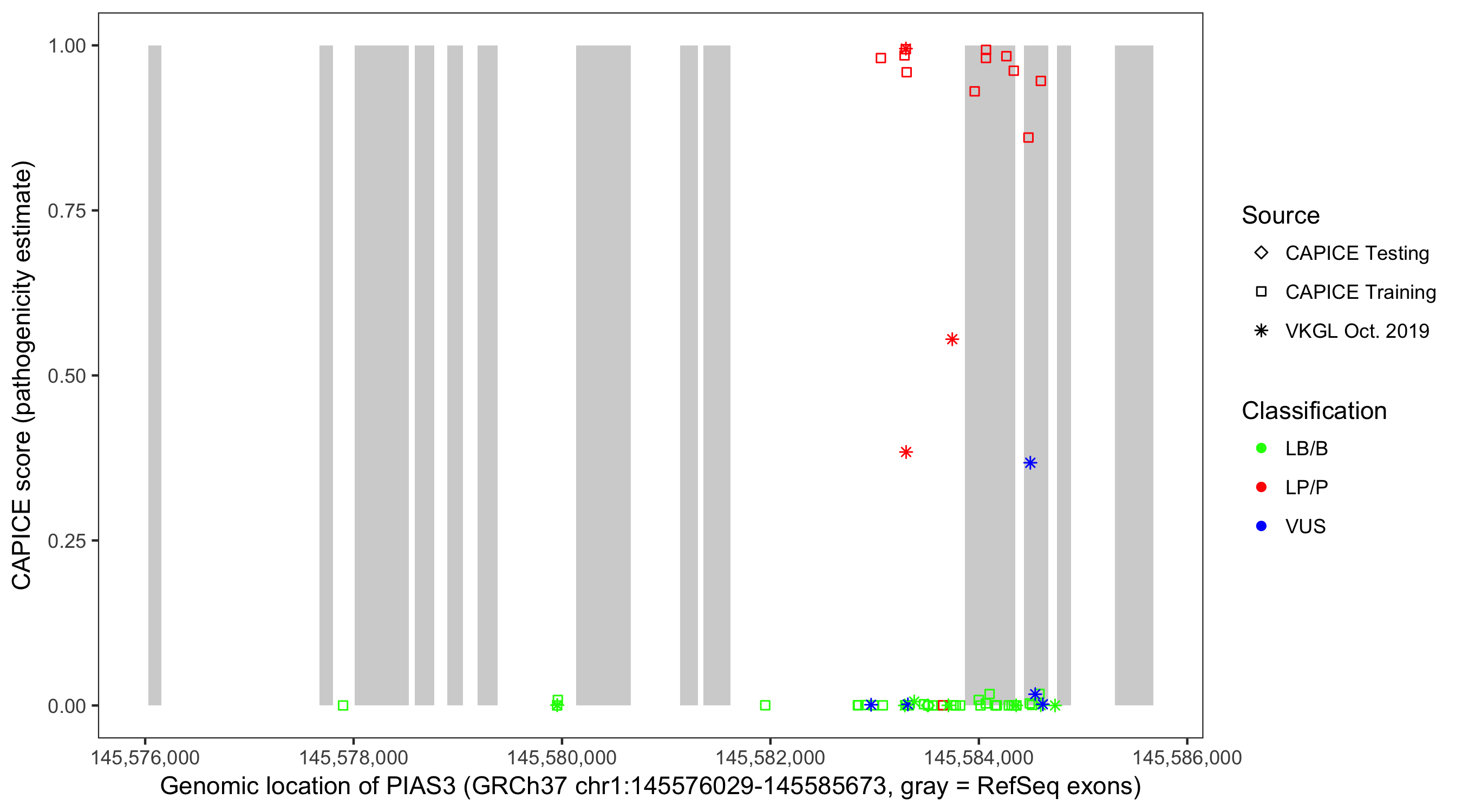 Shown are CAPICE train/test variants plus VKGL Oct 2019.