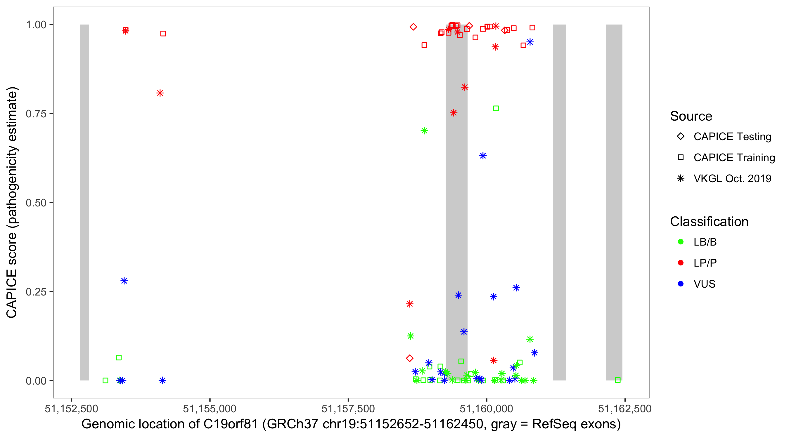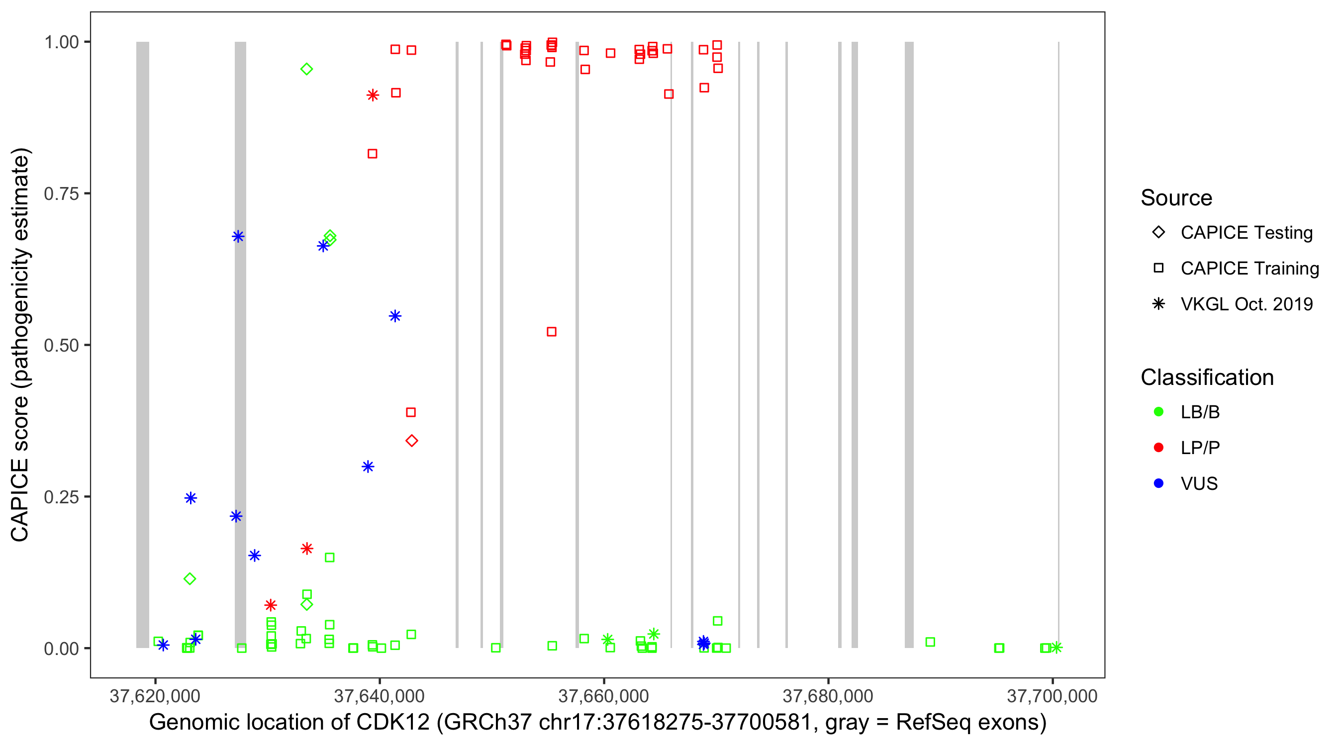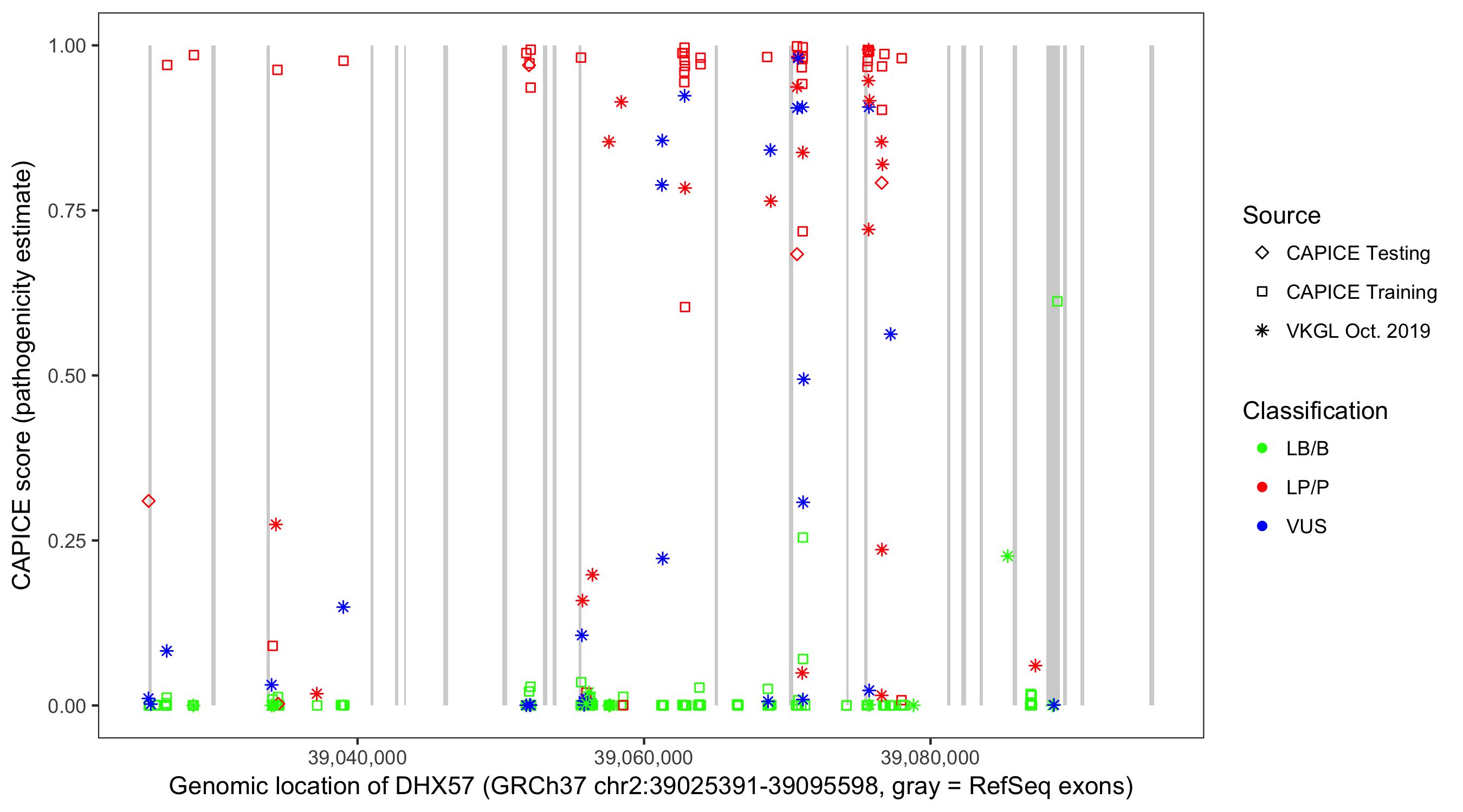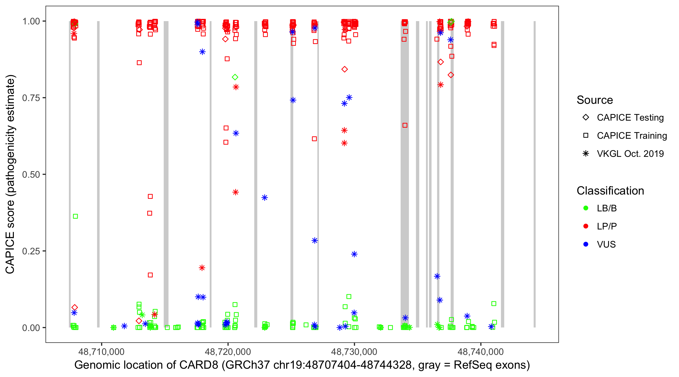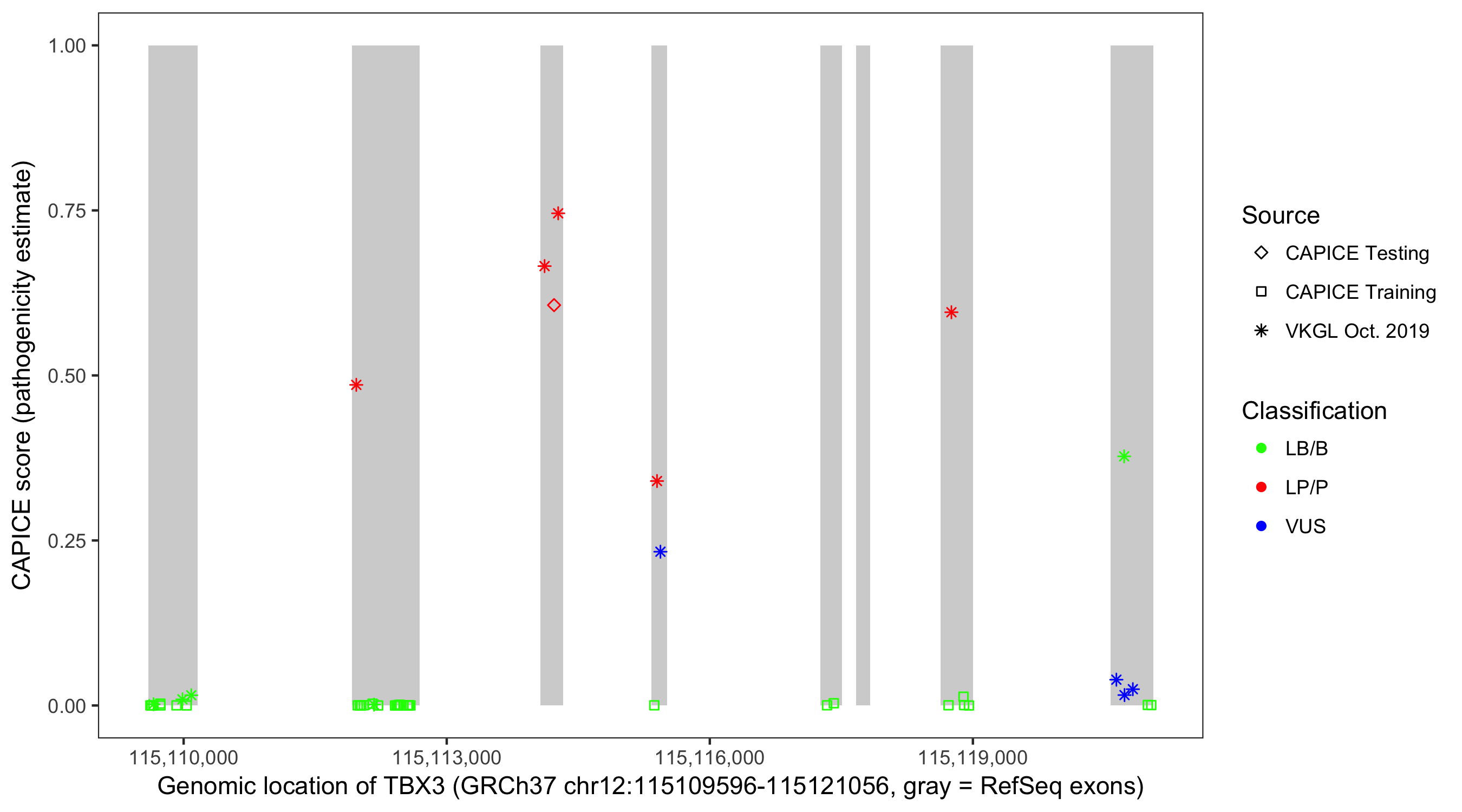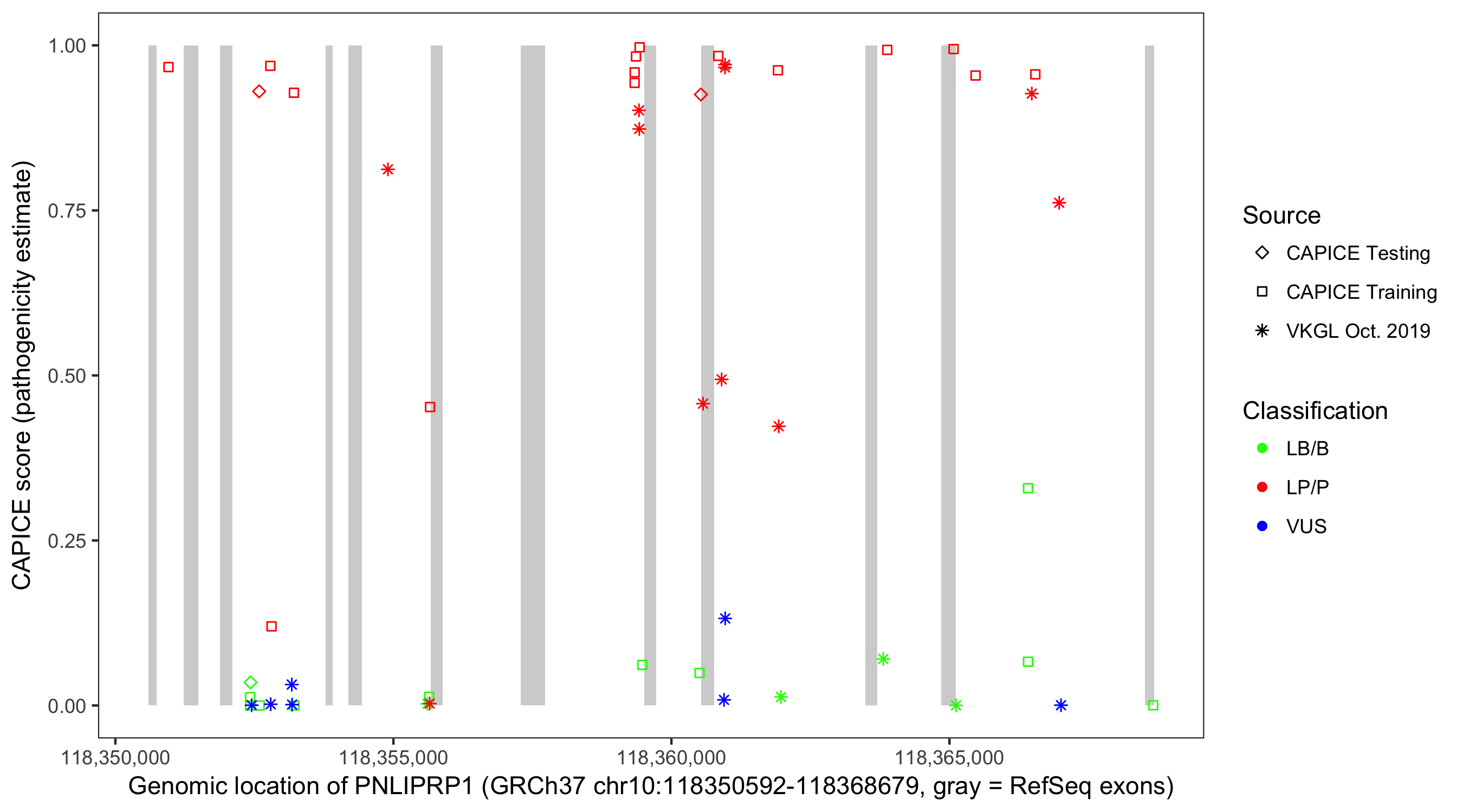 Shown are CAPICE train/test variants plus VKGL Oct 2019.