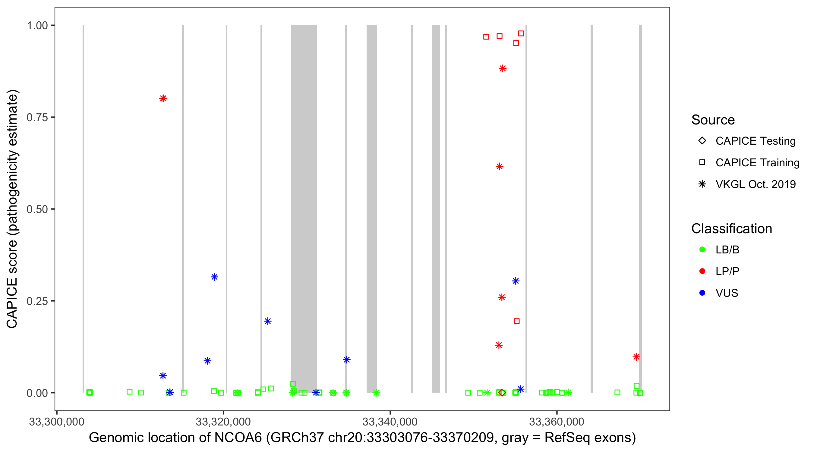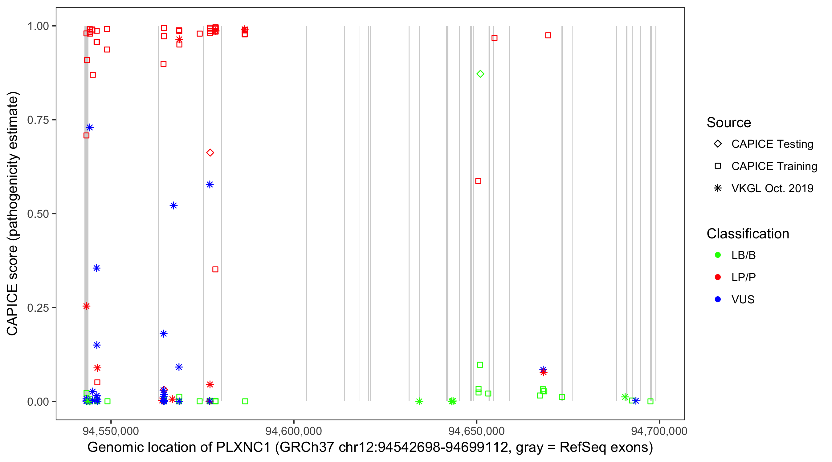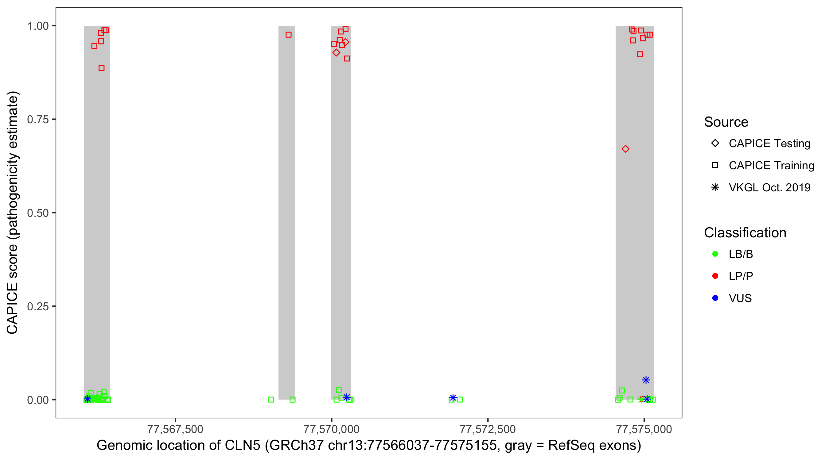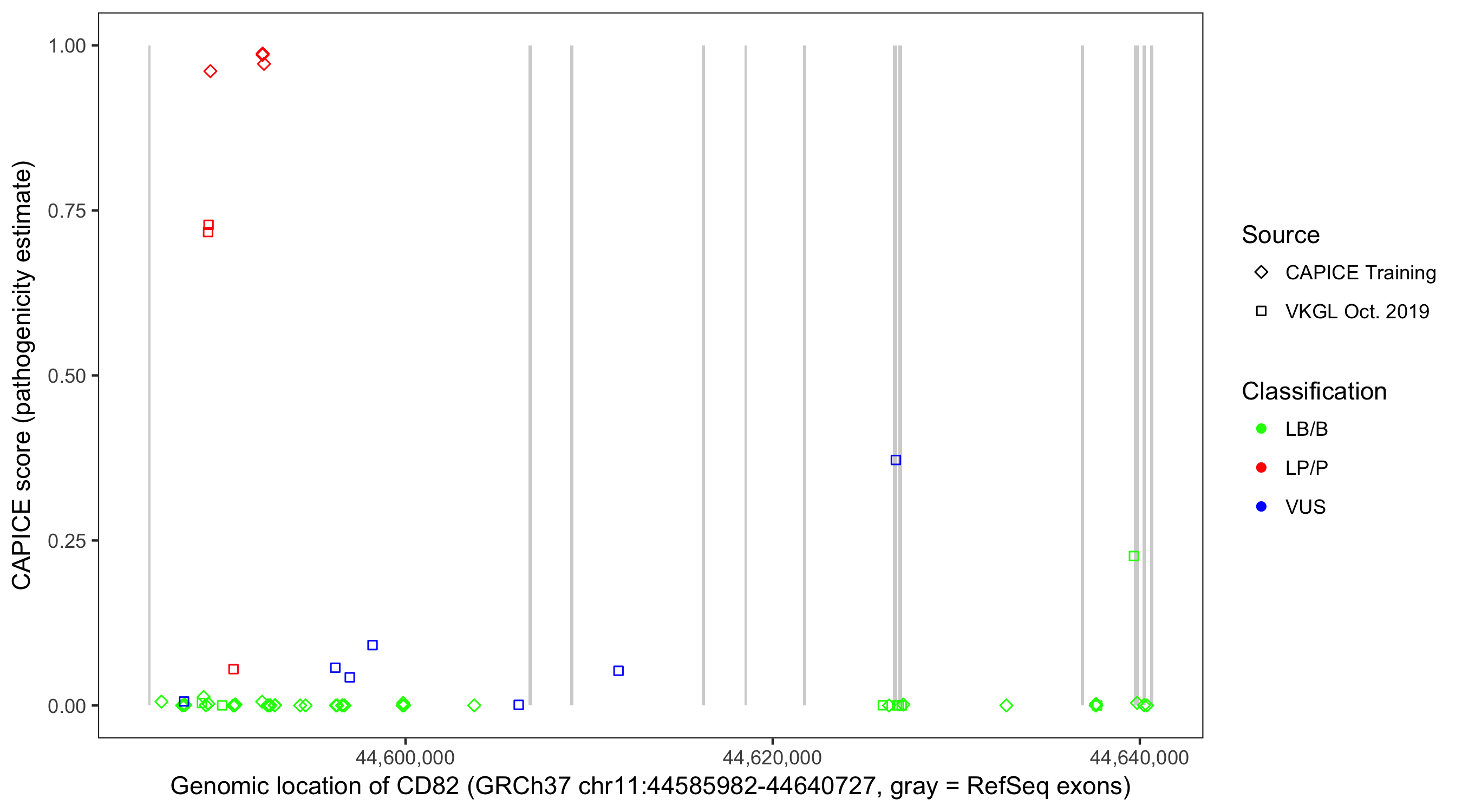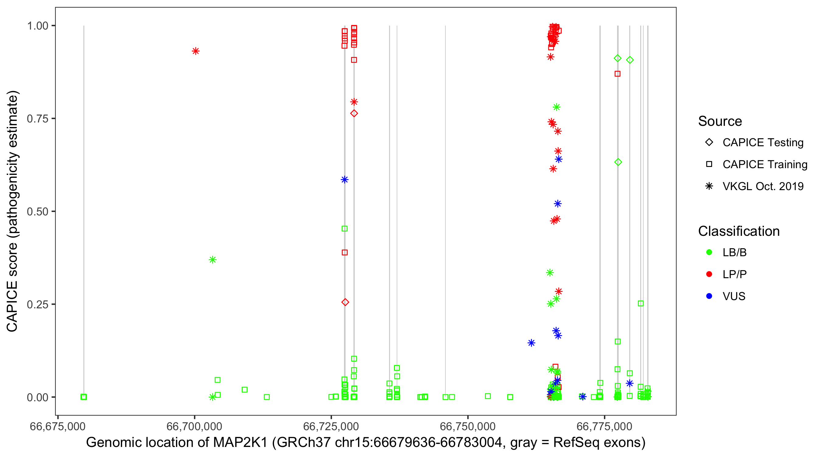 Shown are CAPICE train/test variants plus VKGL Oct 2019.