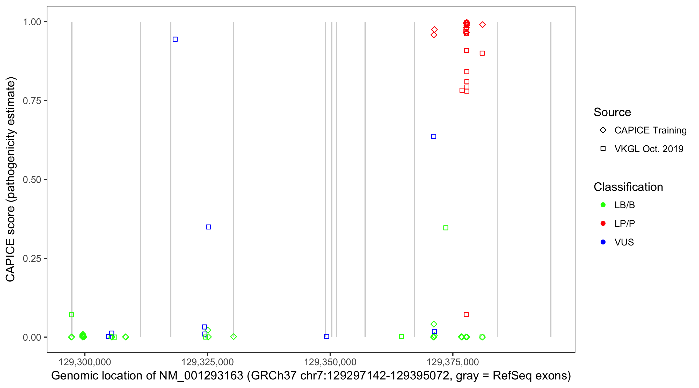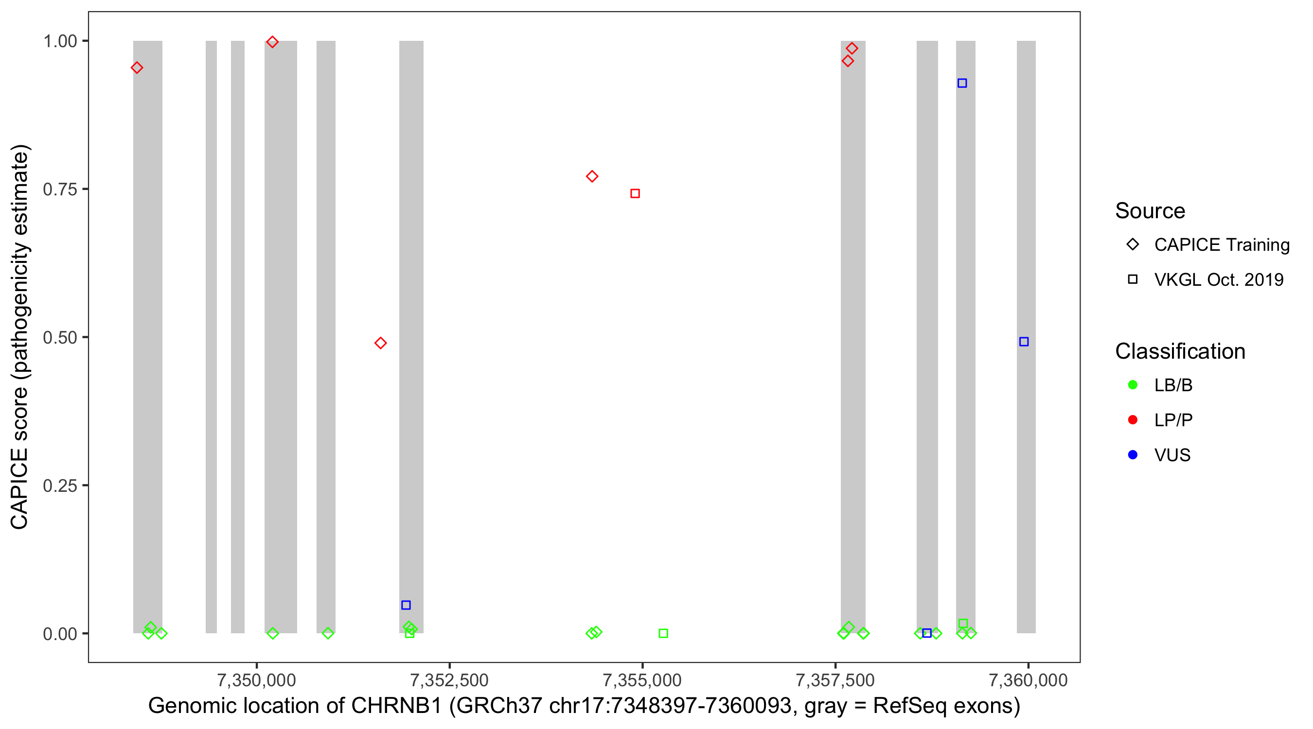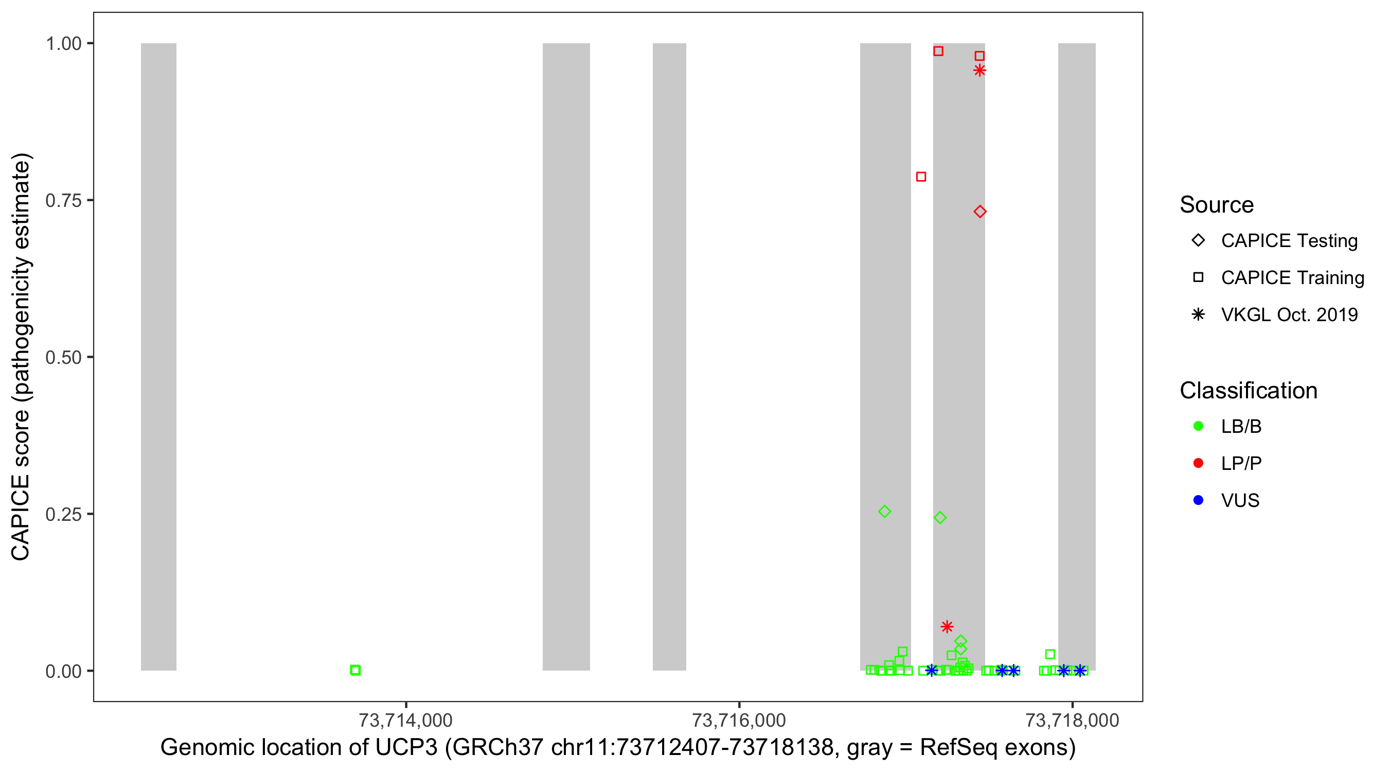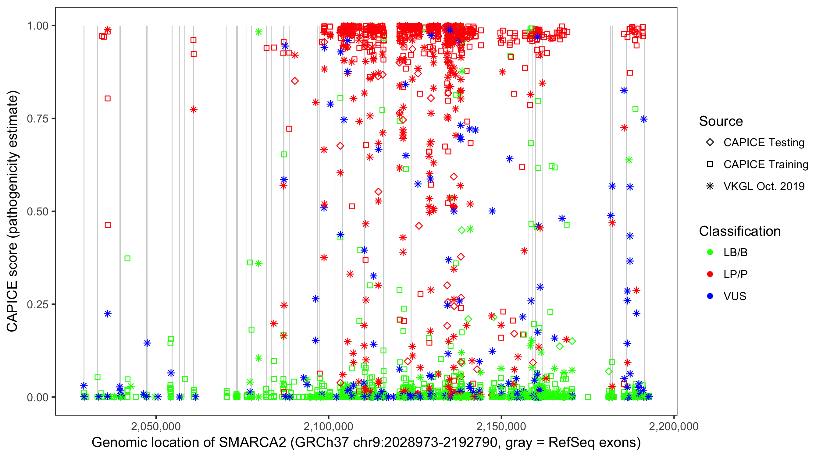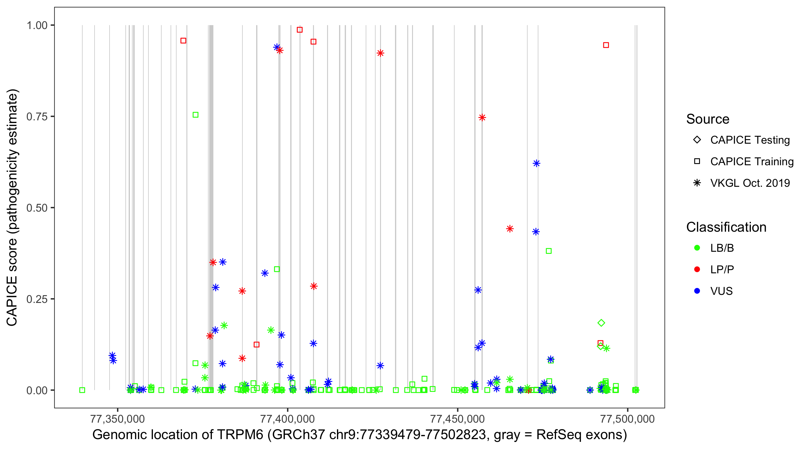 Shown are CAPICE train/test variants plus VKGL Oct 2019.