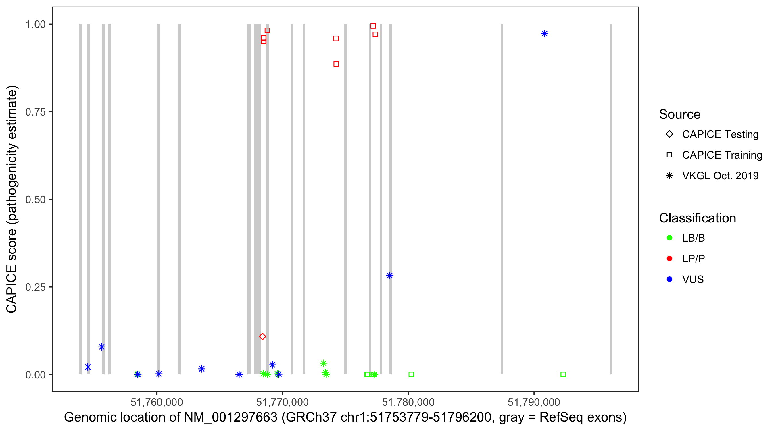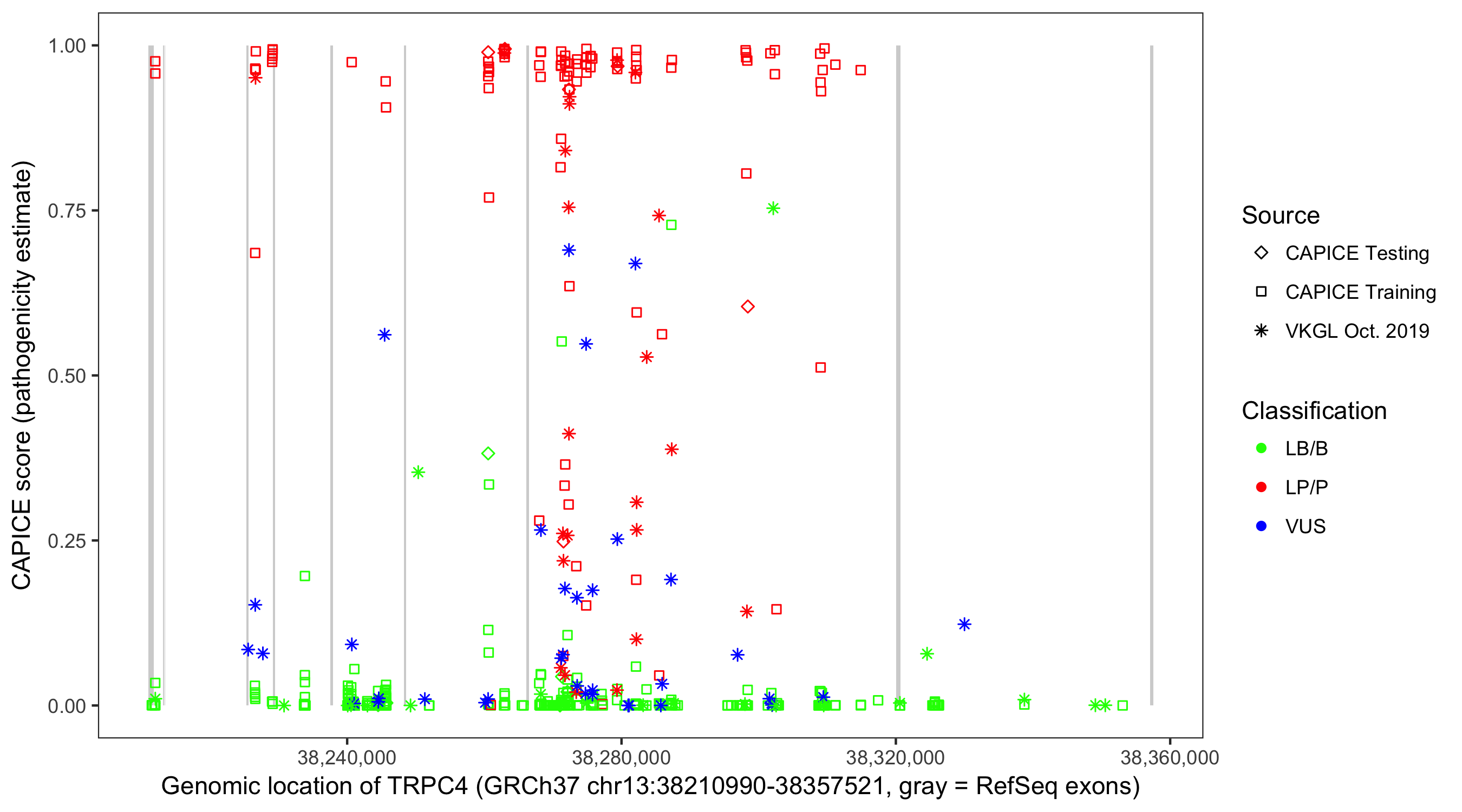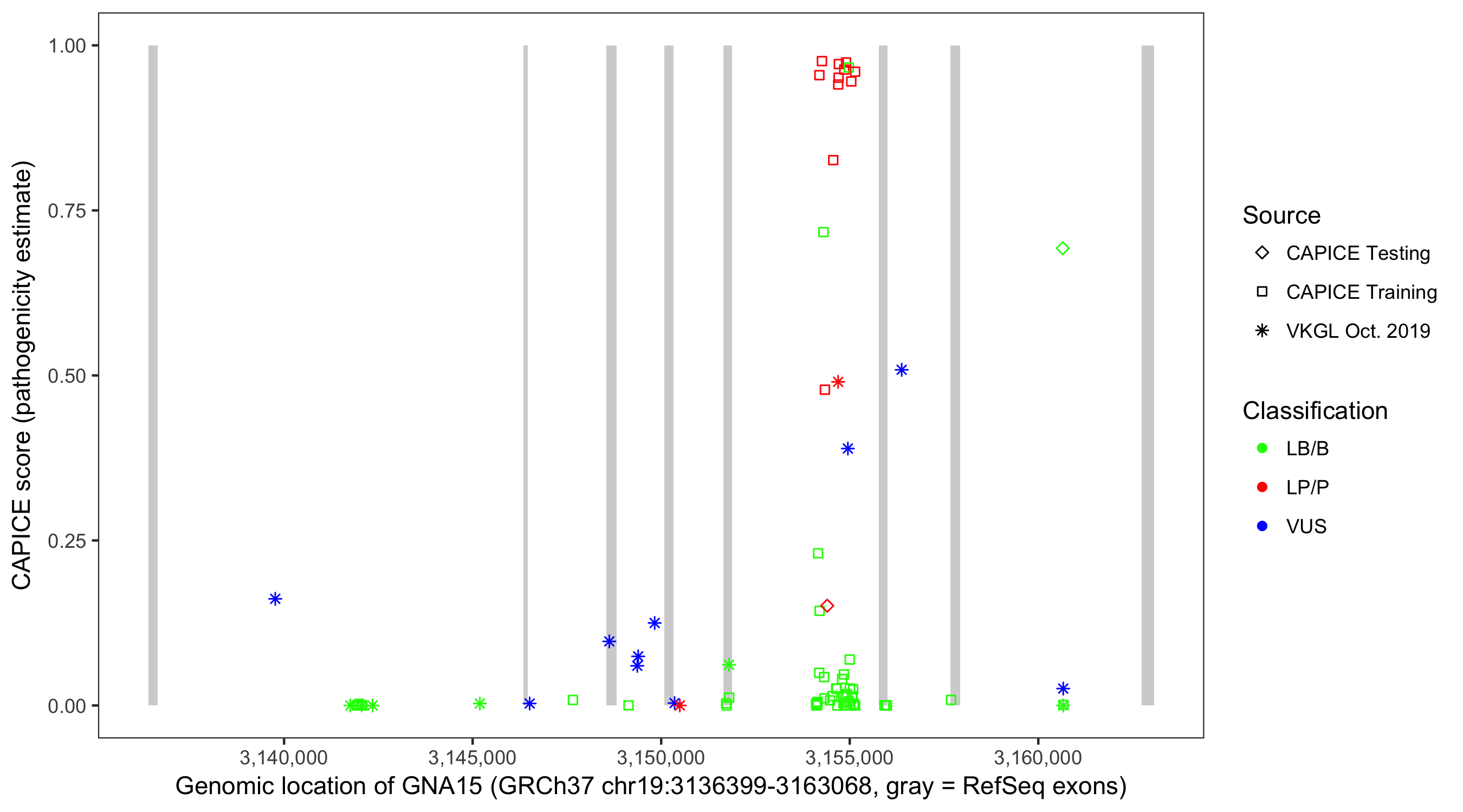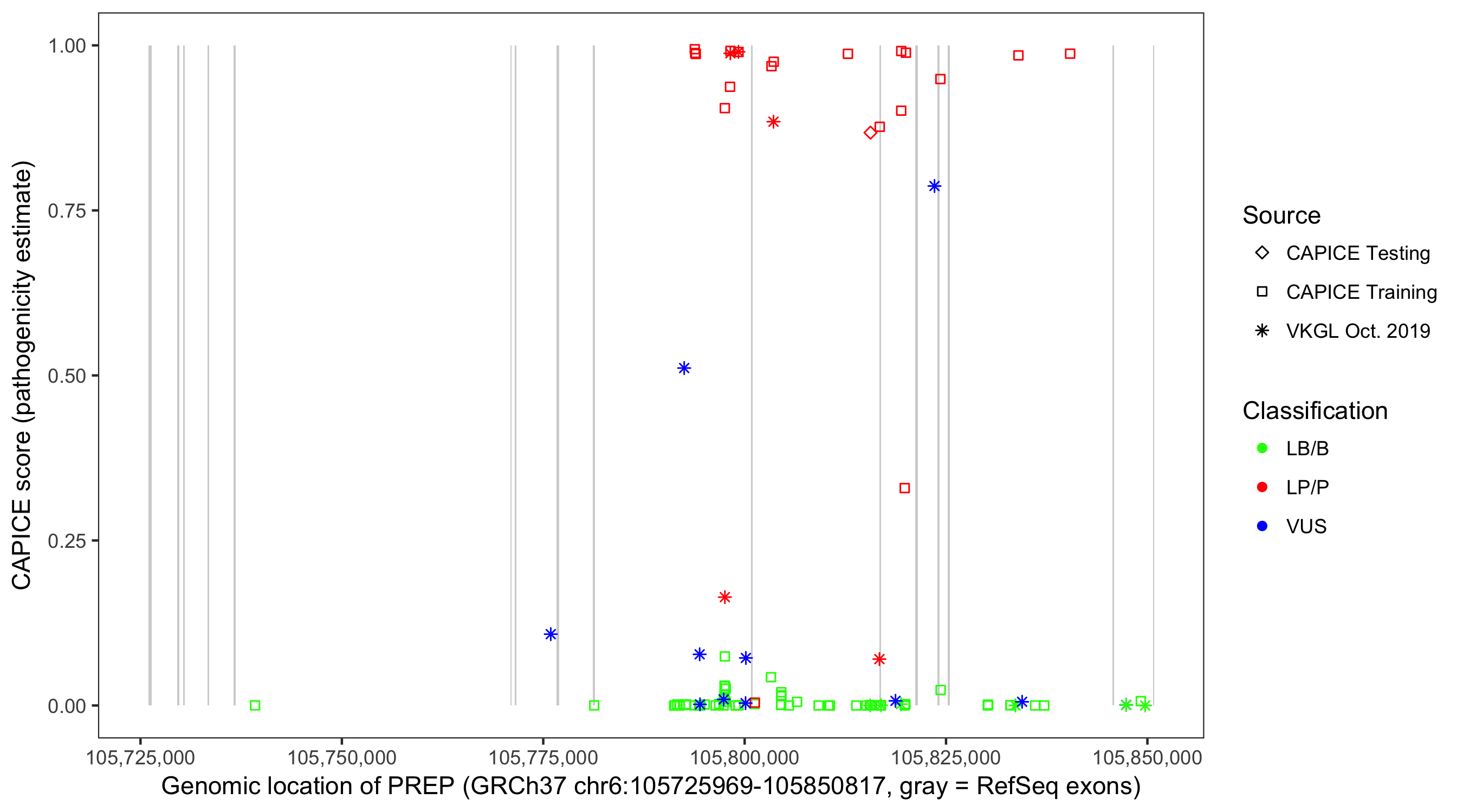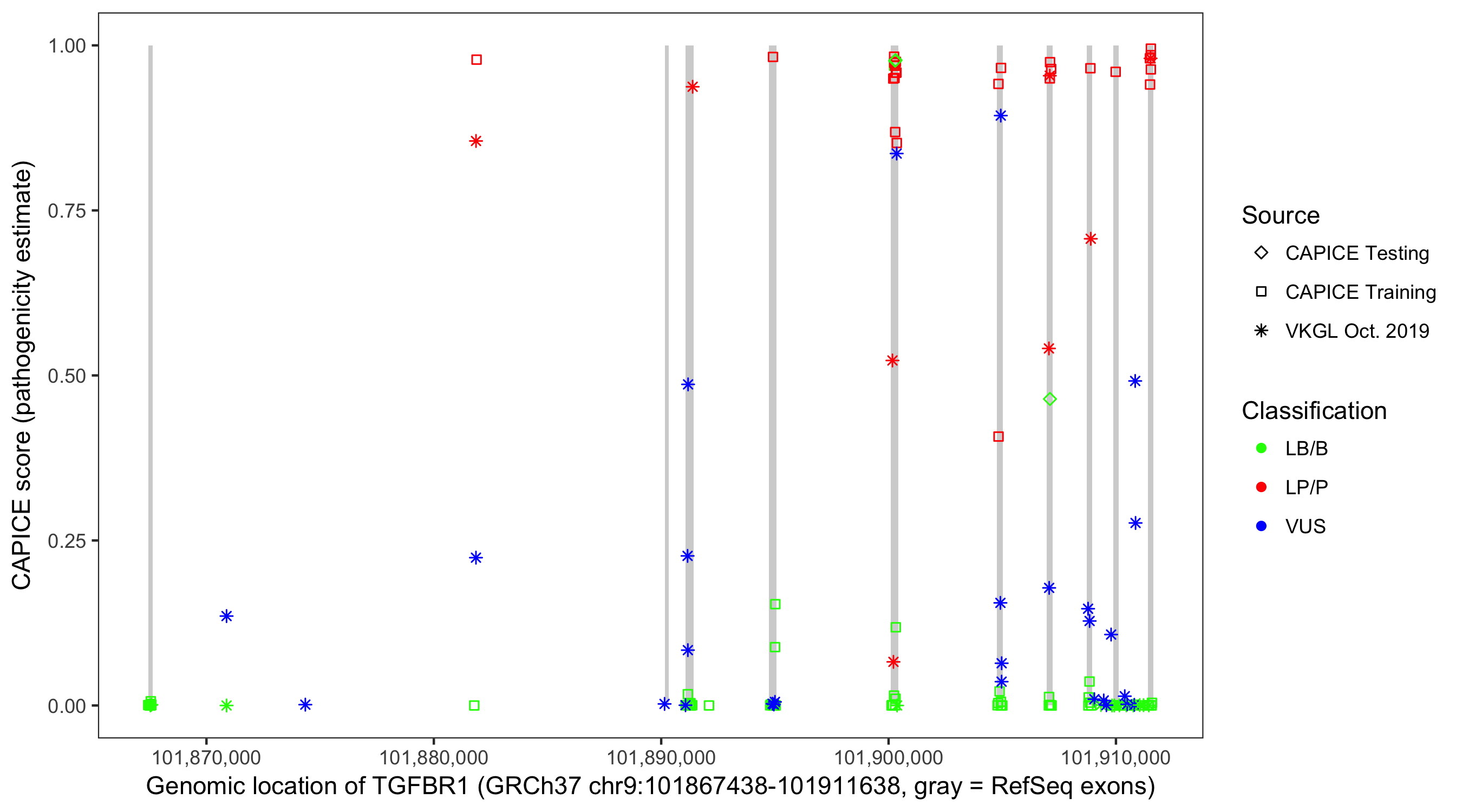Shown are CAPICE train/test variants plus VKGL Oct 2019.