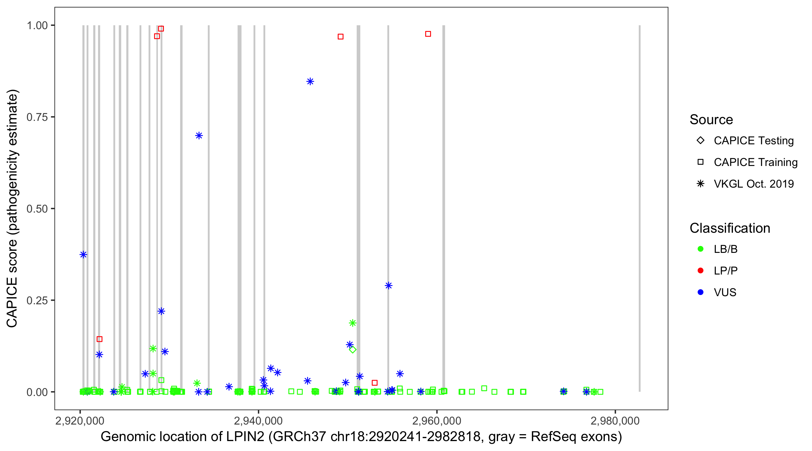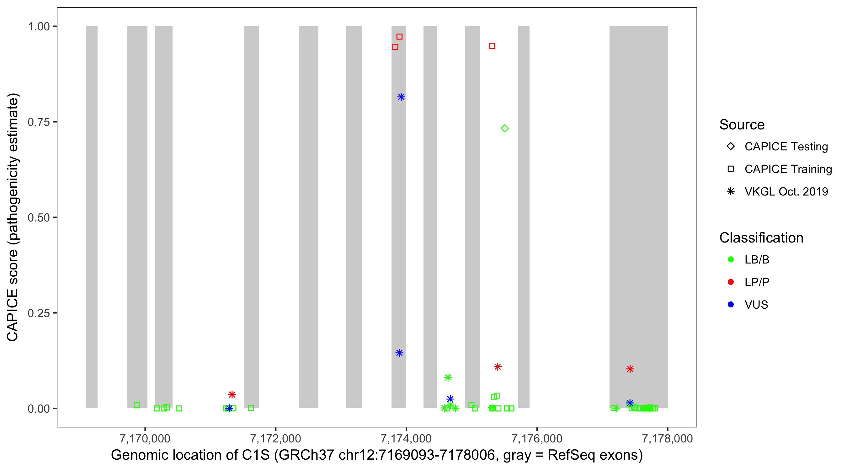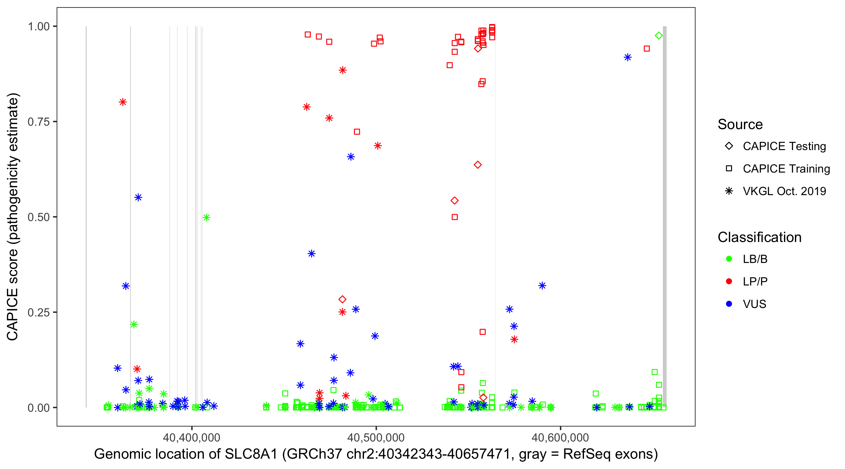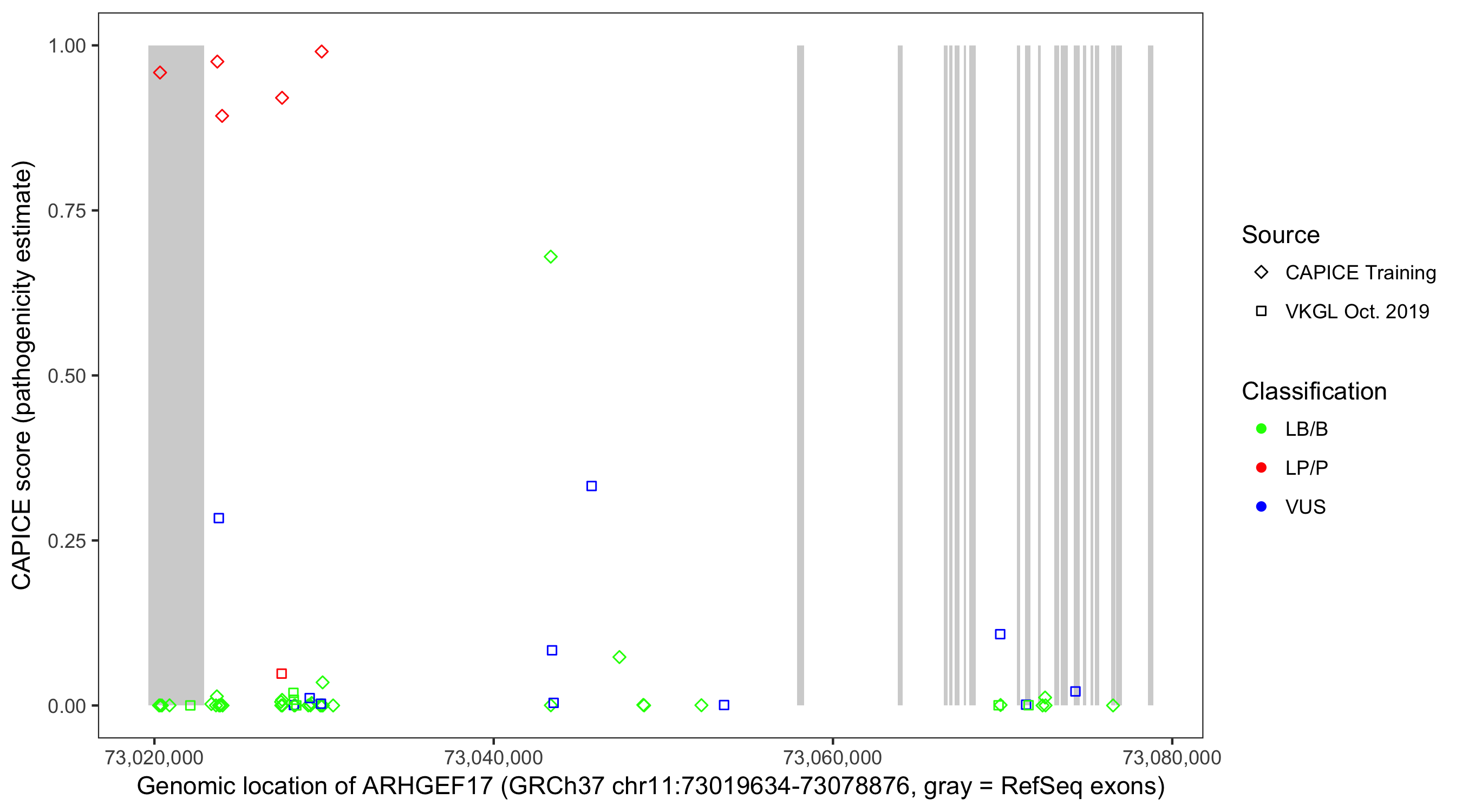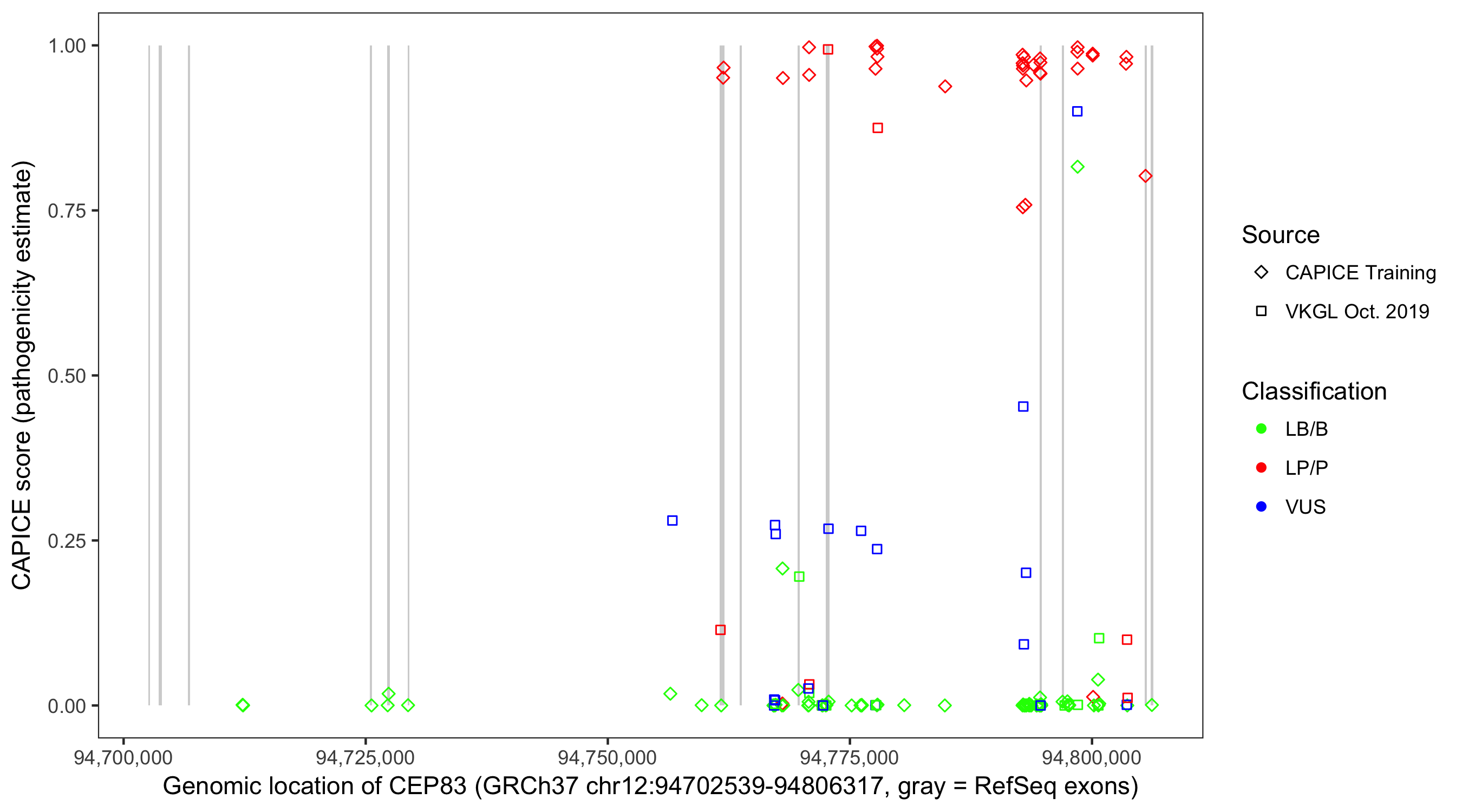 Shown are CAPICE train/test variants plus VKGL Oct 2019.