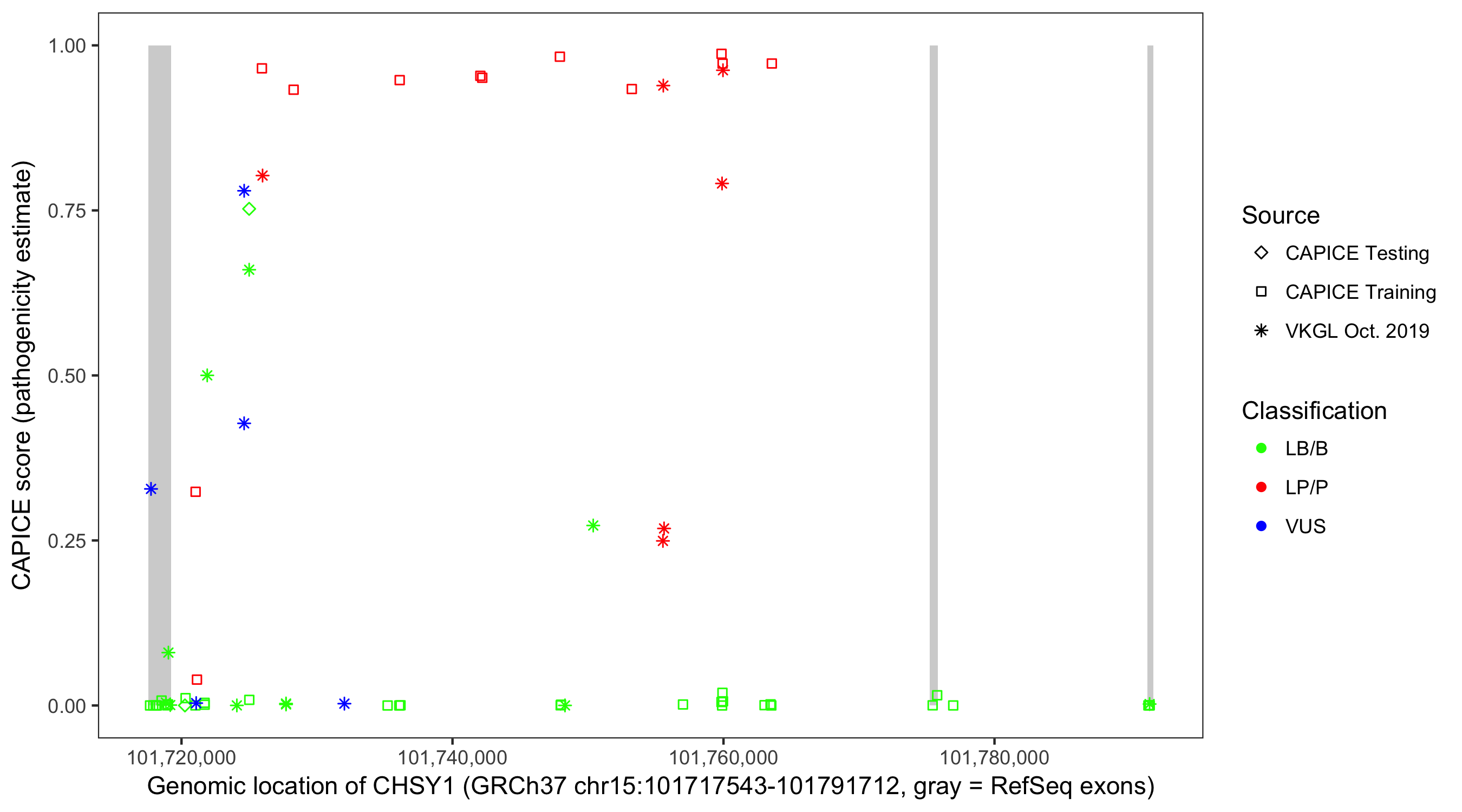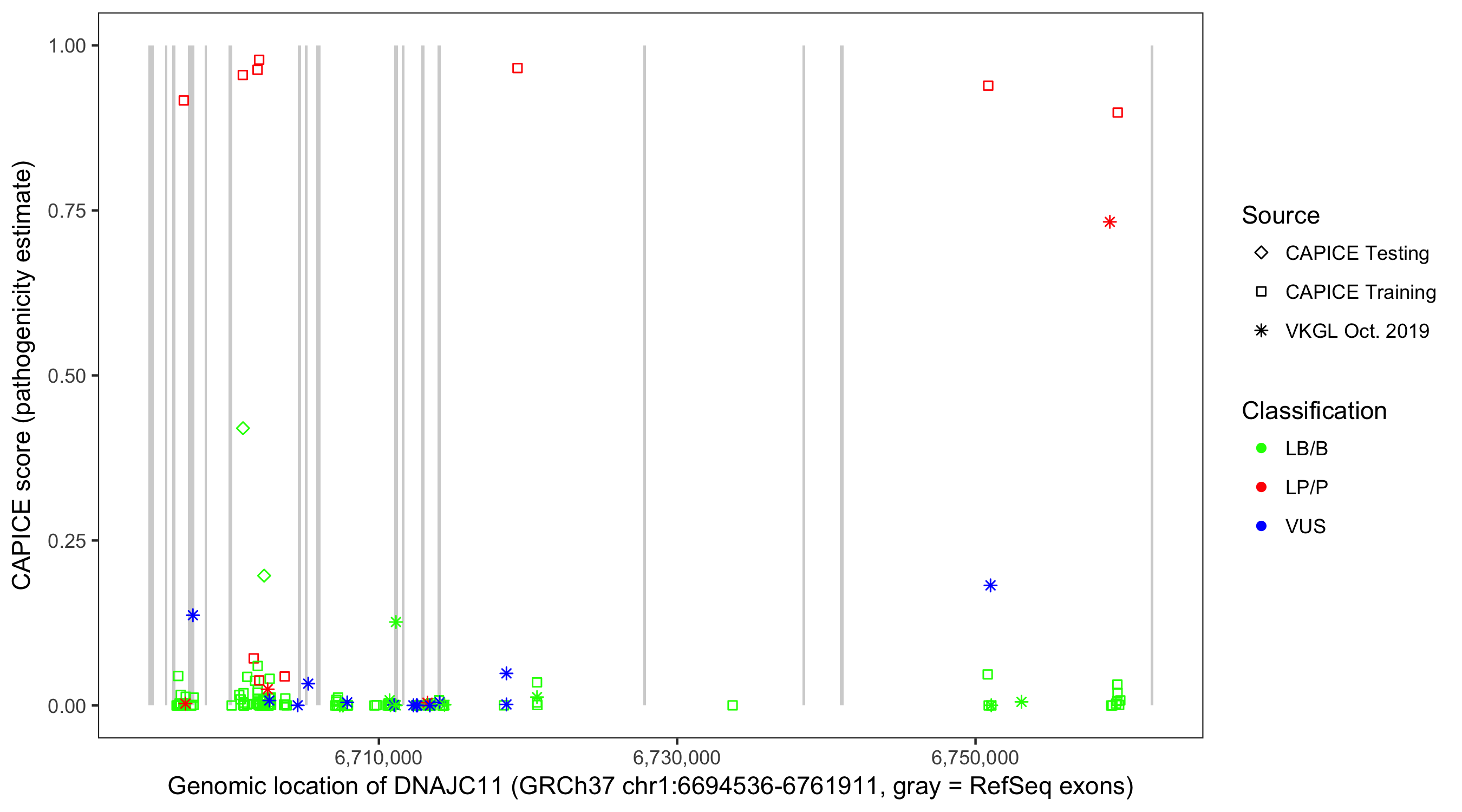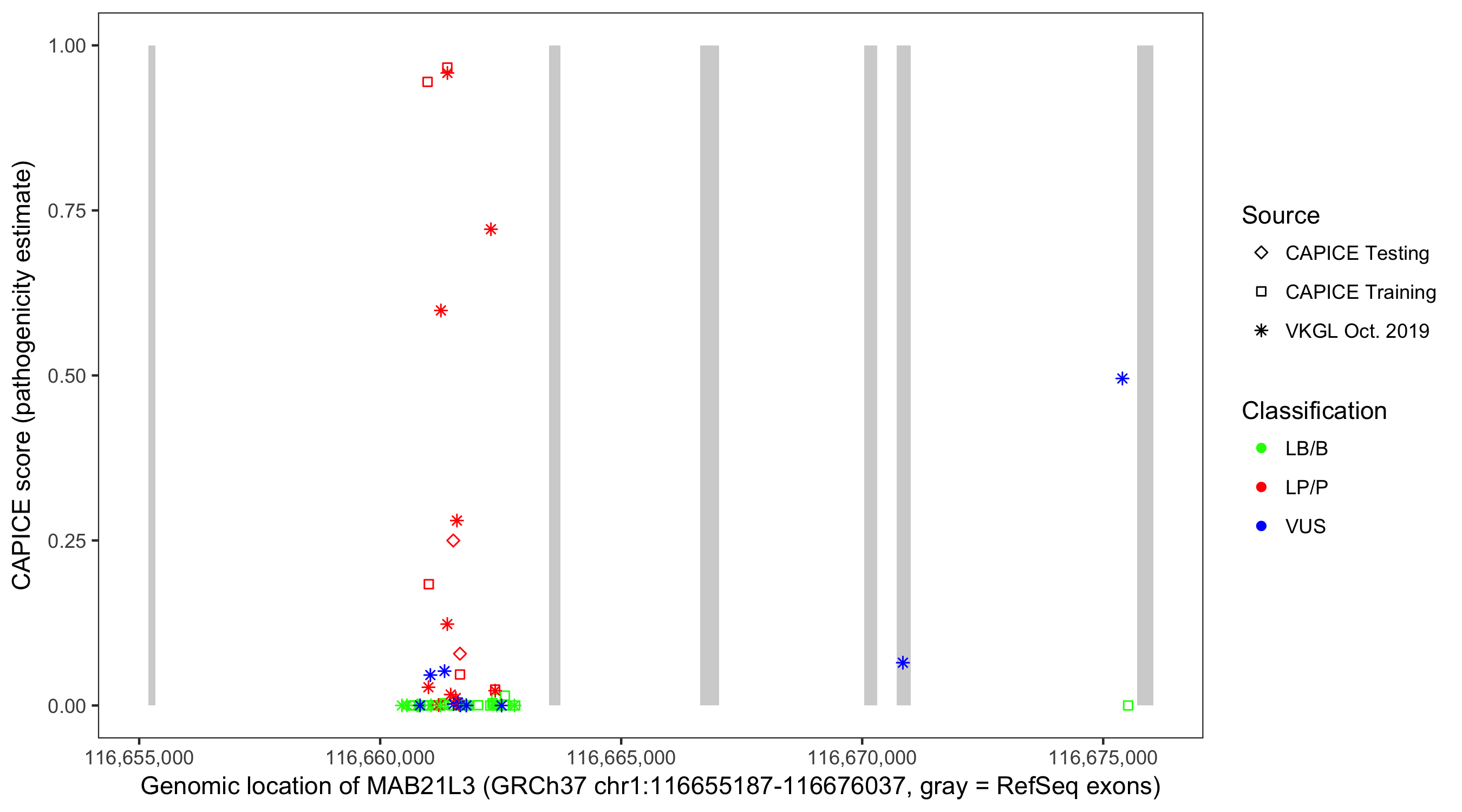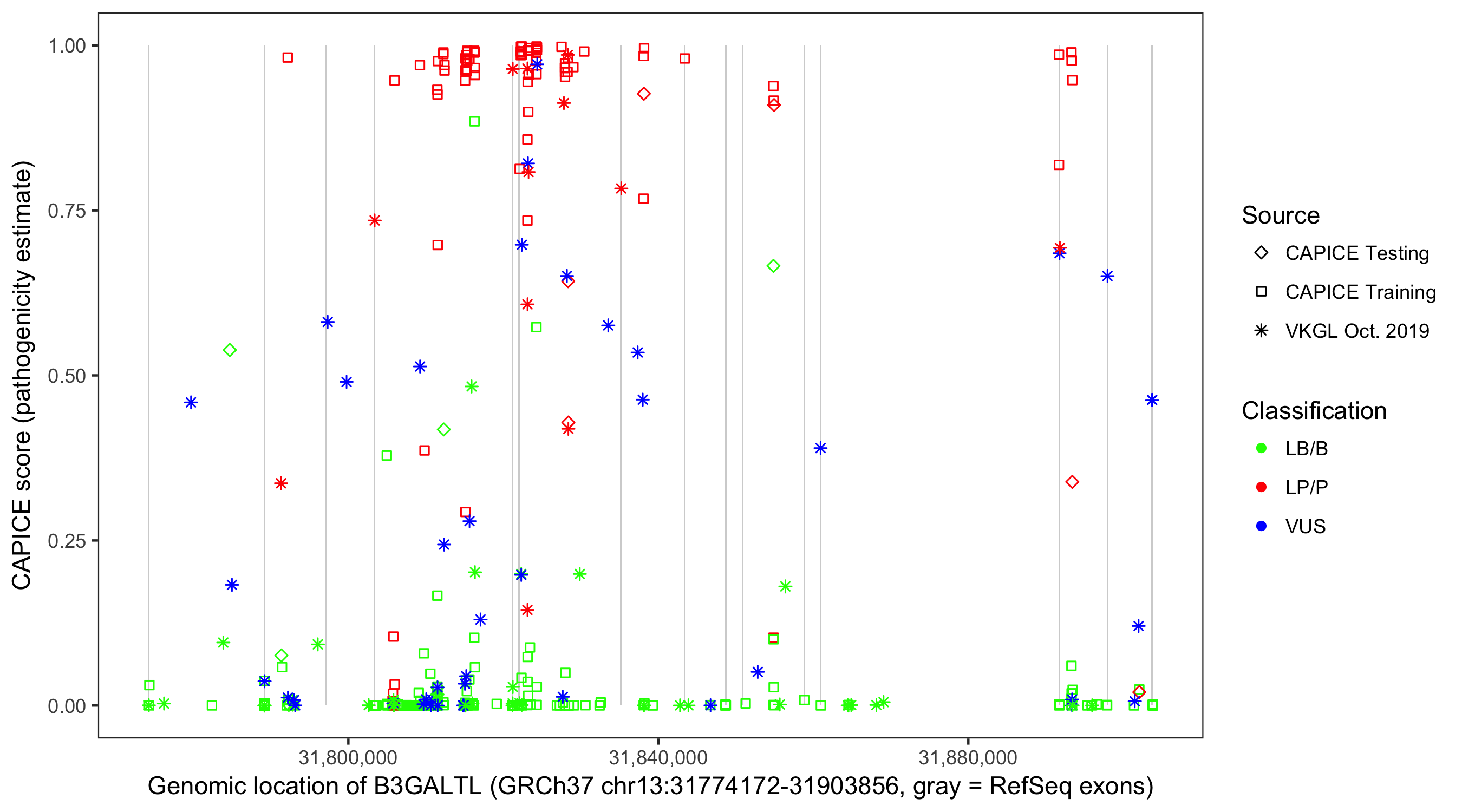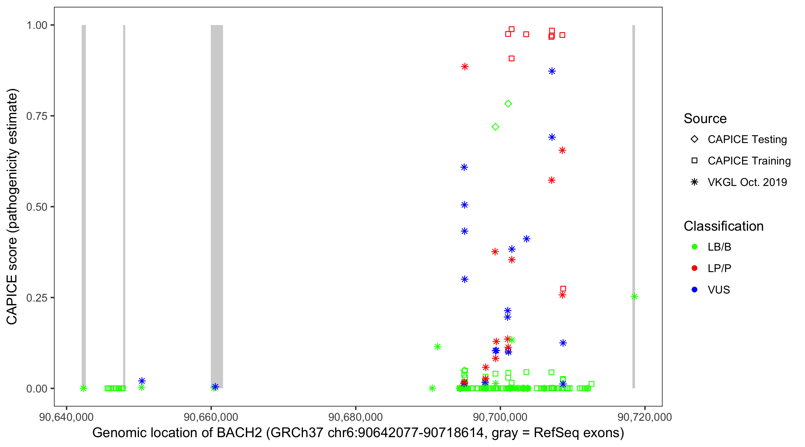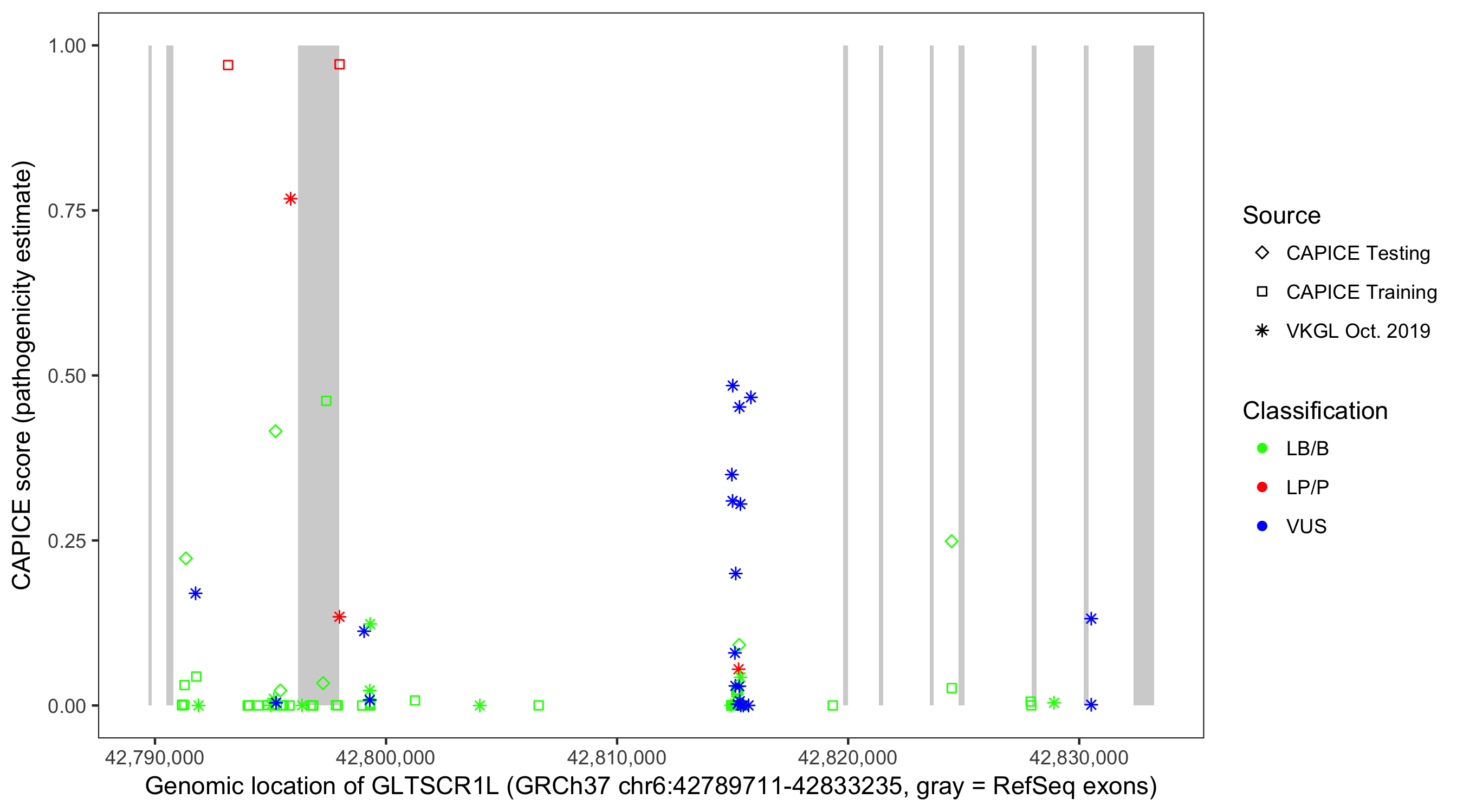 Shown are CAPICE train/test variants plus VKGL Oct 2019.