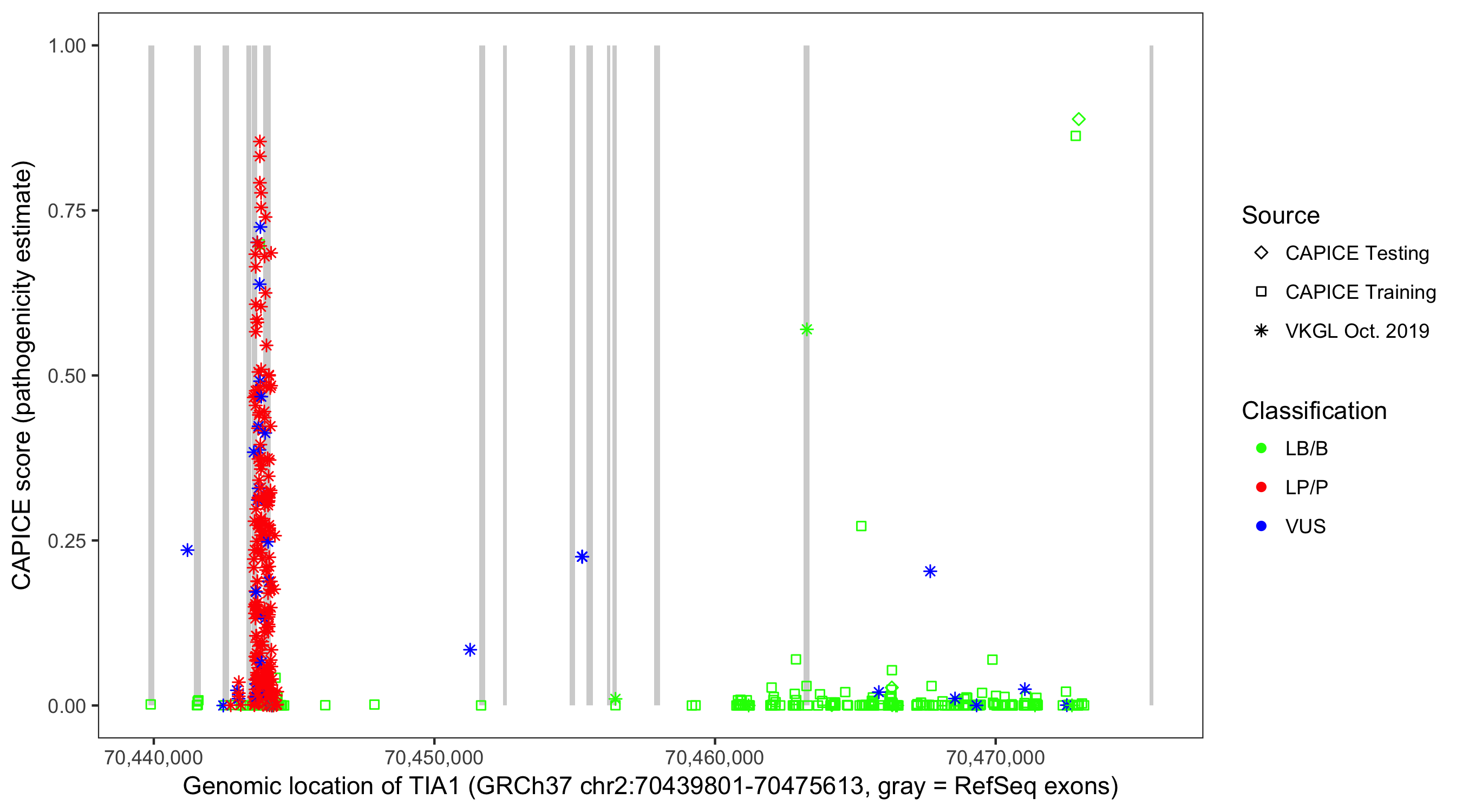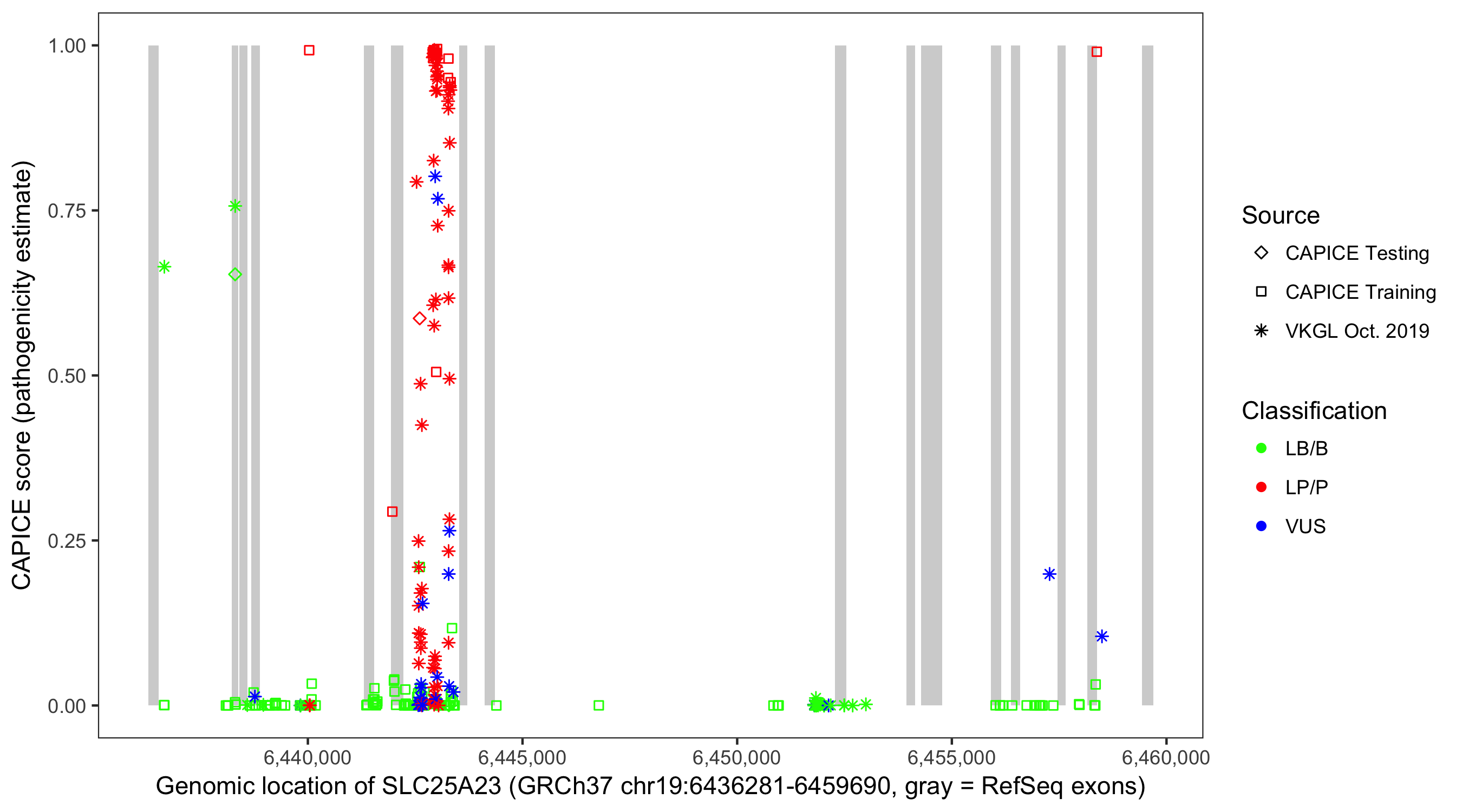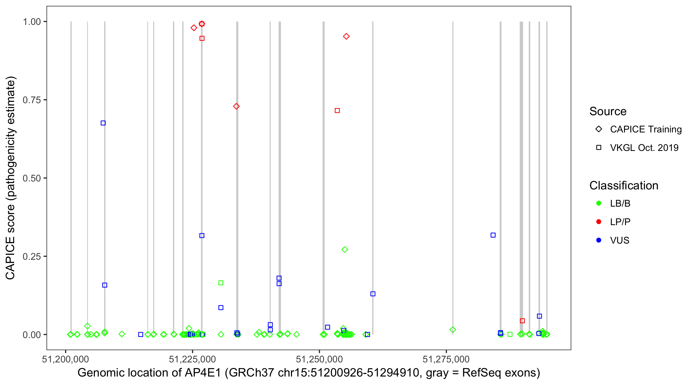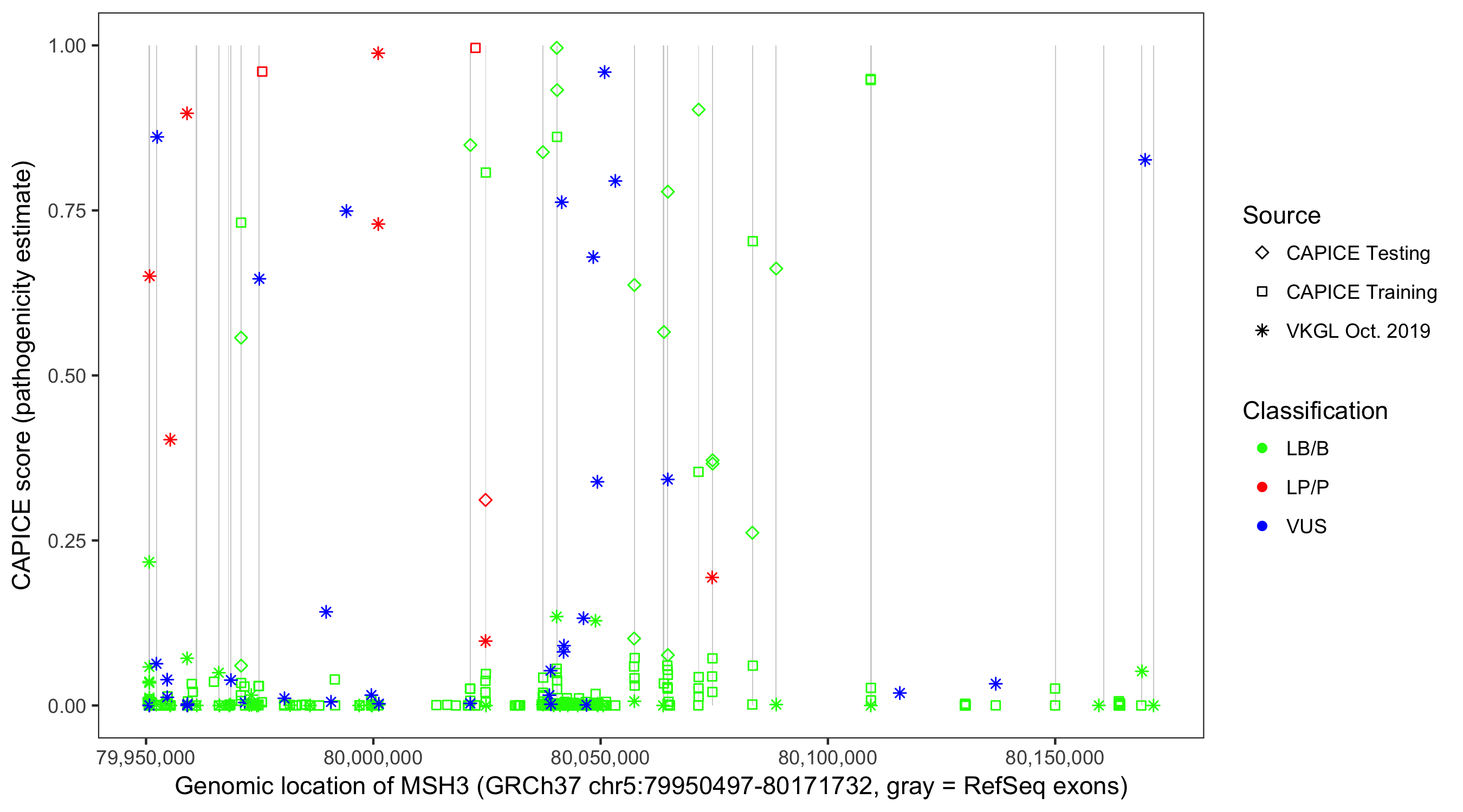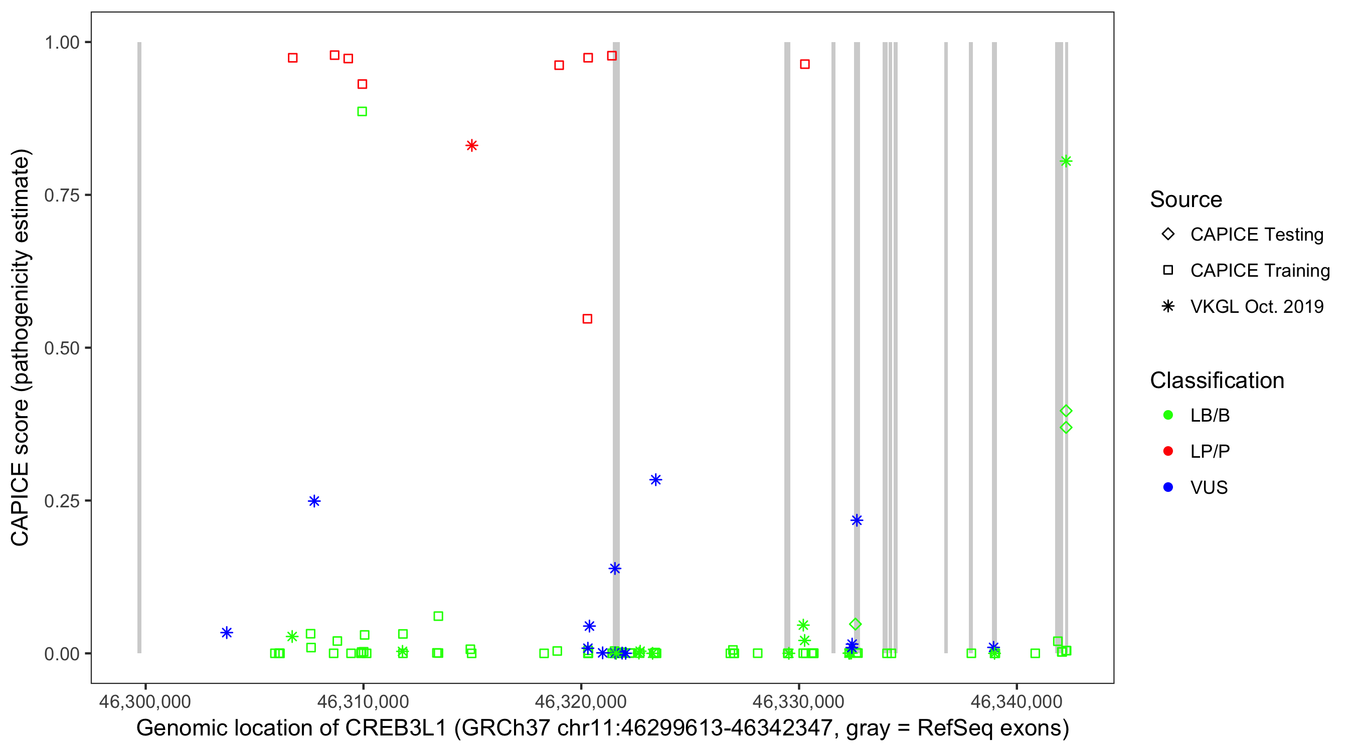 Shown are CAPICE train/test variants plus VKGL Oct 2019.
