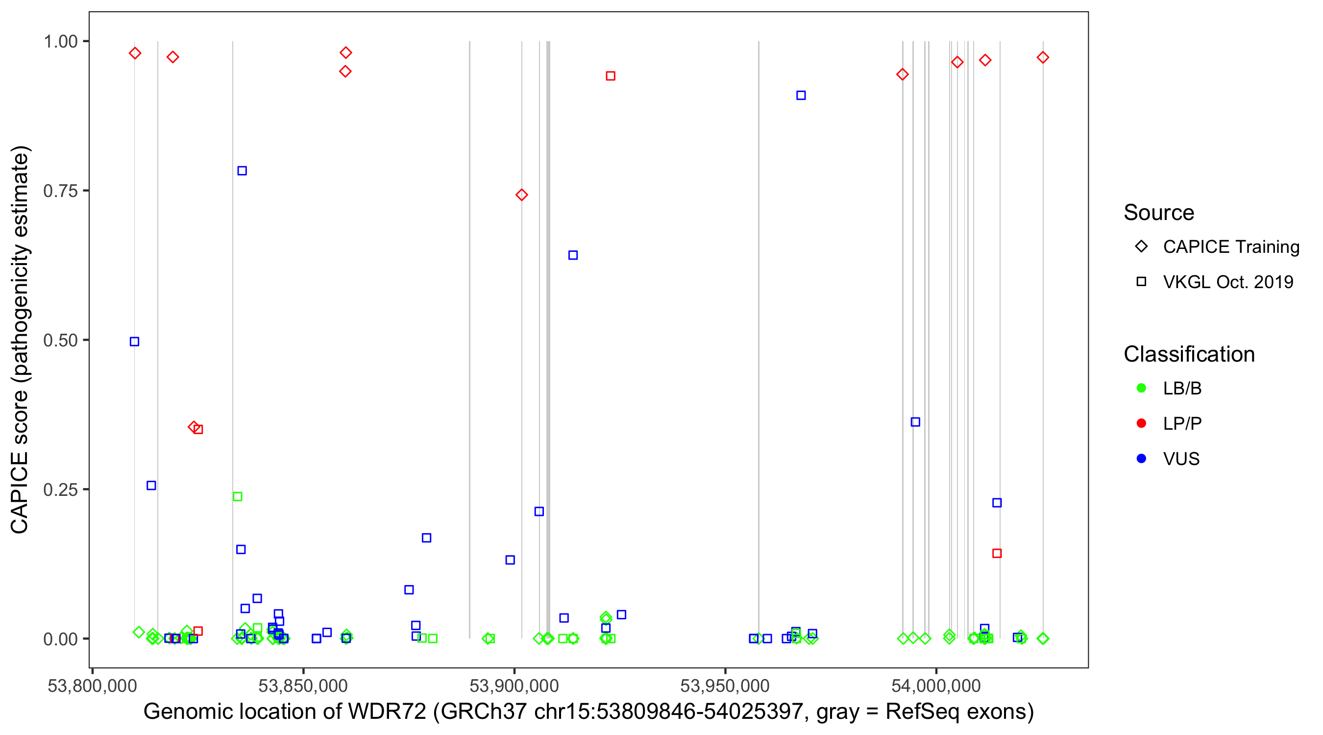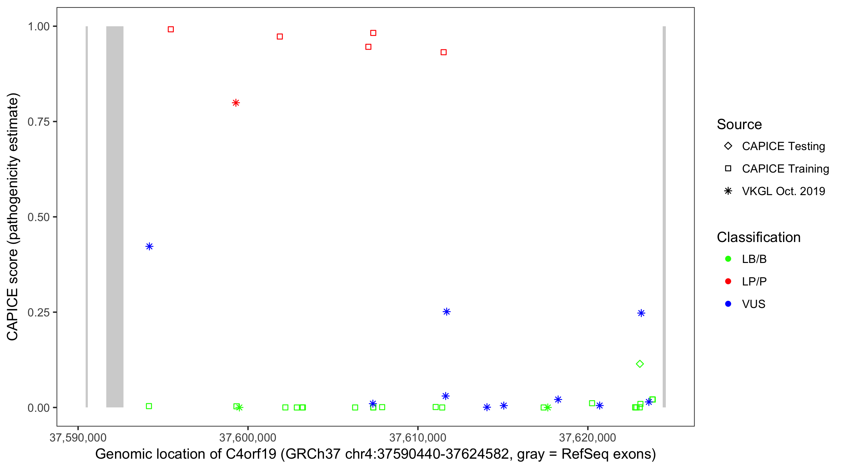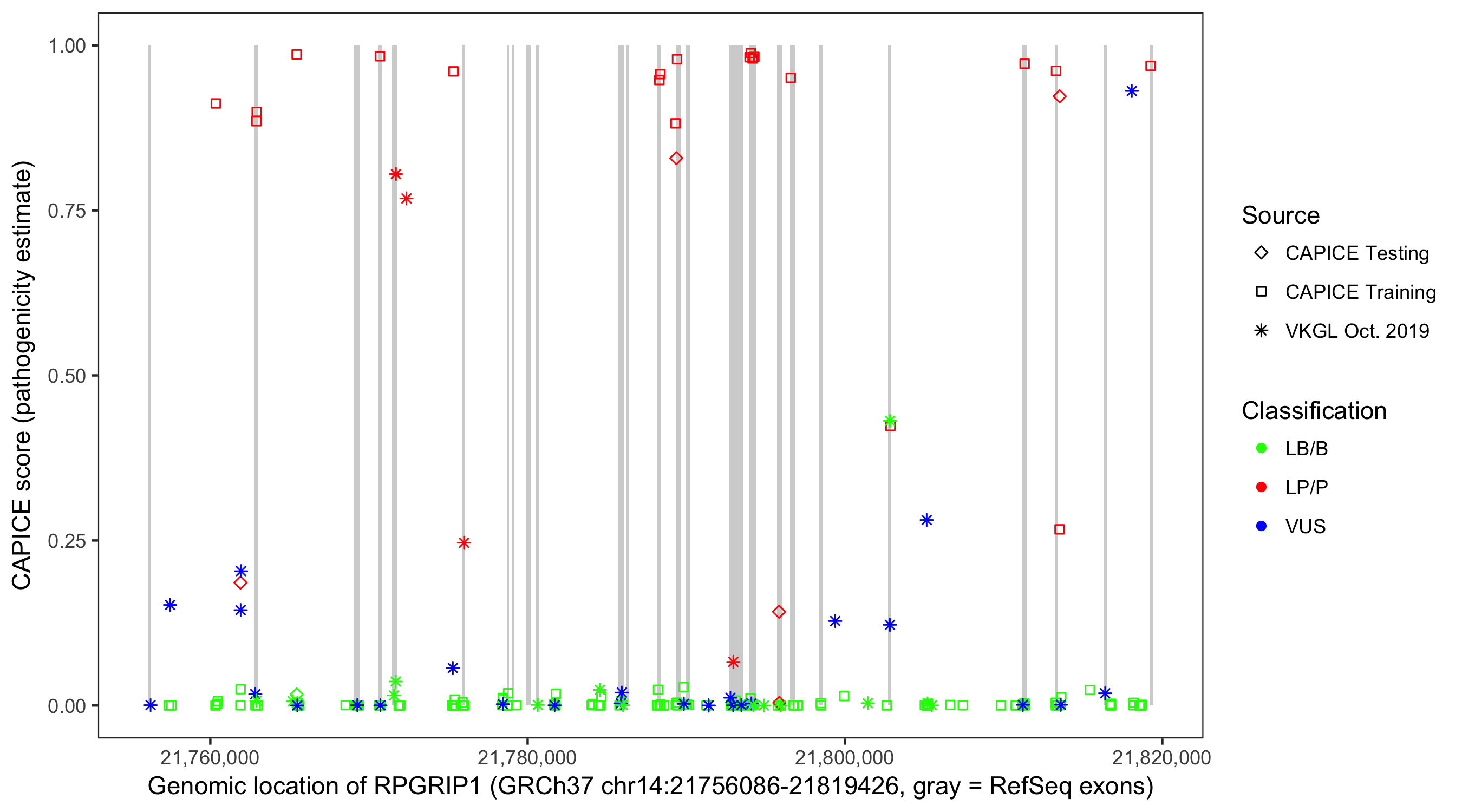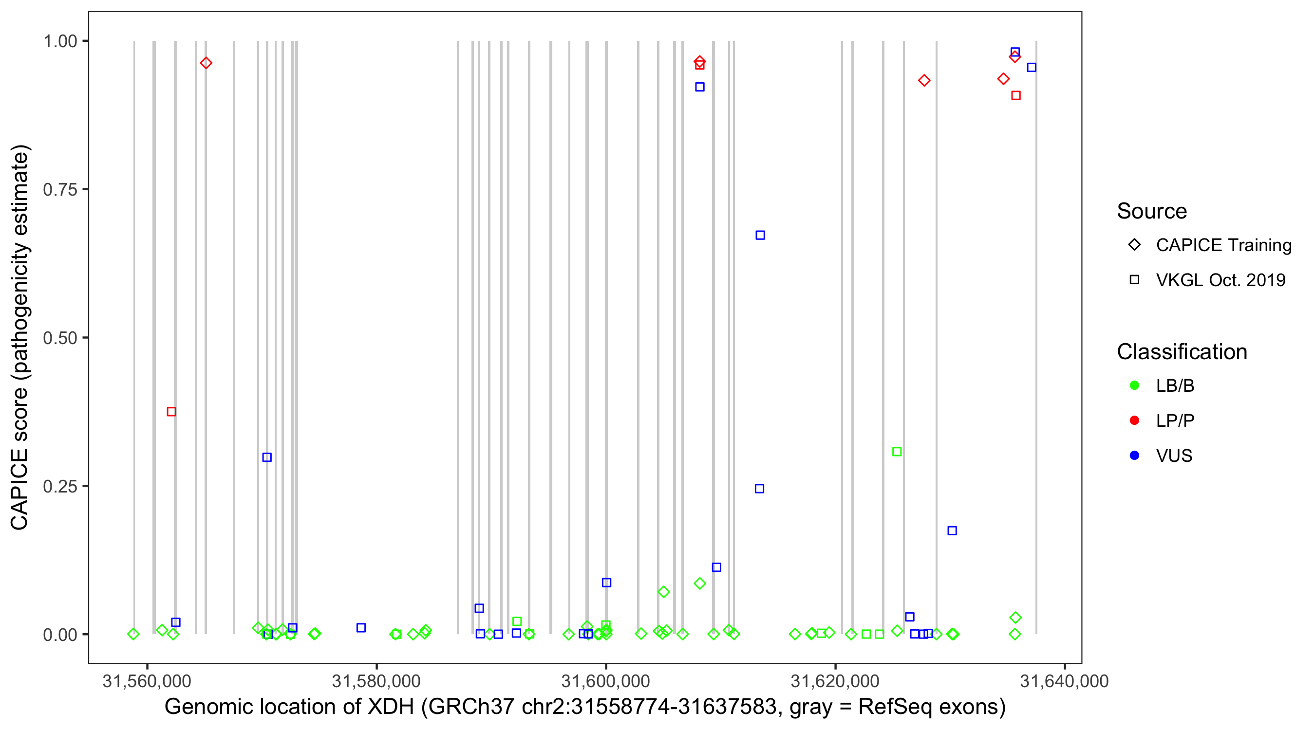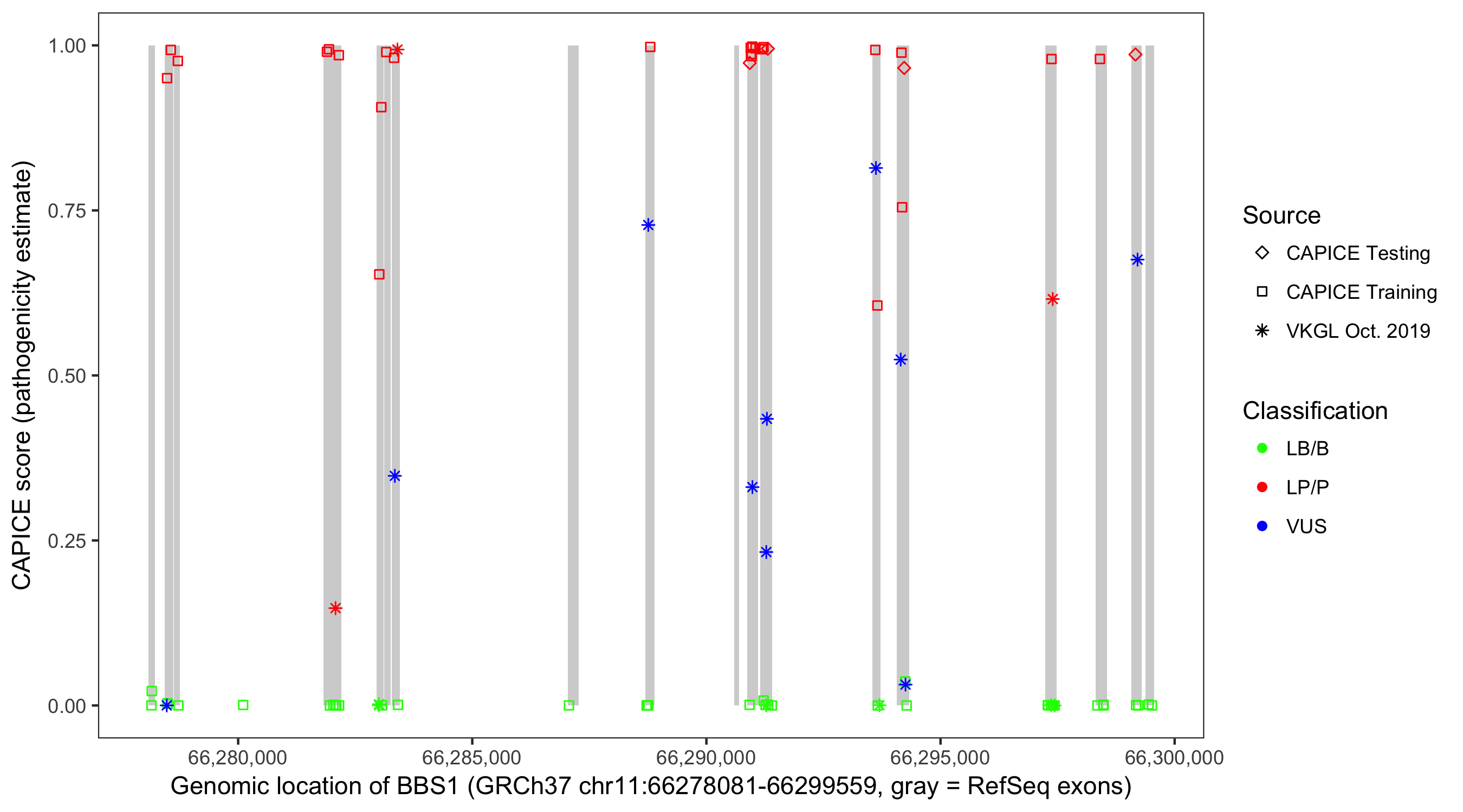 Shown are CAPICE train/test variants plus VKGL Oct 2019.