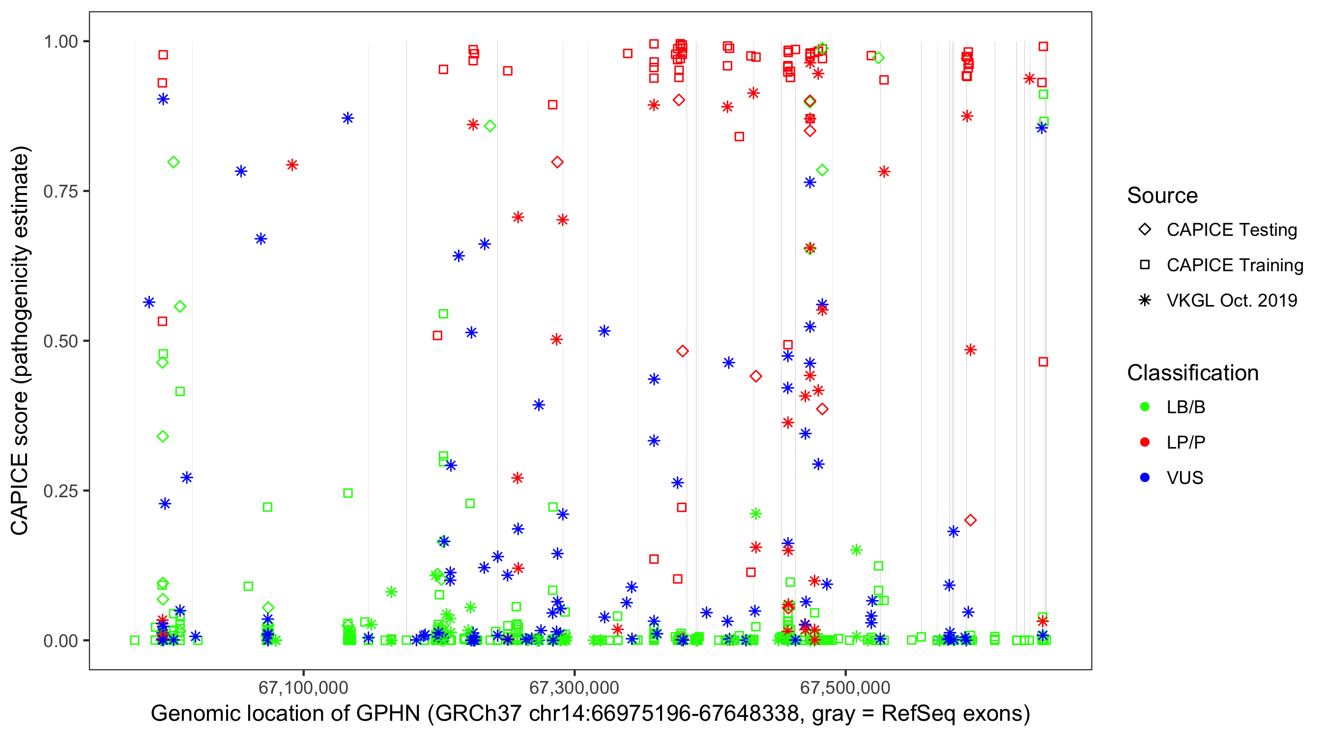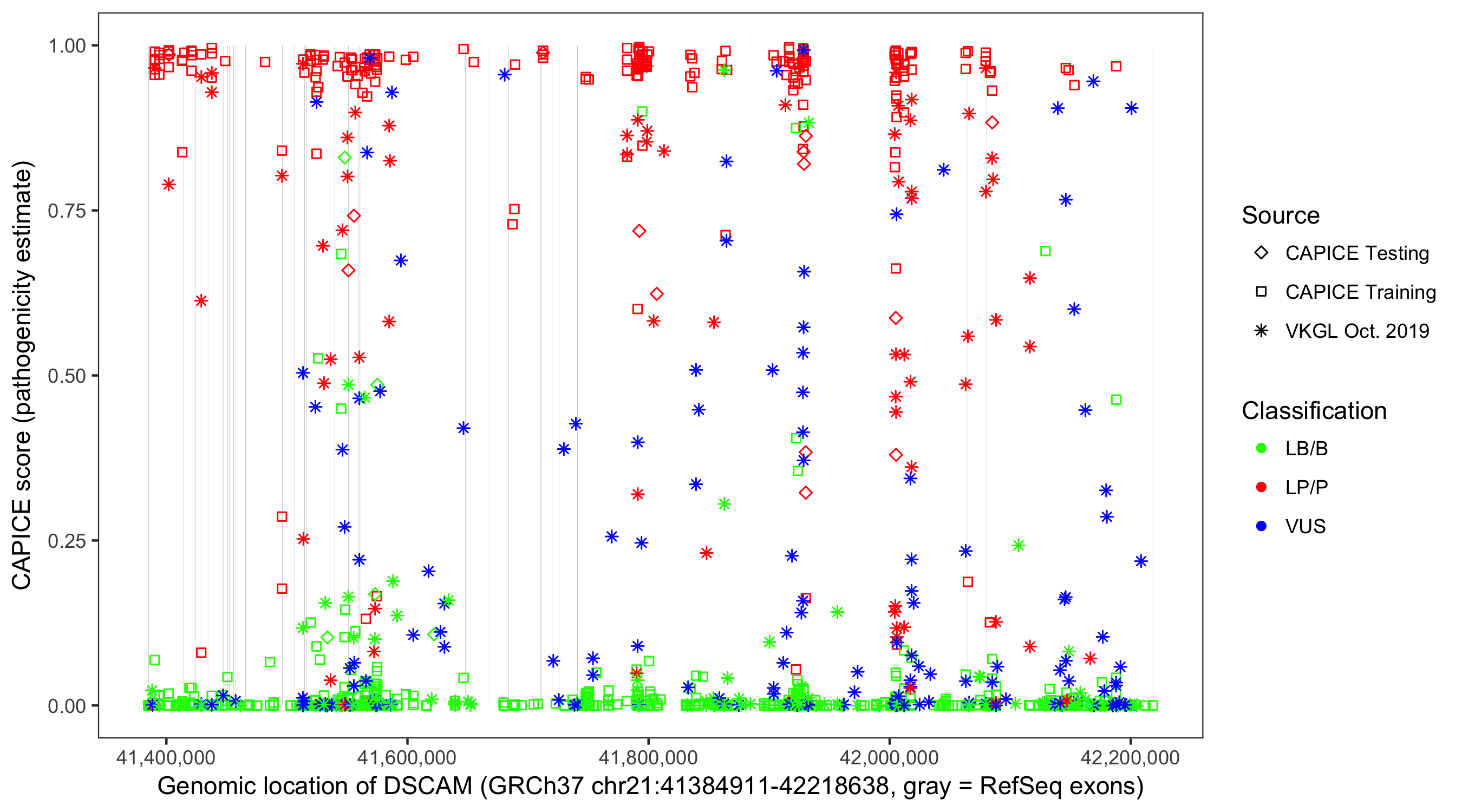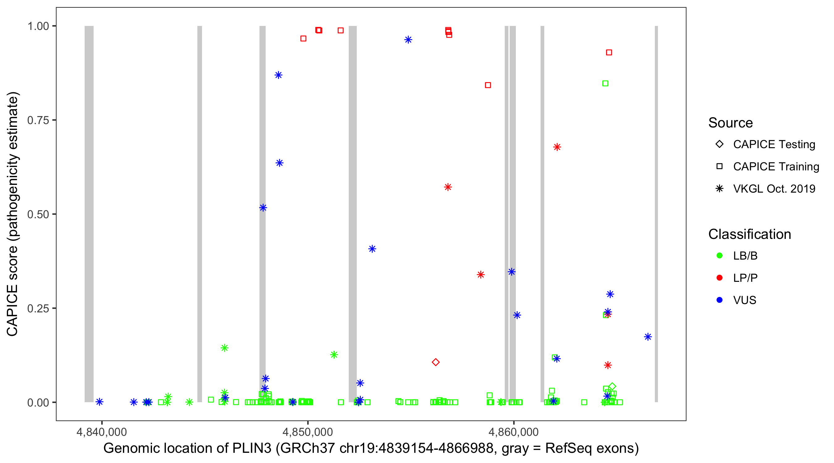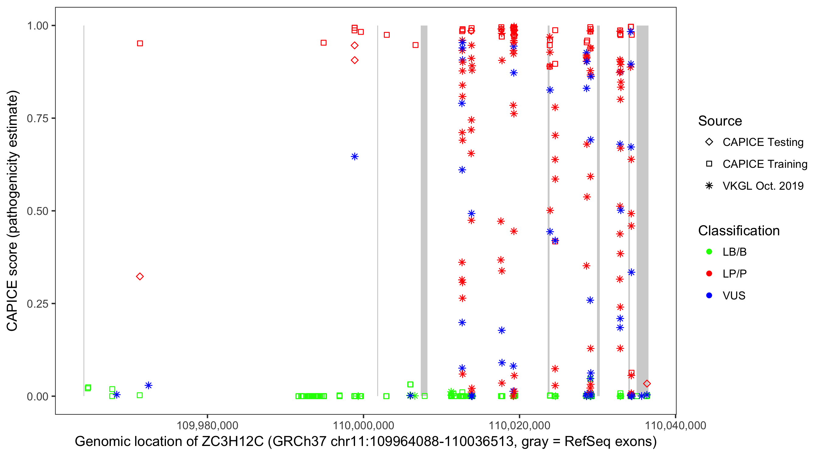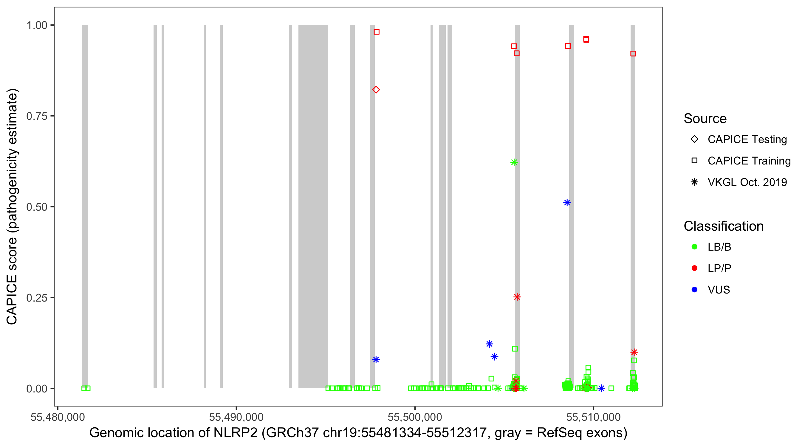 Shown are CAPICE train/test variants plus VKGL Oct 2019.