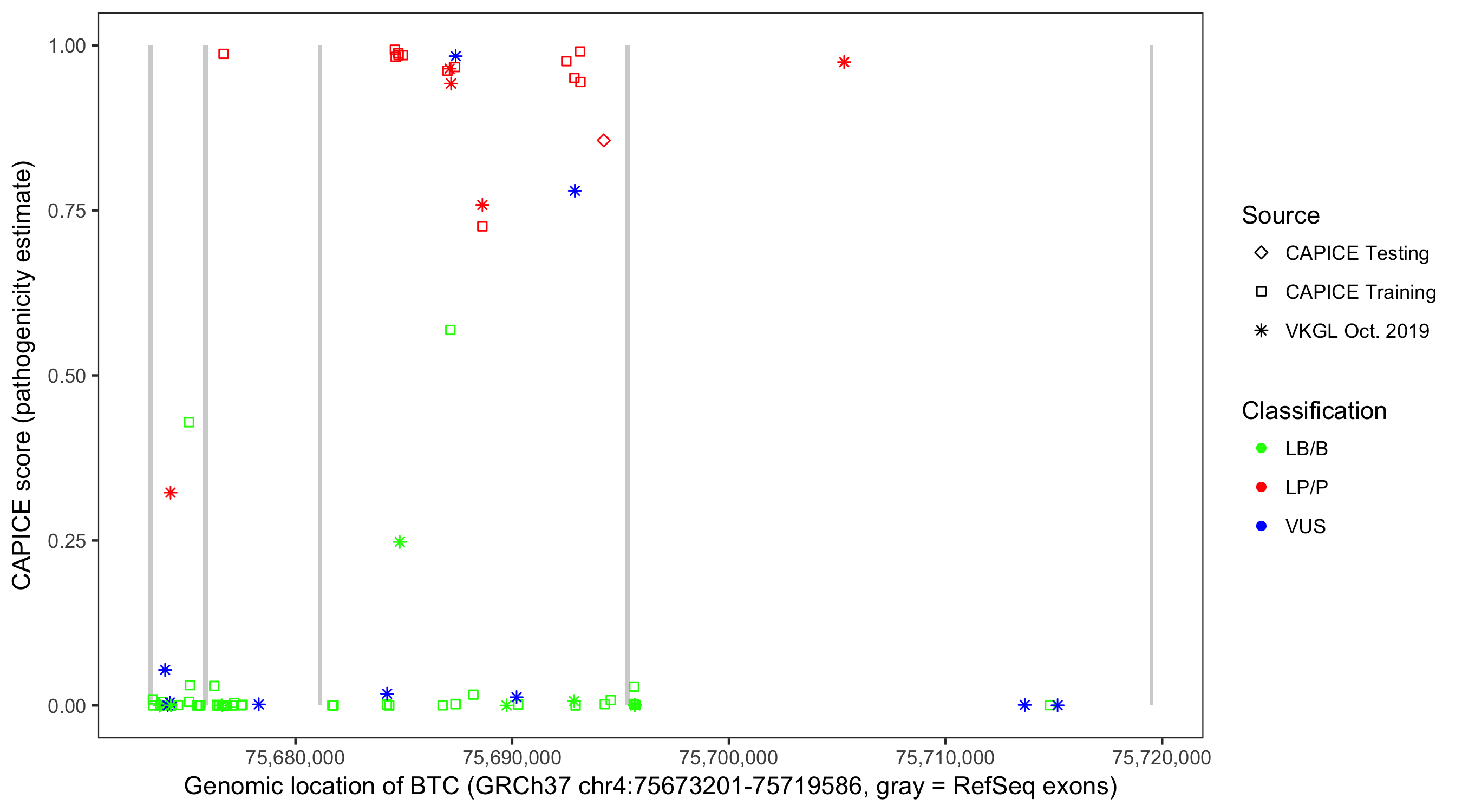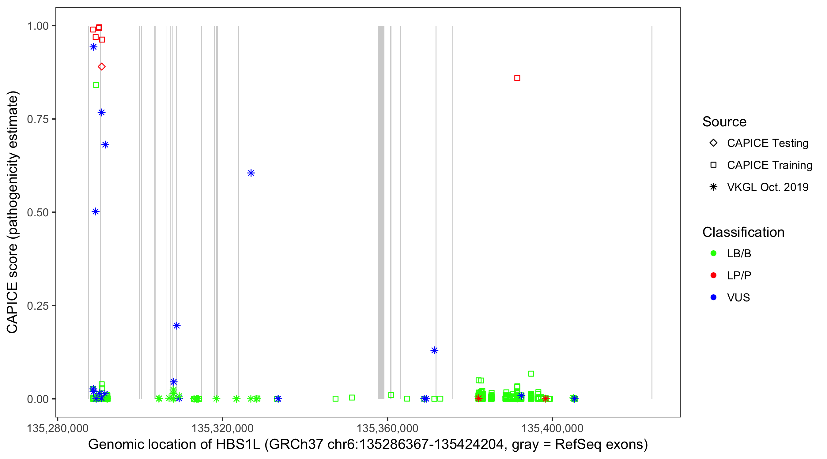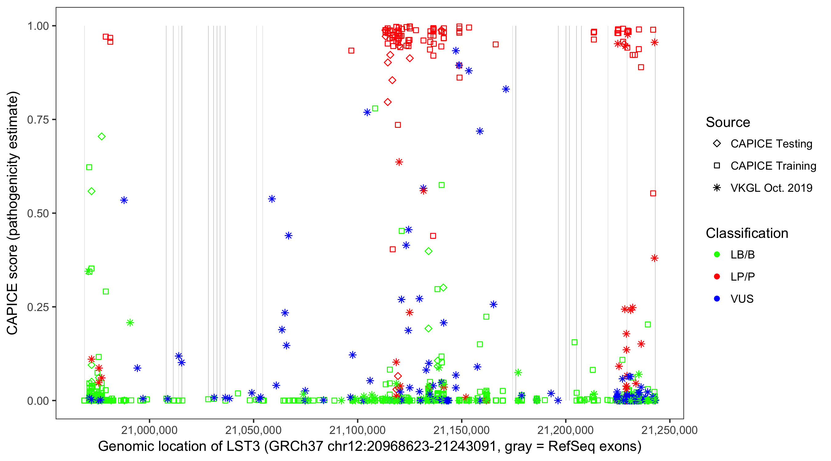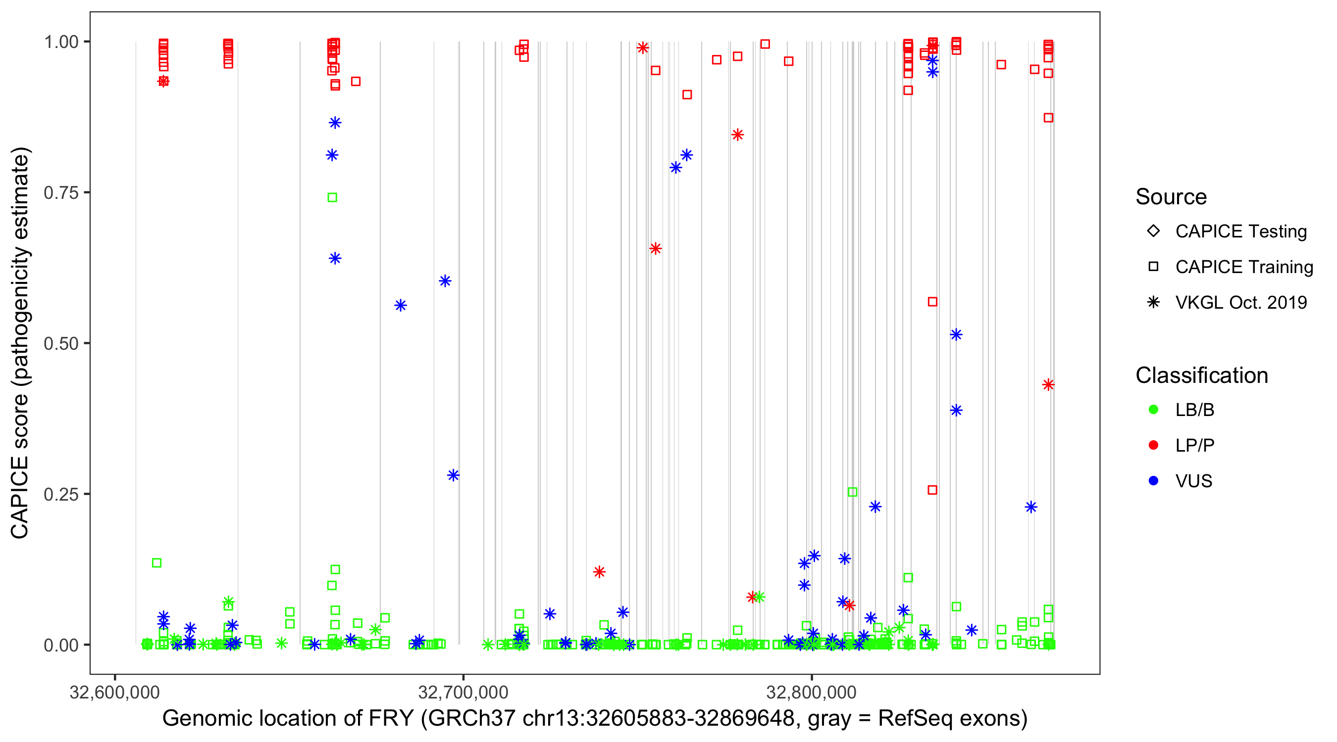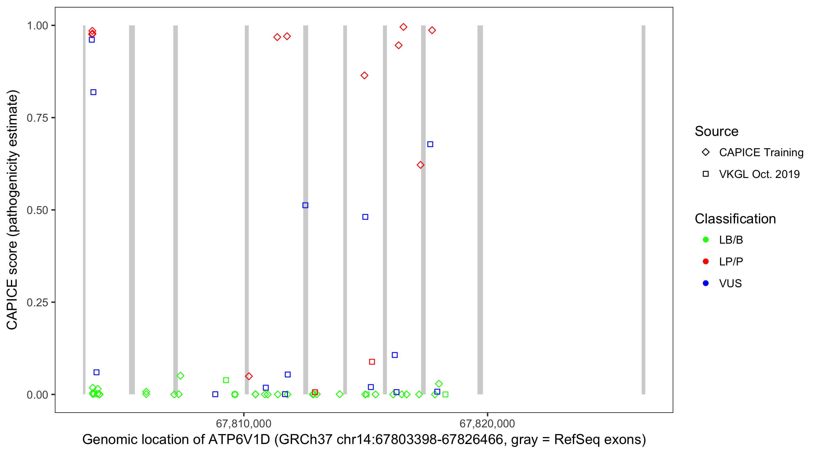 Shown are CAPICE train/test variants plus VKGL Oct 2019.