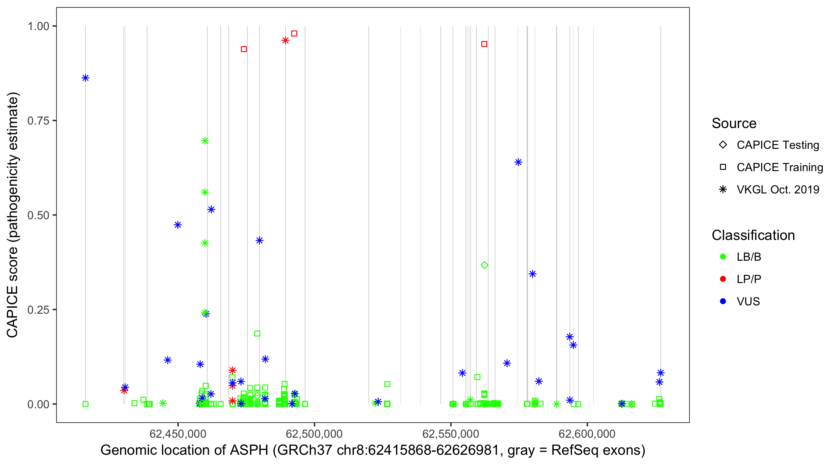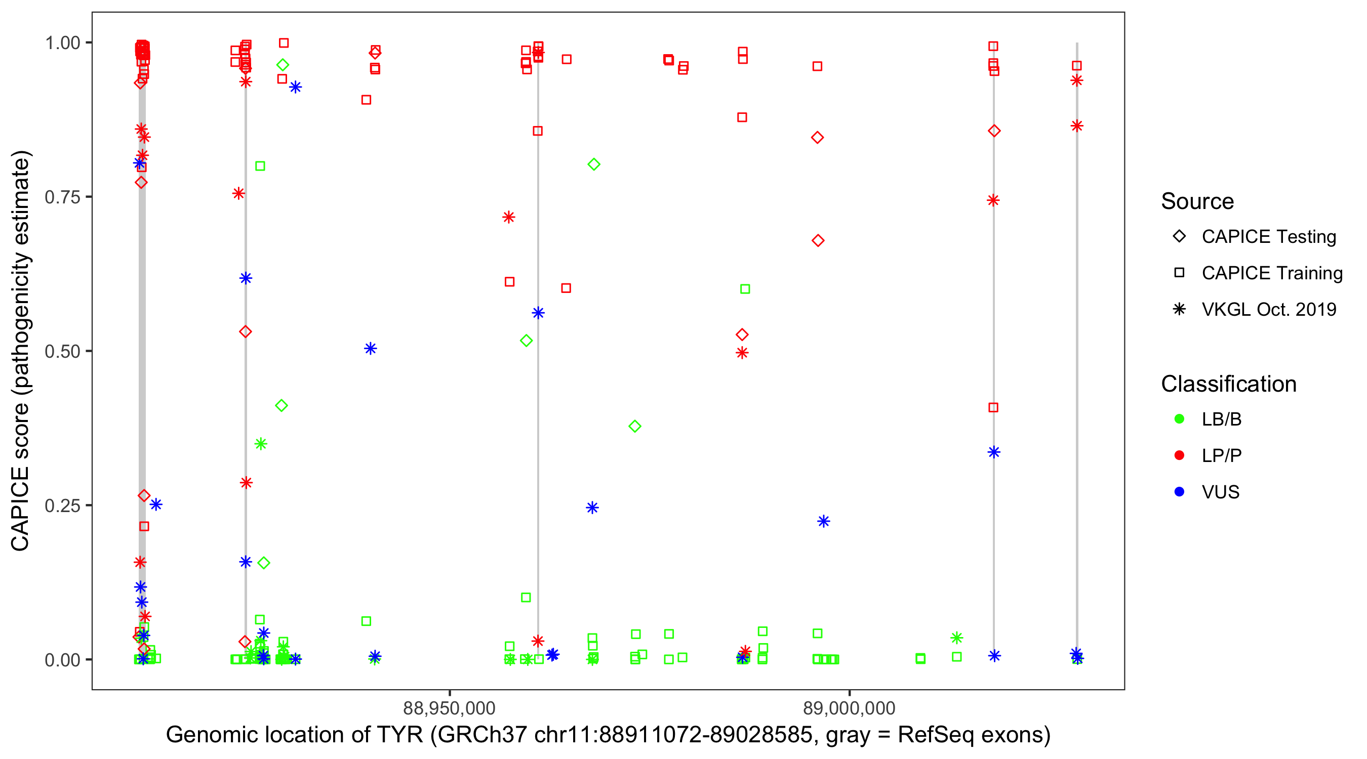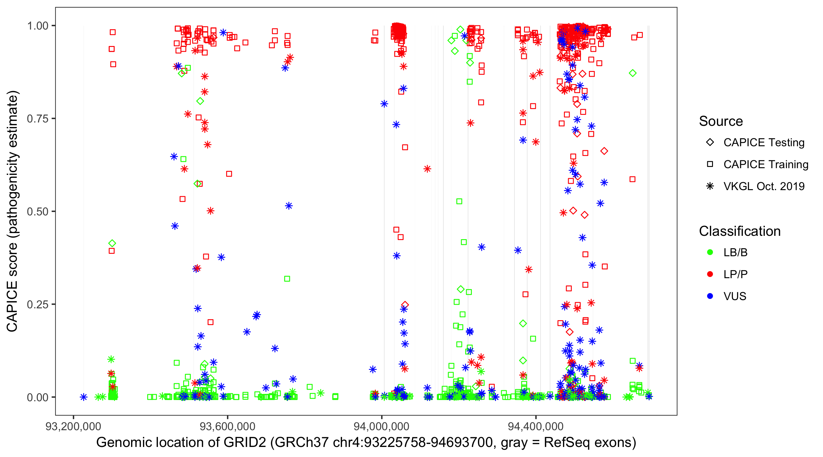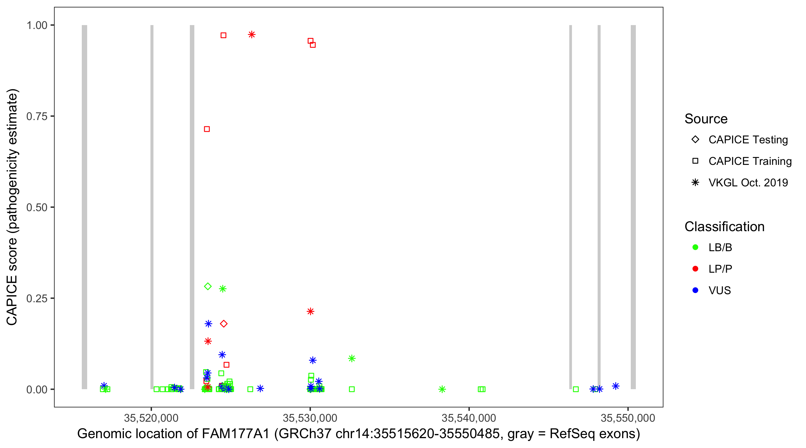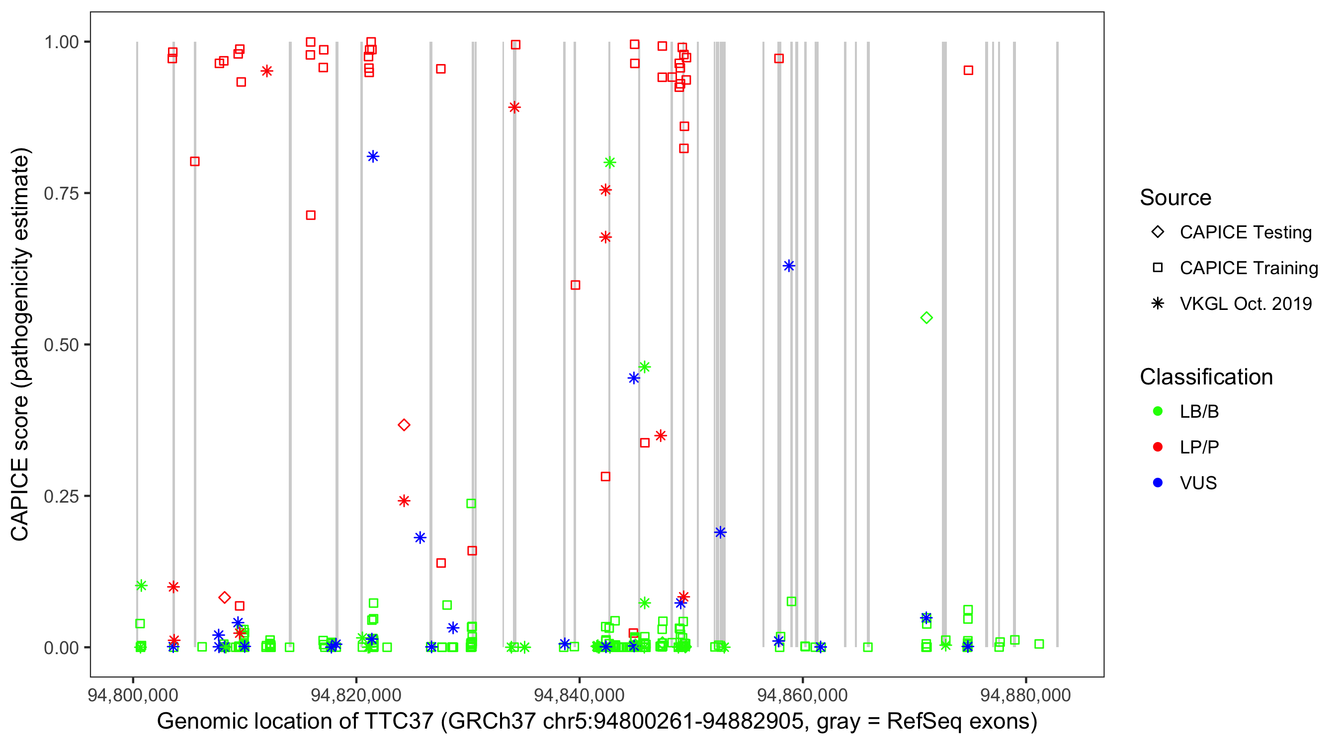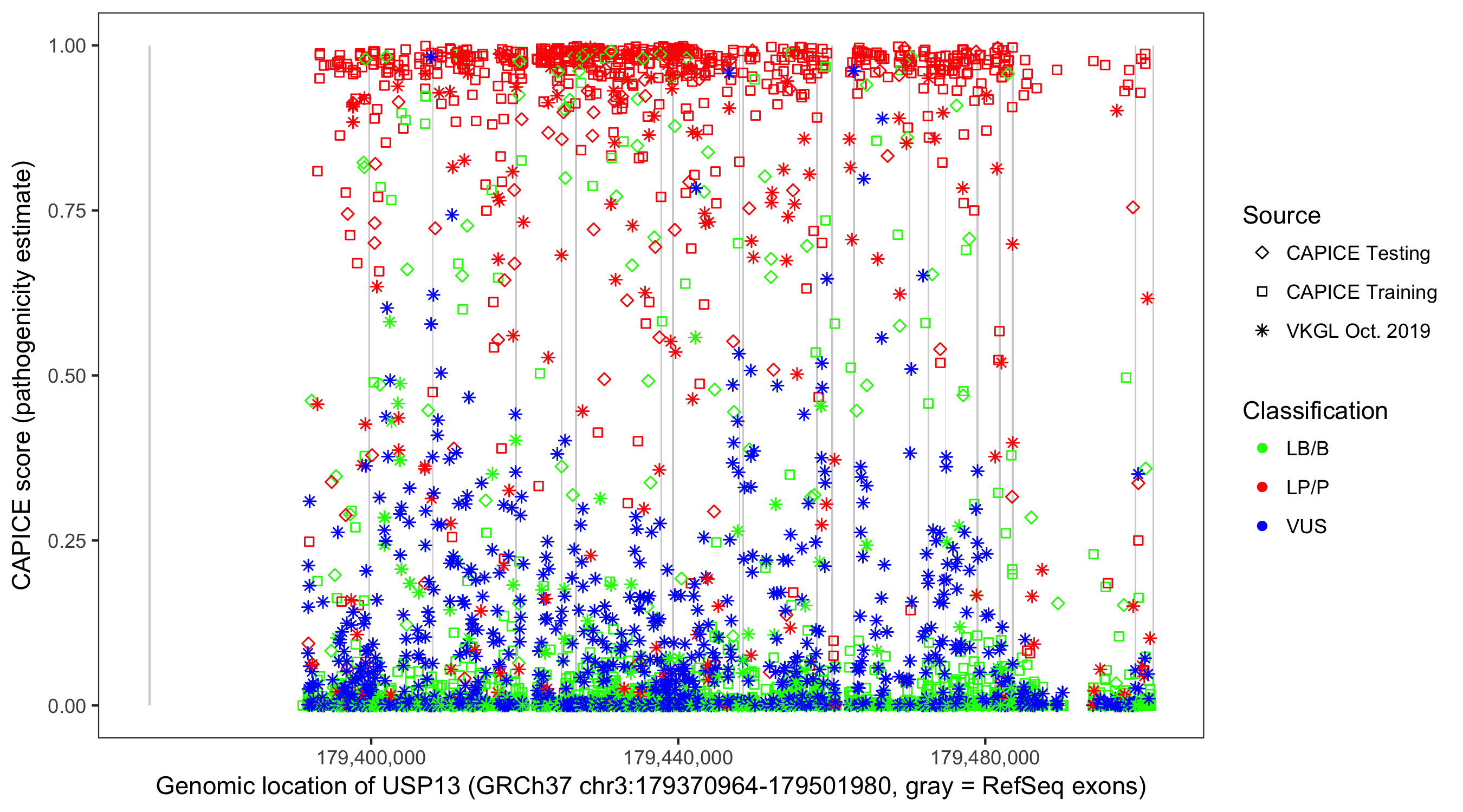 Shown are CAPICE train/test variants plus VKGL Oct 2019.