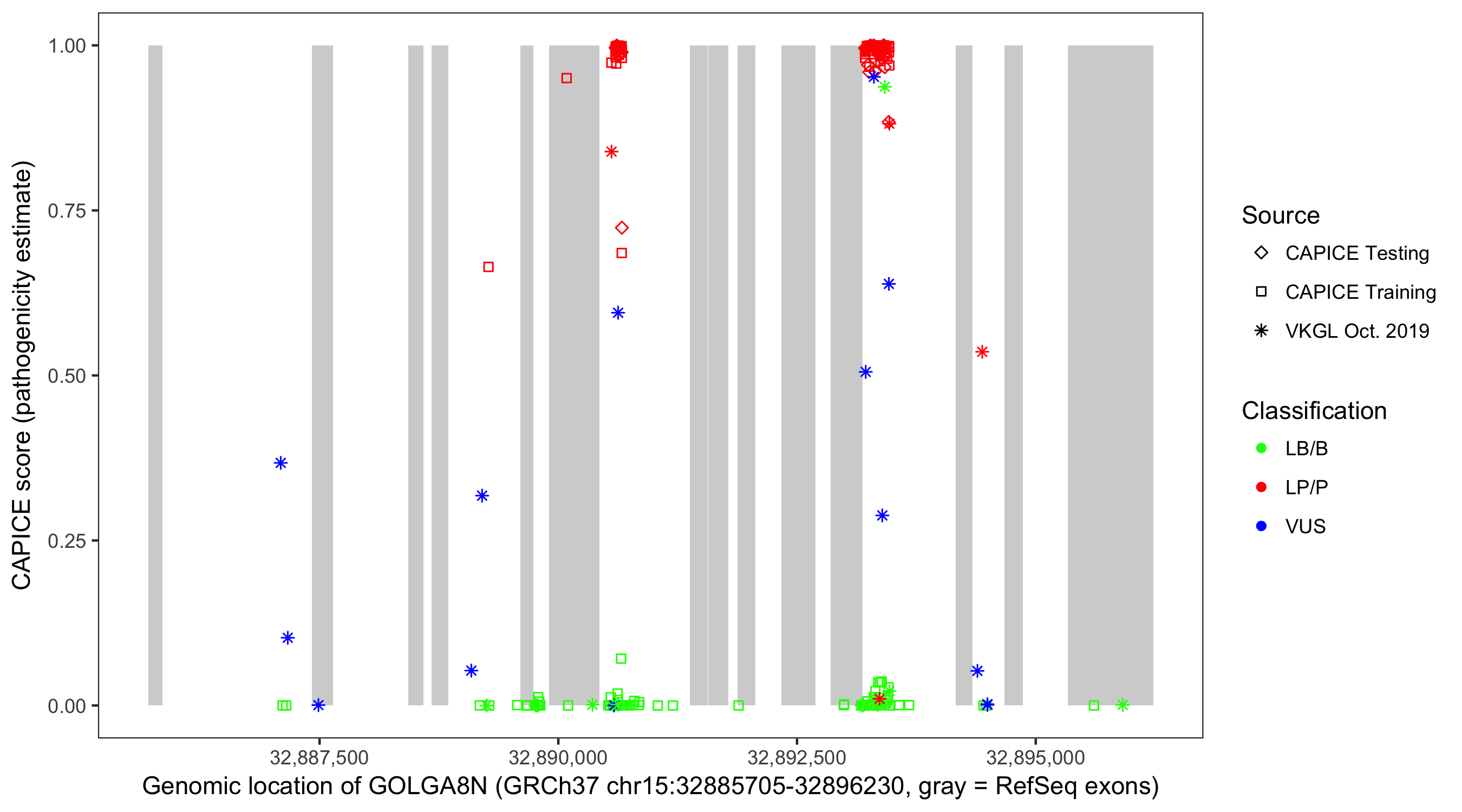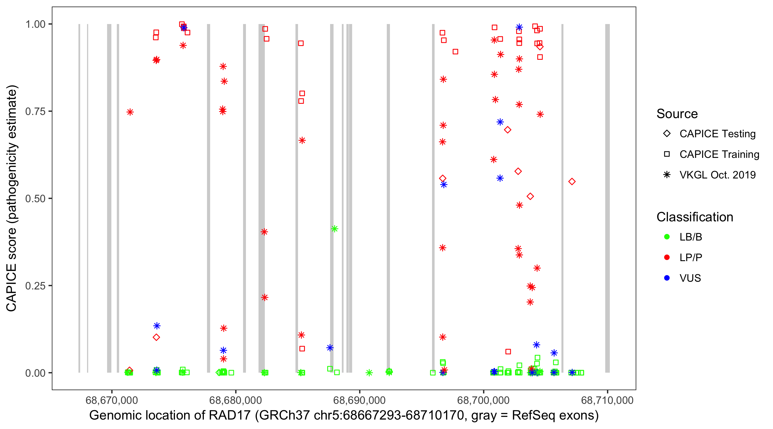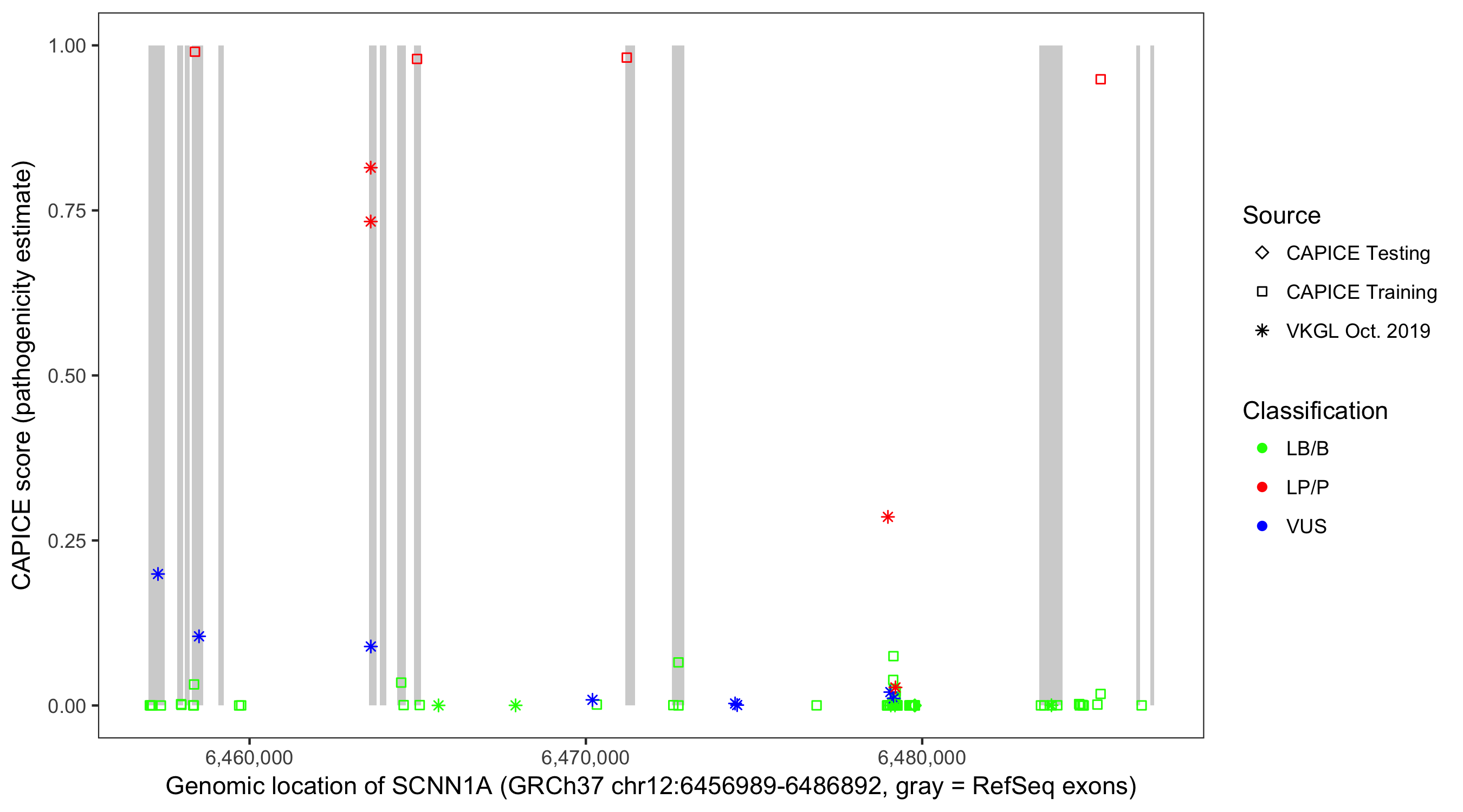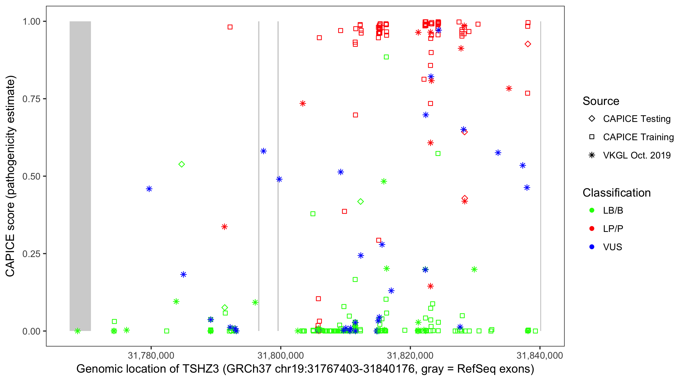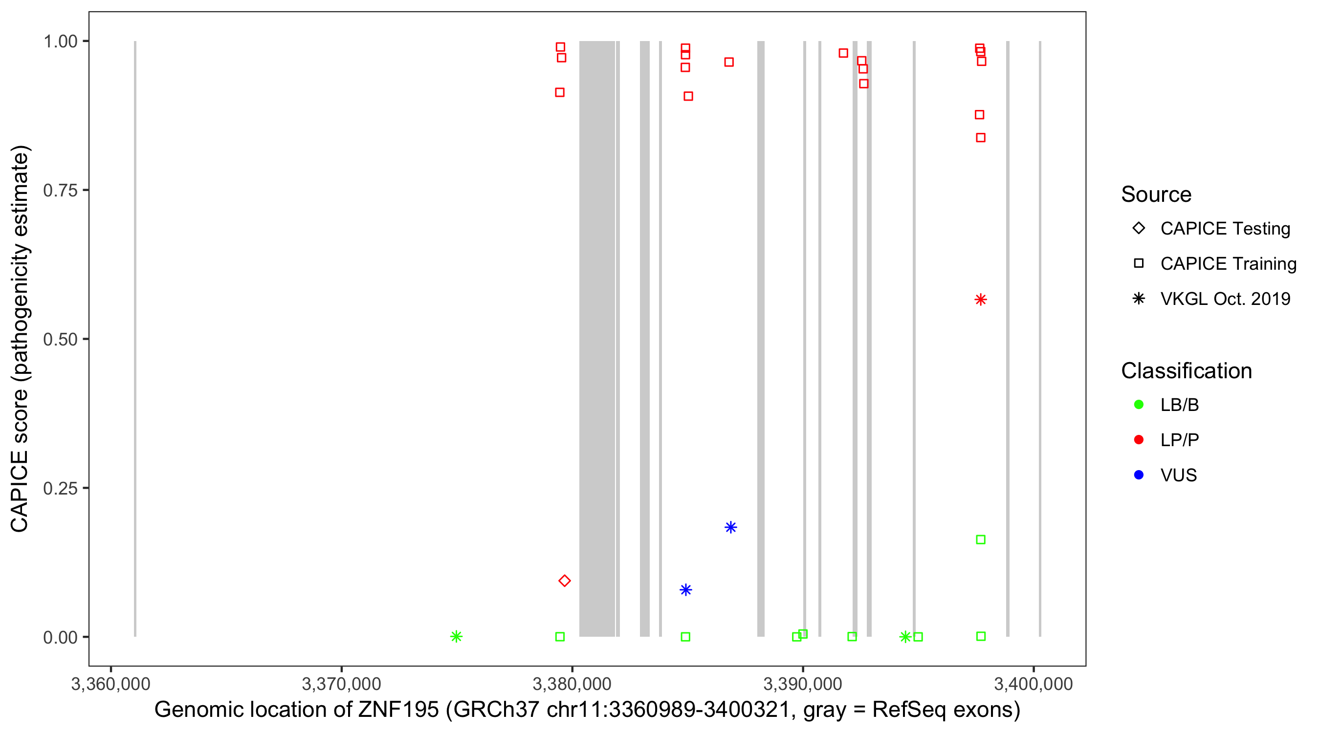 Shown are CAPICE train/test variants plus VKGL Oct 2019.