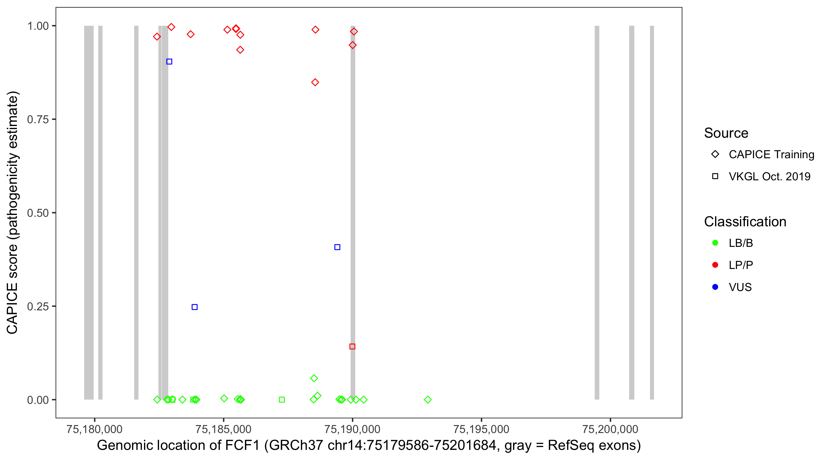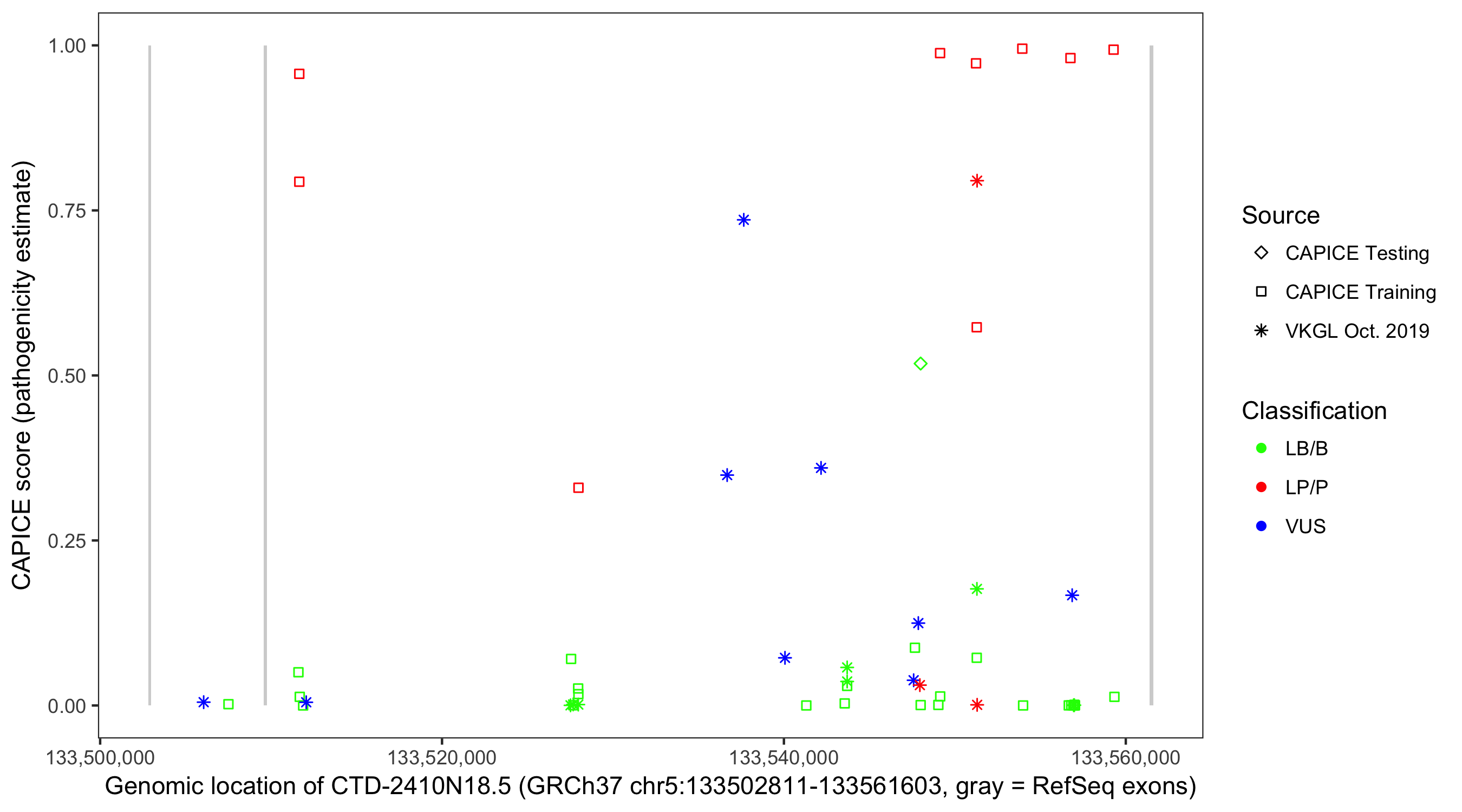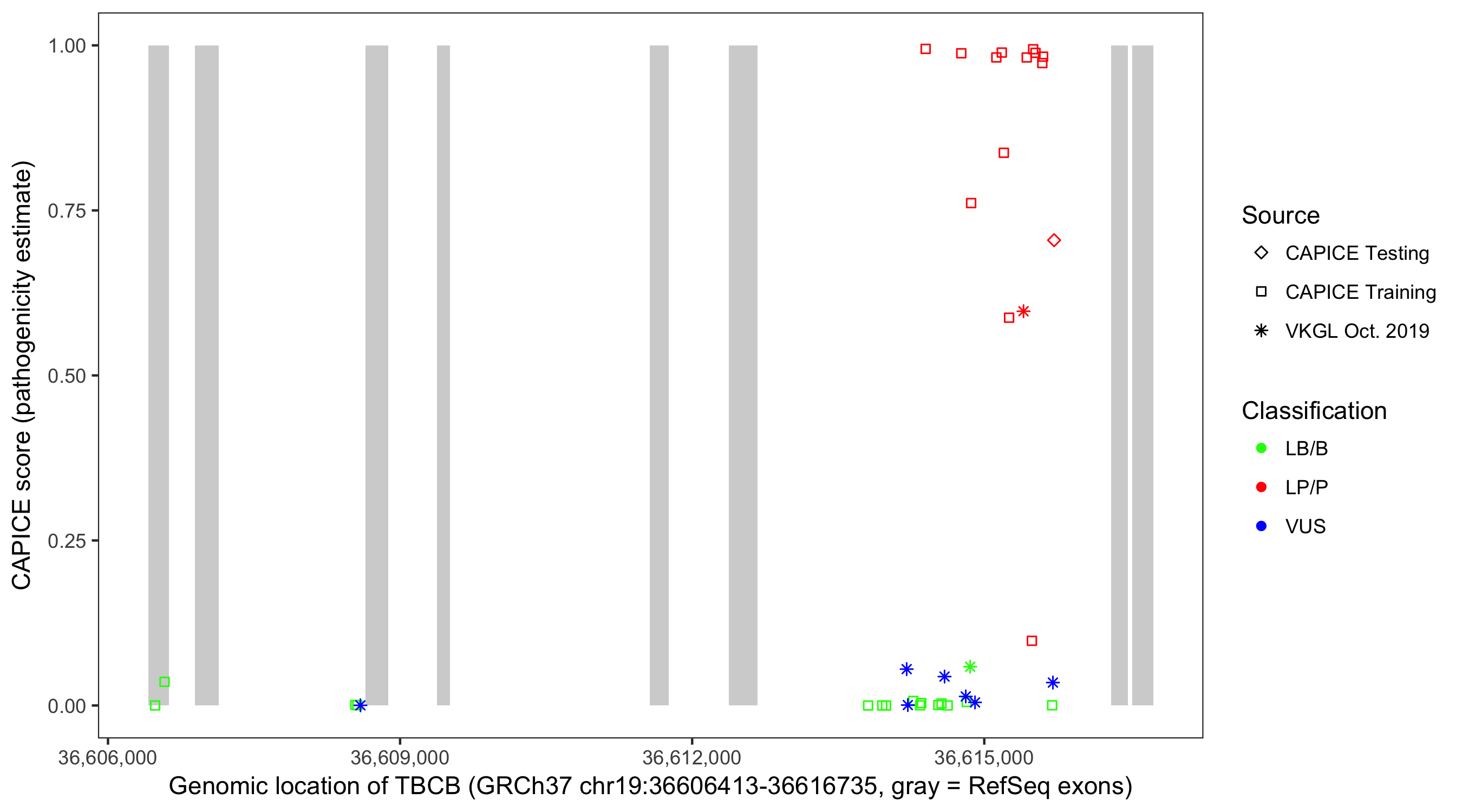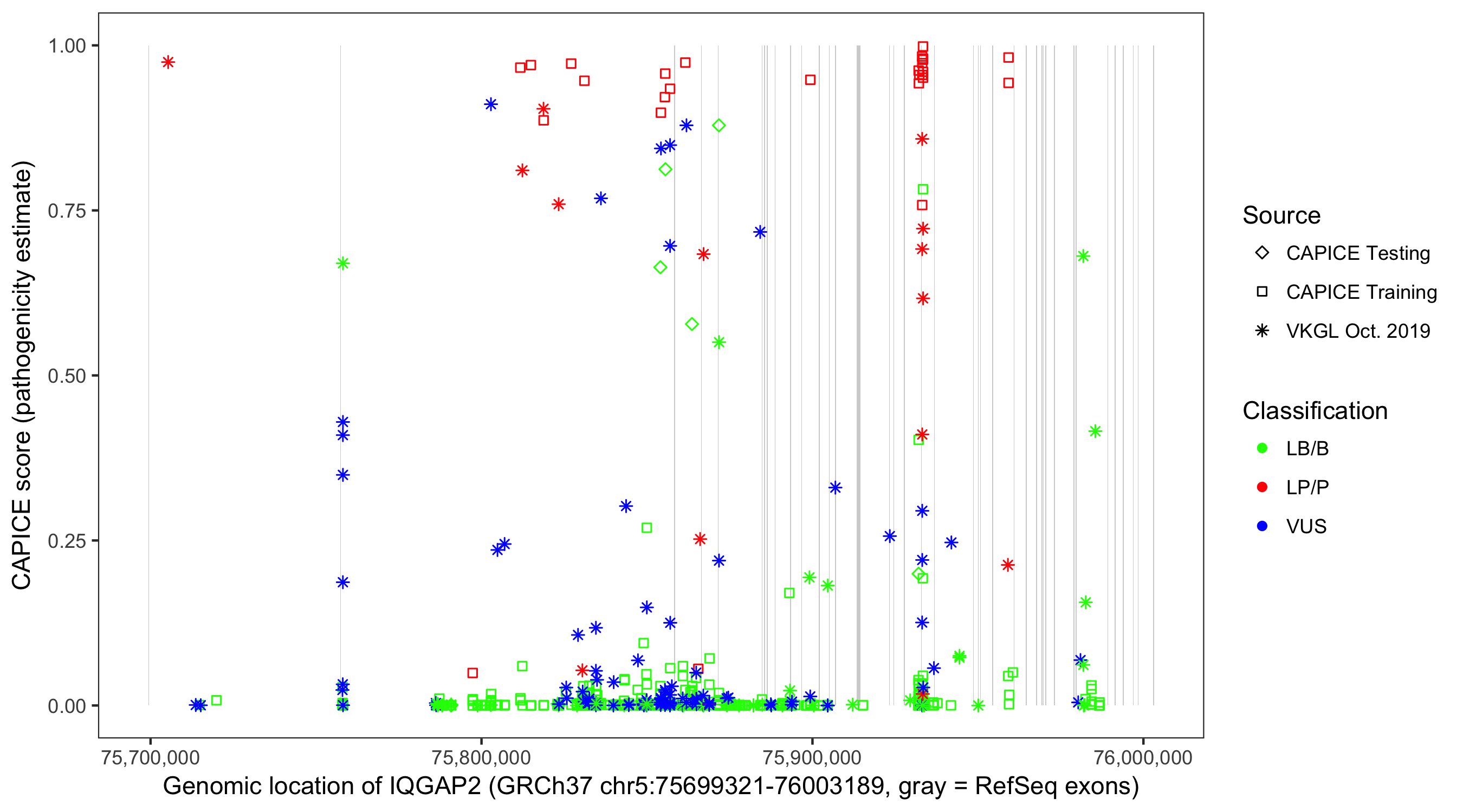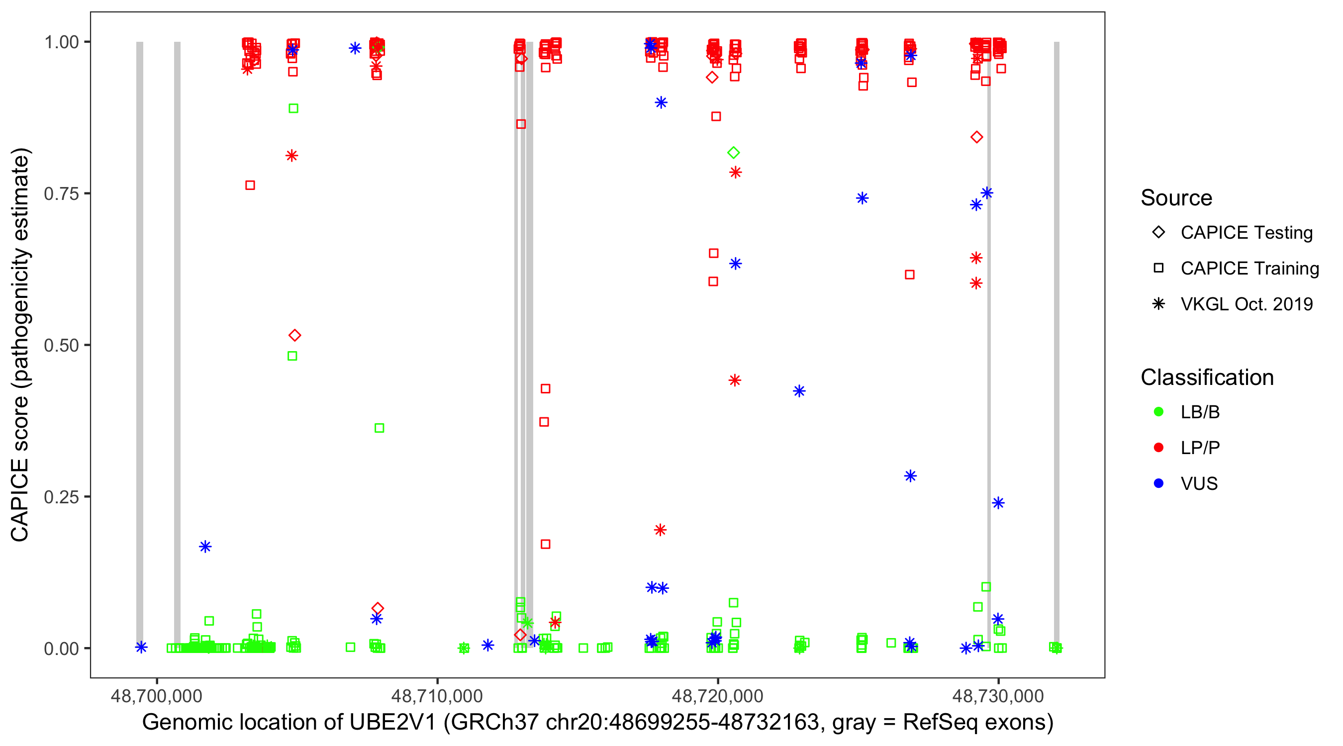 Shown are CAPICE train/test variants plus VKGL Oct 2019.