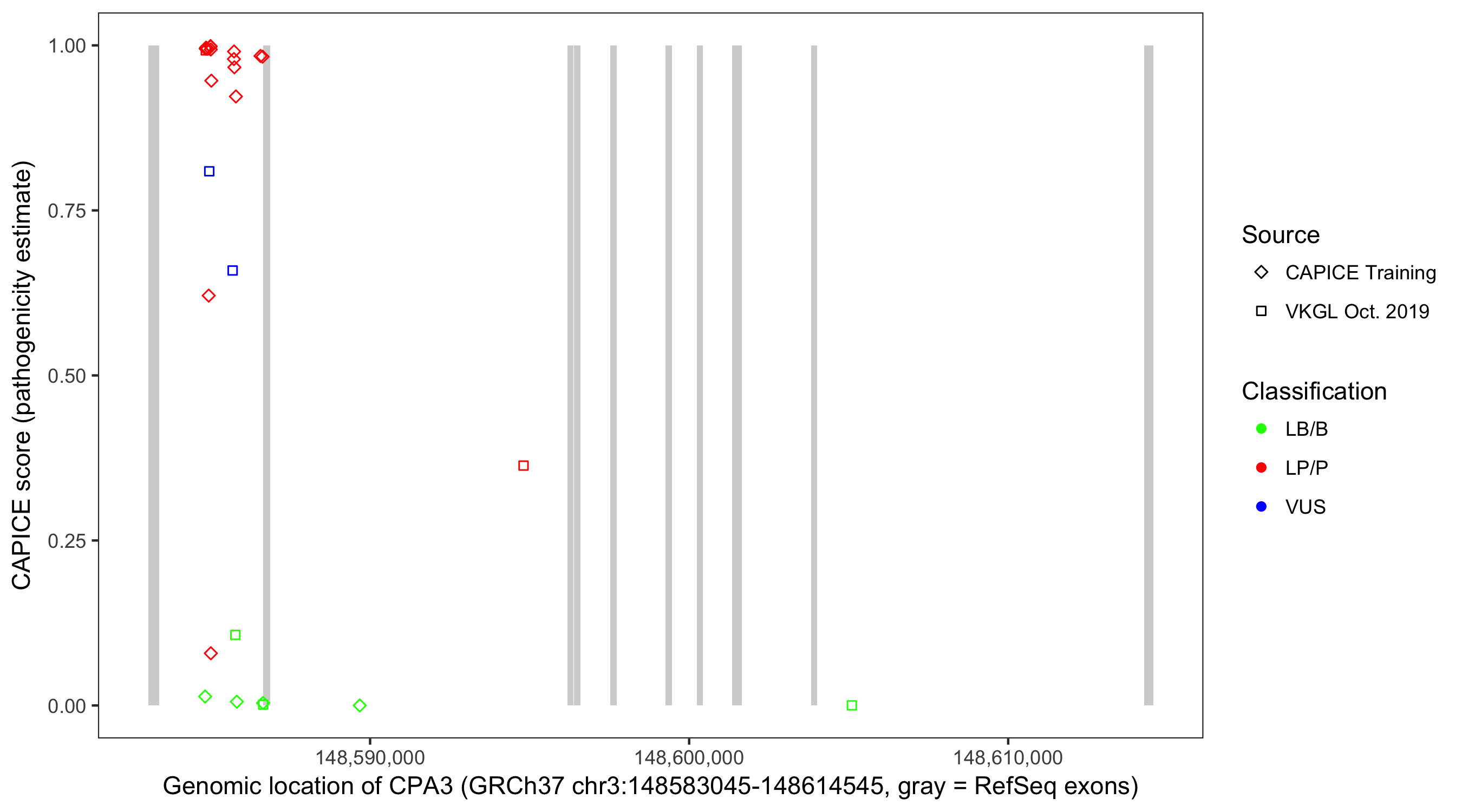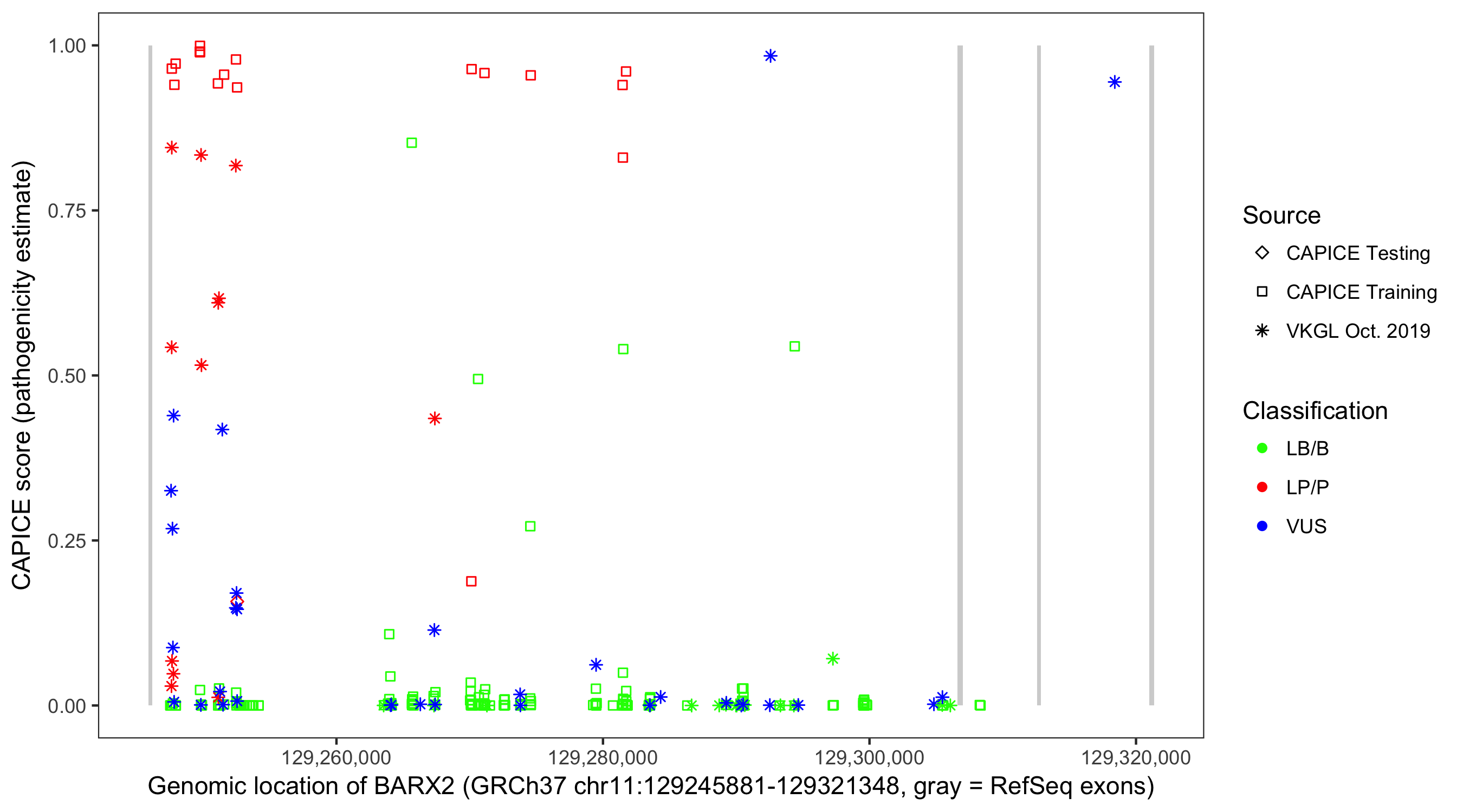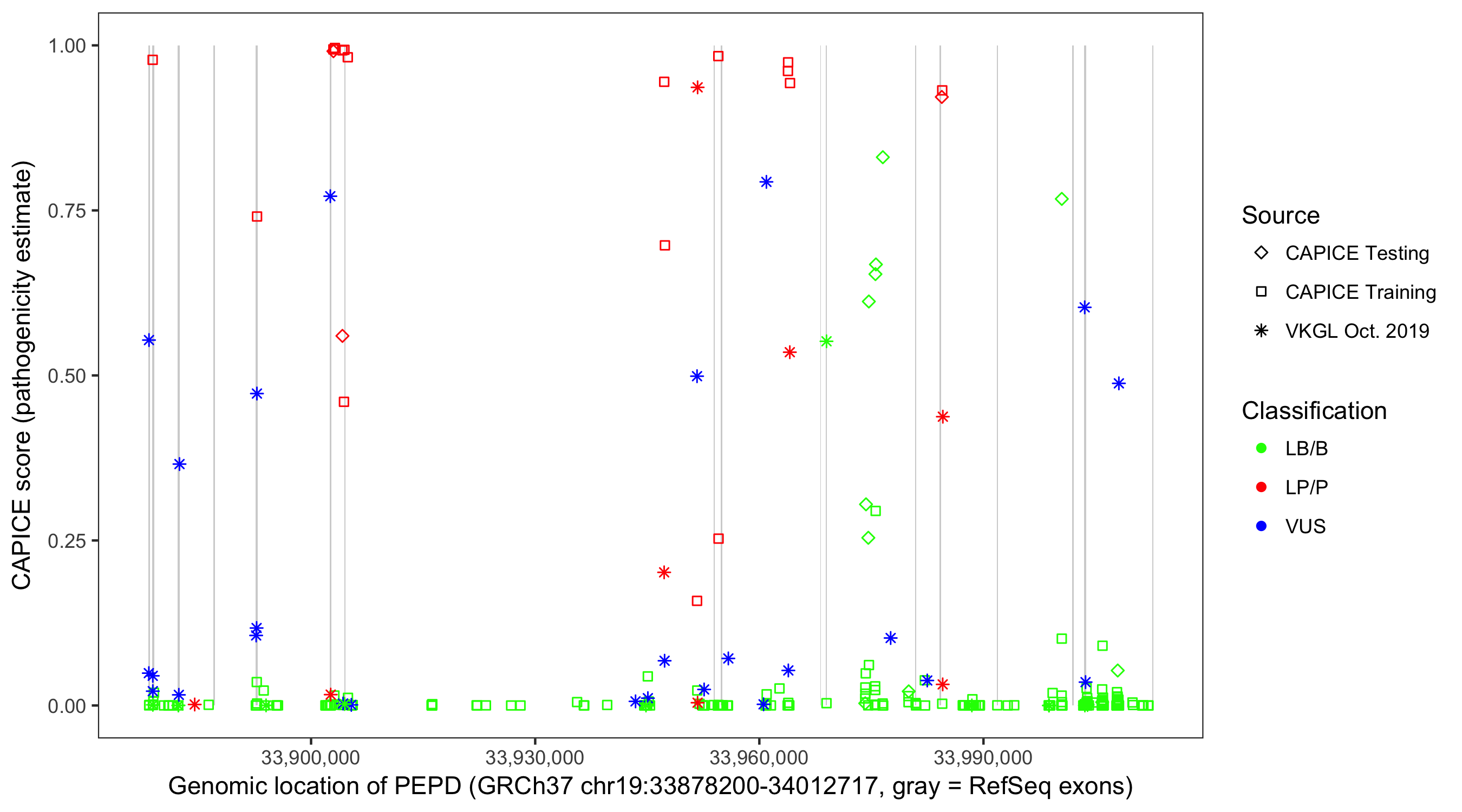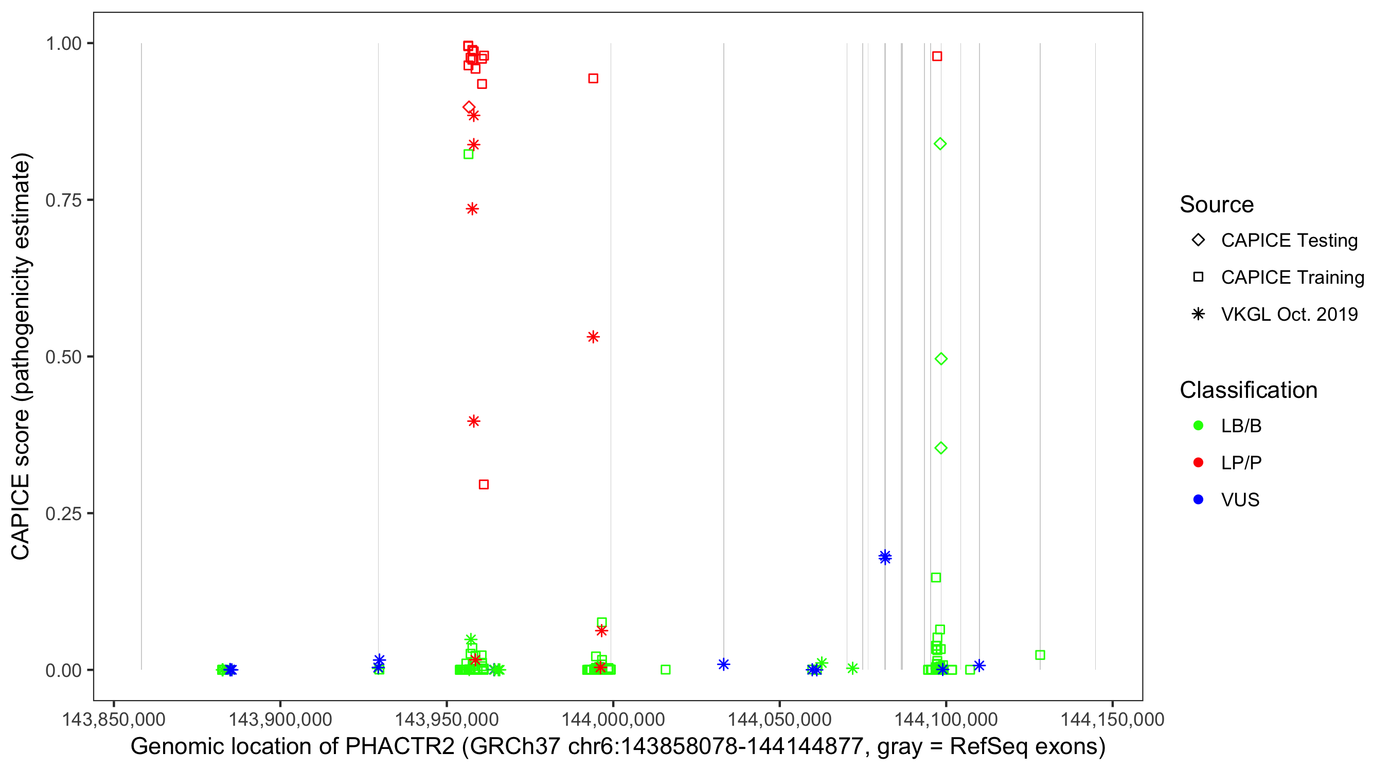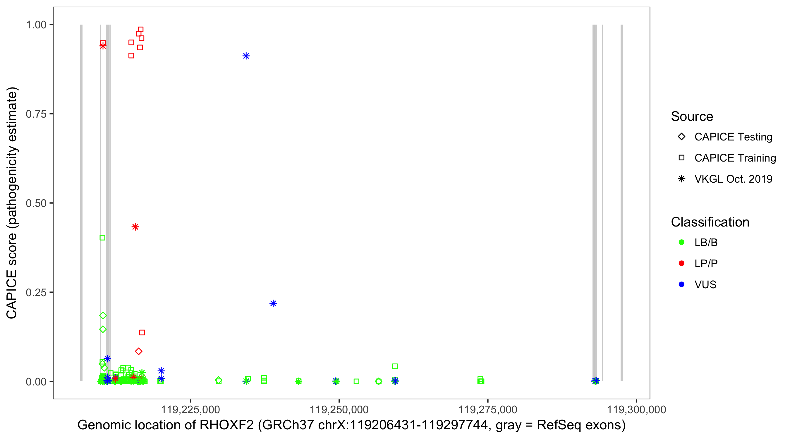 Shown are CAPICE train/test variants plus VKGL Oct 2019.