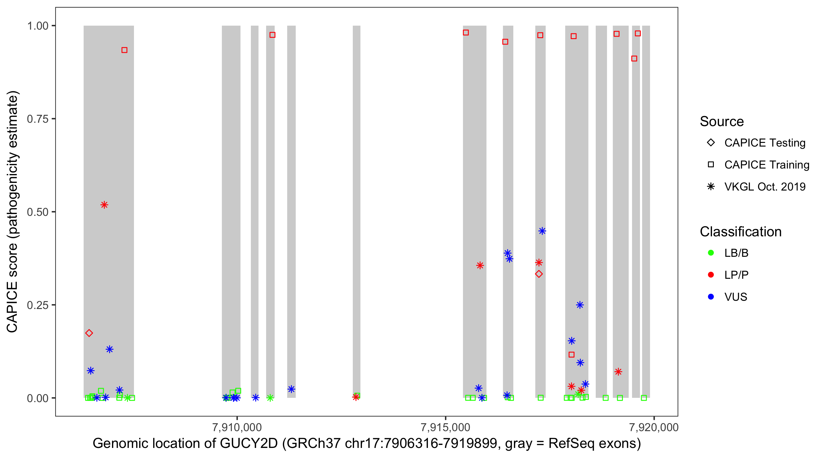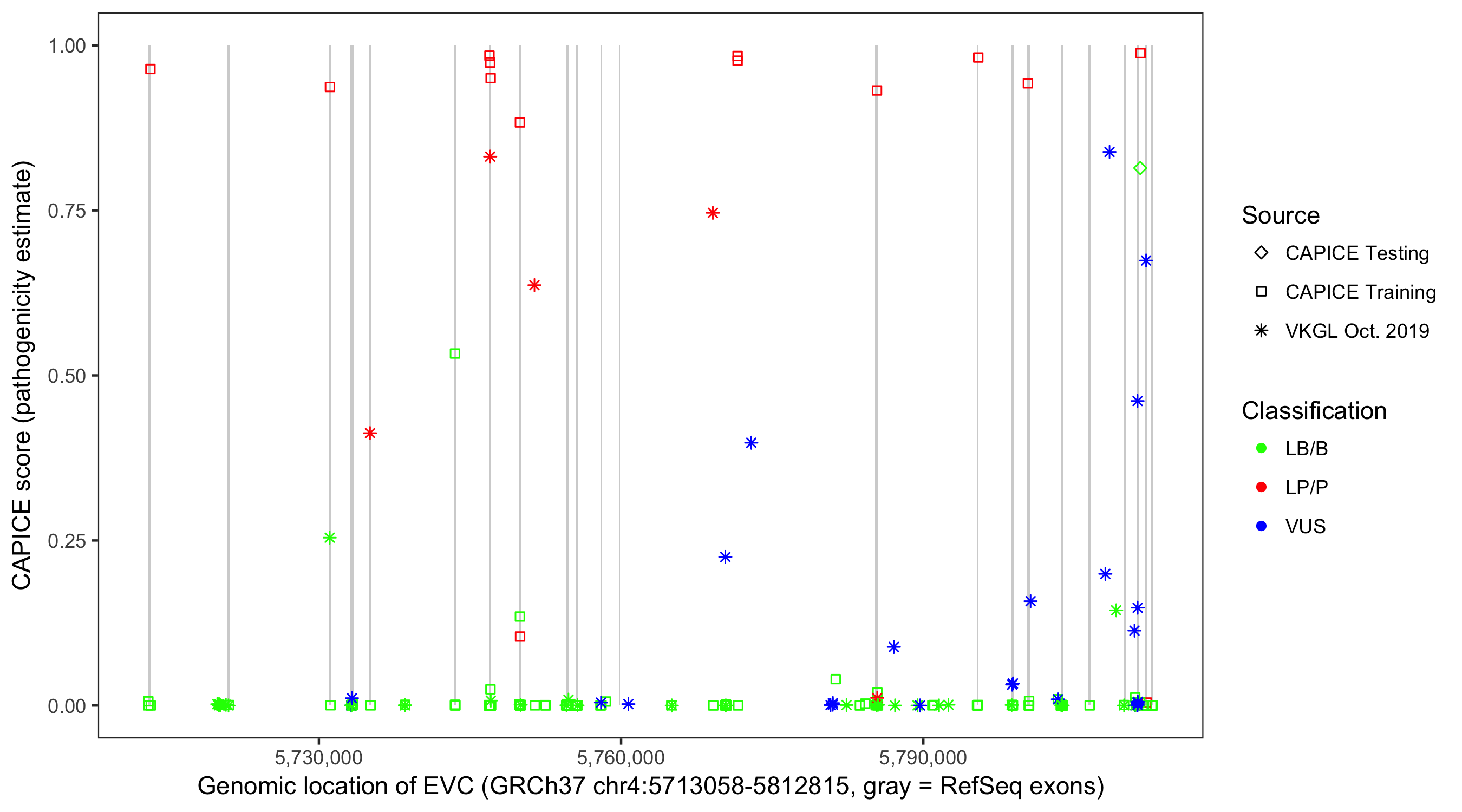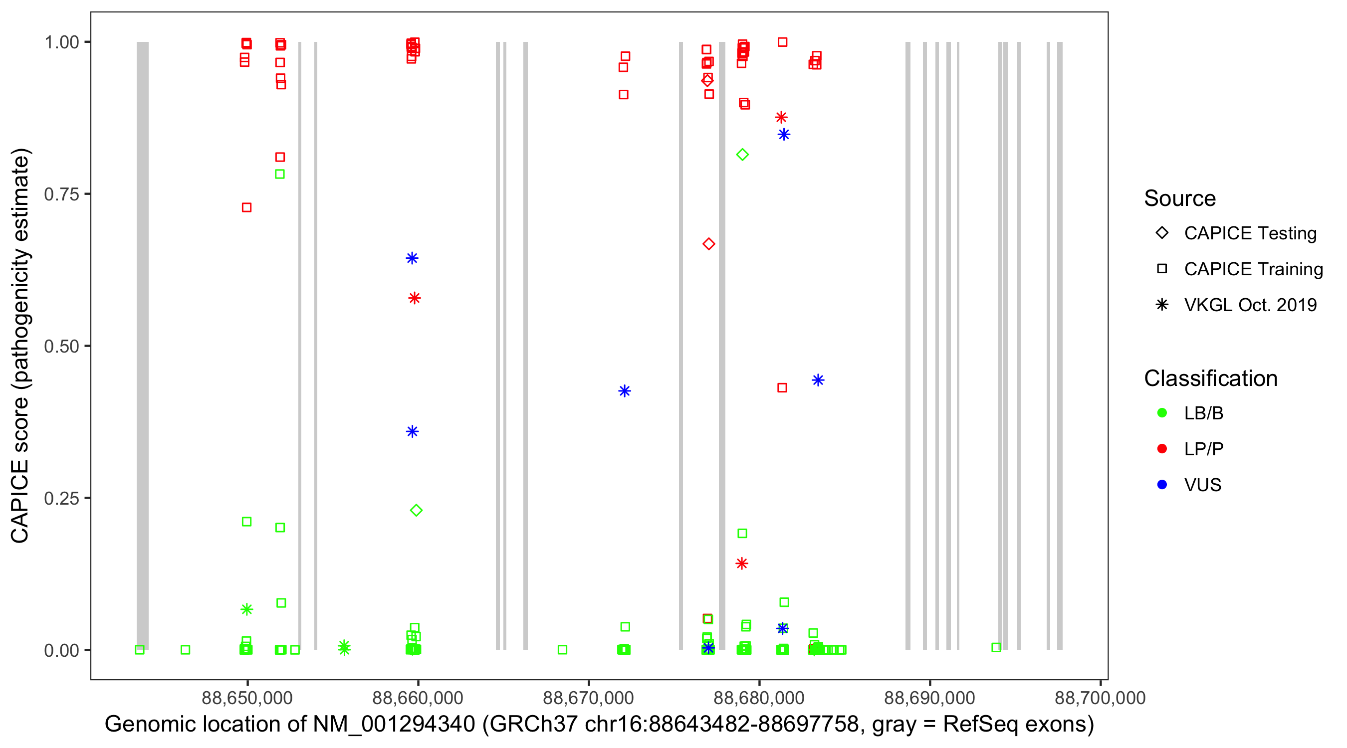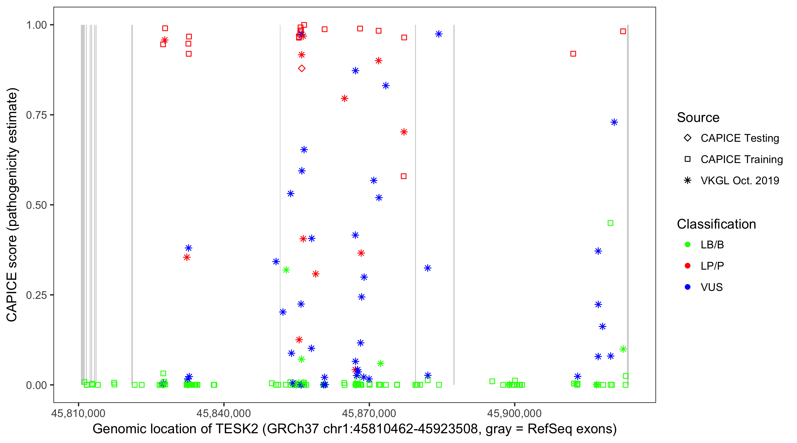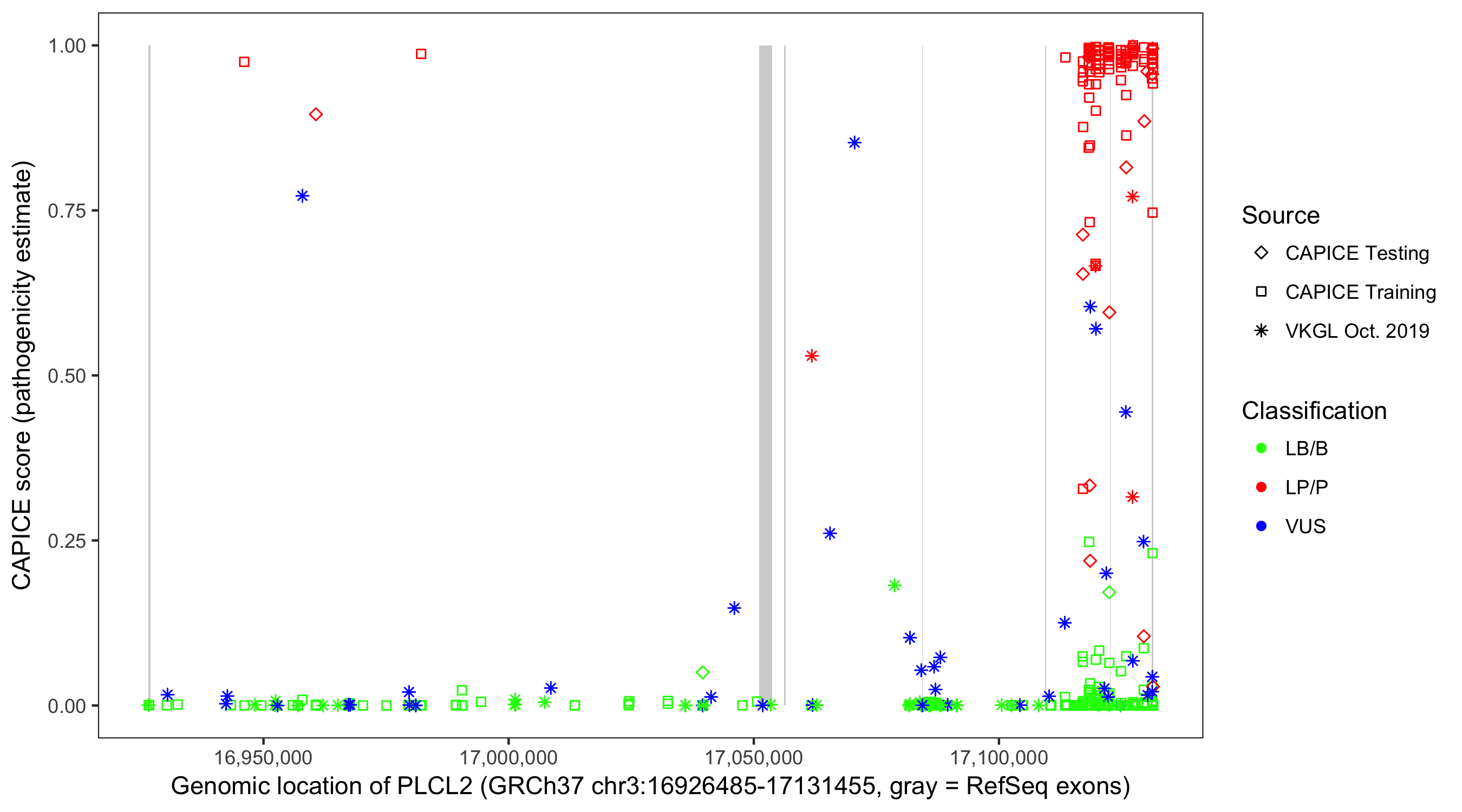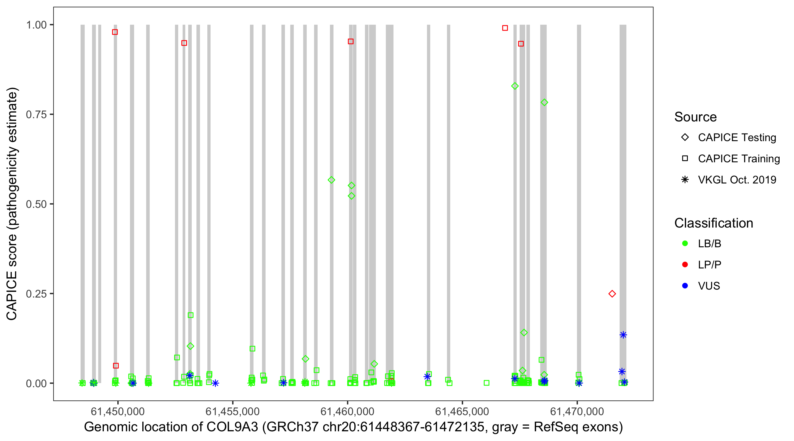 Shown are CAPICE train/test variants plus VKGL Oct 2019.