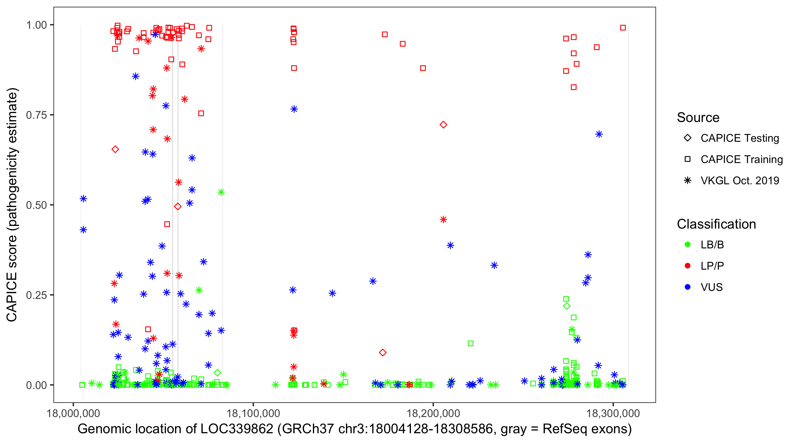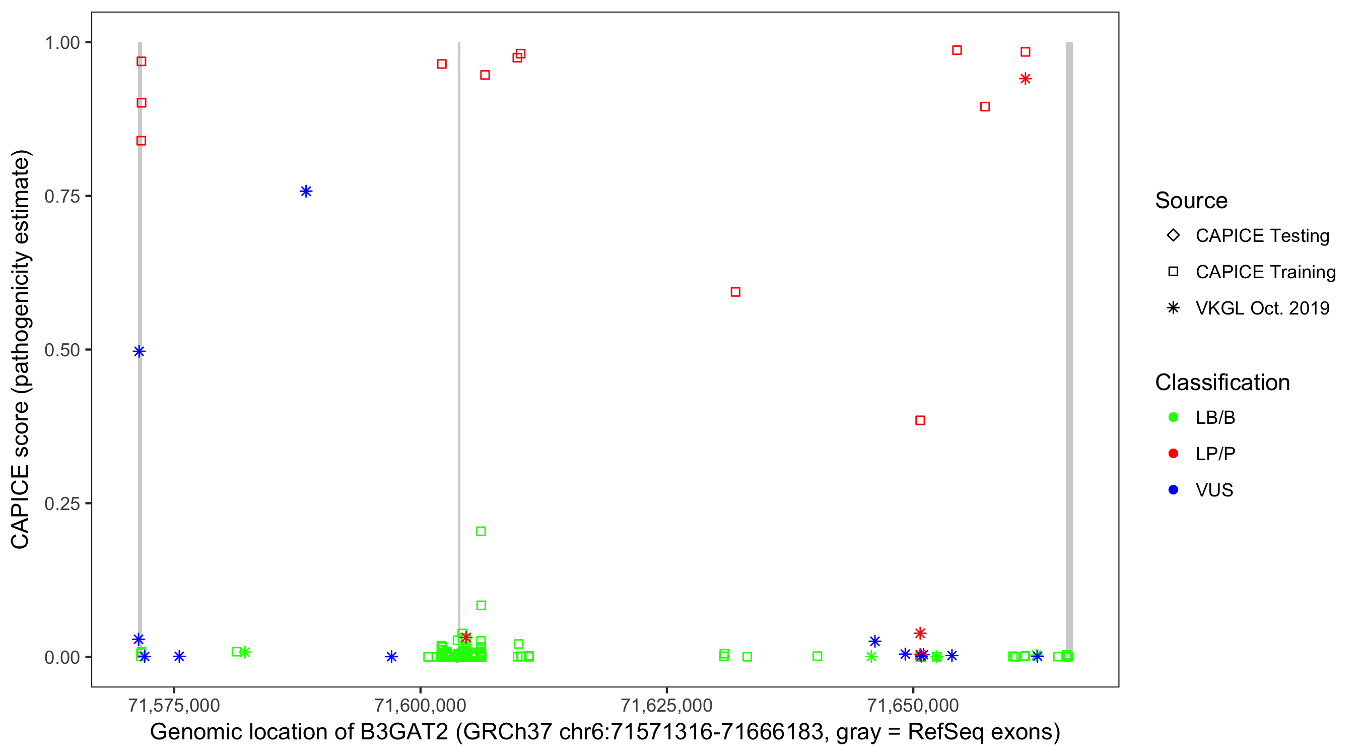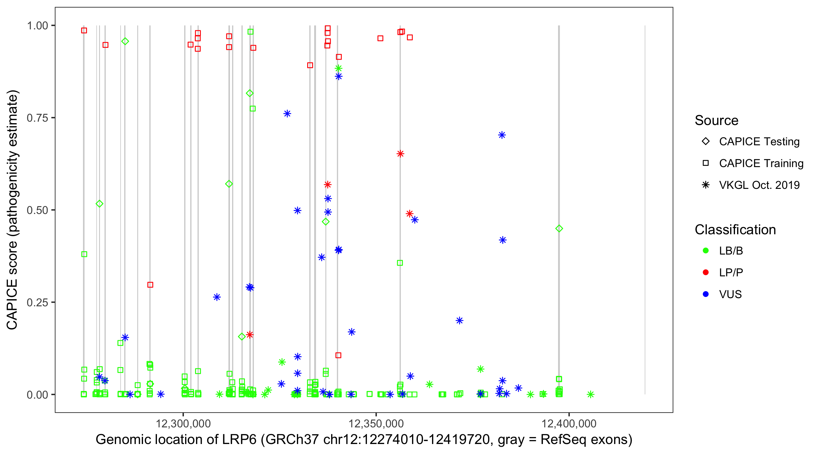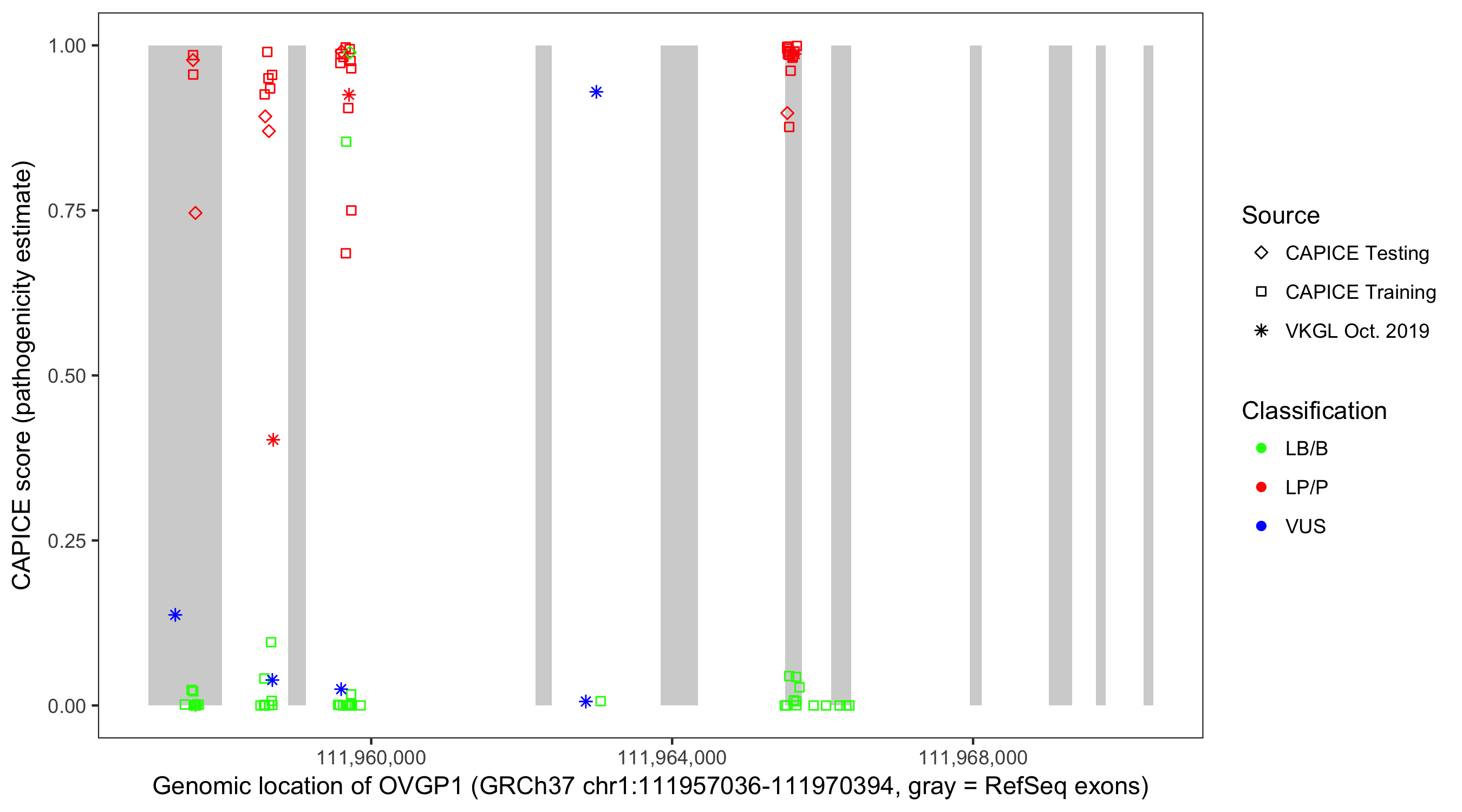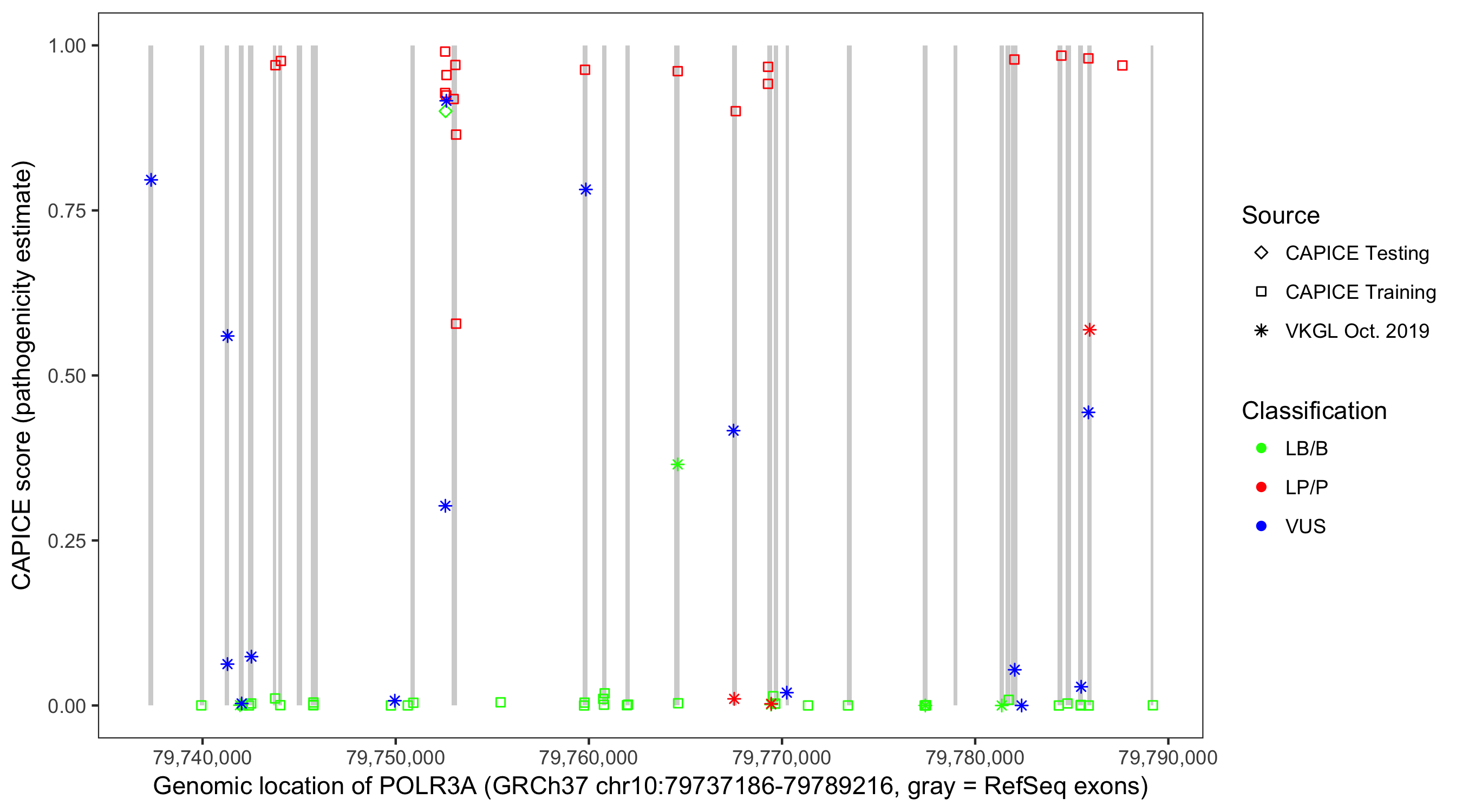 Shown are CAPICE train/test variants plus VKGL Oct 2019.