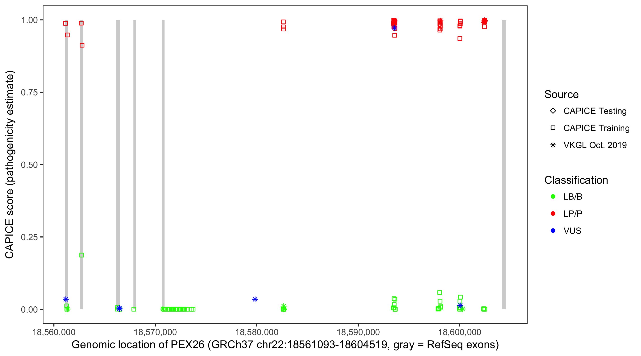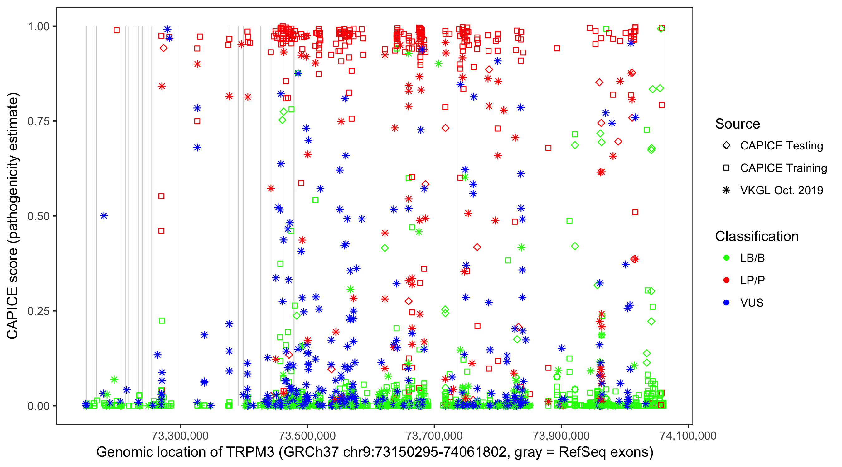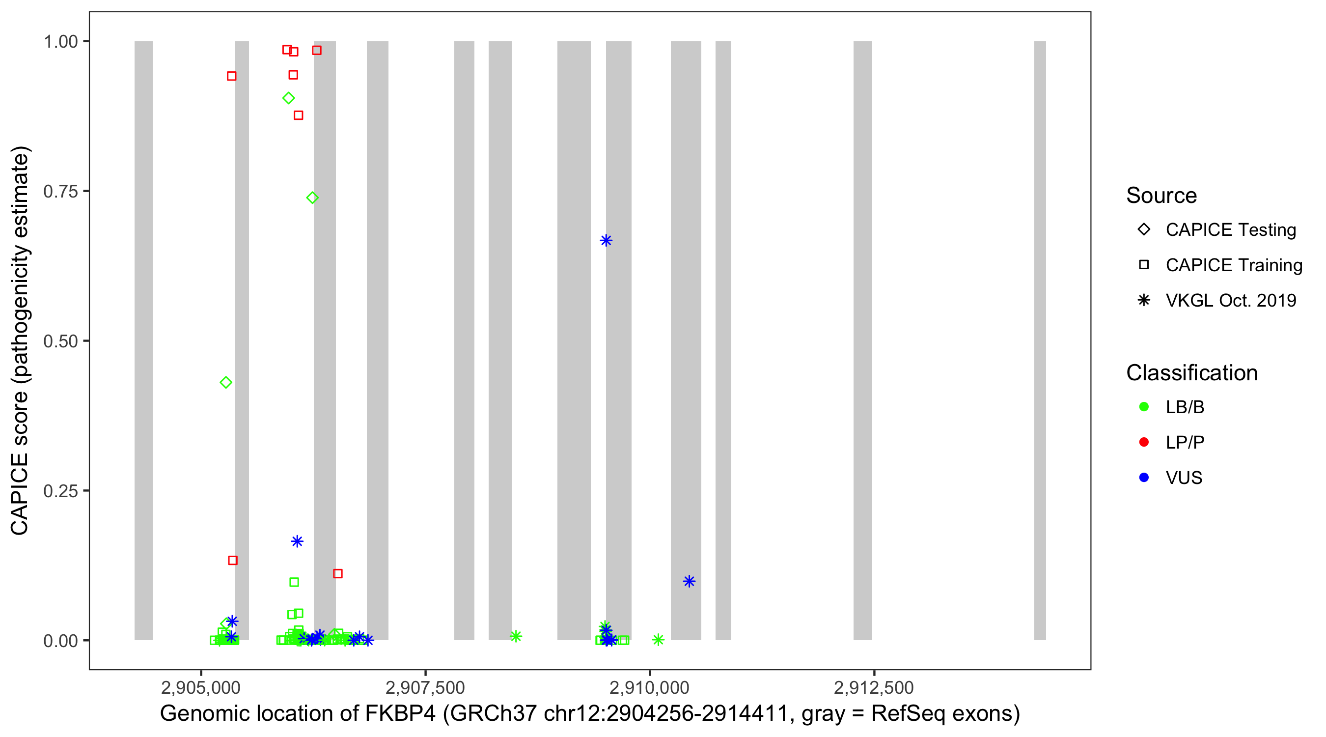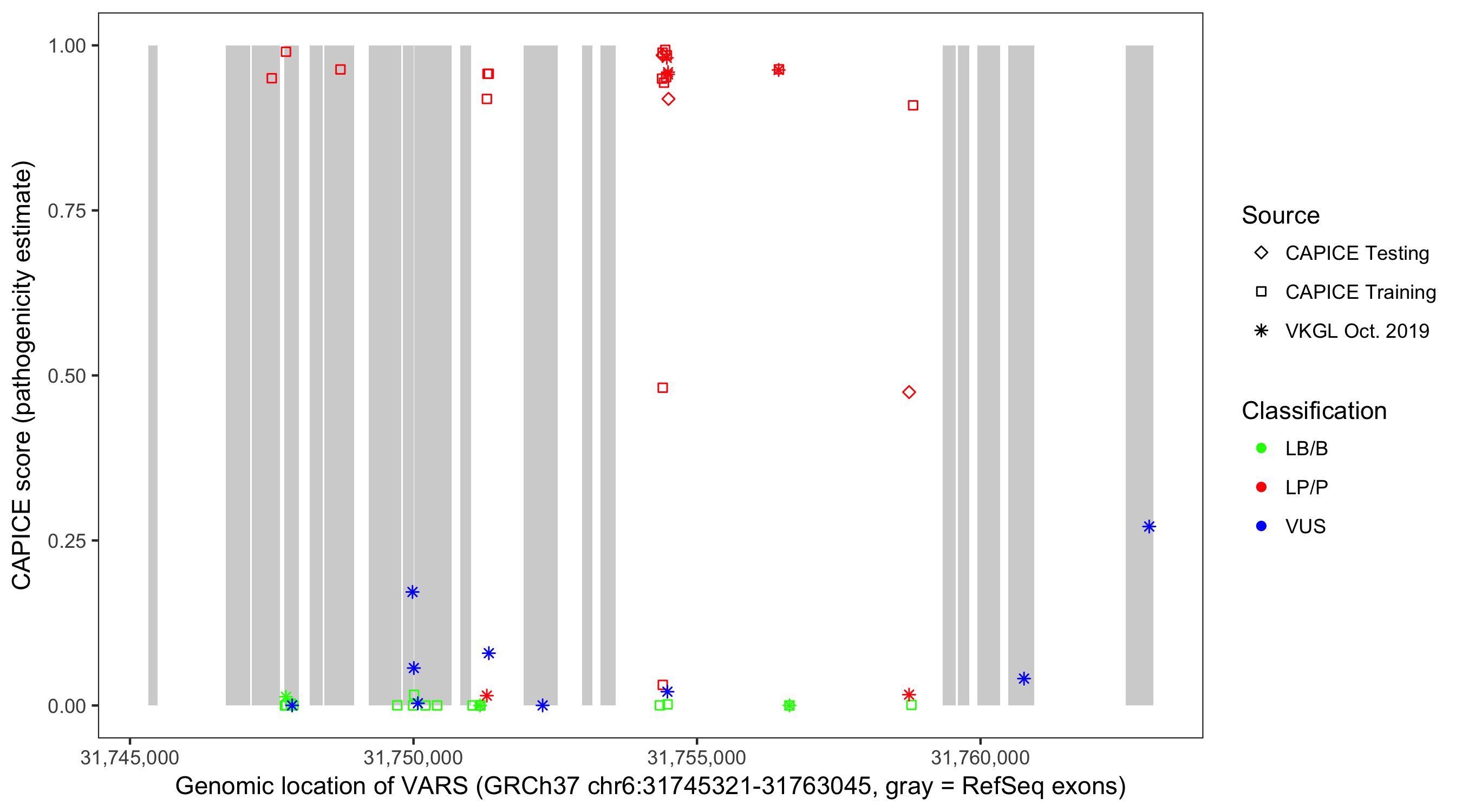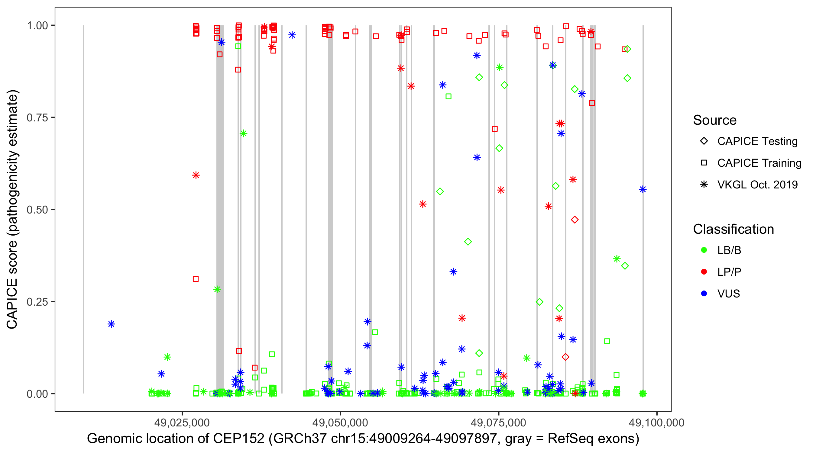 Shown are CAPICE train/test variants plus VKGL Oct 2019.