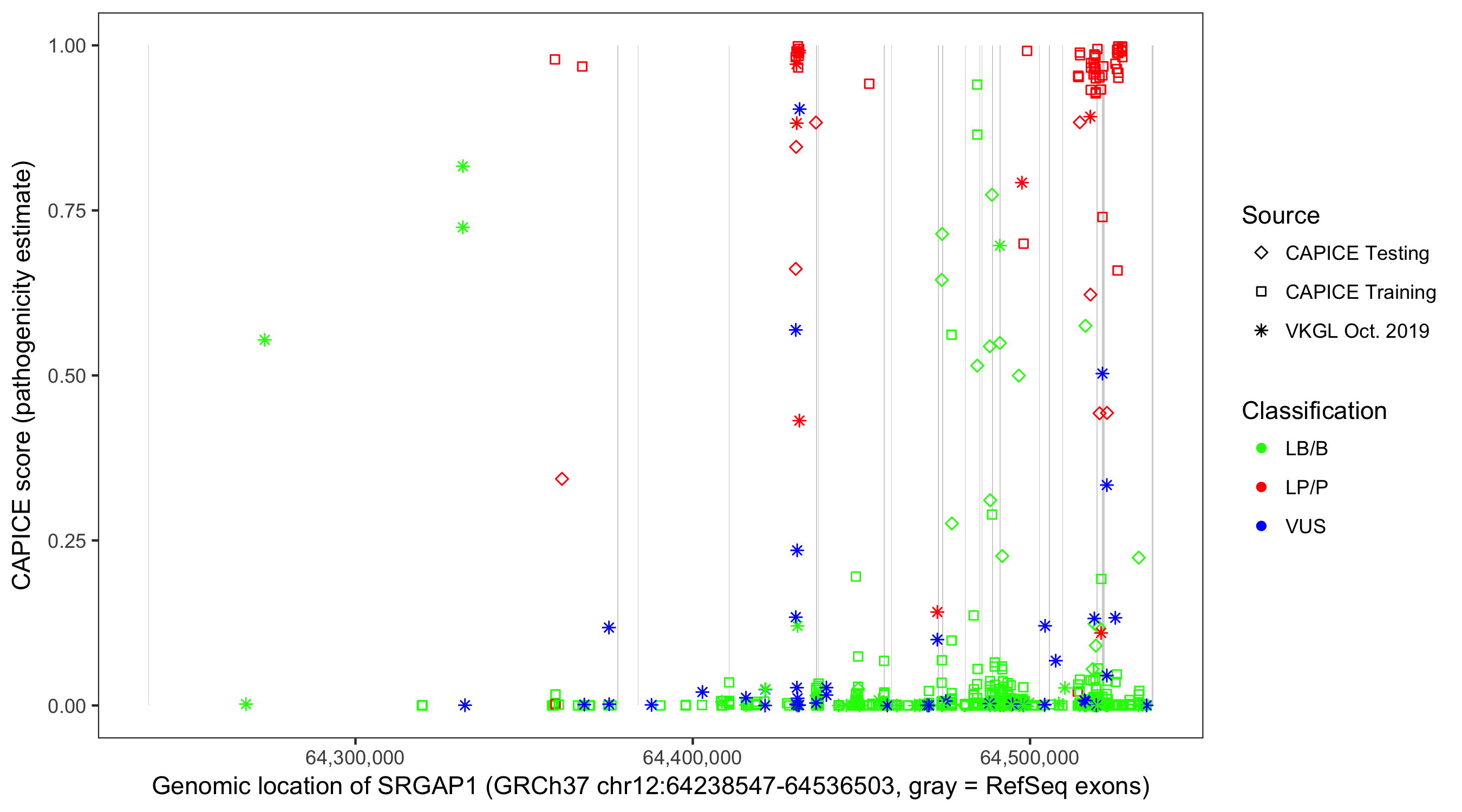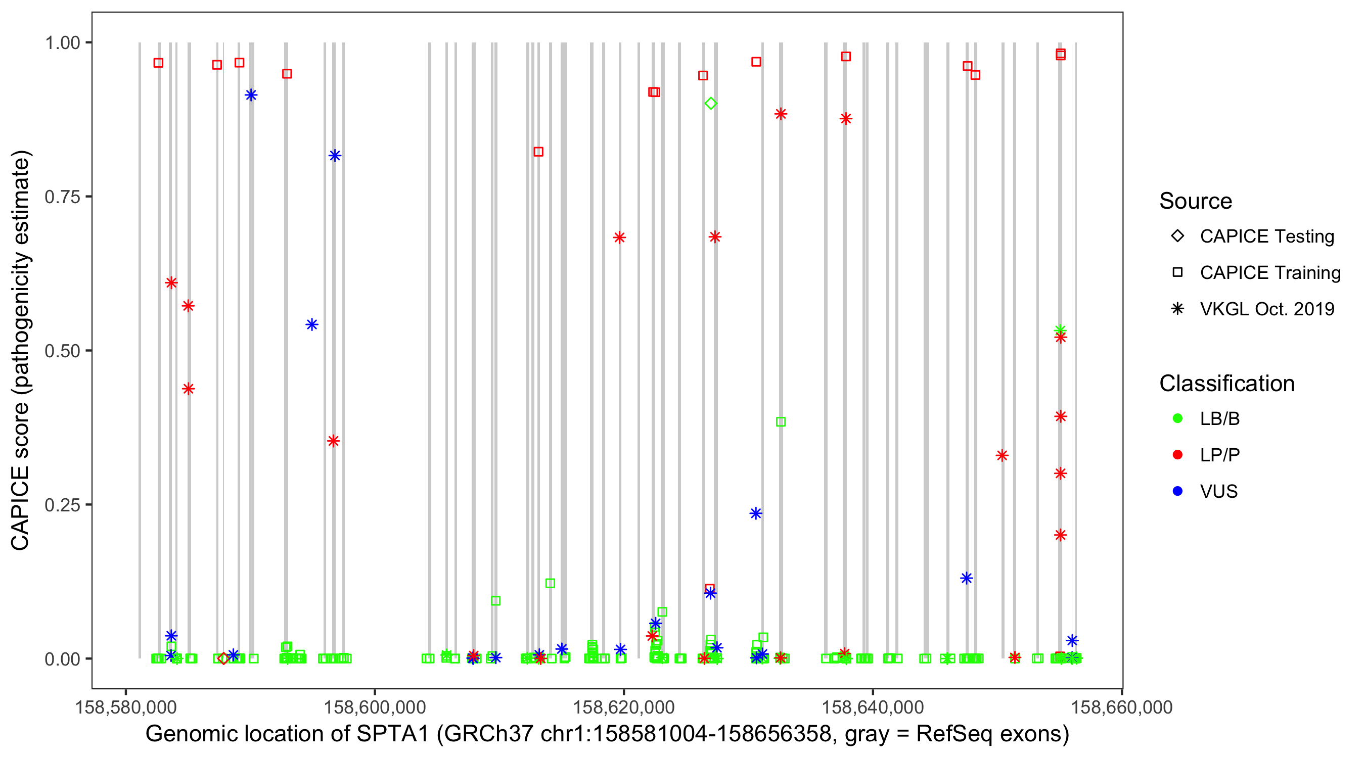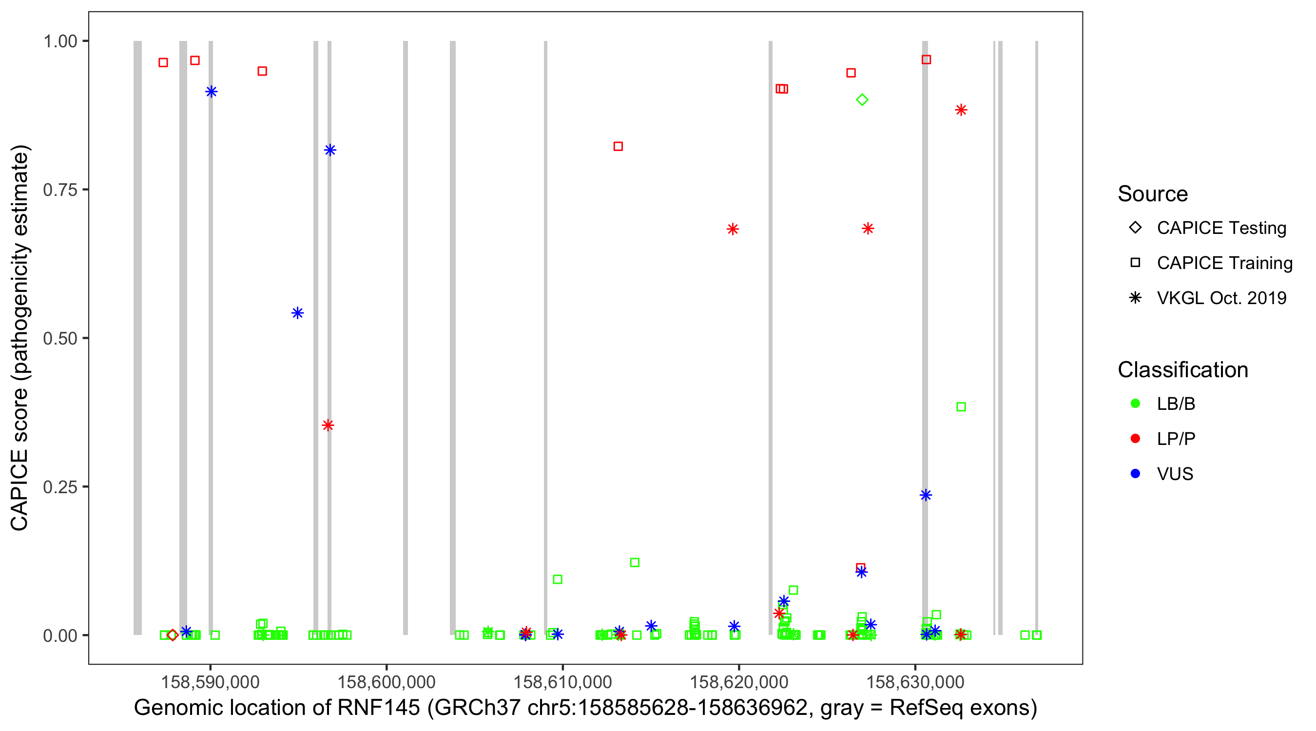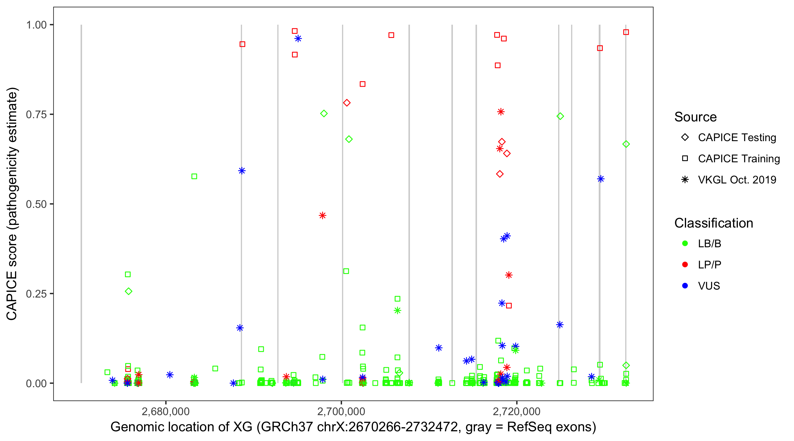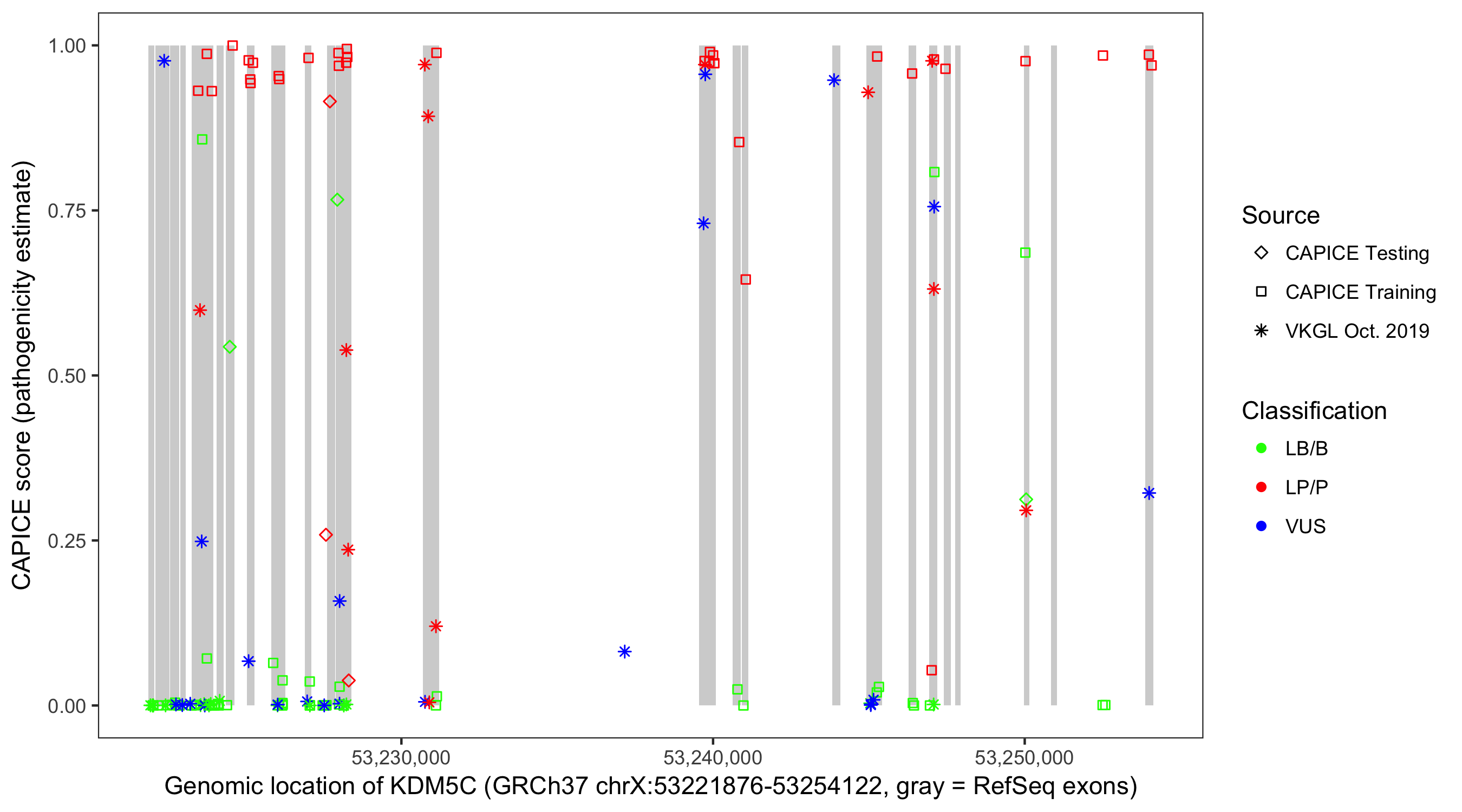 Shown are CAPICE train/test variants plus VKGL Oct 2019.