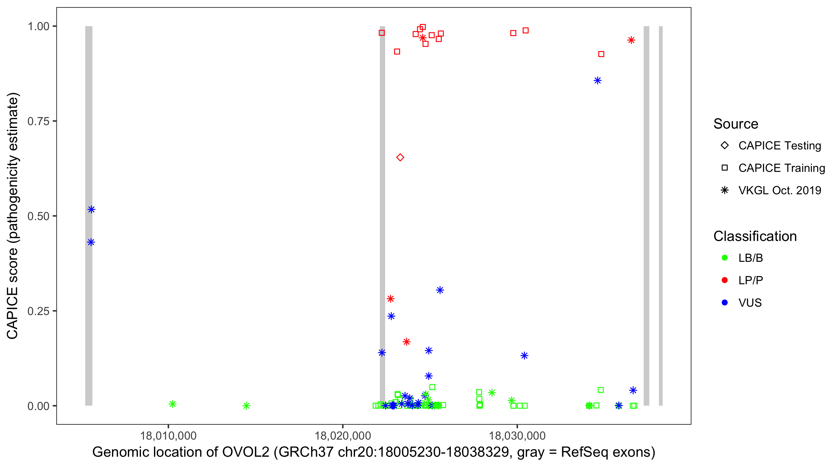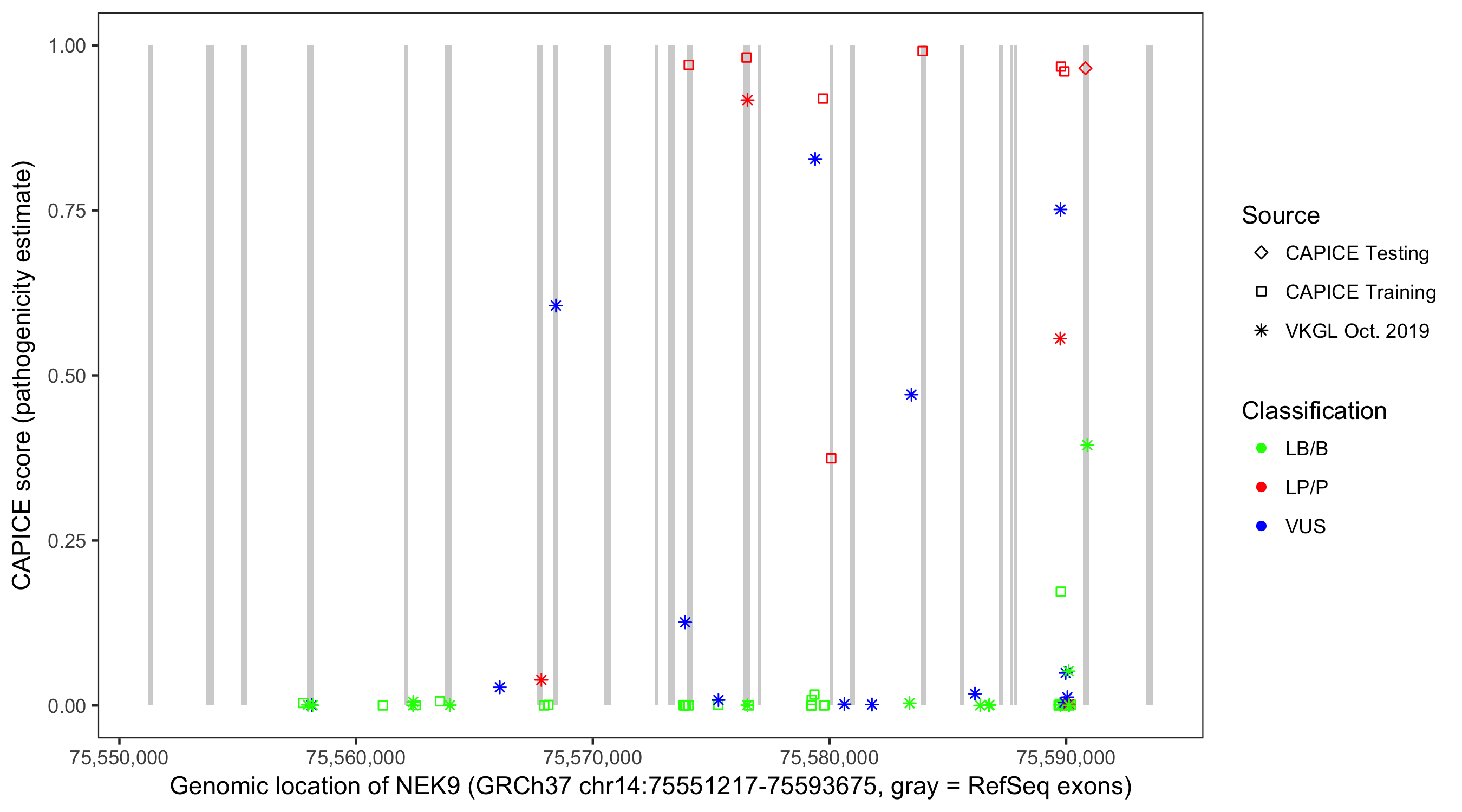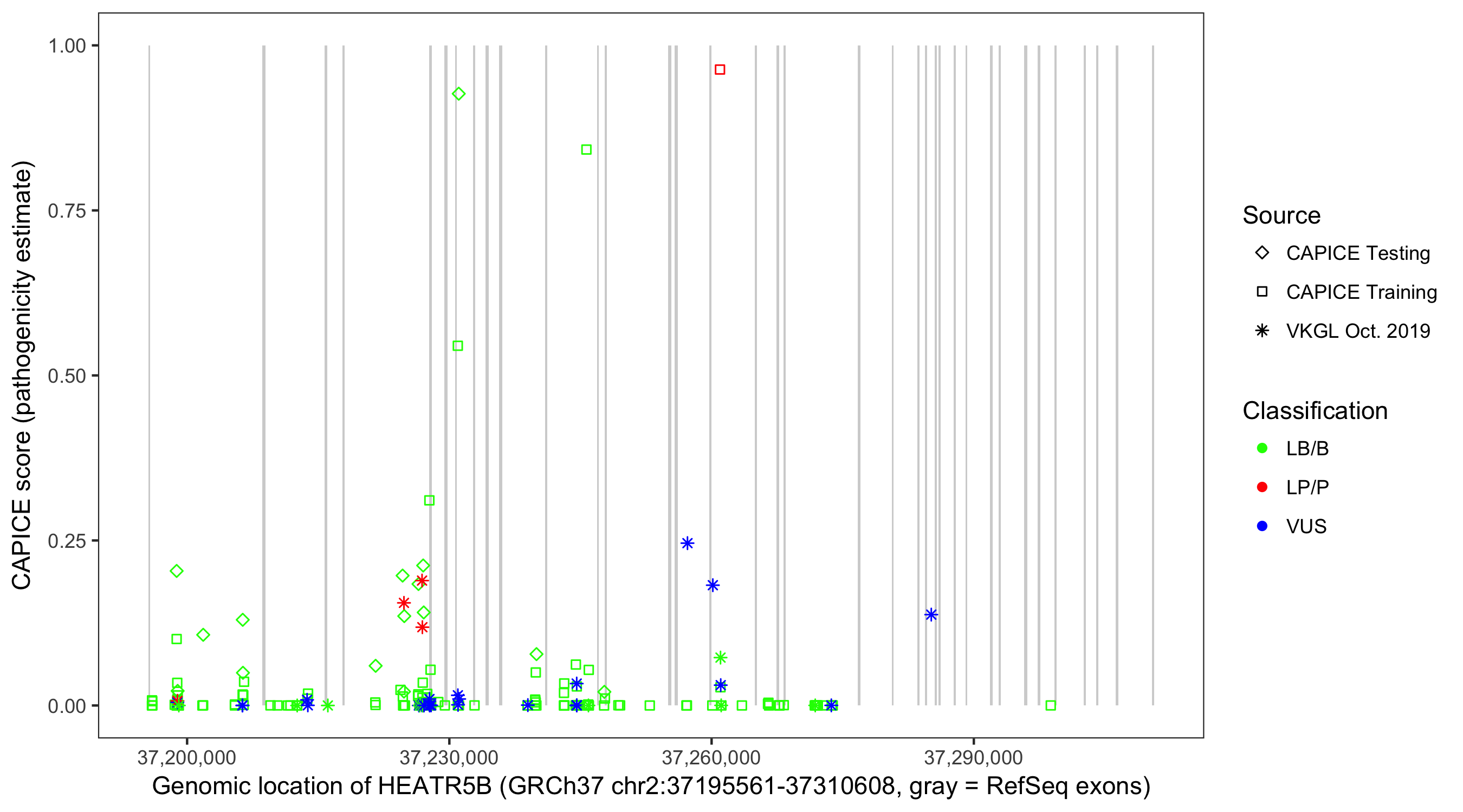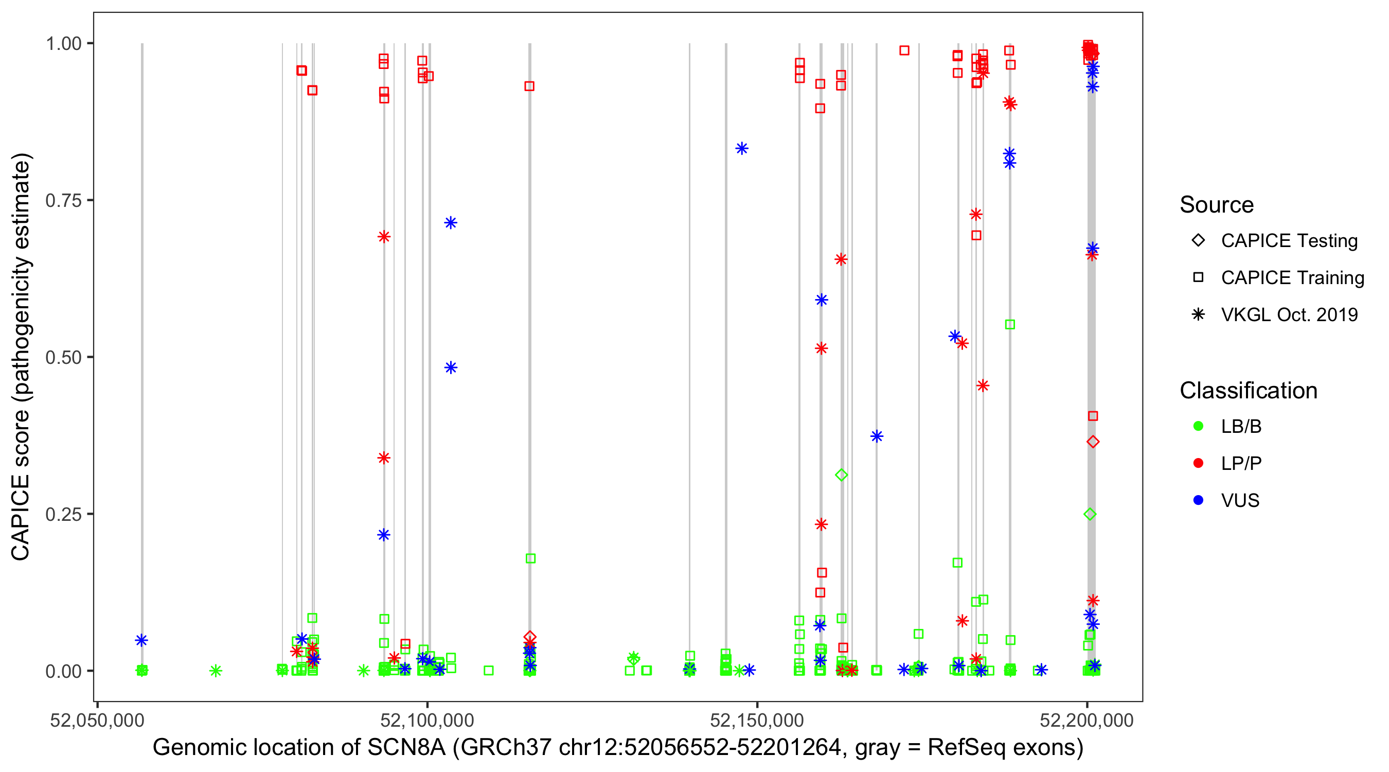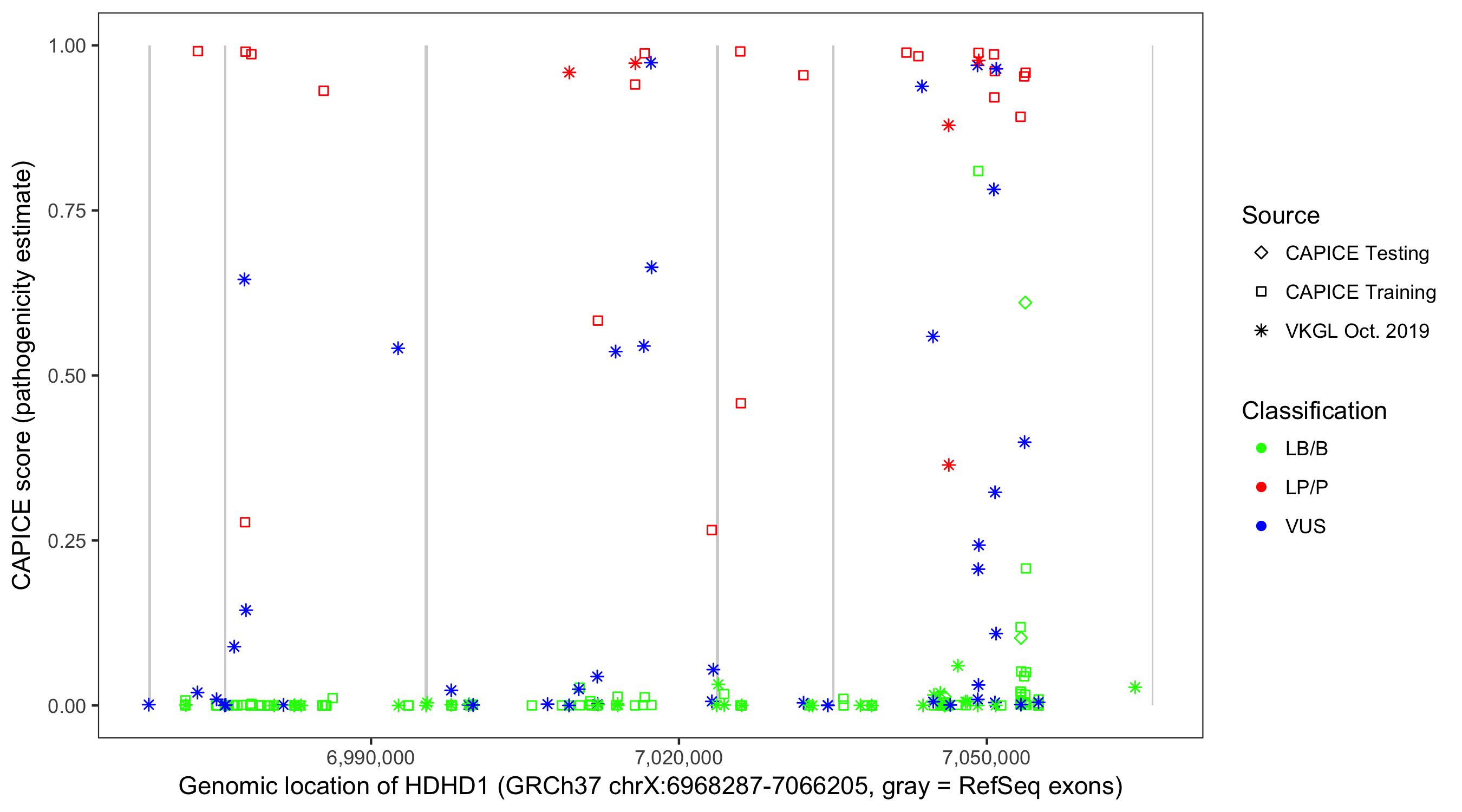 Shown are CAPICE train/test variants plus VKGL Oct 2019.