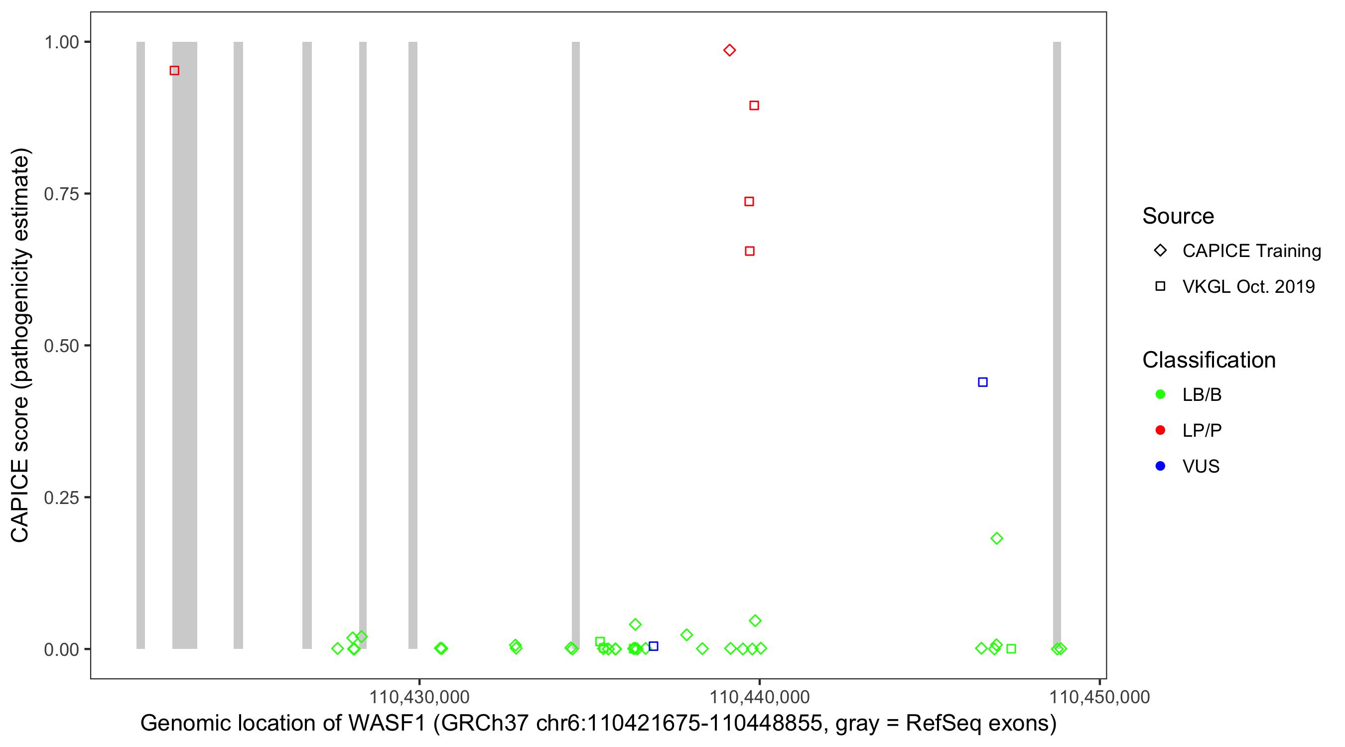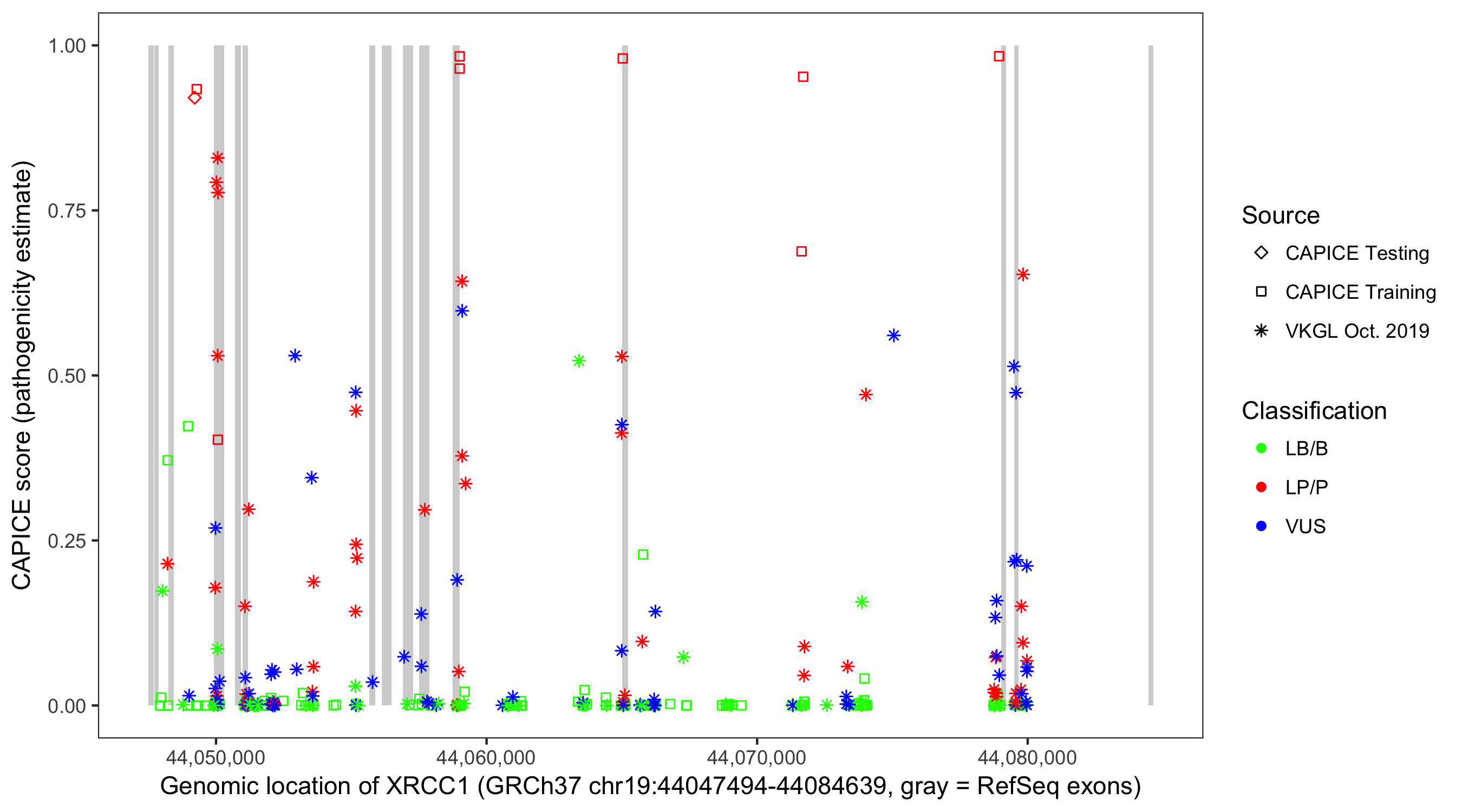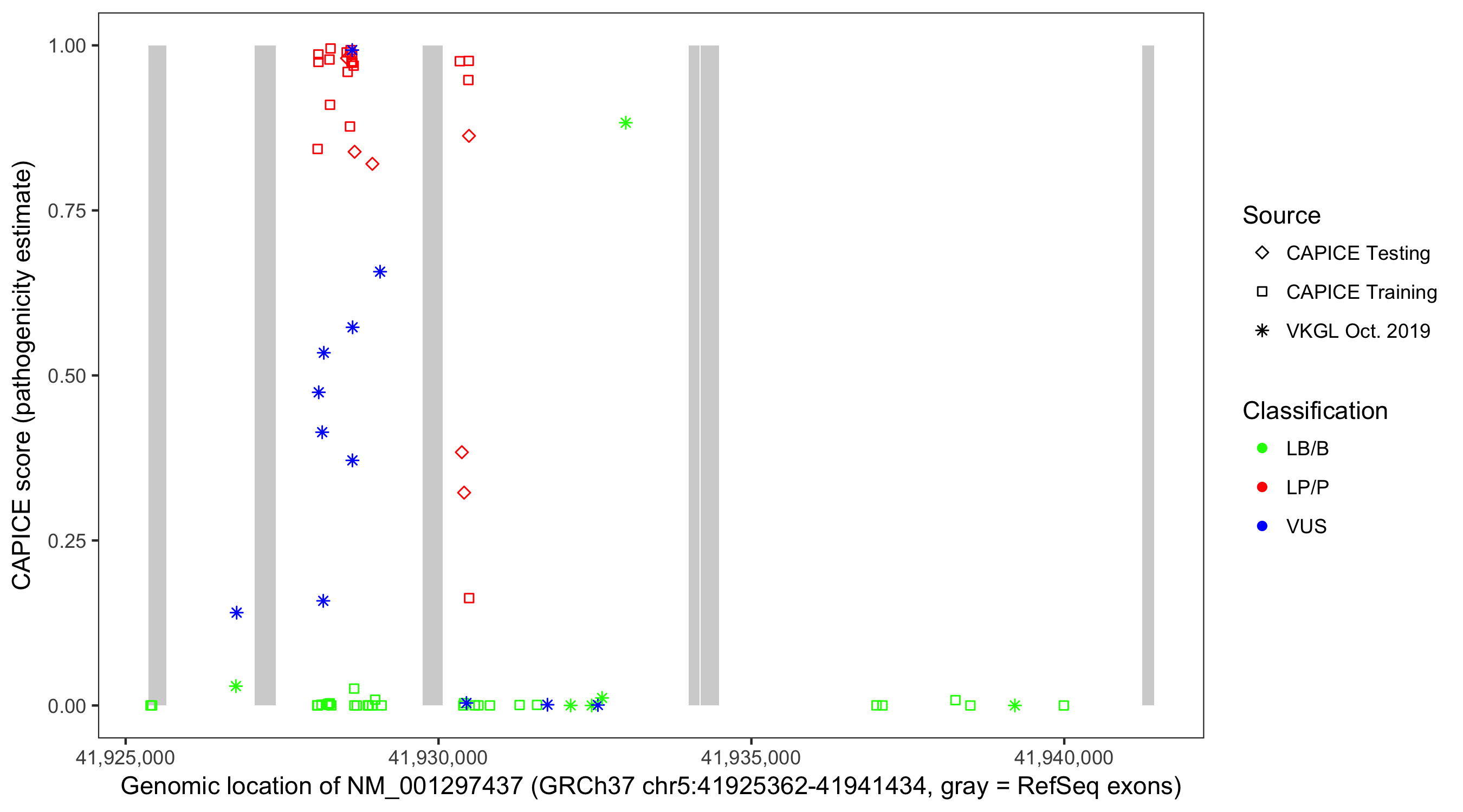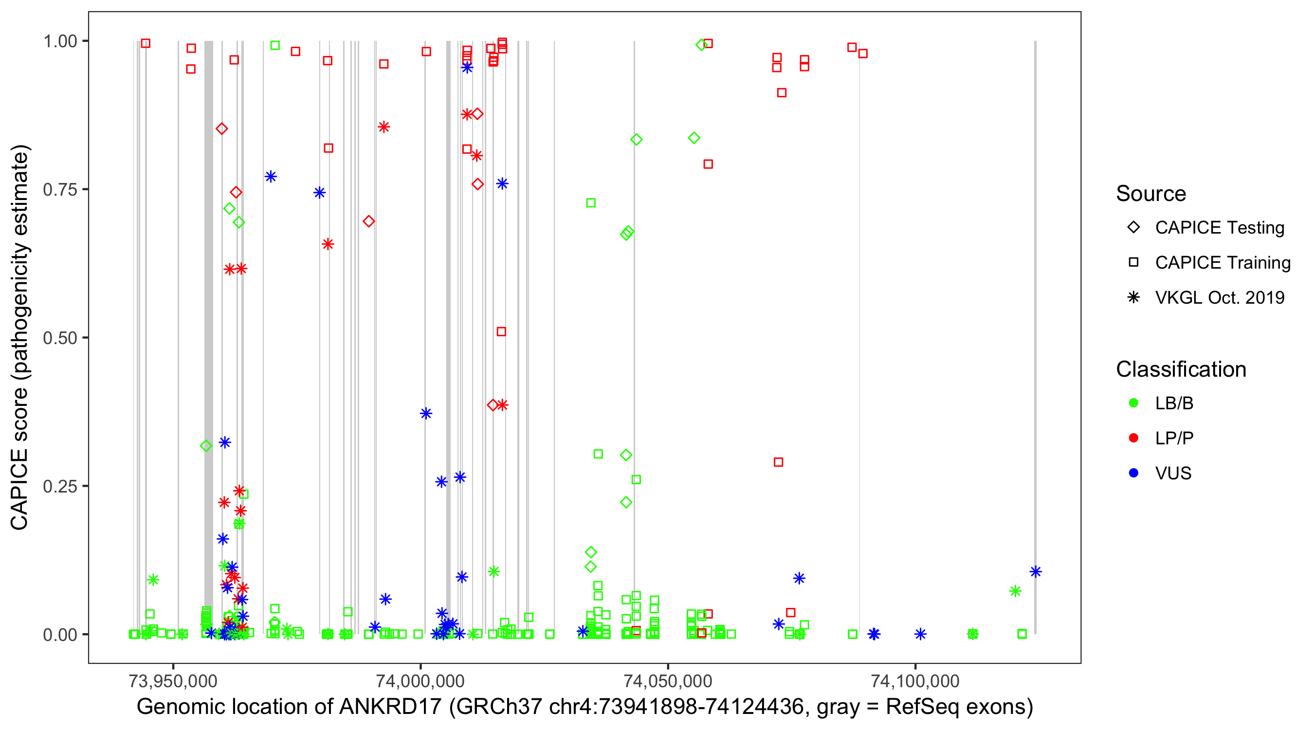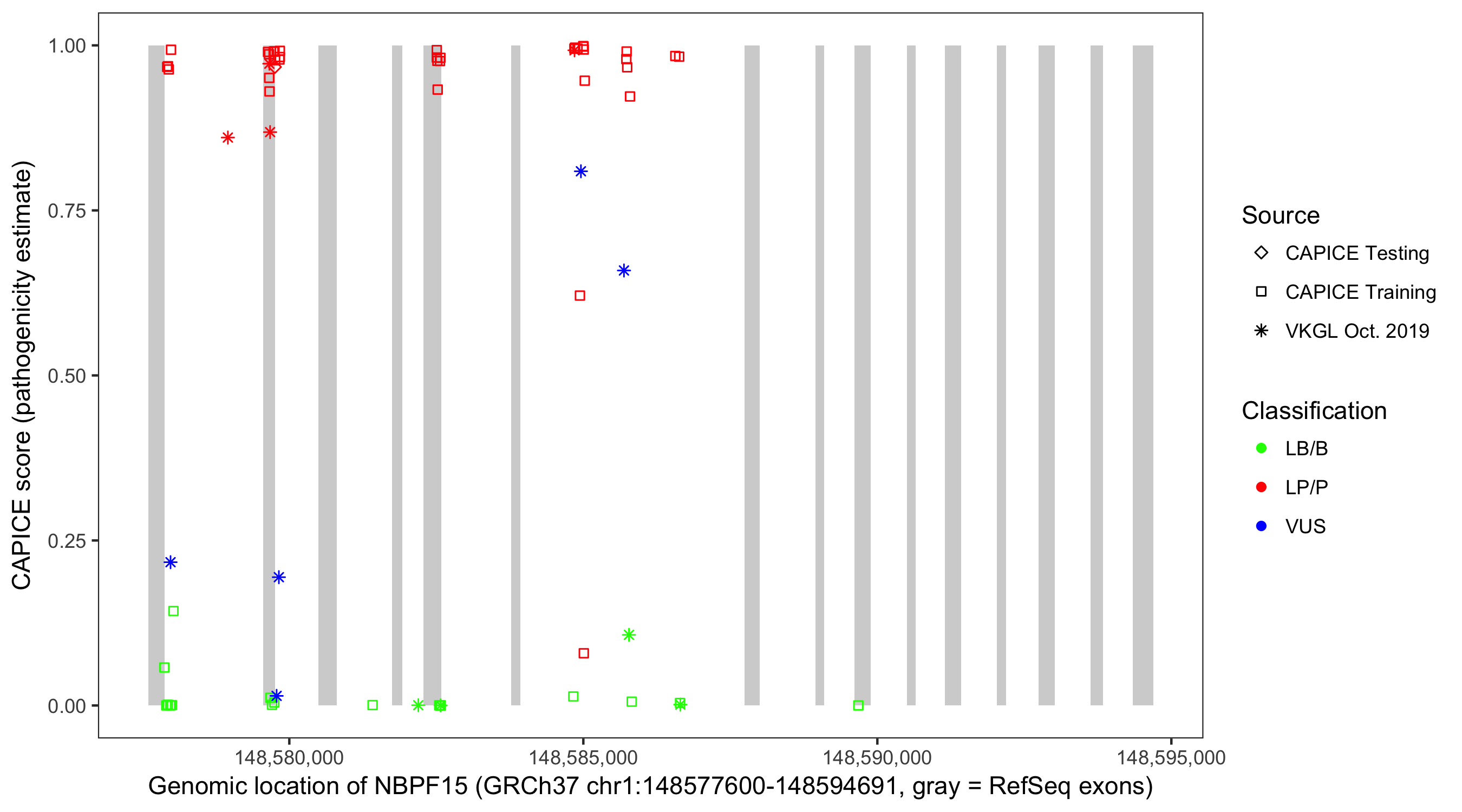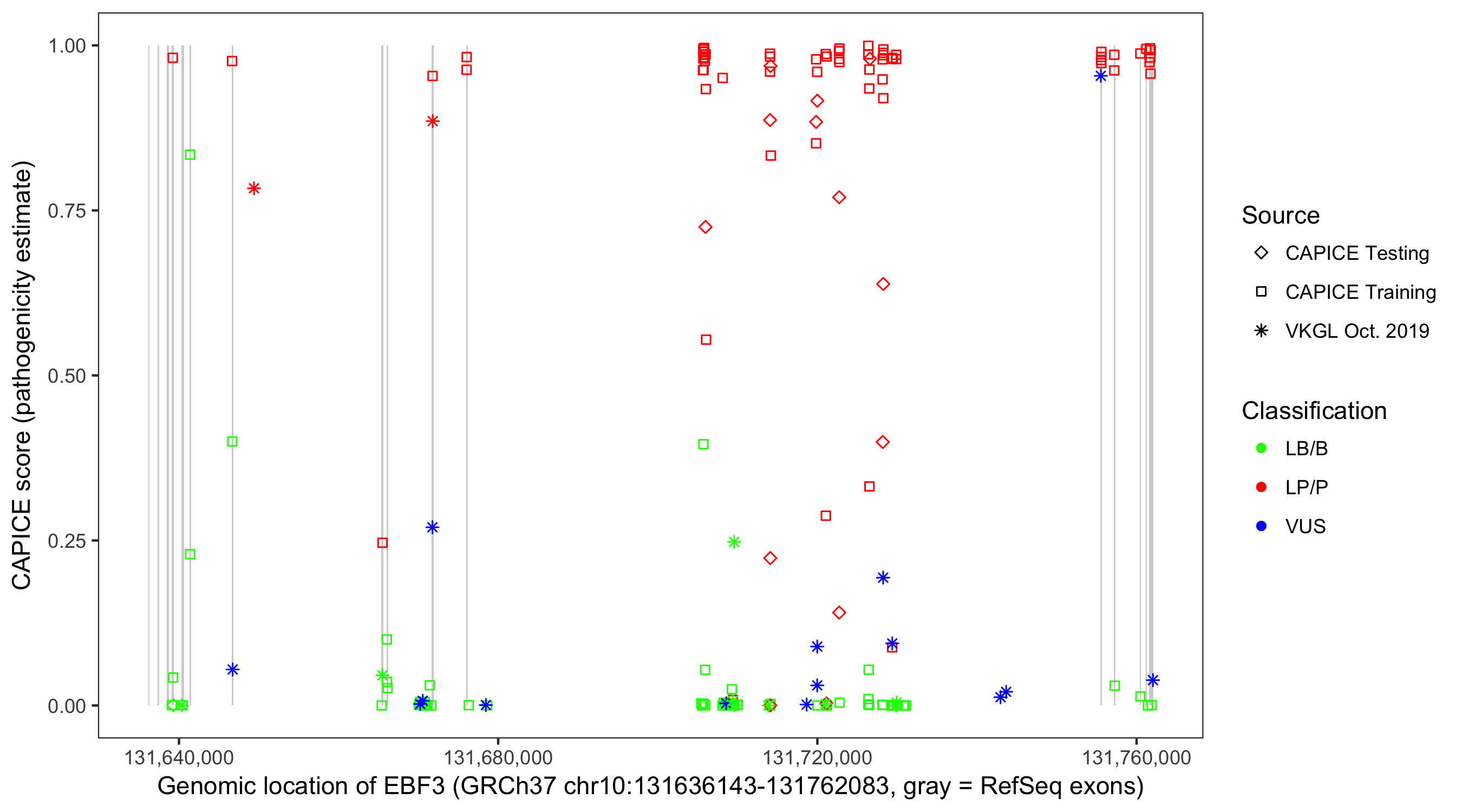Shown are CAPICE train/test variants plus VKGL Oct 2019.