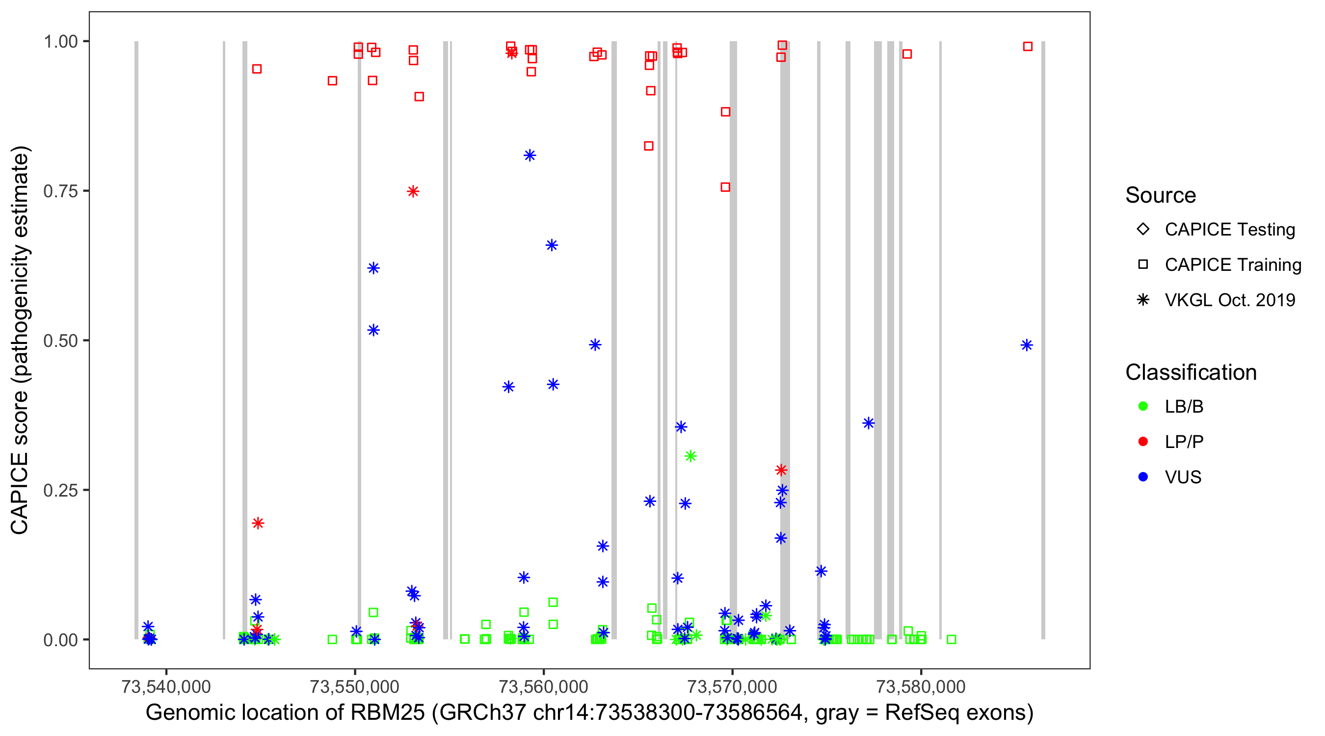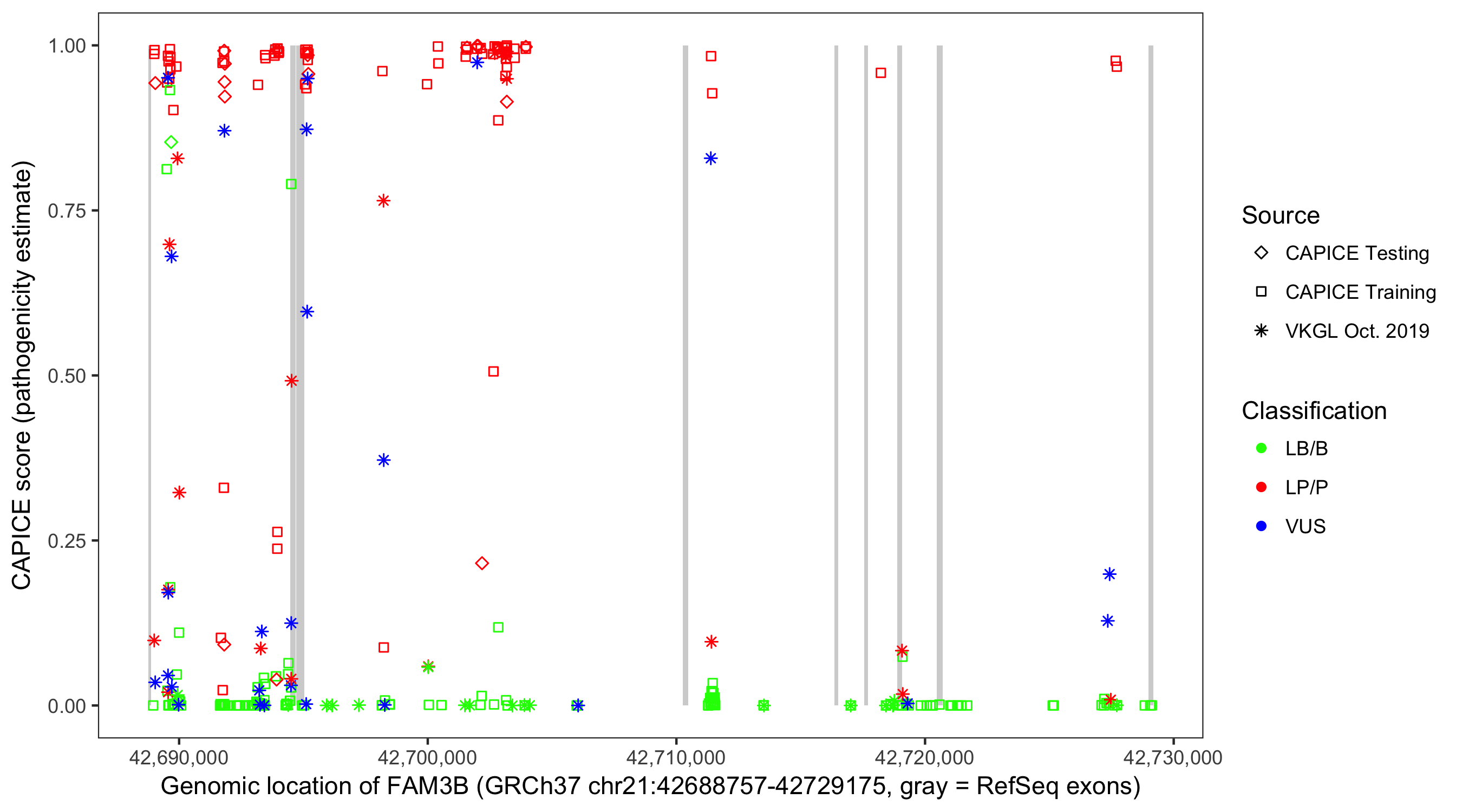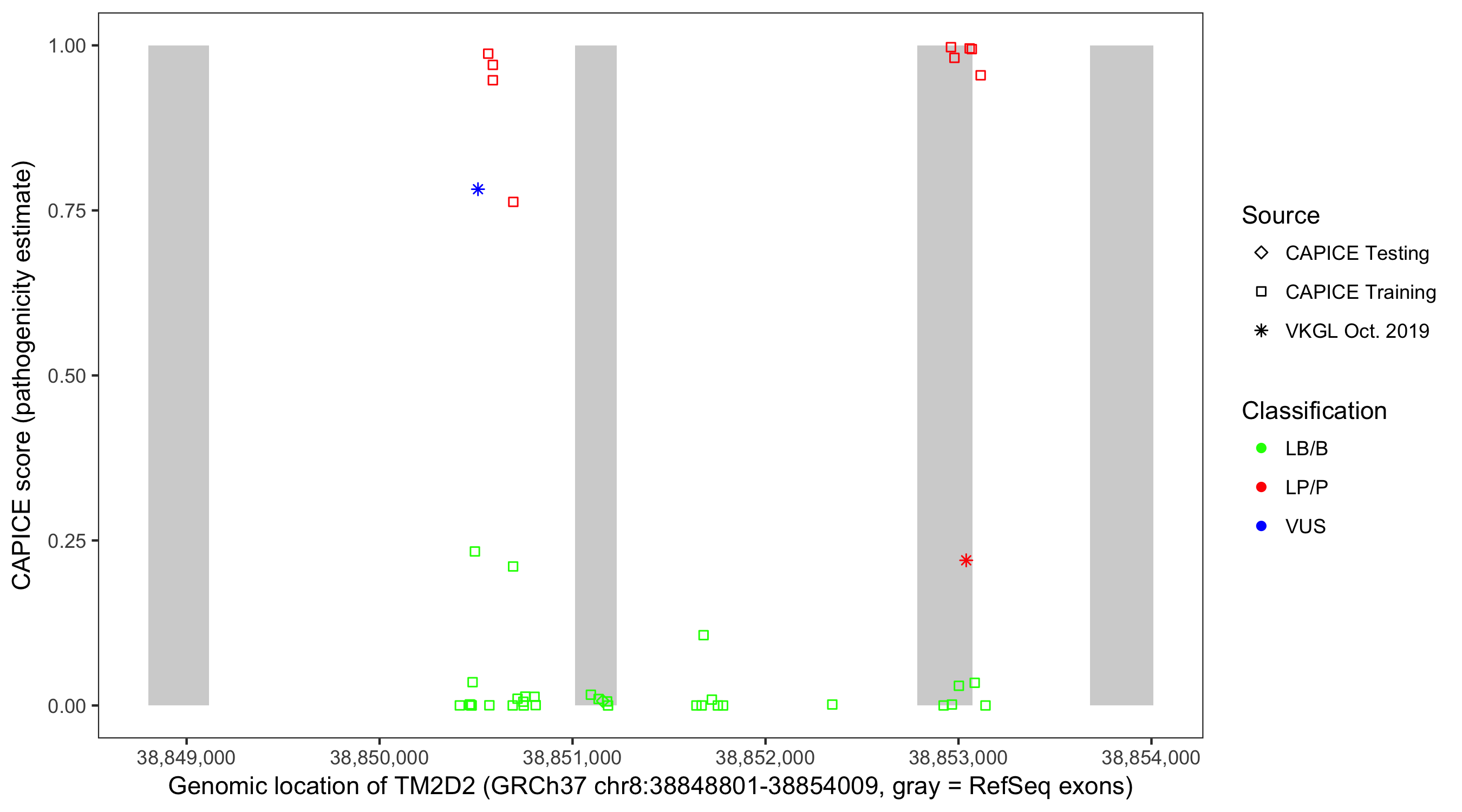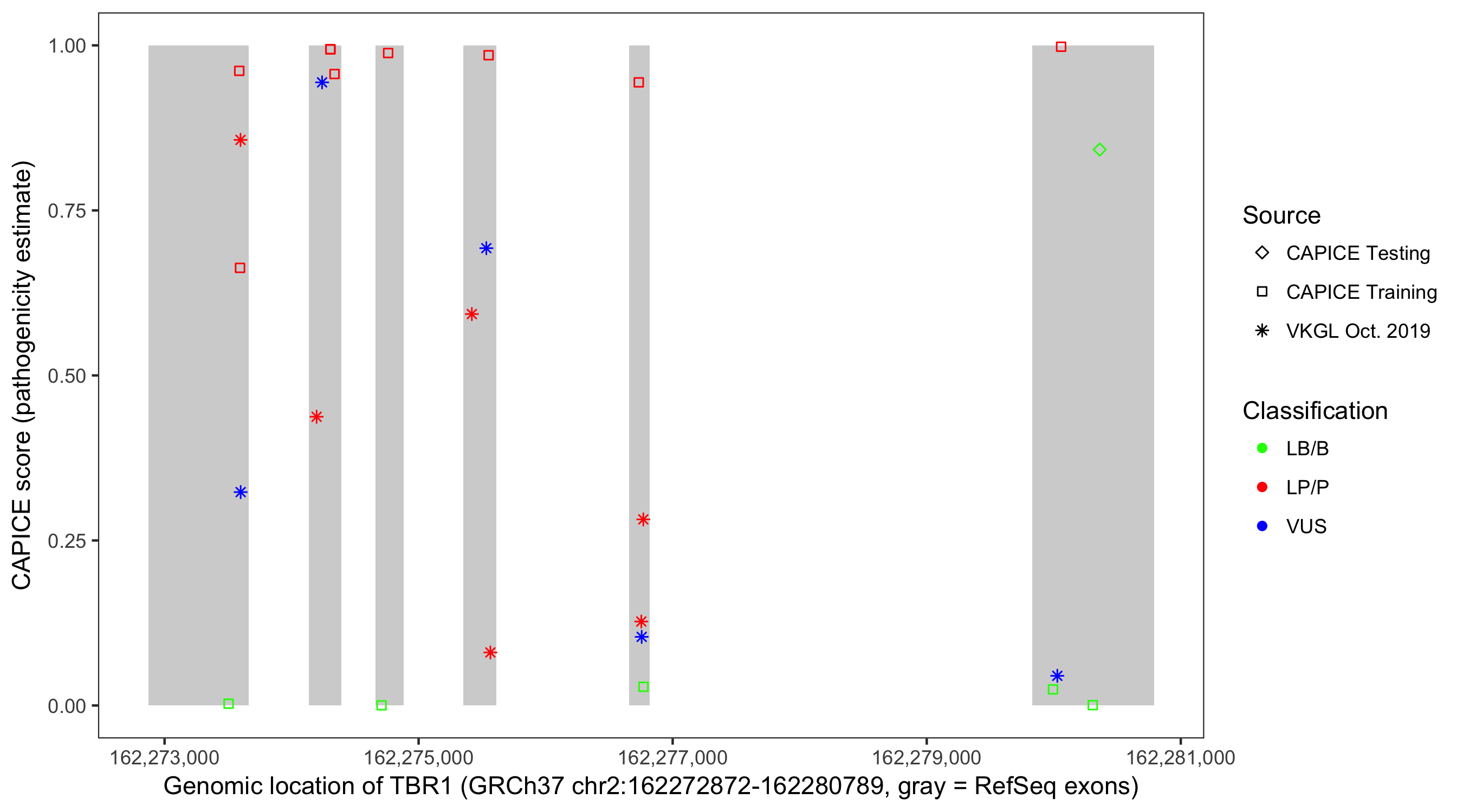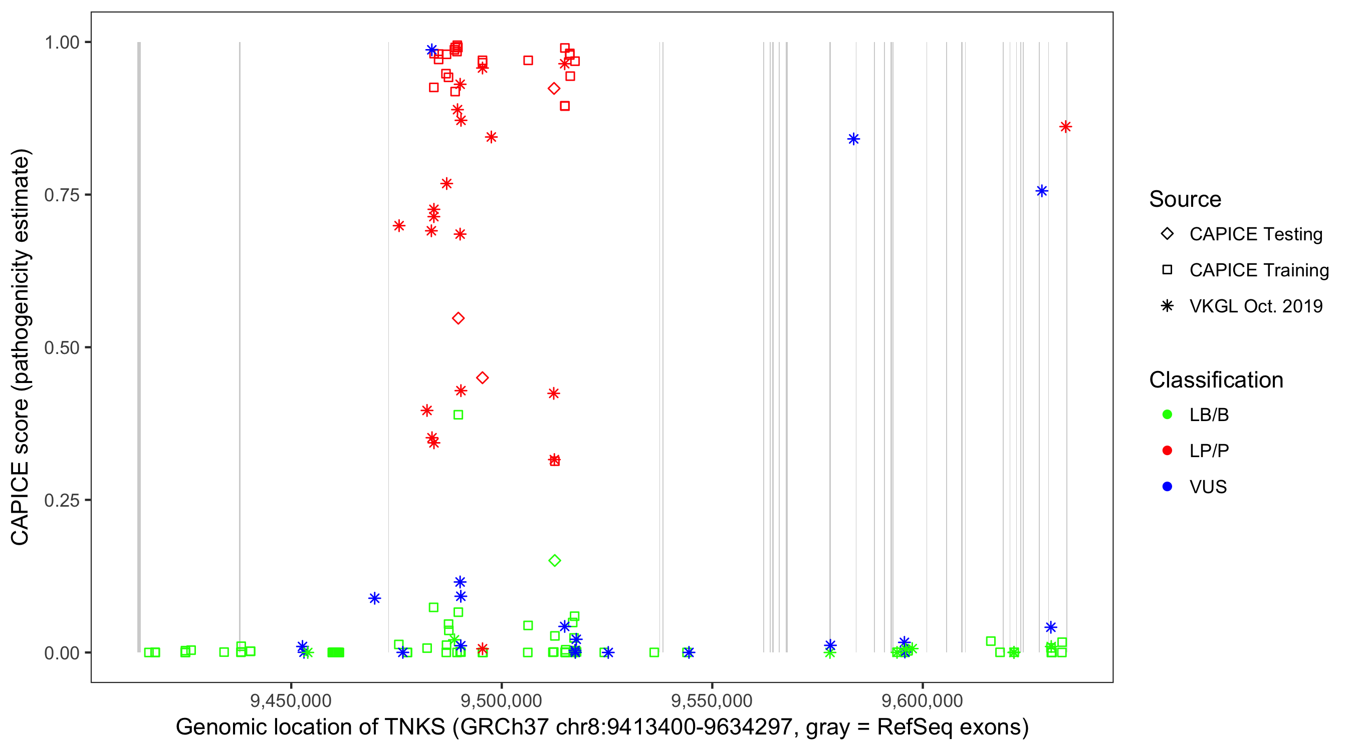 Shown are CAPICE train/test variants plus VKGL Oct 2019.