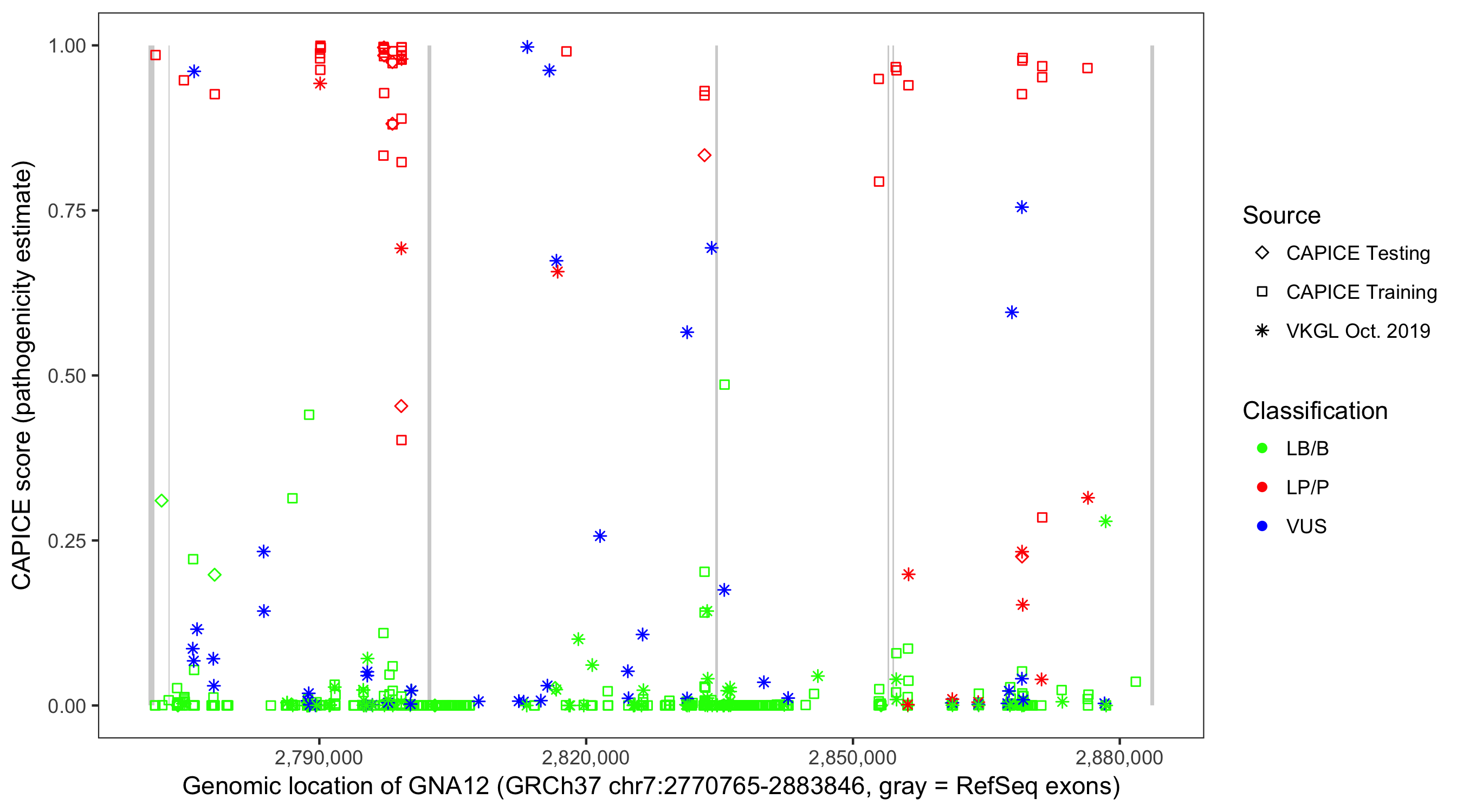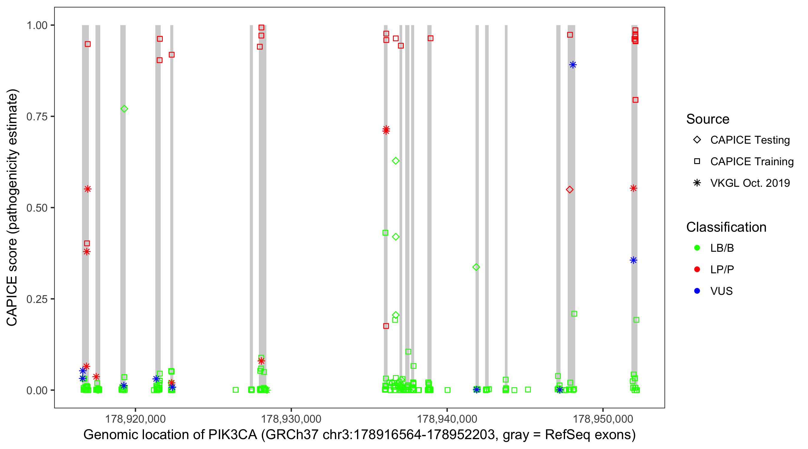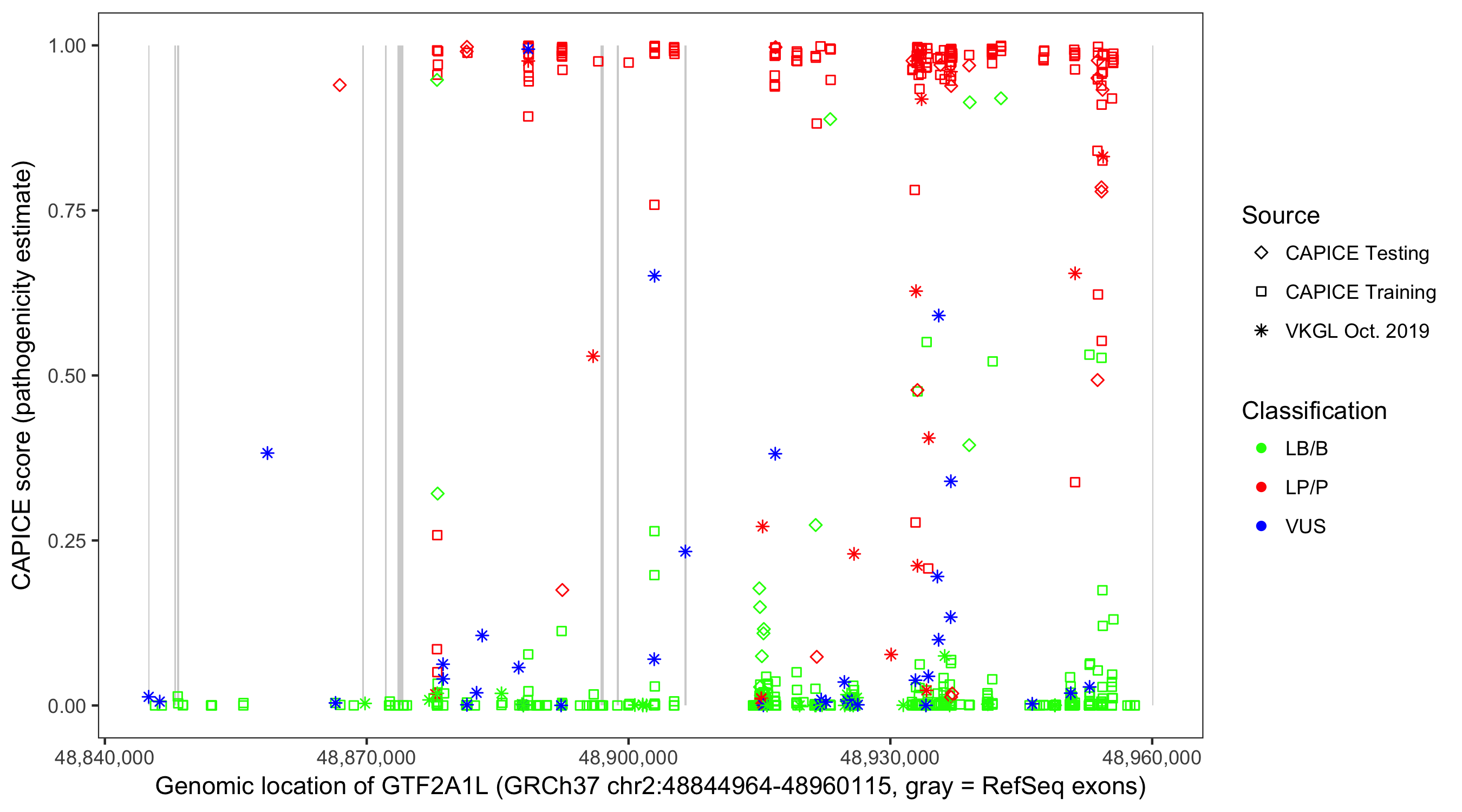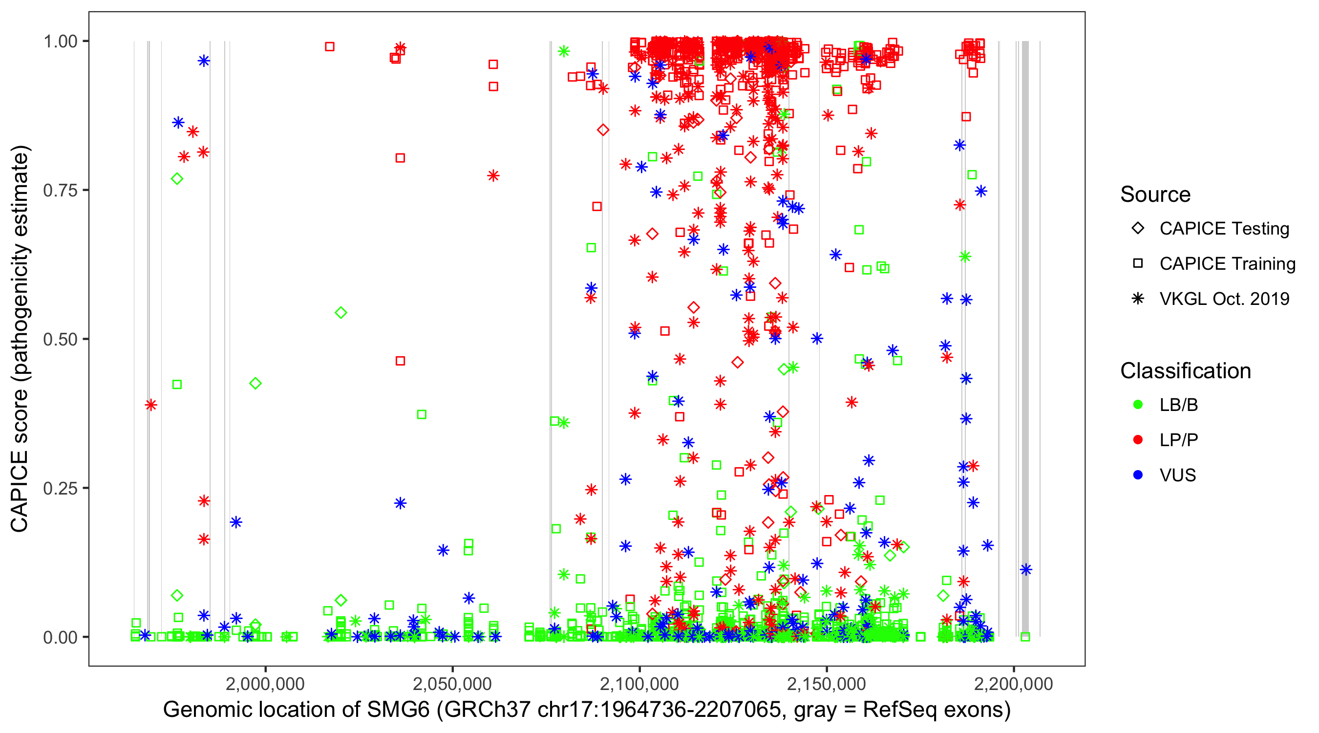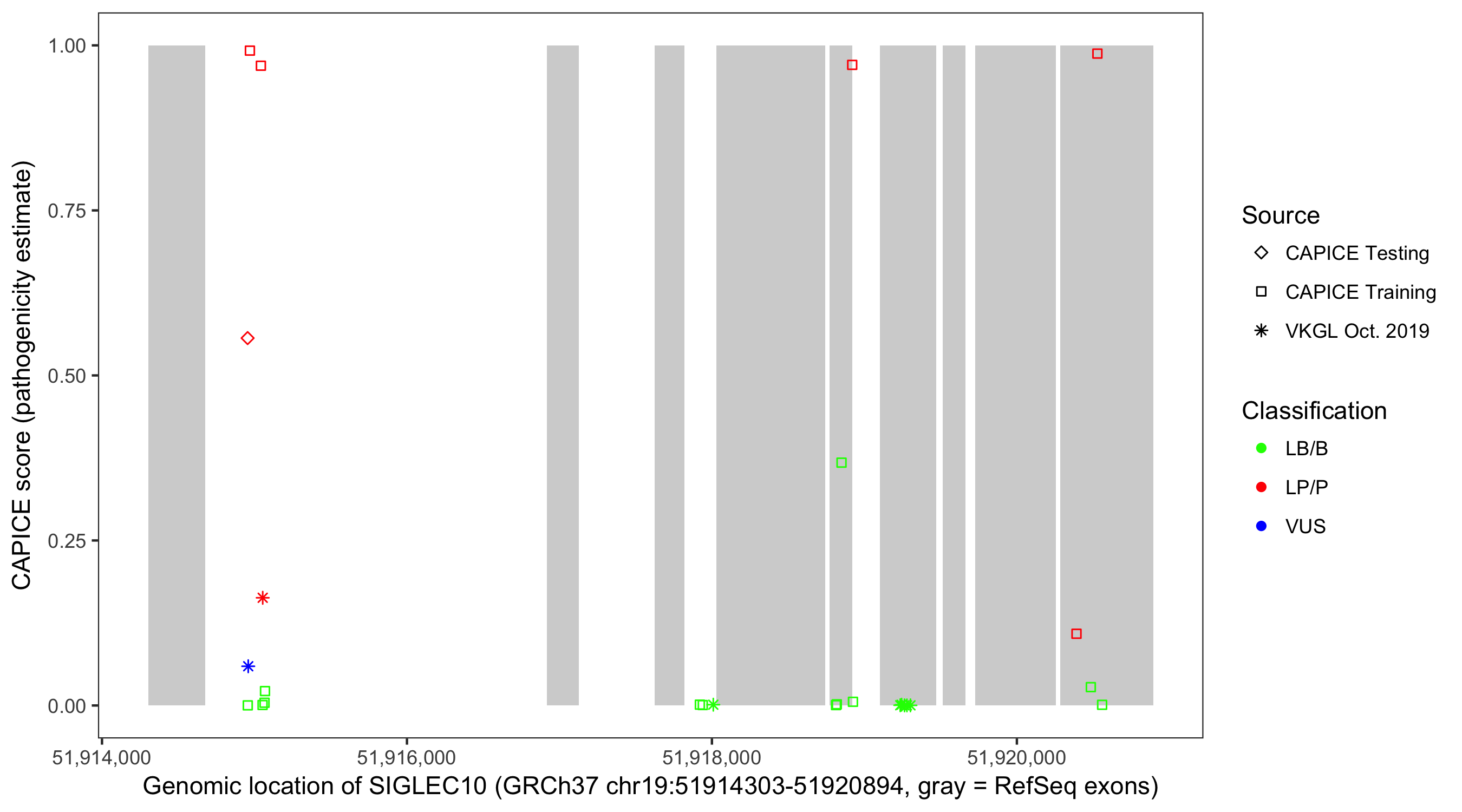 Shown are CAPICE train/test variants plus VKGL Oct 2019.