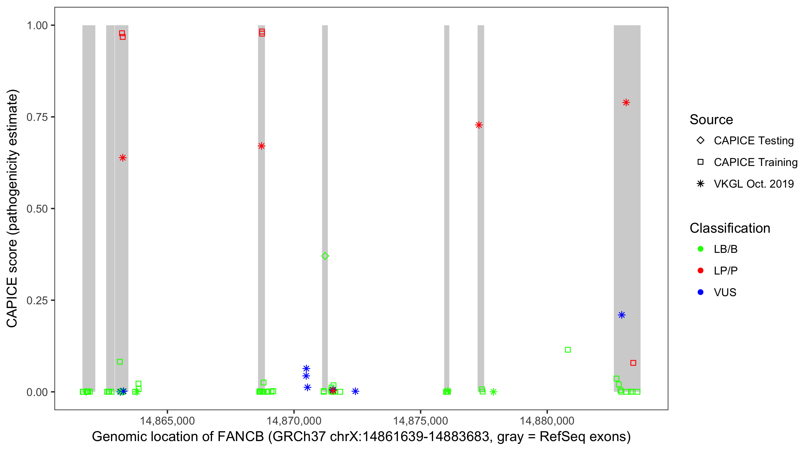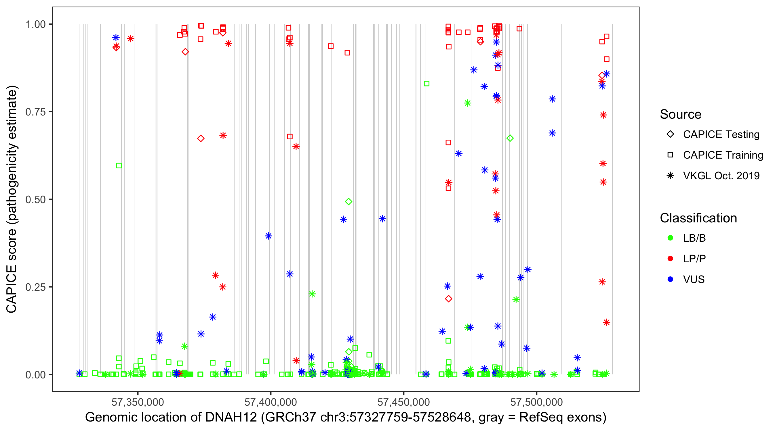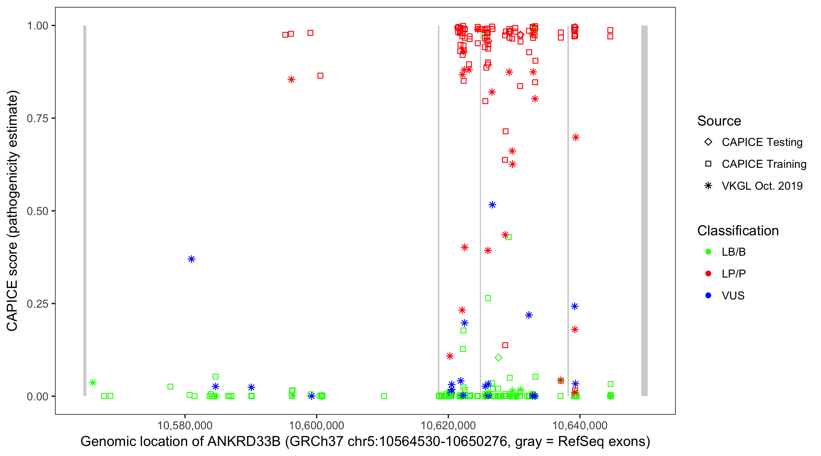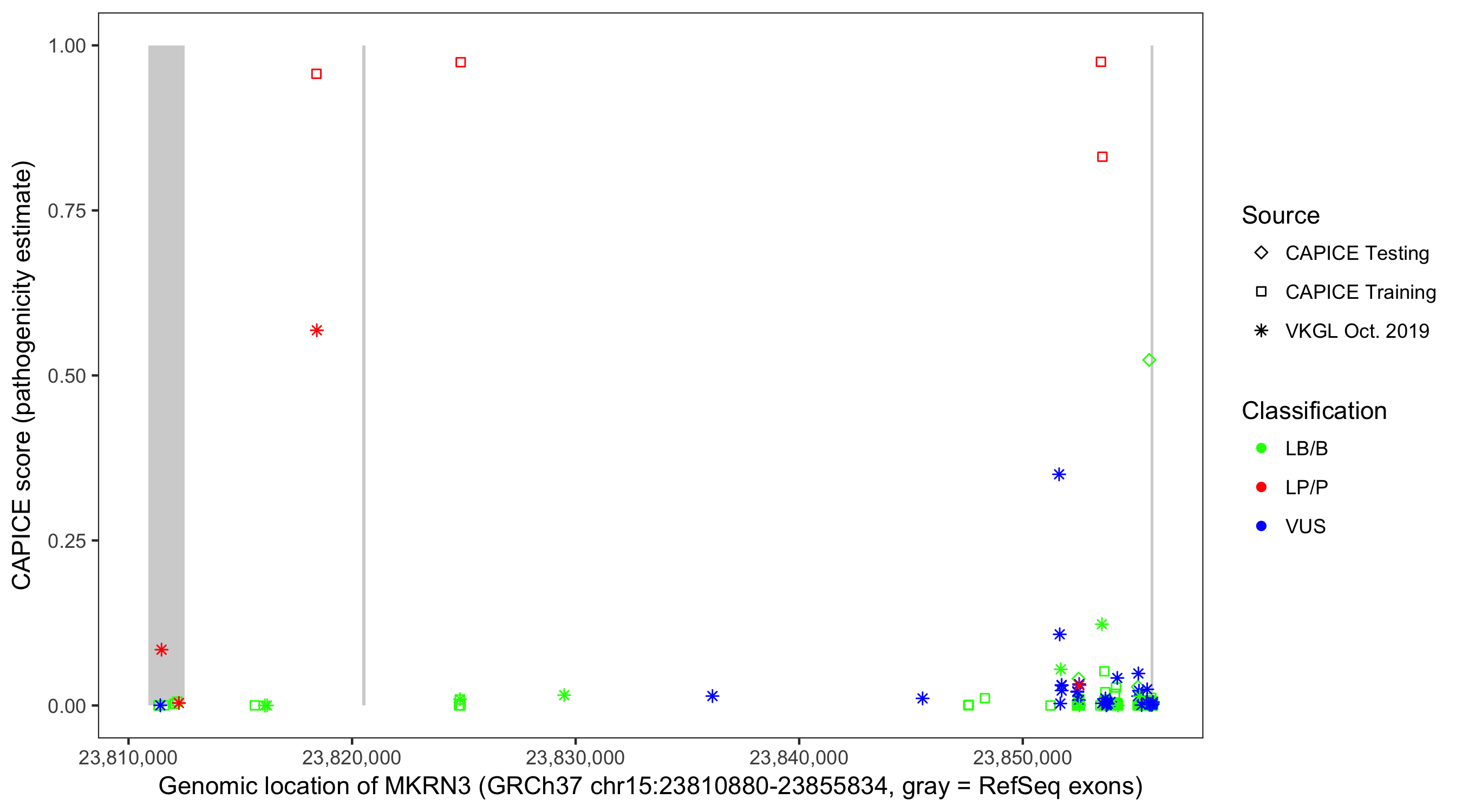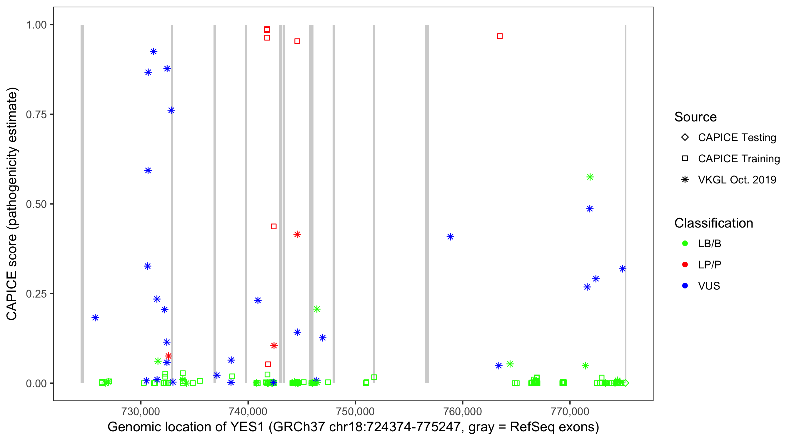 Shown are CAPICE train/test variants plus VKGL Oct 2019.