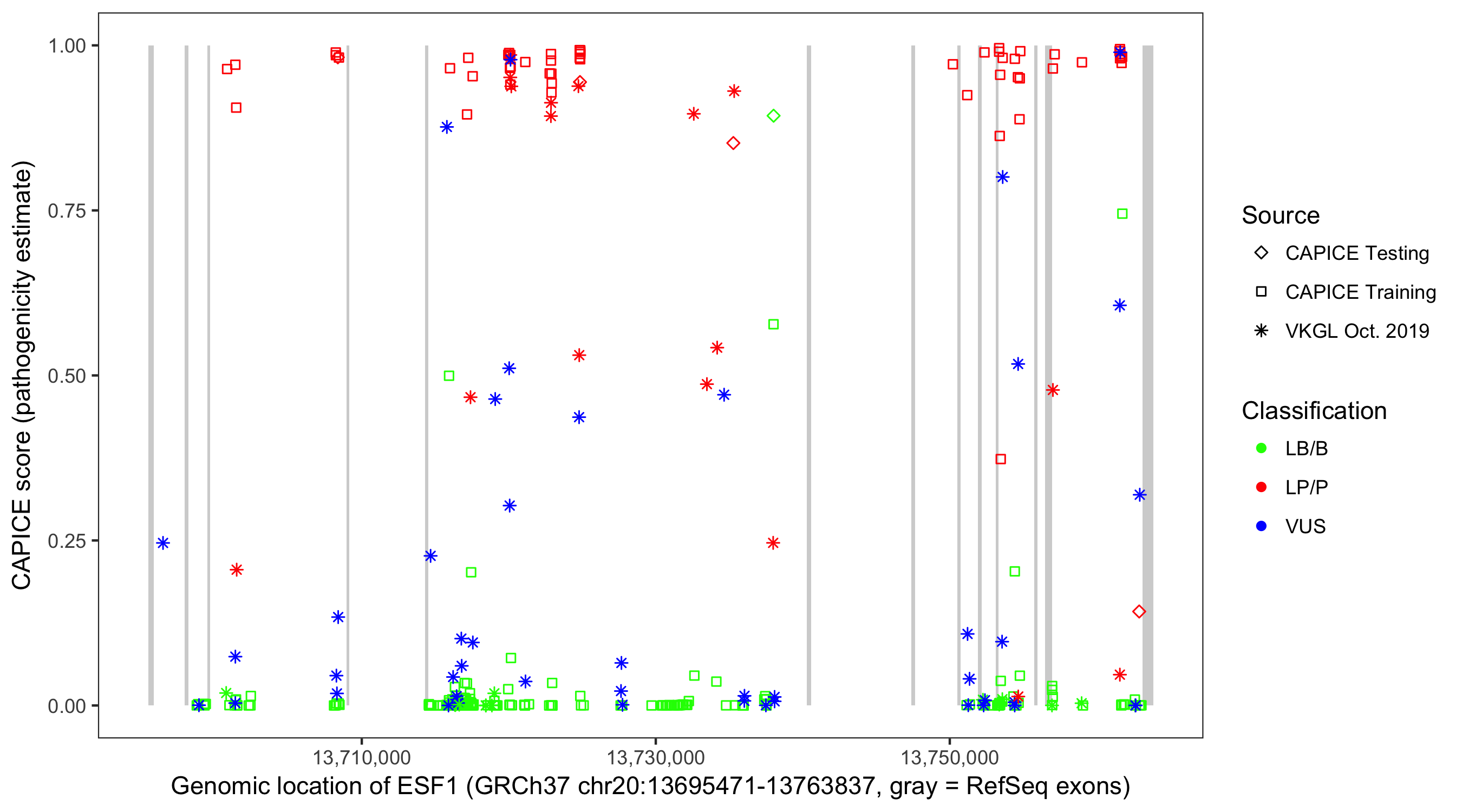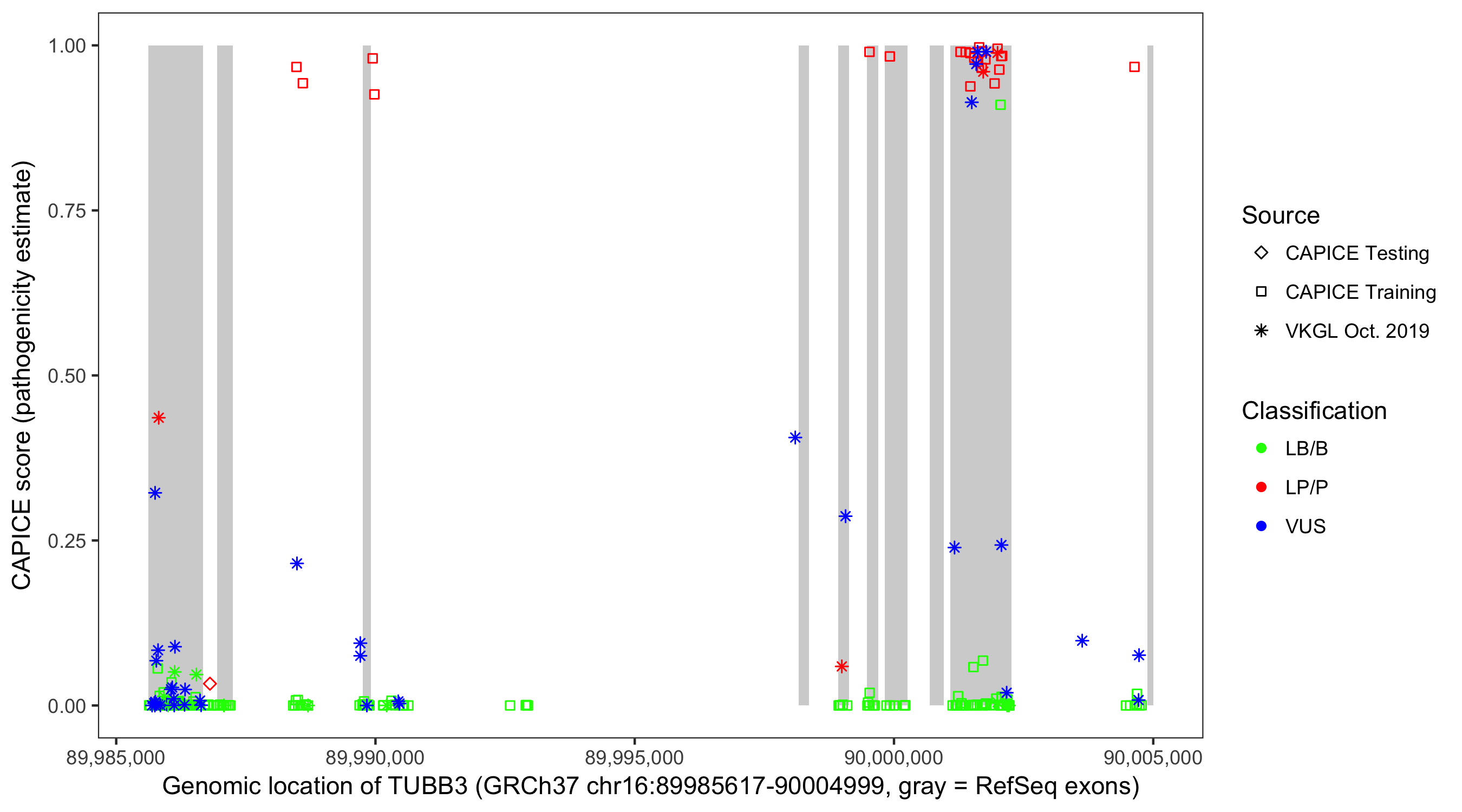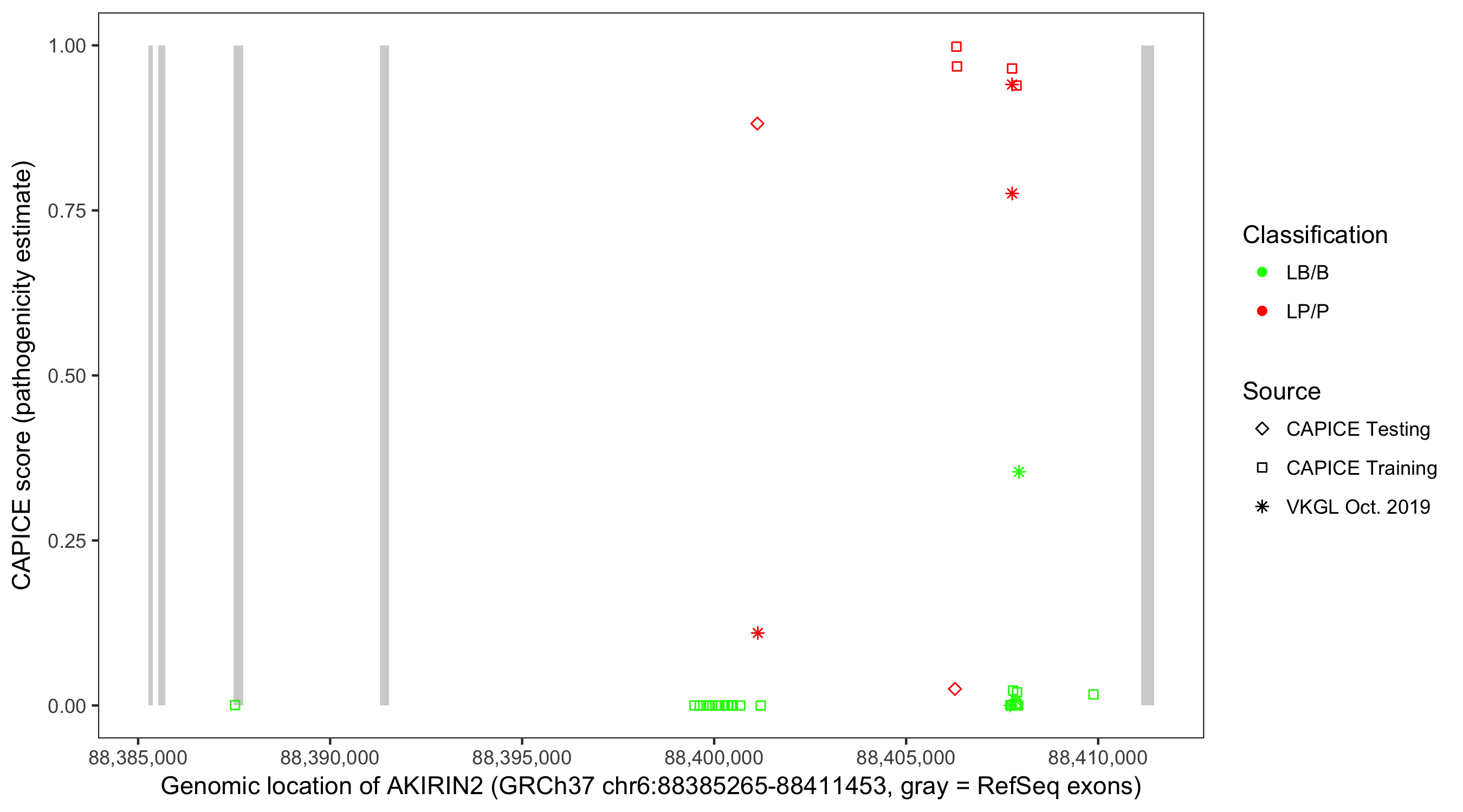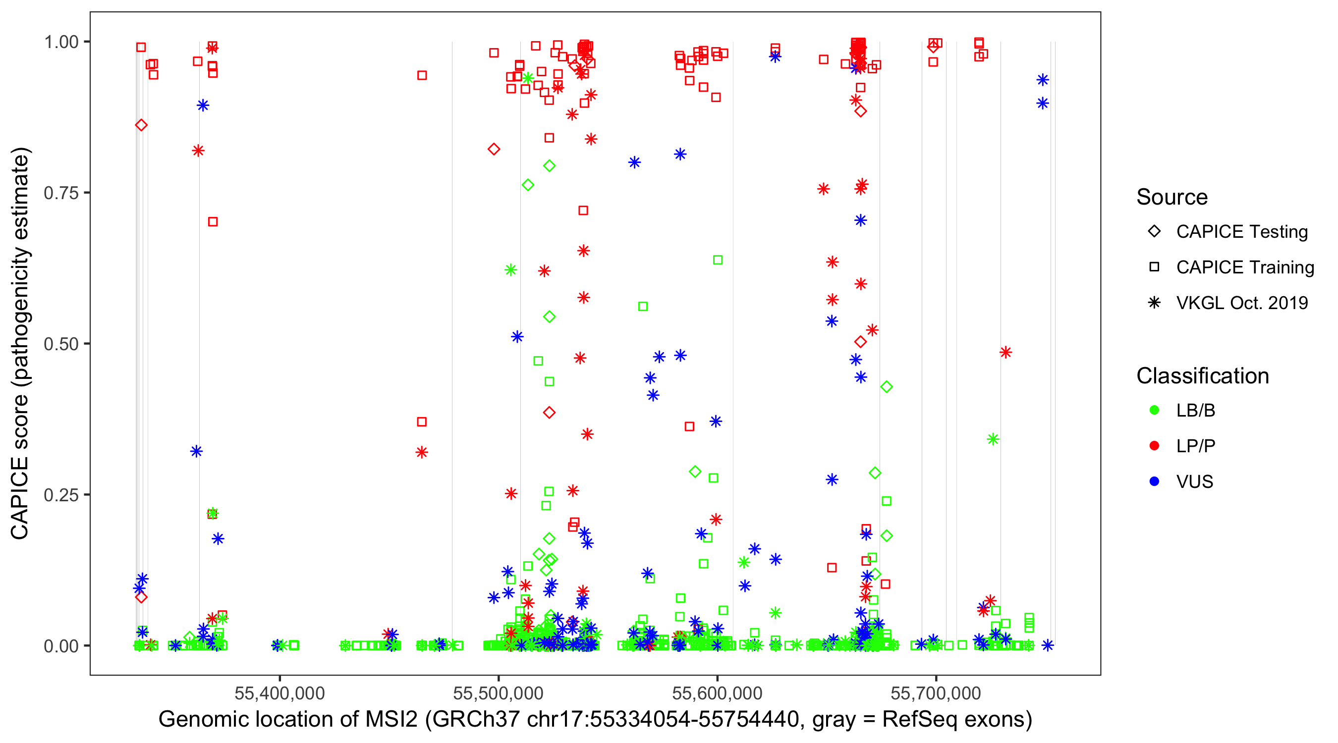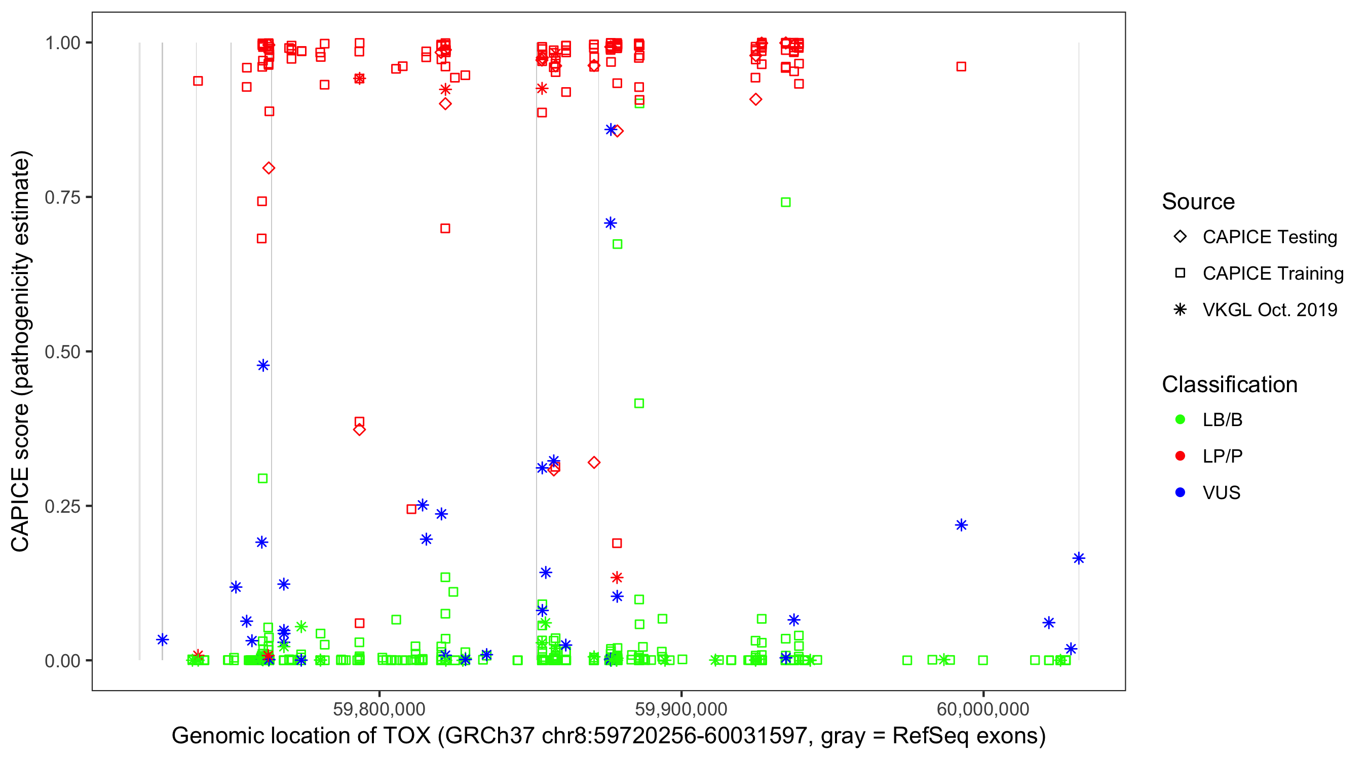 Shown are CAPICE train/test variants plus VKGL Oct 2019.